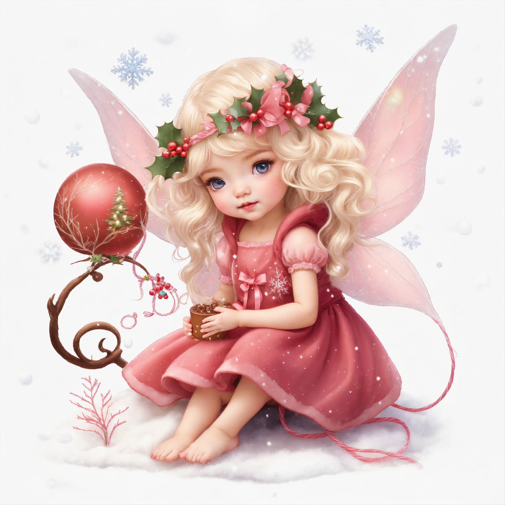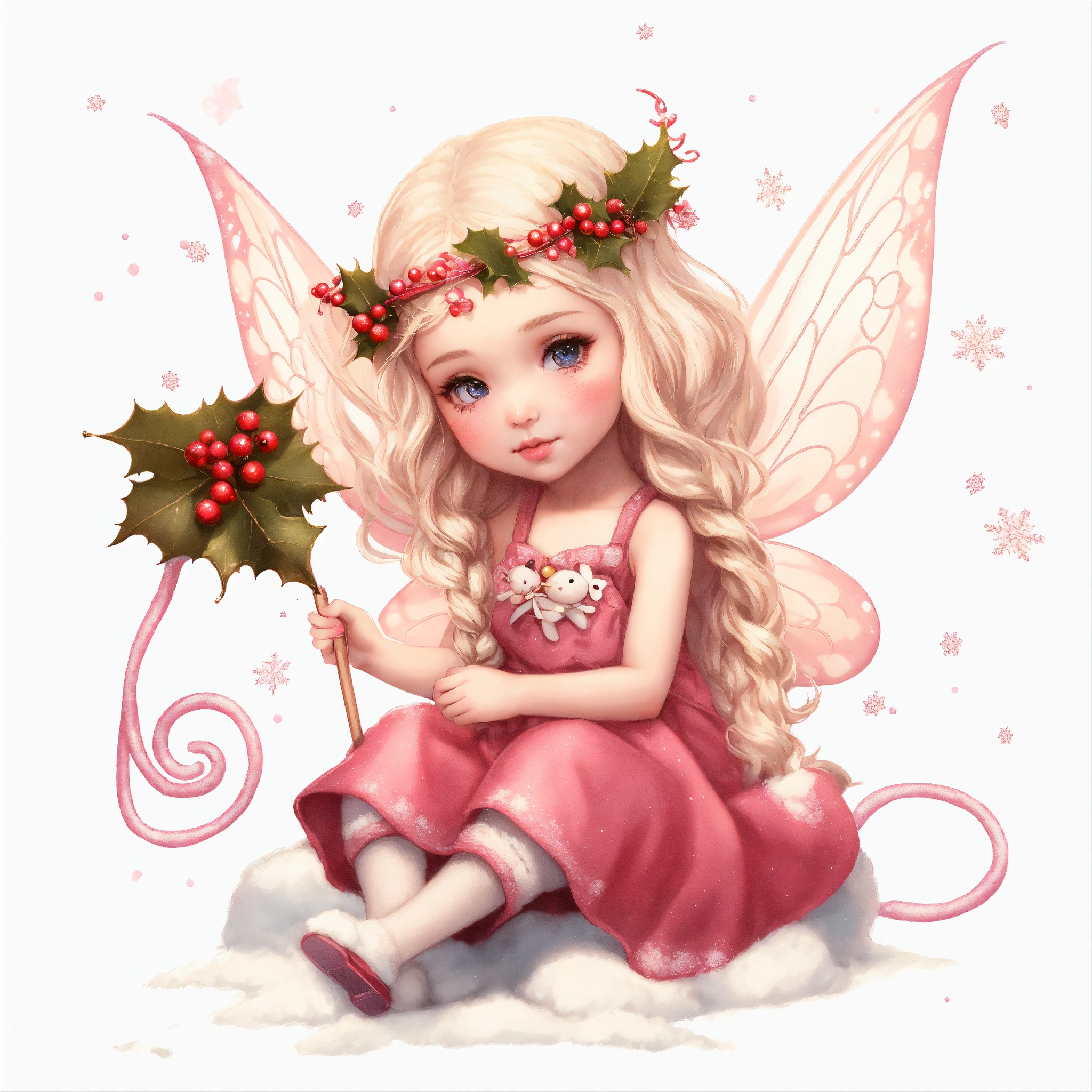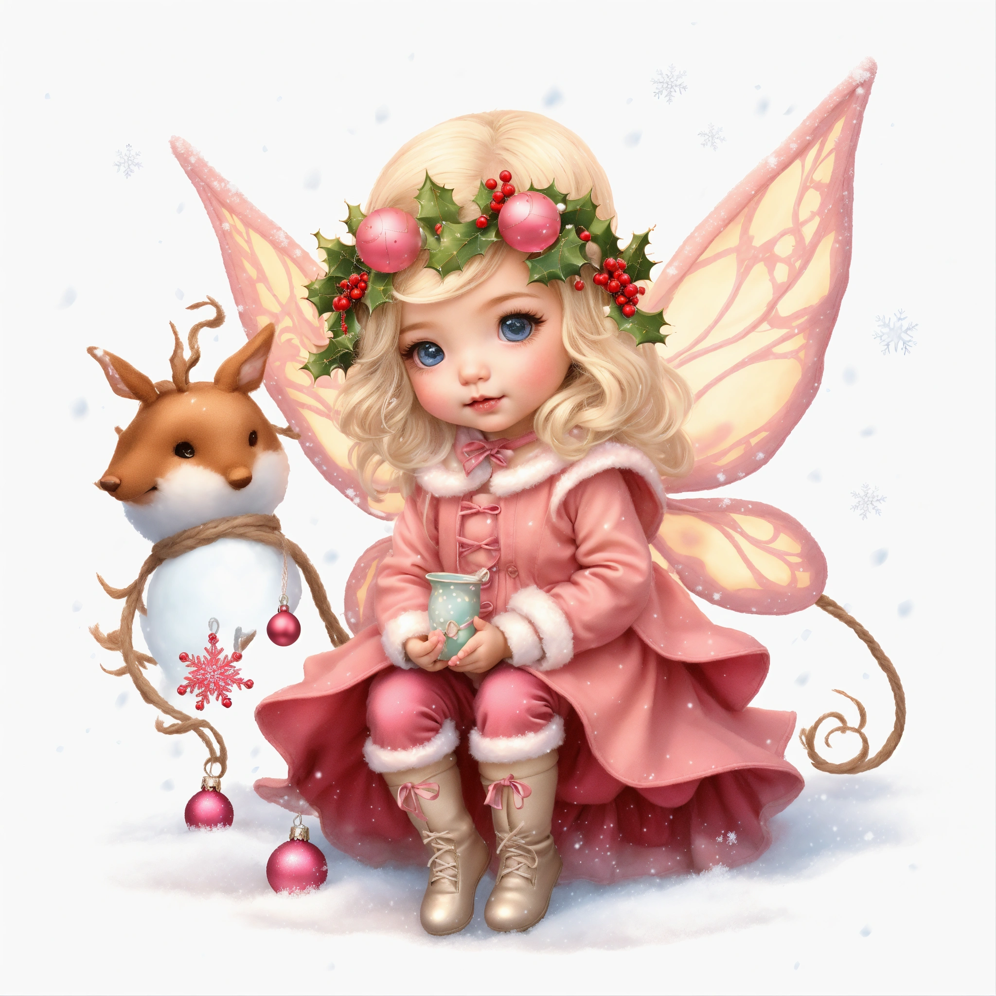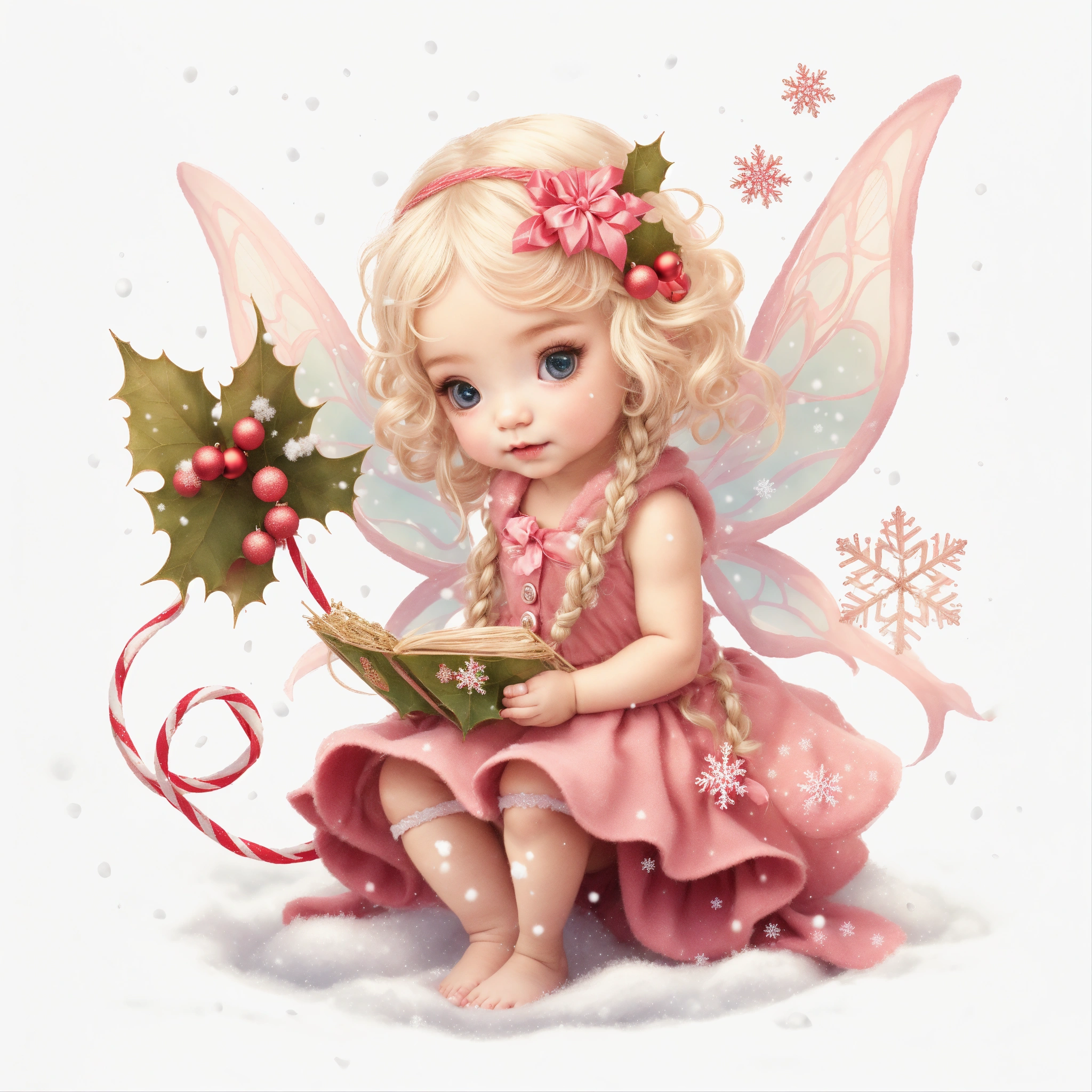 Full body of a realistic sweetness baby chibi snow fairy christmas girl freckled two braids in her long white blonde hair she is playing in a enchanted winter magic garden, clipart digital art style, pink colors, very detailed, by stanley artgerm and tom bagshaw, 32k