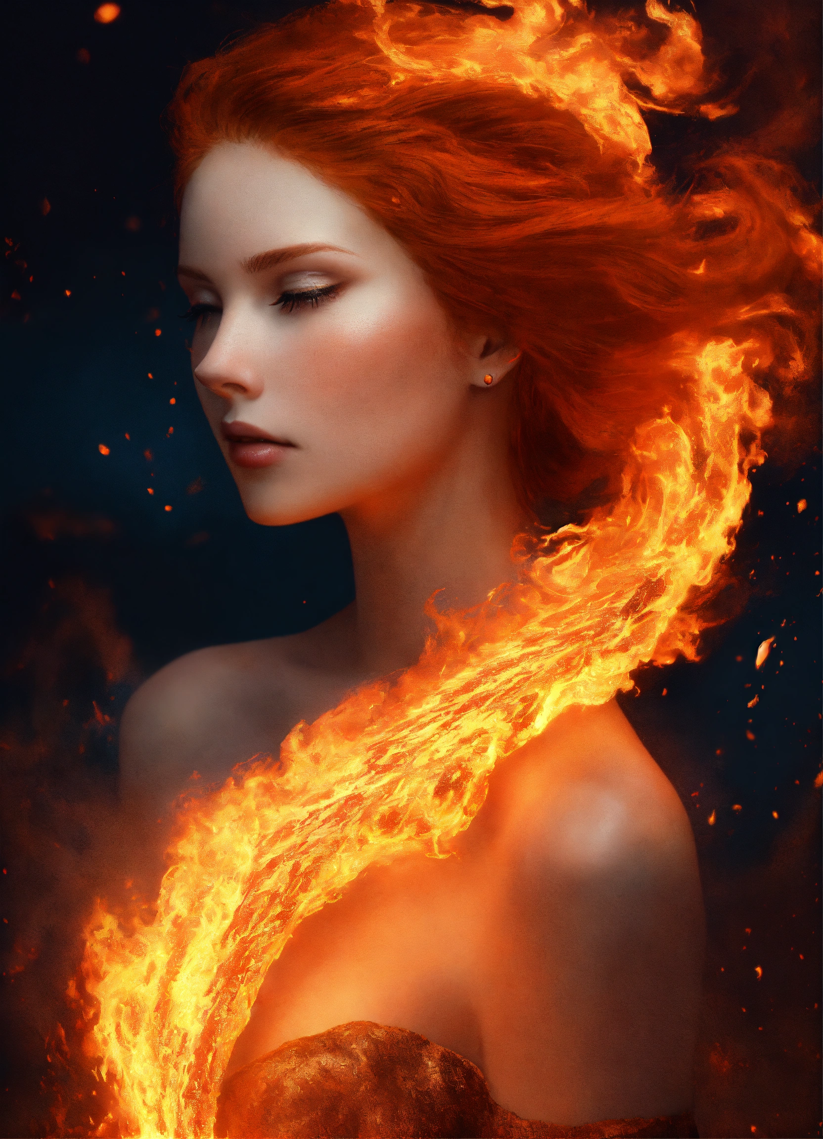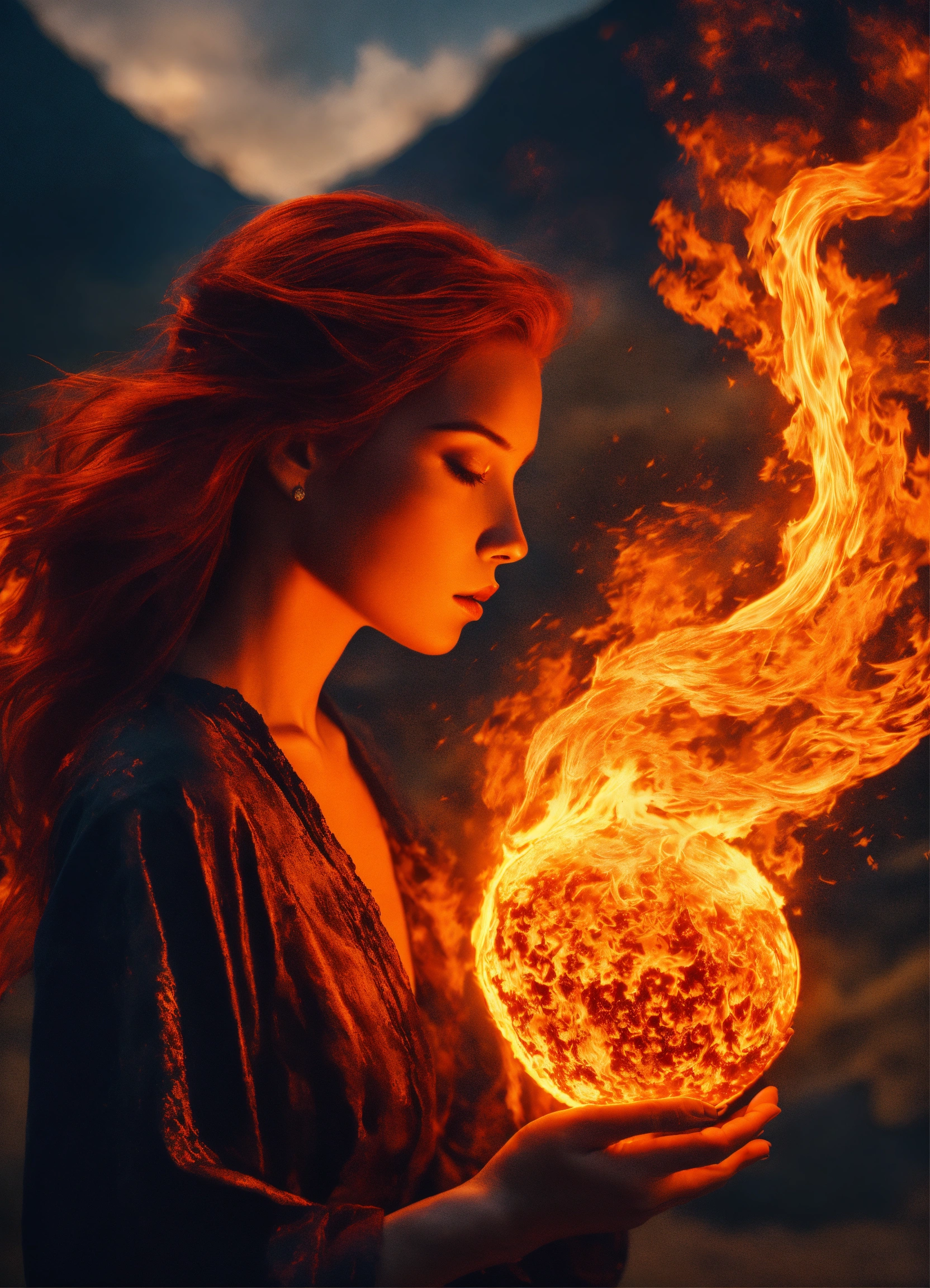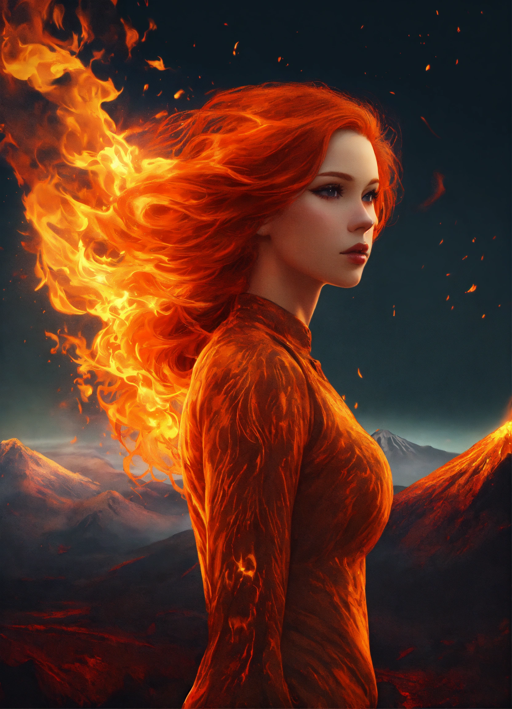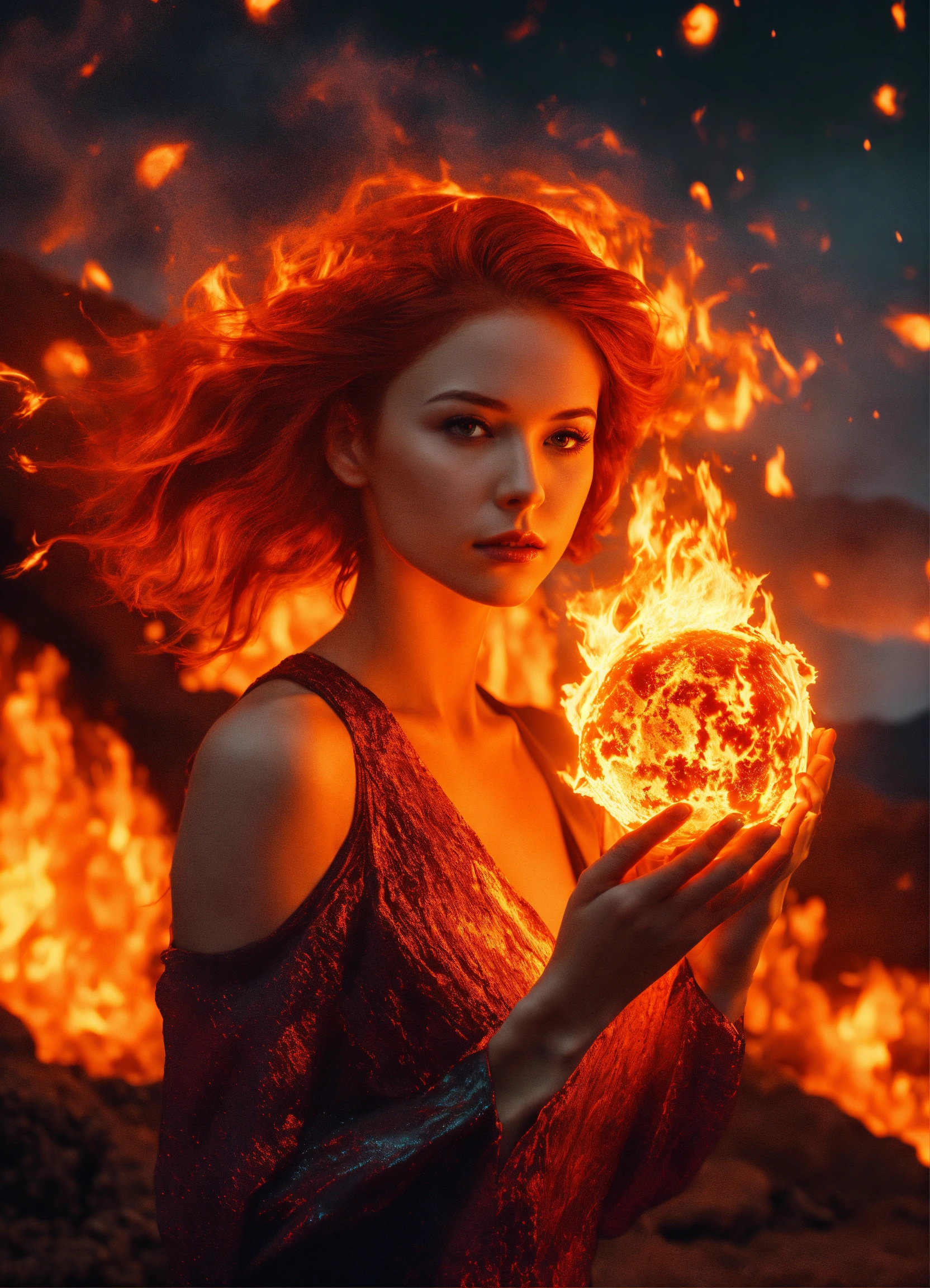 A woman made out of fire and she has hair made of flames, dark, magical, fantasy, digital art pale redhead holding fireball with a volcano and lava in background