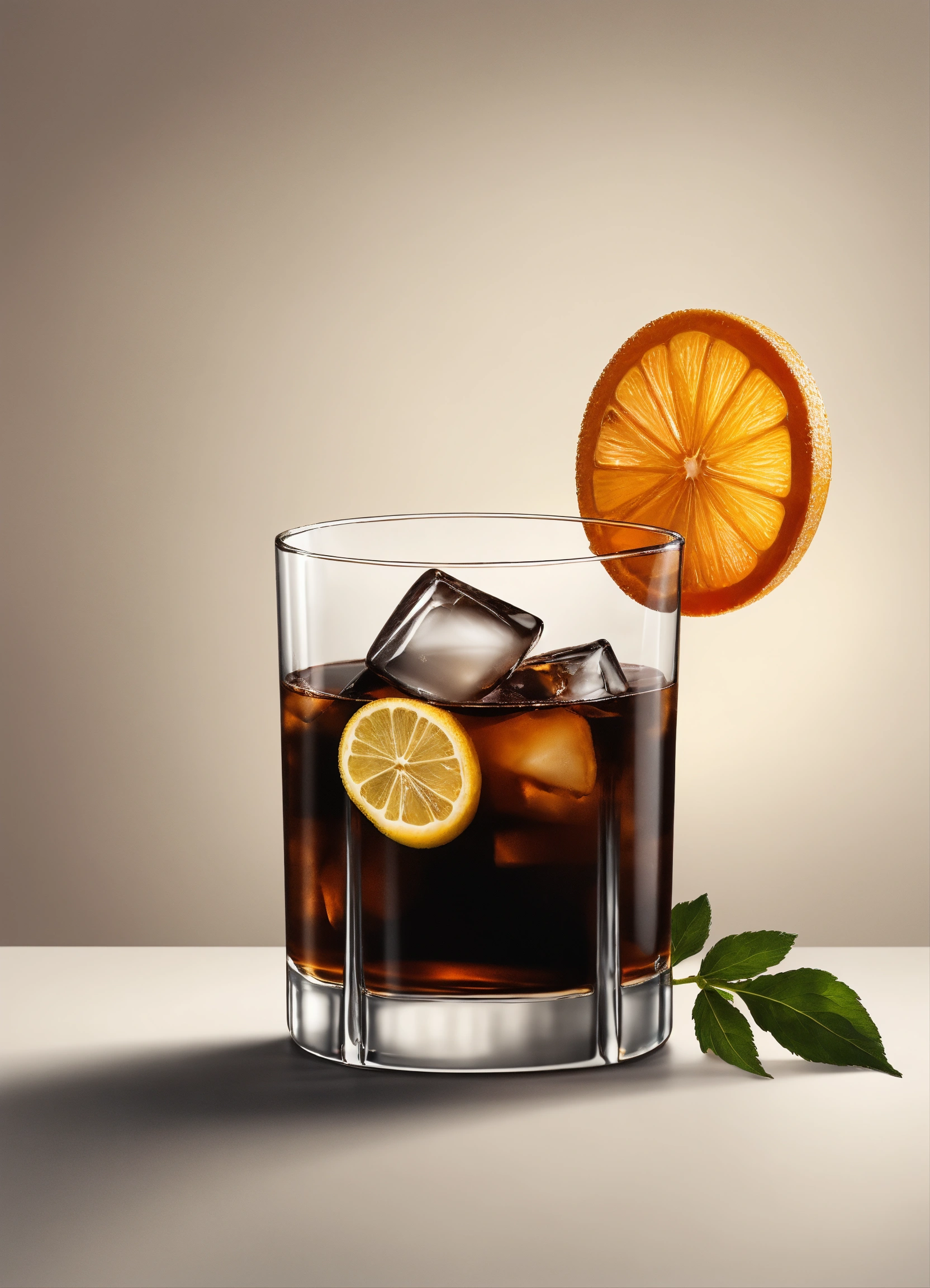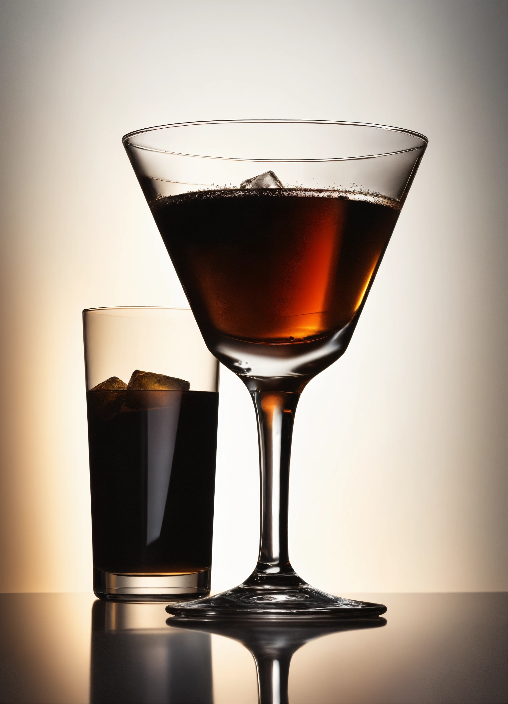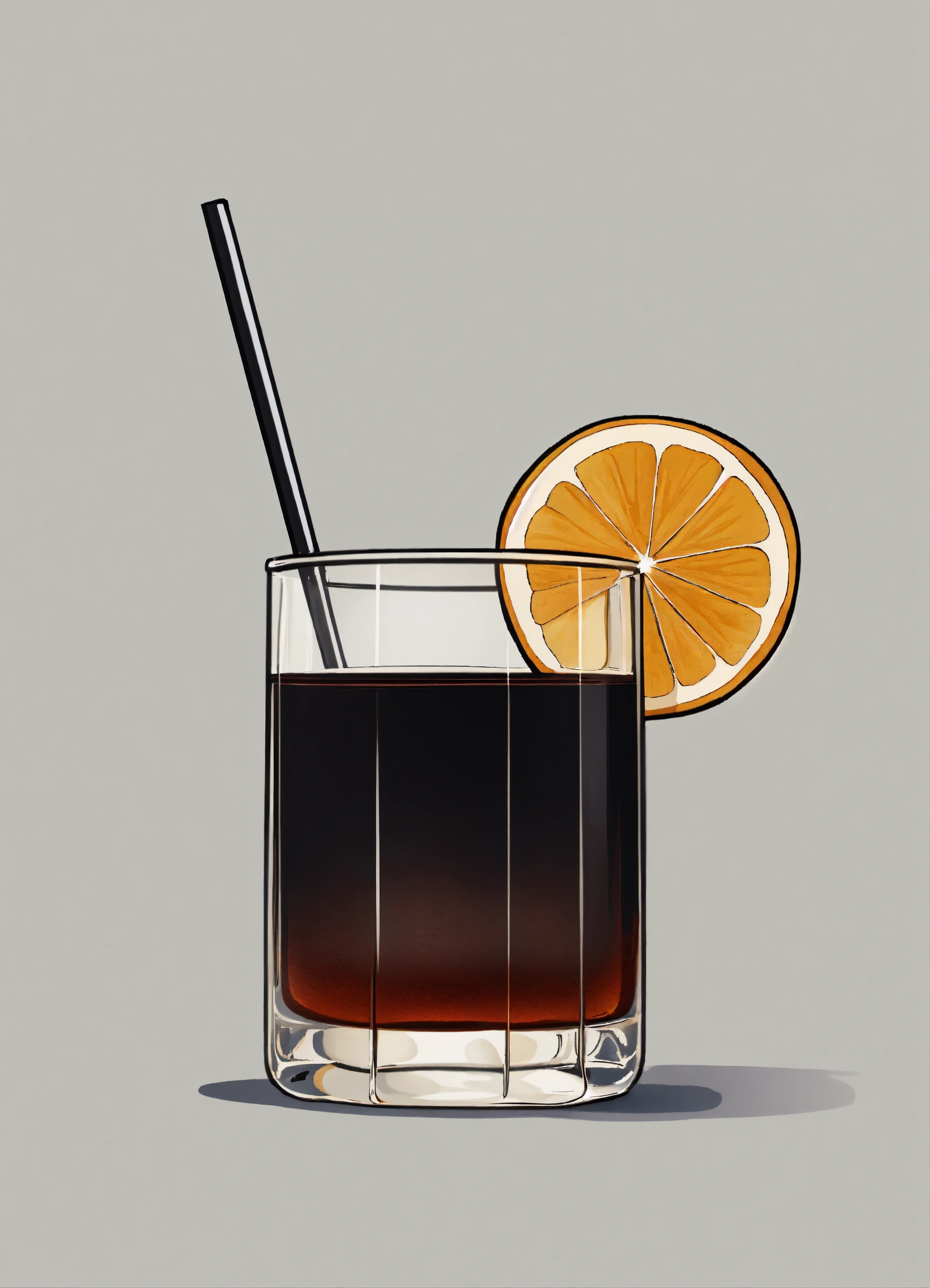 "an elegant, vector, catoonish, sophisticated, and minimalist representation of a black russian cocktail against a clean white background." no shadow short glass