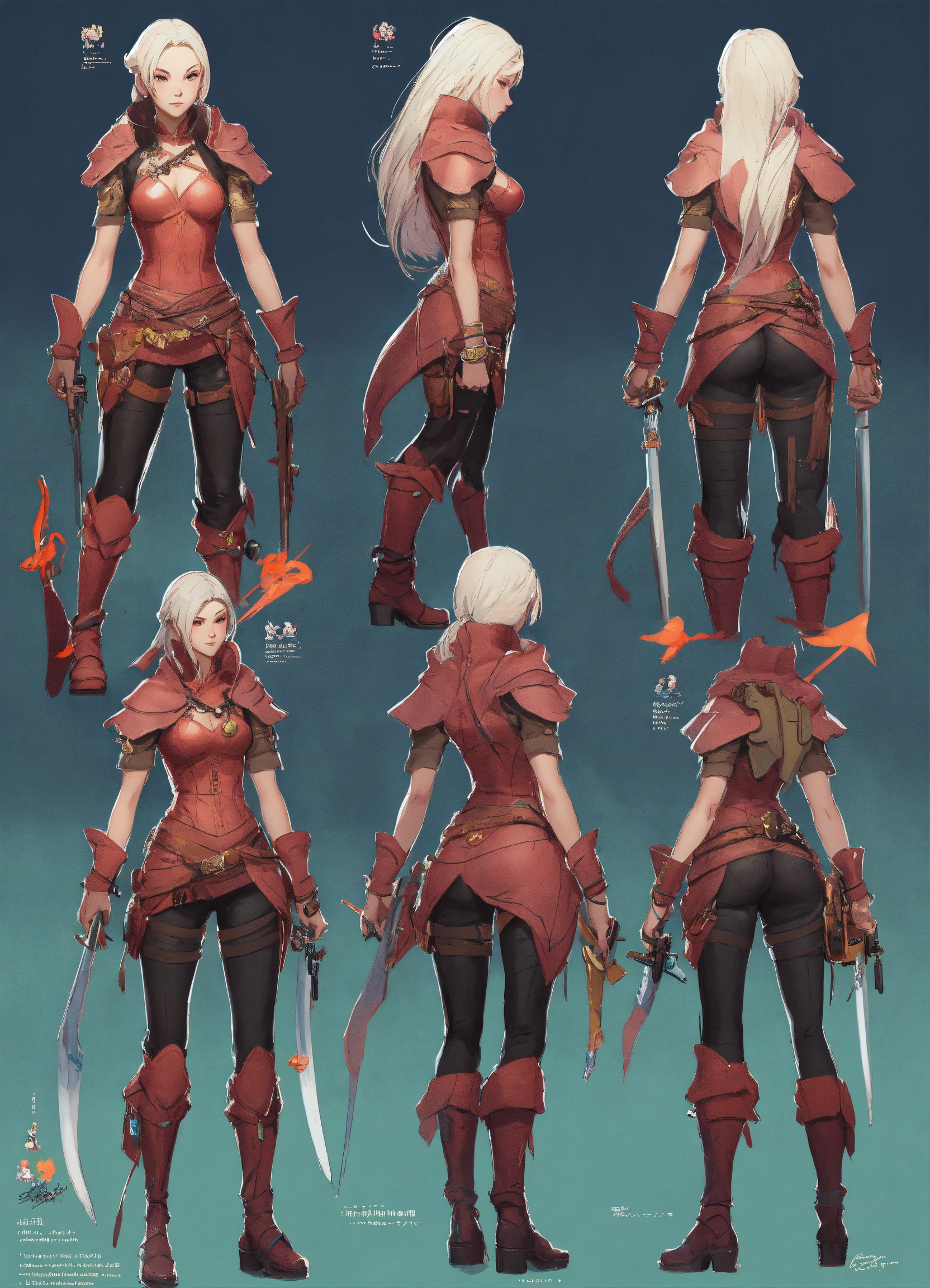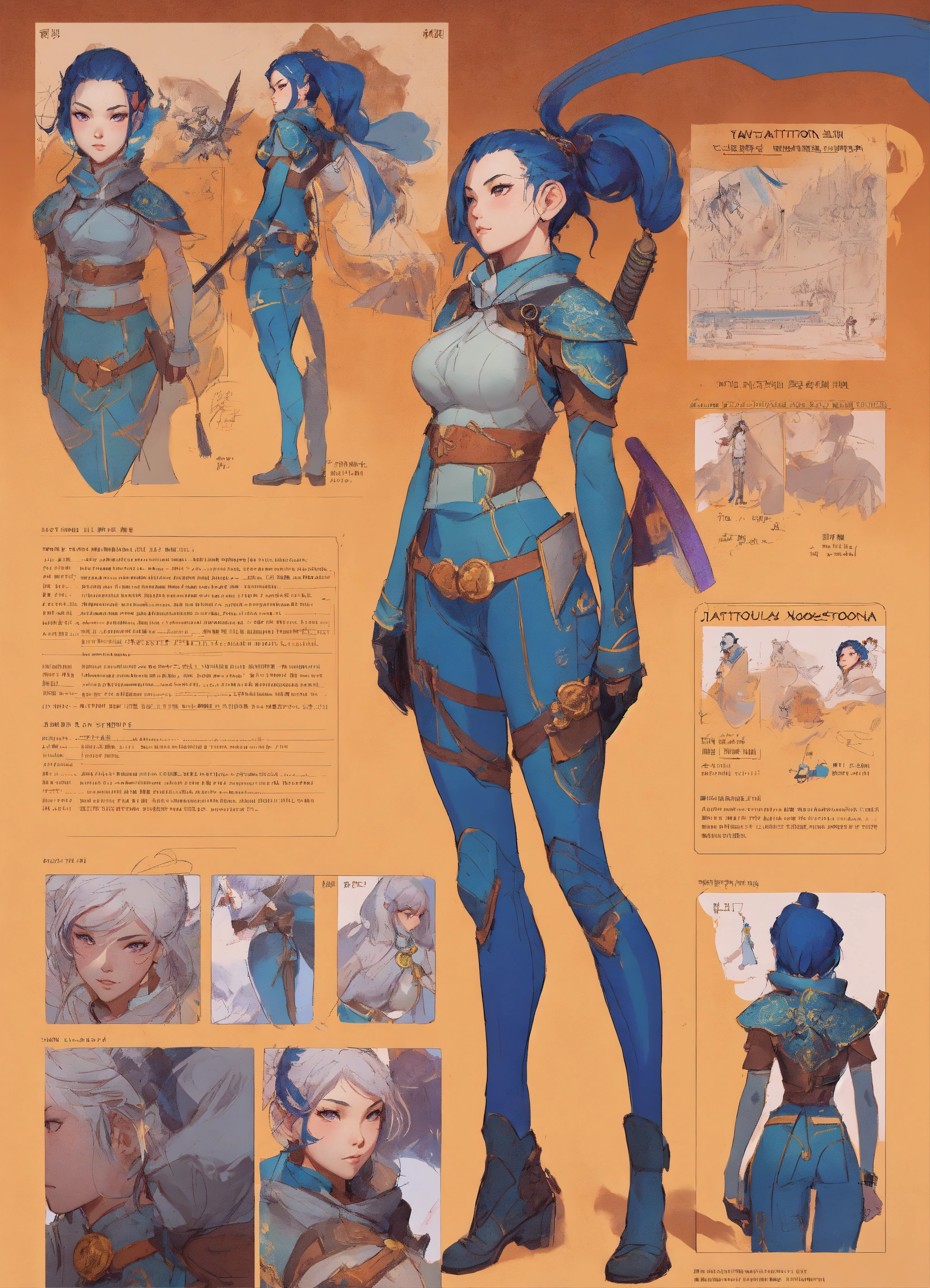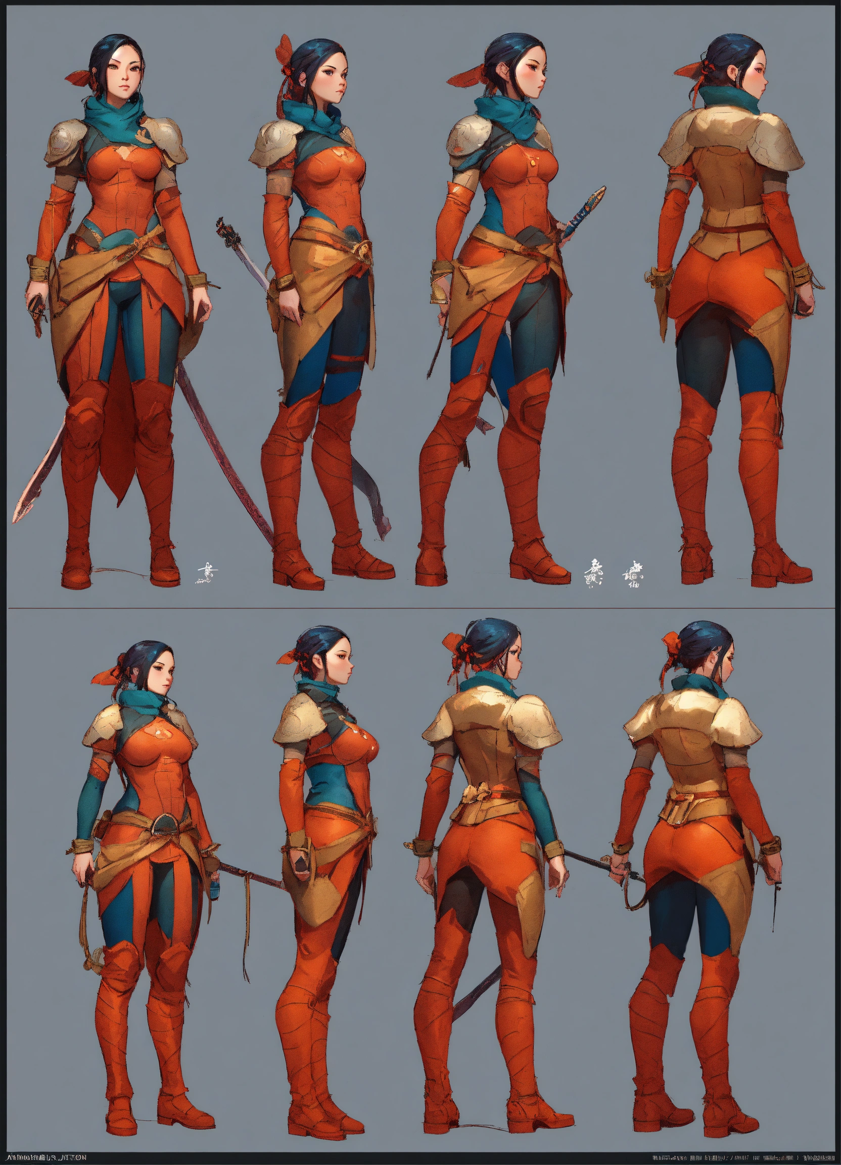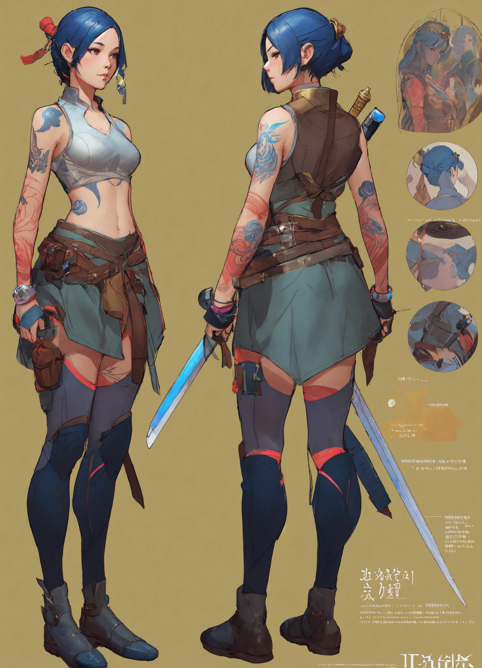 Back tattoed woman warrior, character sheet, character design, chart, reference sheet, multiple views, high detail, fine details, concept art, rossdraws, james jean, sakimichan, moebius, stanley artgerm lau, jayison devadas, phuoc quan, studio ghibli