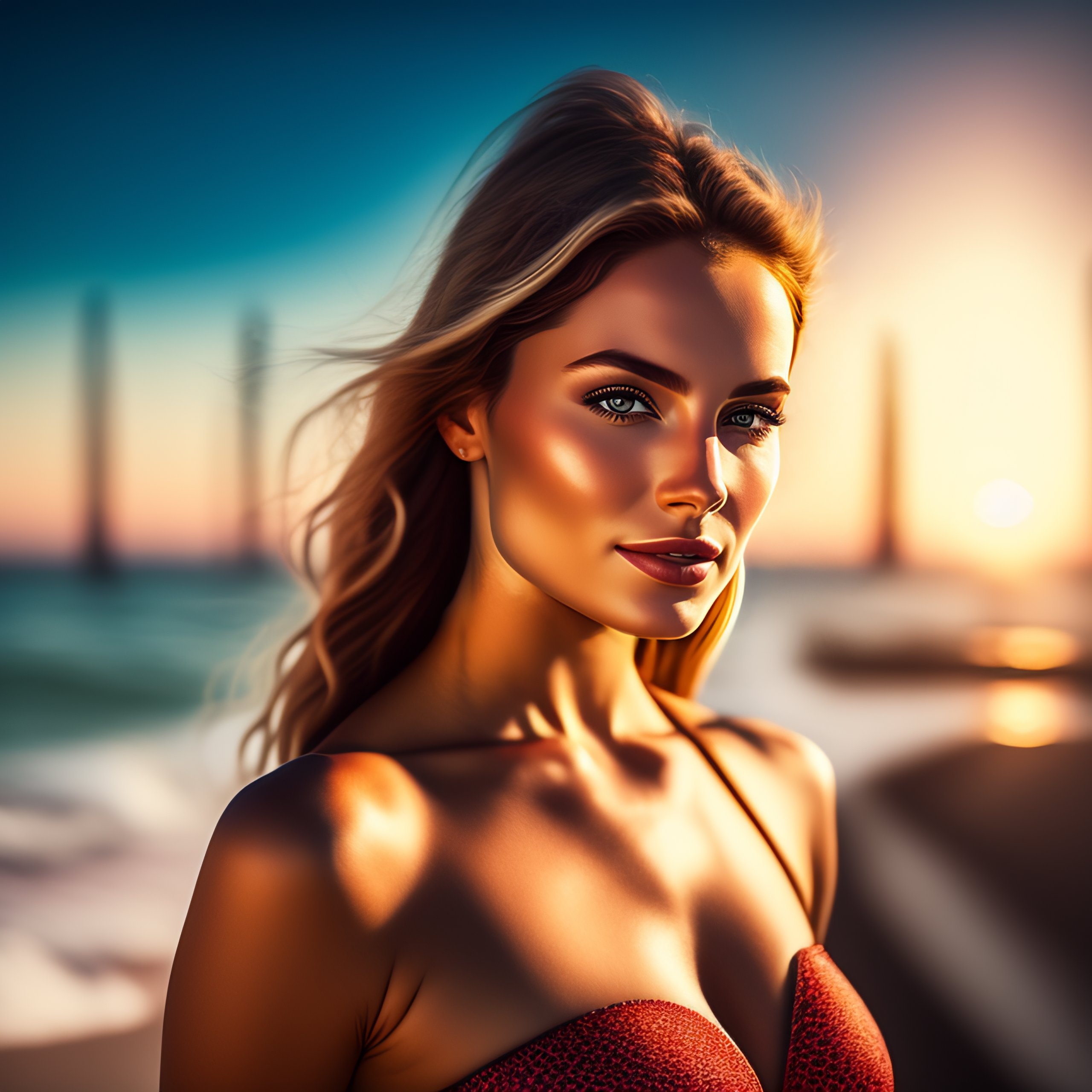 Realistic photo of russian women in bikini in ship city at day, realistic face, soft light, magic hour, detailed skin