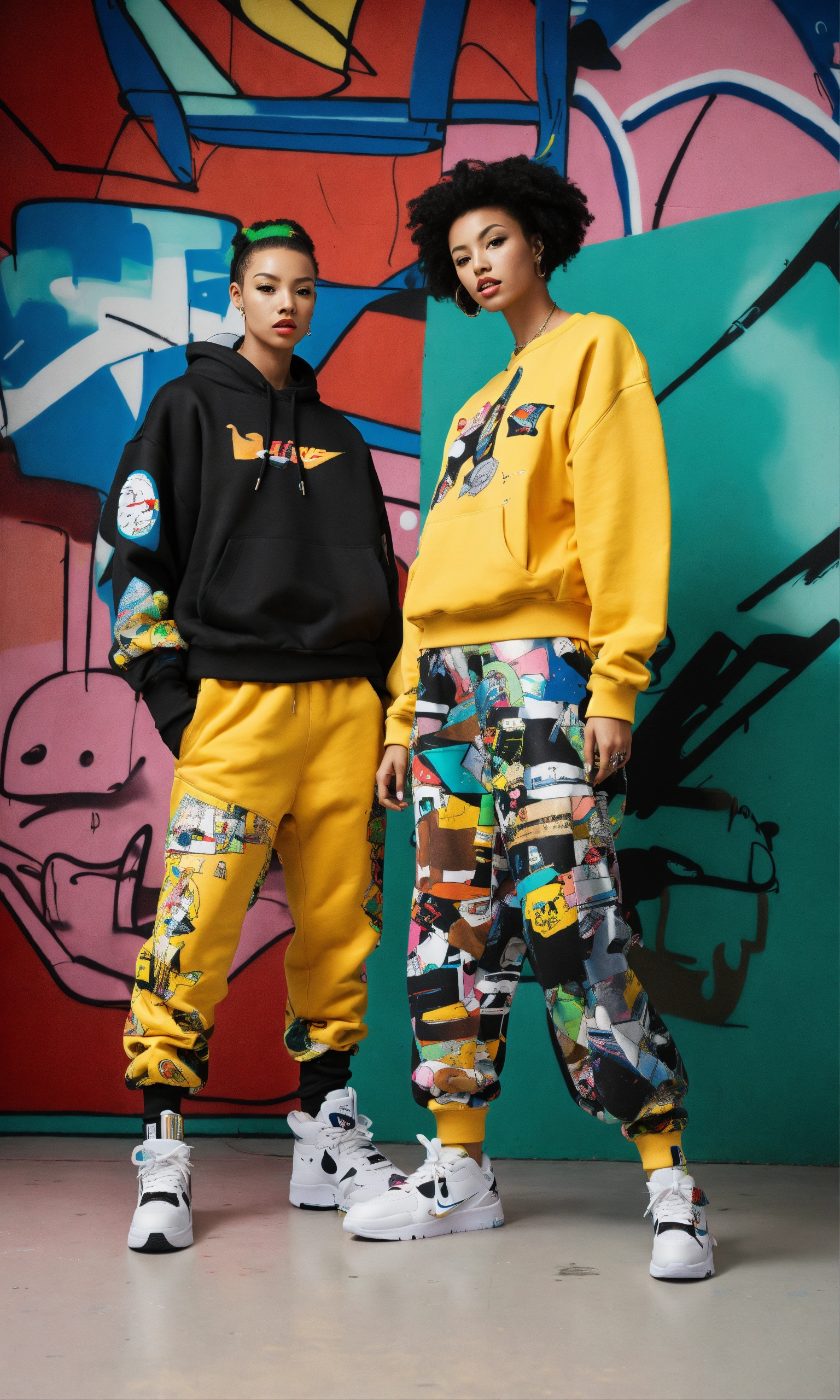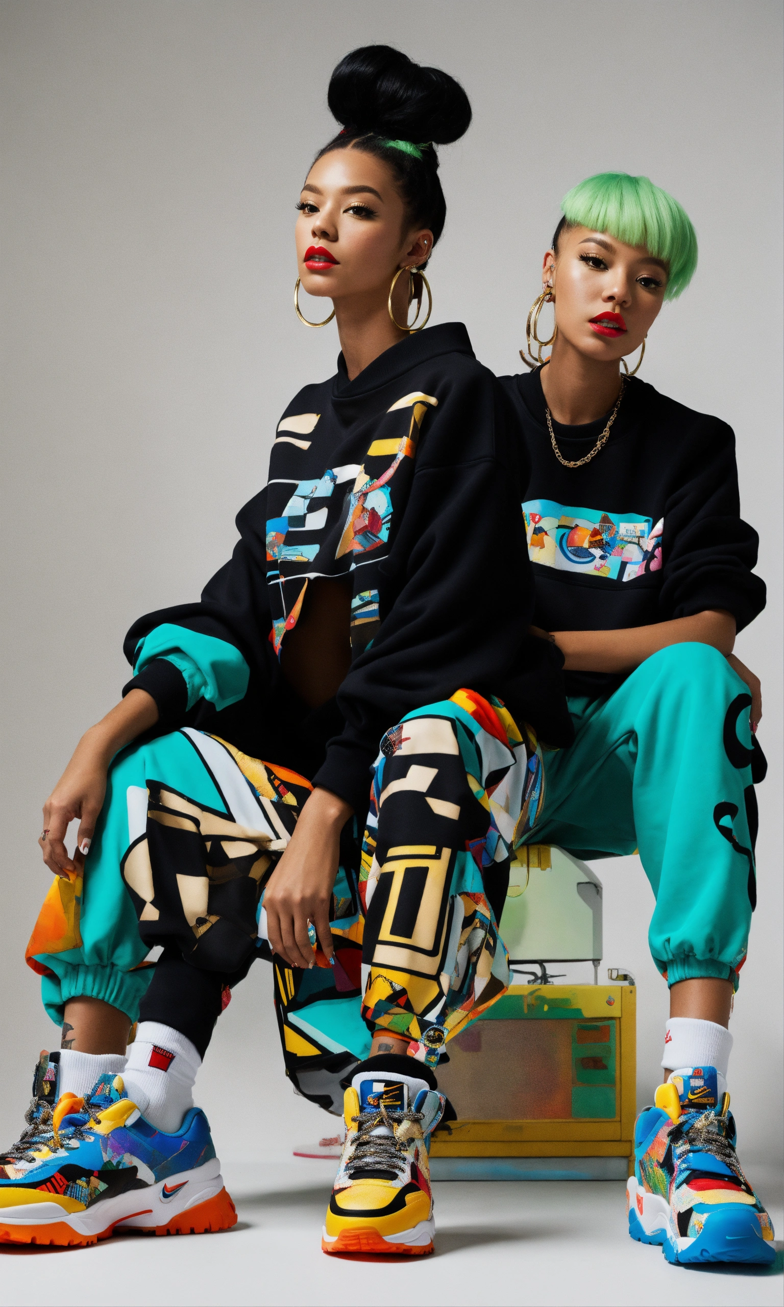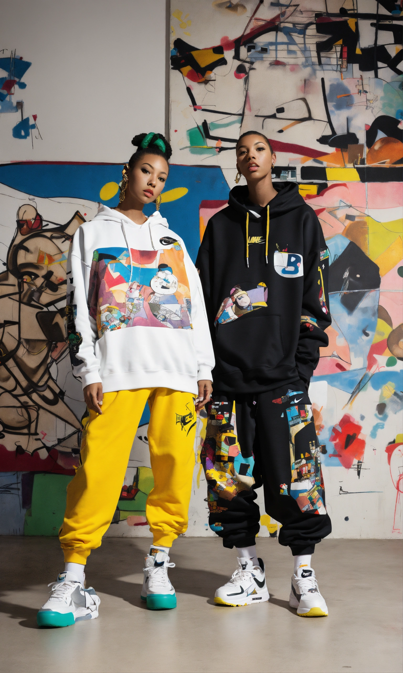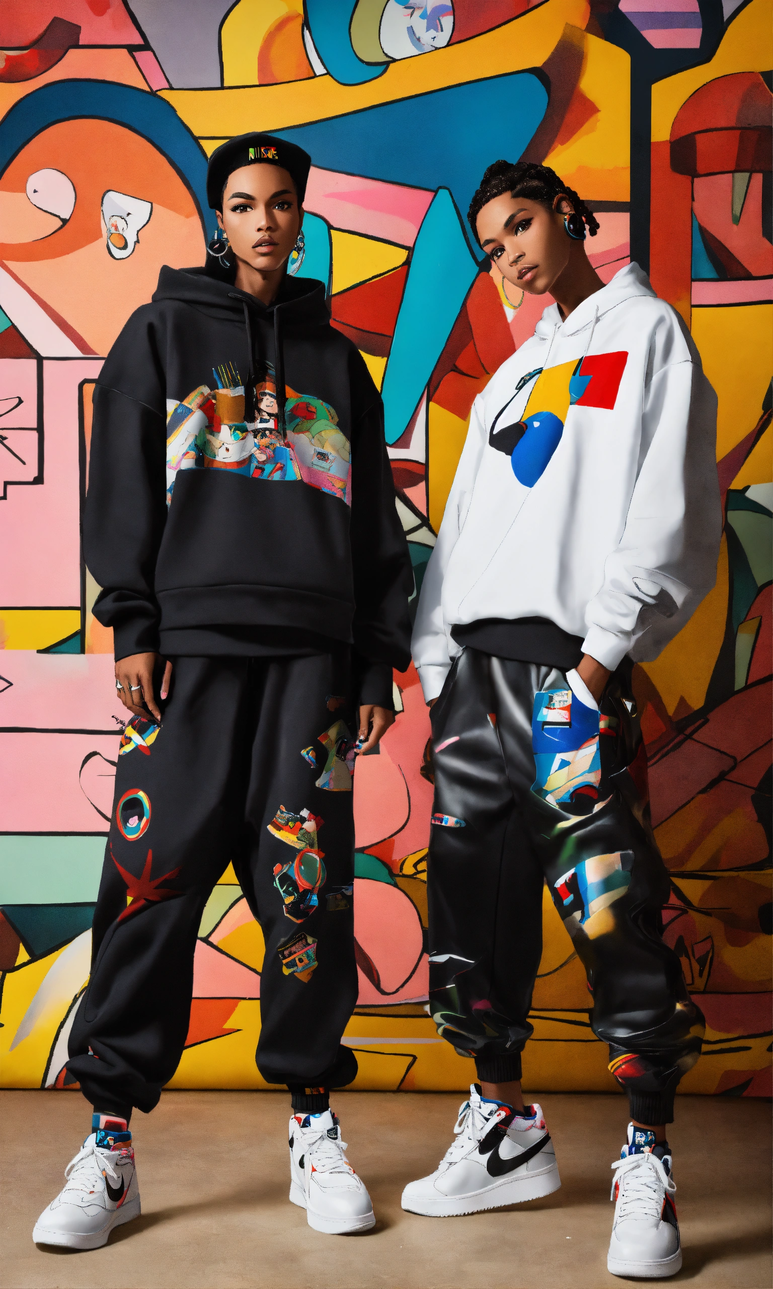 Black jetsons, anime, dream model chola american, pinup, nike sweatshirt and metallic-pants, cartoon futuristic shoes, twins photo of mixed and matched outfits, graffiti/kandinsky collaged clothing selects, line sheet lookbook nigo human made, isolated white studio space