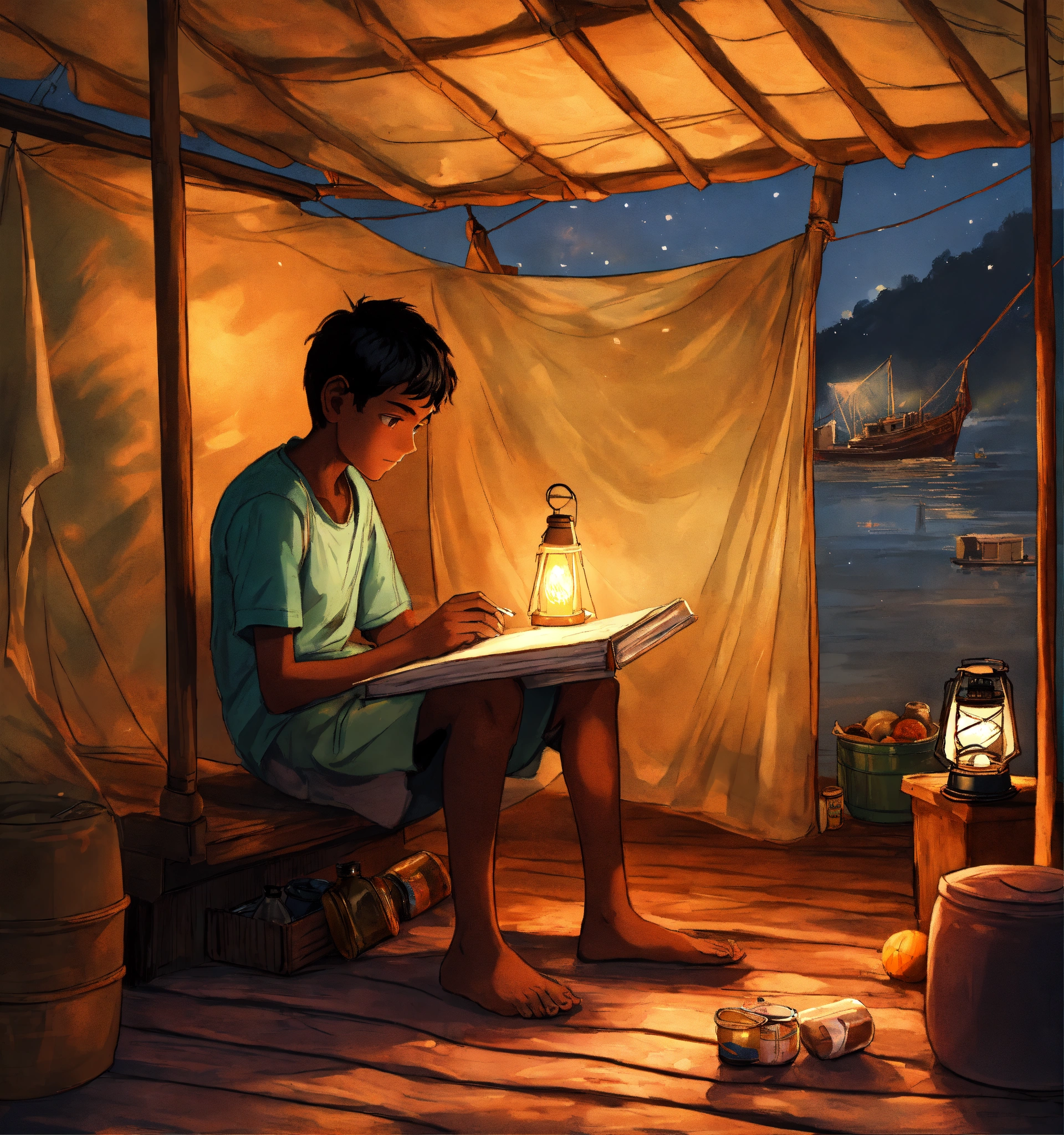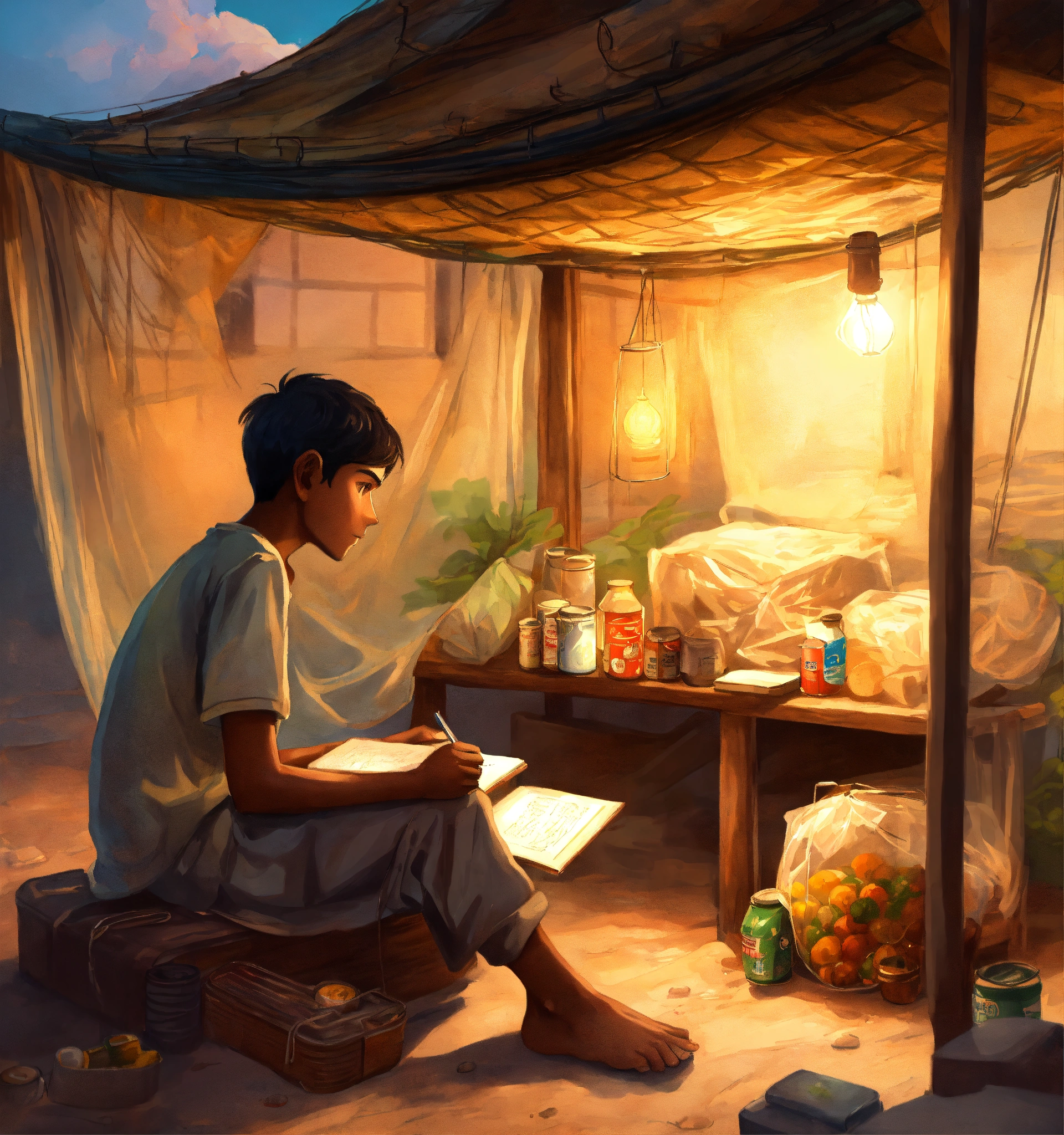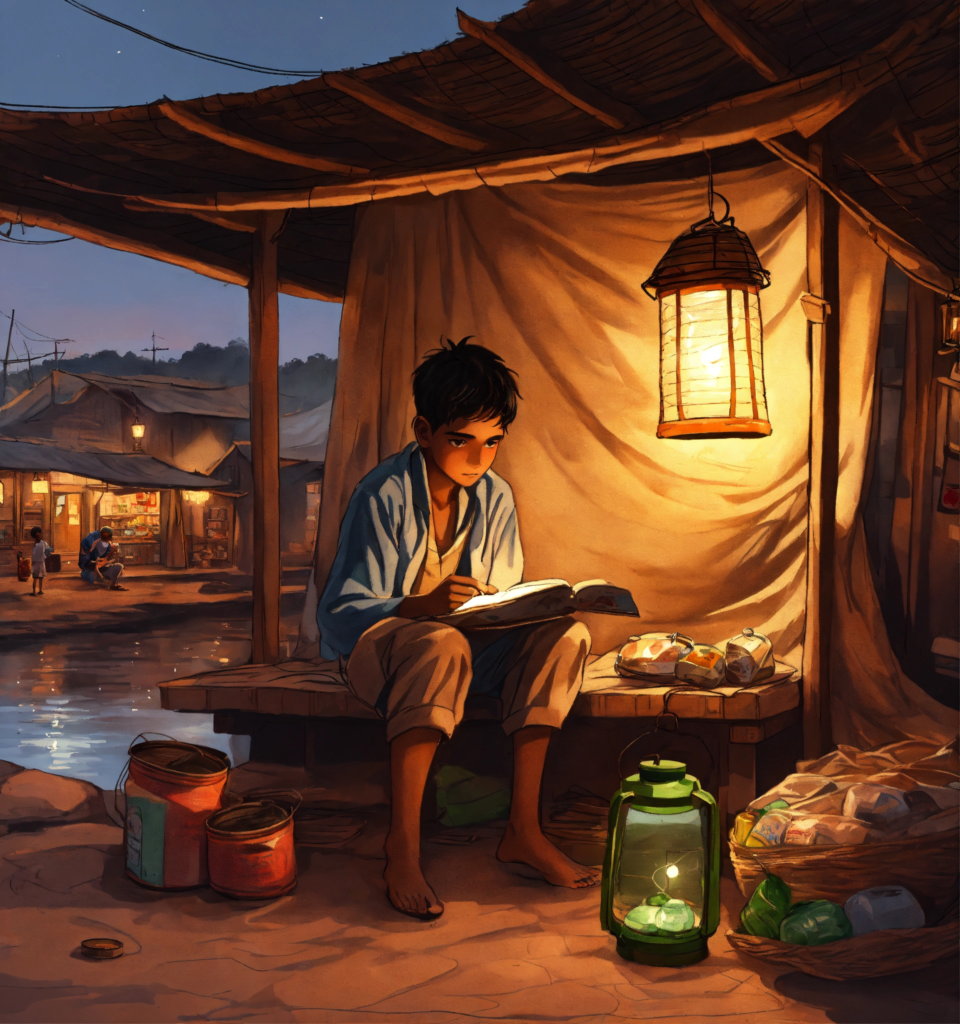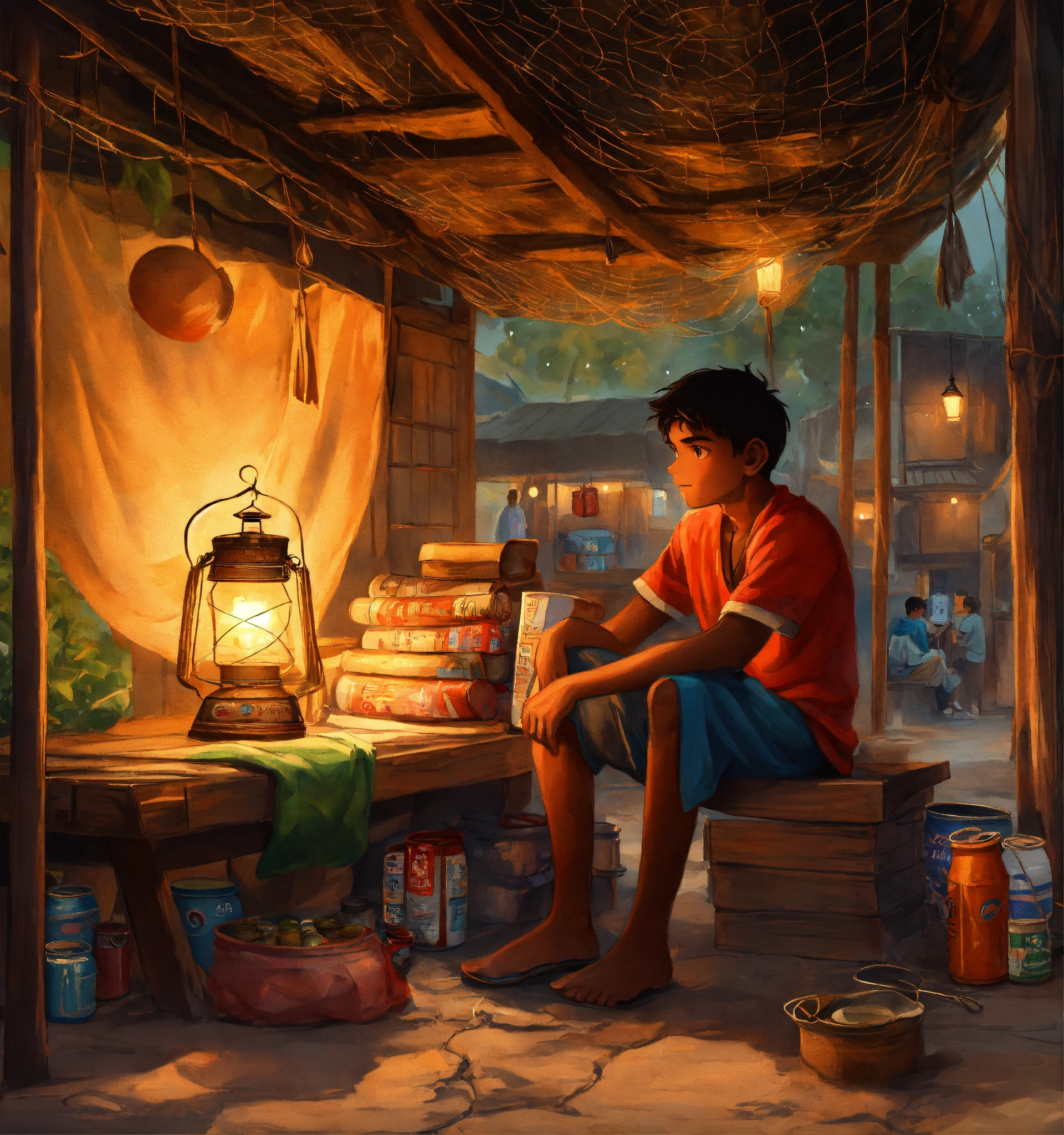 A hand drawn painting of a poor, young indian village boy sitting inside a mosquito net and trying to study with a little light coming from a lantern kept outside the net, he is sitting on a bench inside the ship with the tiny village shop filled with grocery items and oil cans kept on the ground, 8k, wide-angle, sharp, highly detailed, vibrant, vivid