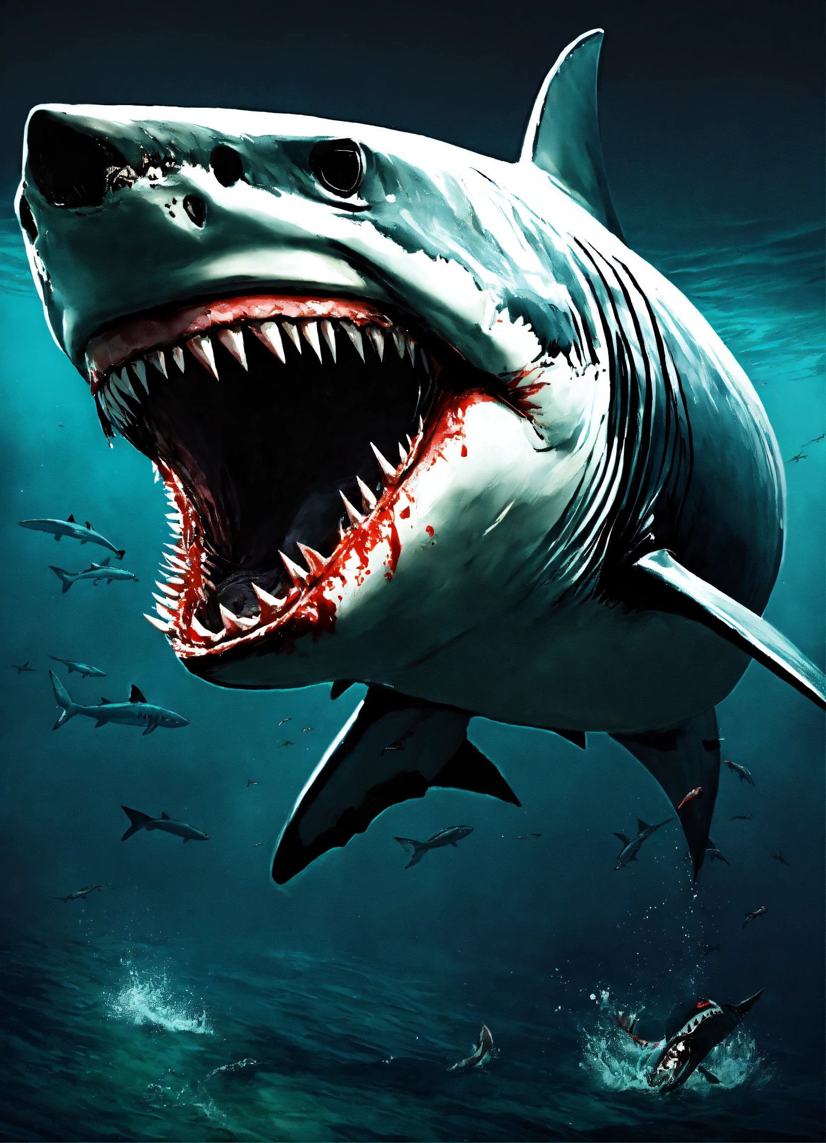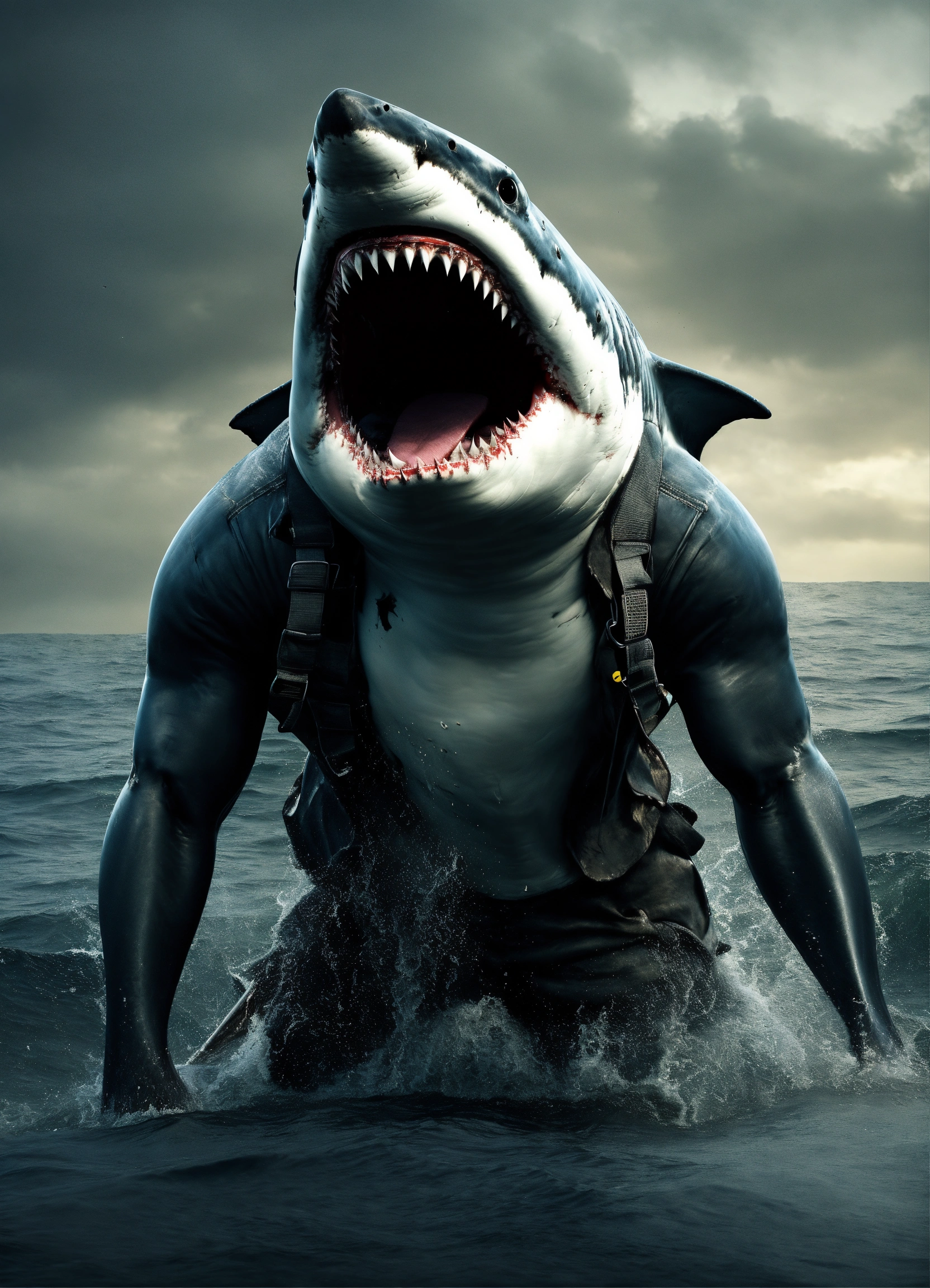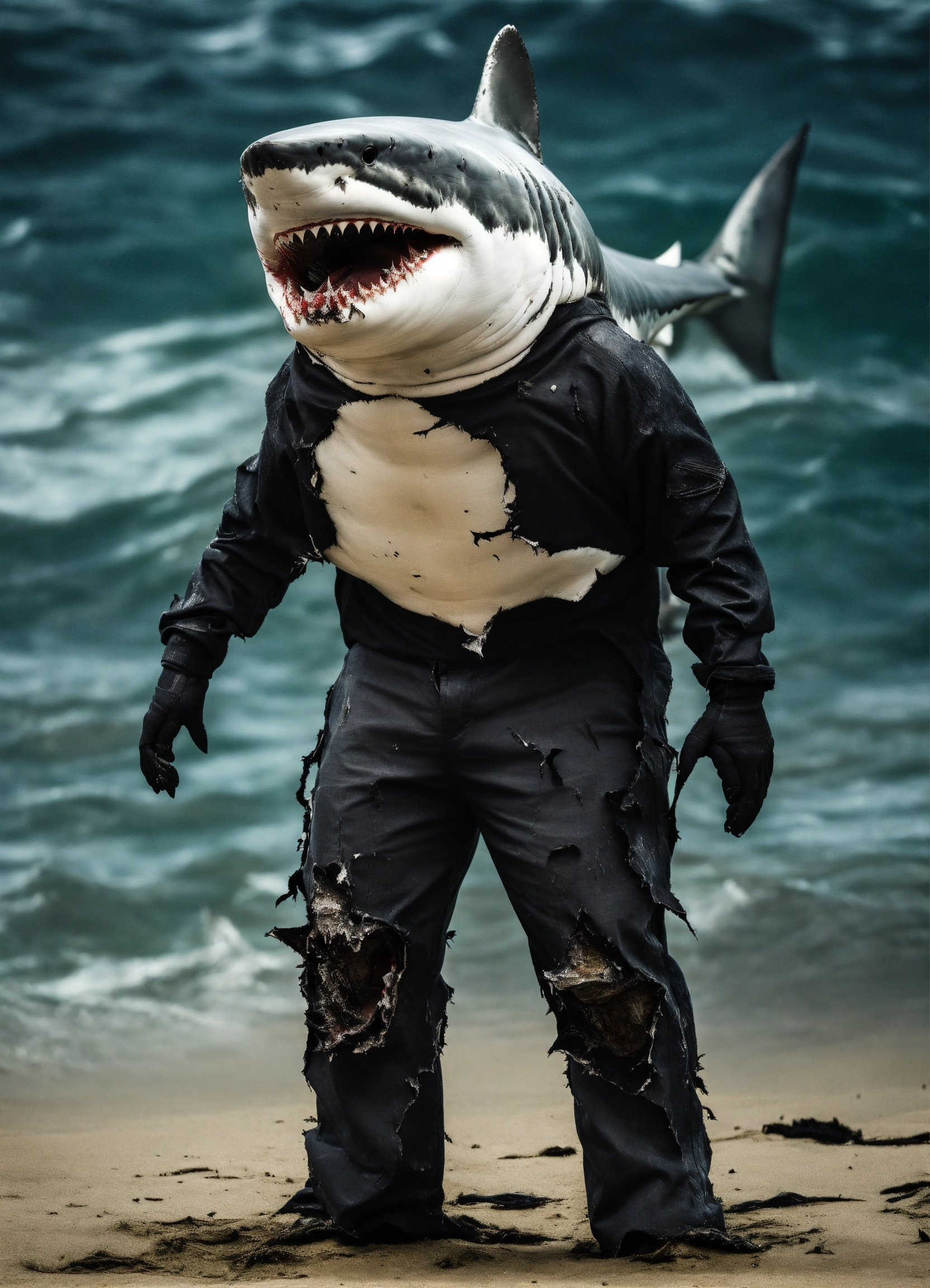 Humanoid great white shark with fanged mouths on body wearing torn black pants