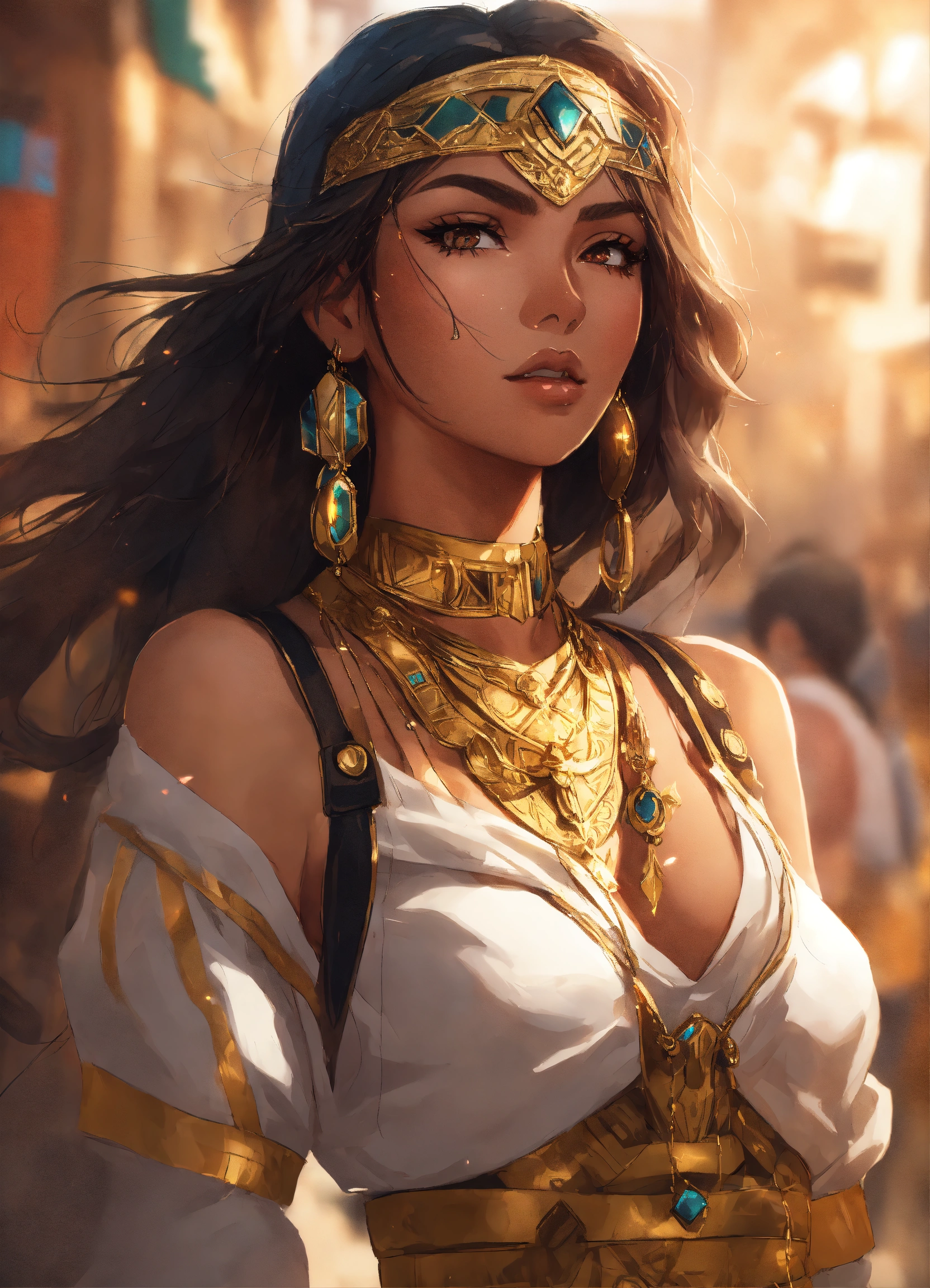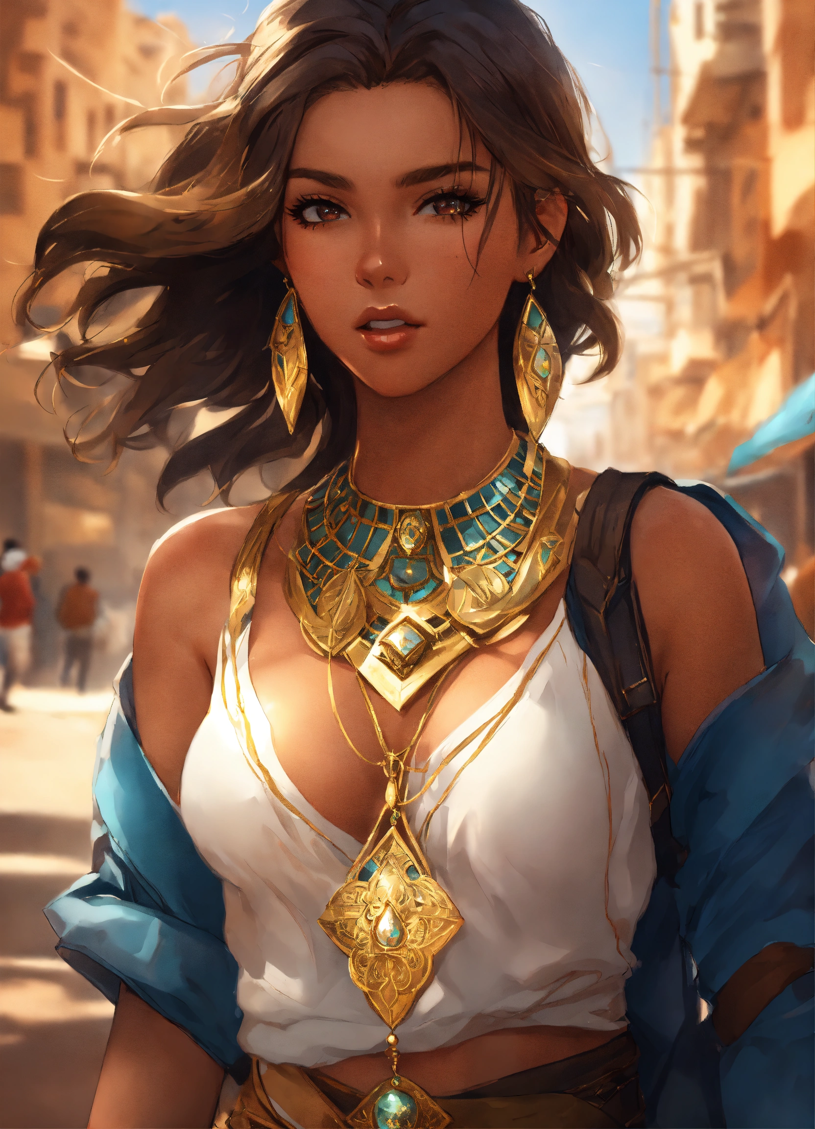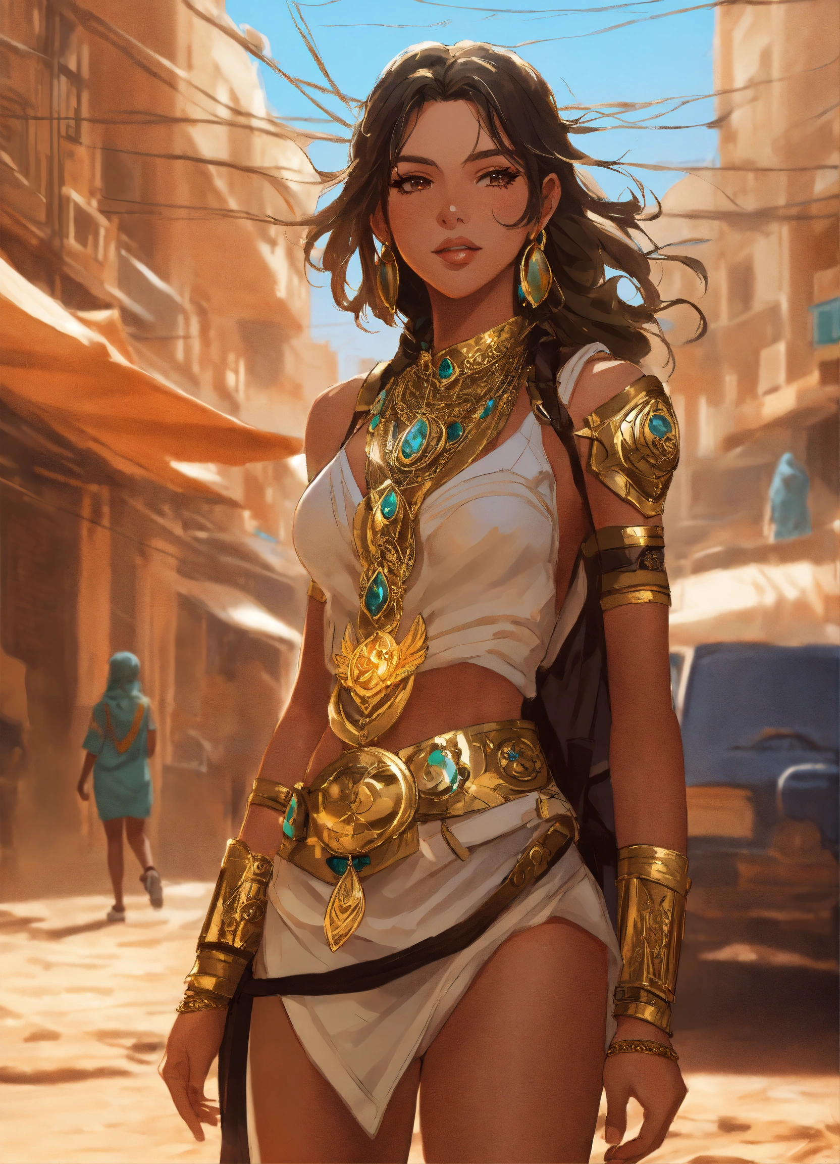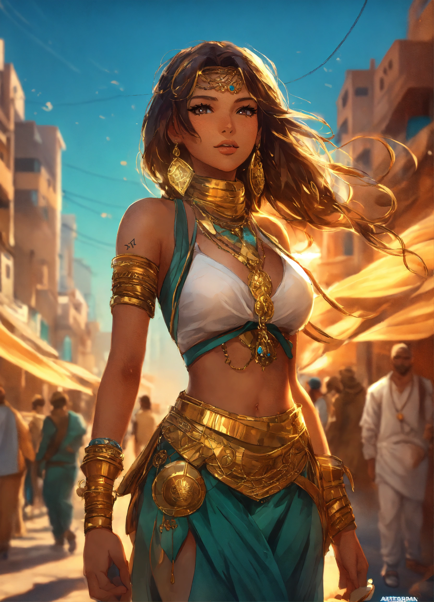 8k wallpaper of a beautiful anime adventurer girl wearing gold jewelry in the streets of a city in the western sahara, by artgerm, intricate detail, trending on artstation, 8k, fluid motion, stunning shading