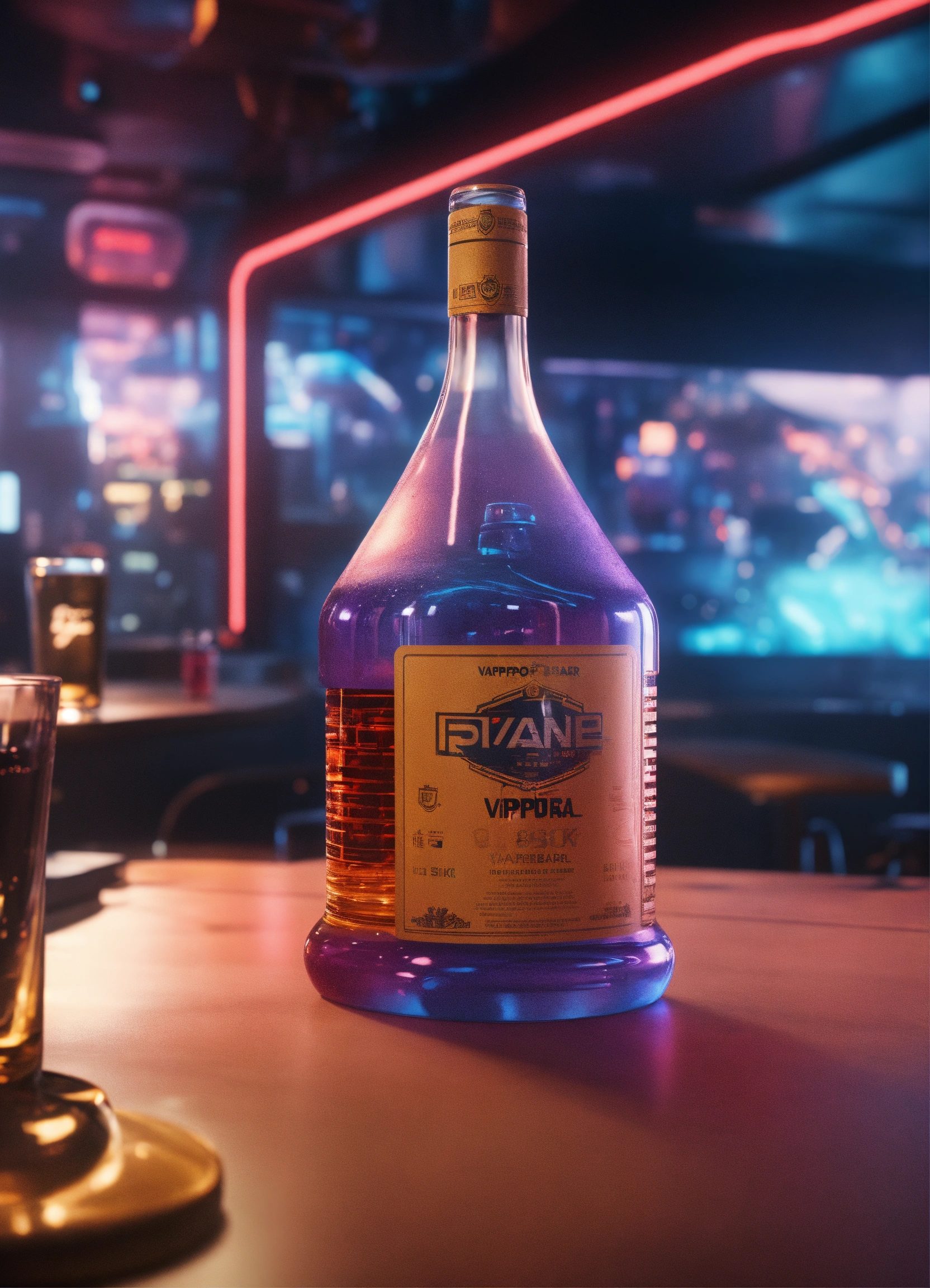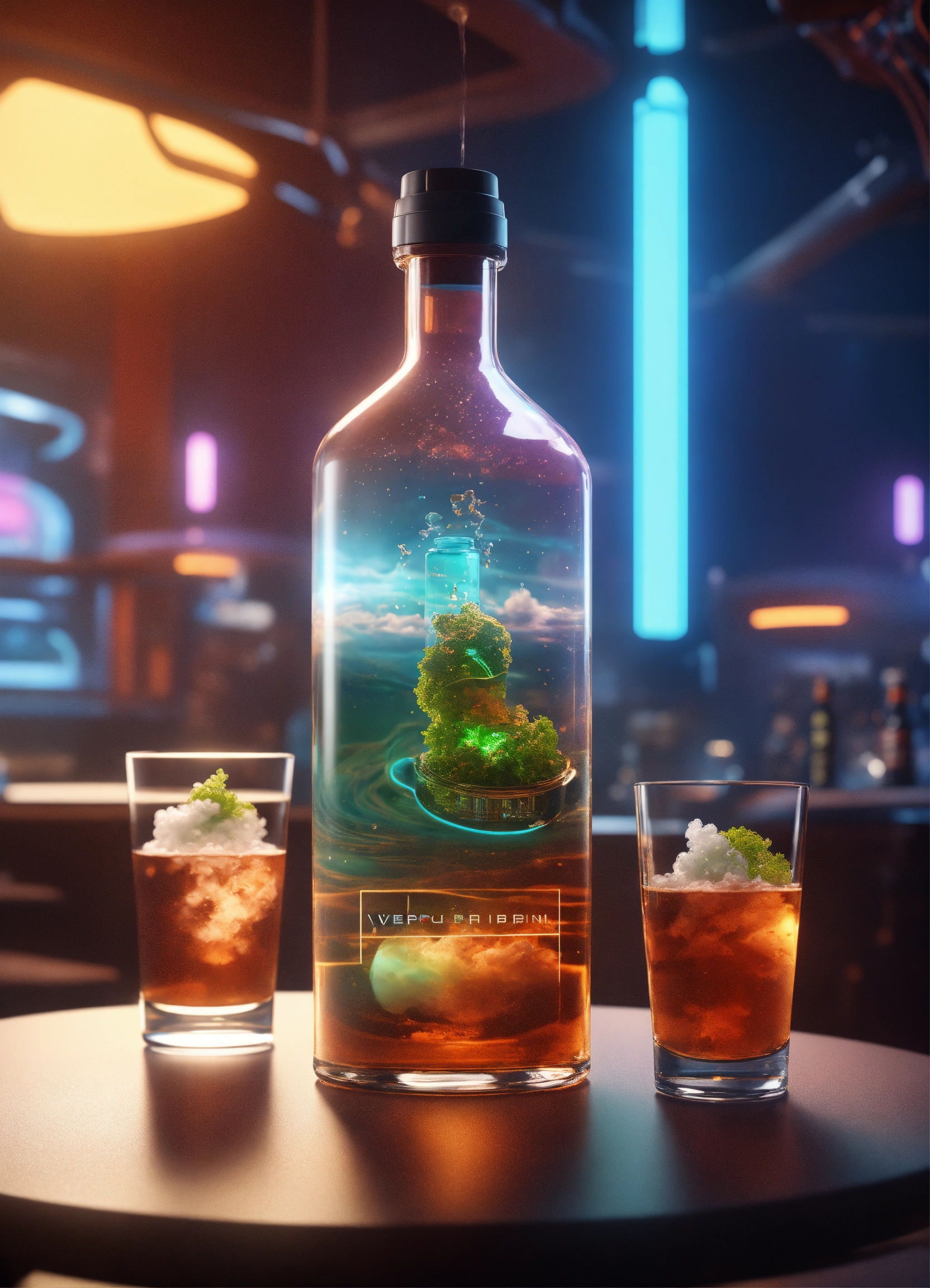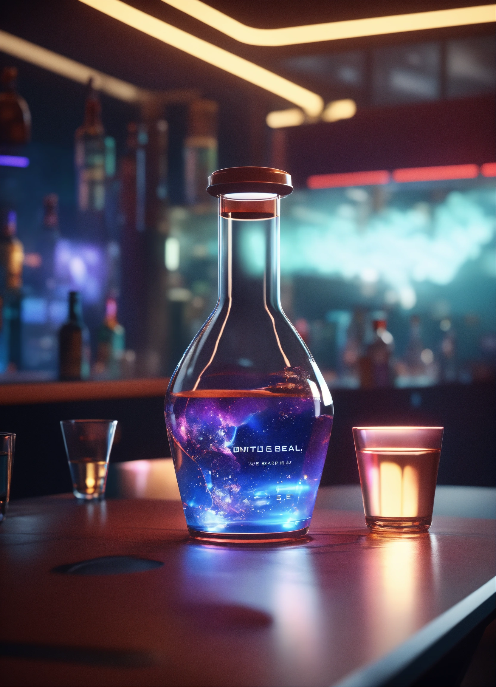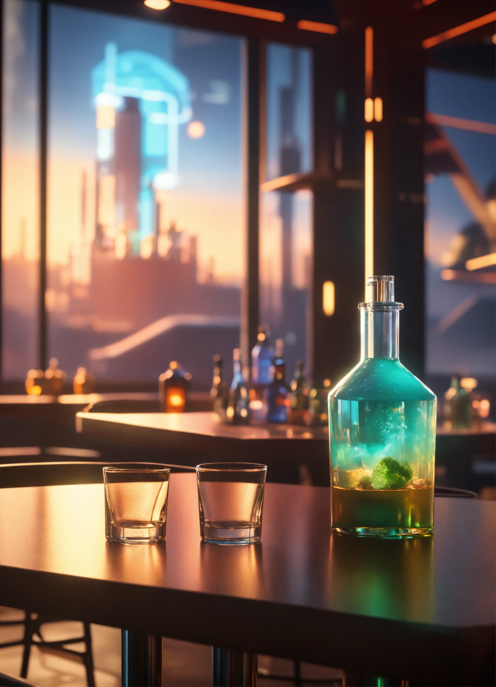 We see an odd shaped bottle sit on a table with some glasses with vapor coming of them, there is a poster in the background in a futuristic space port bar, 8k, unreal engine