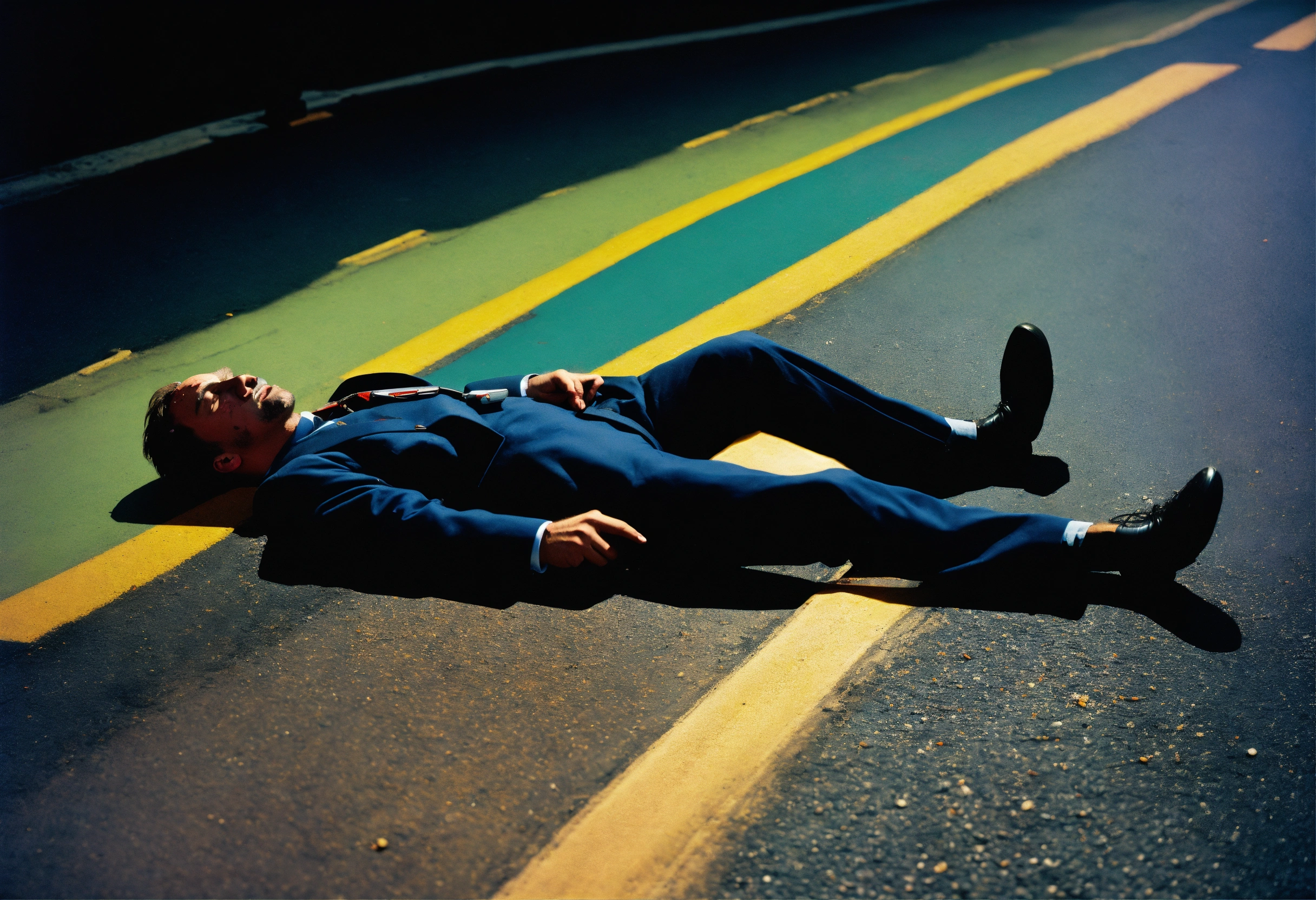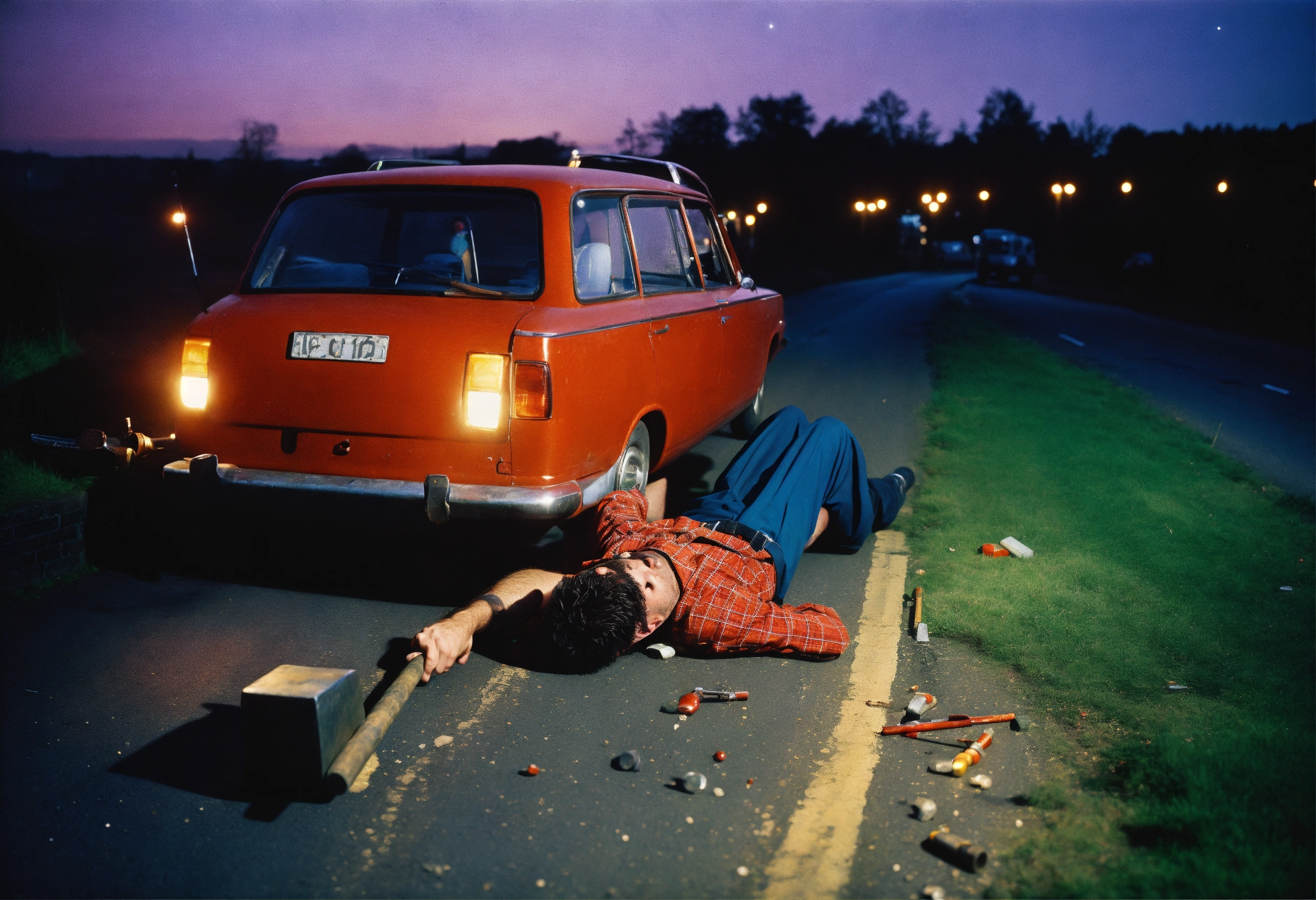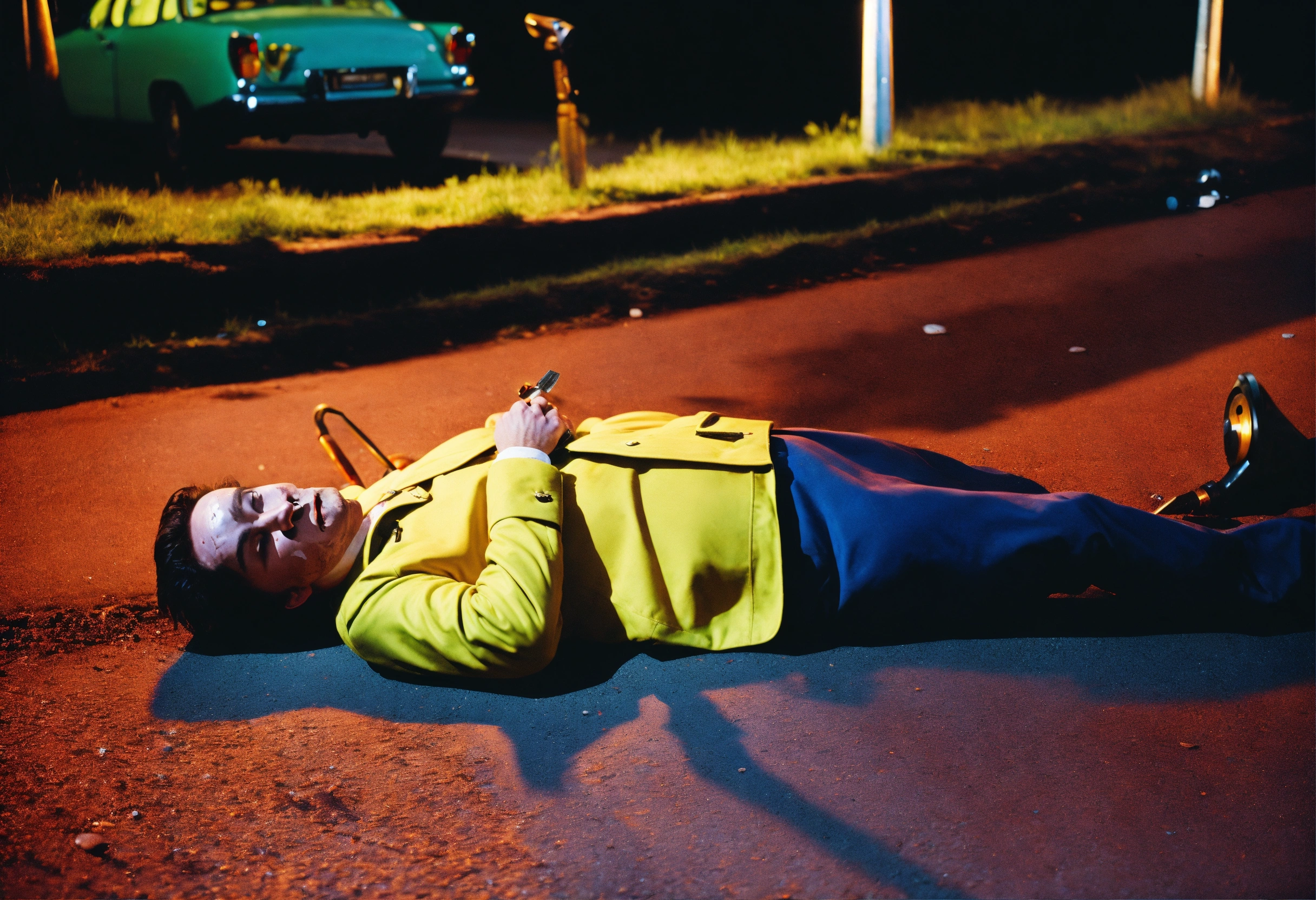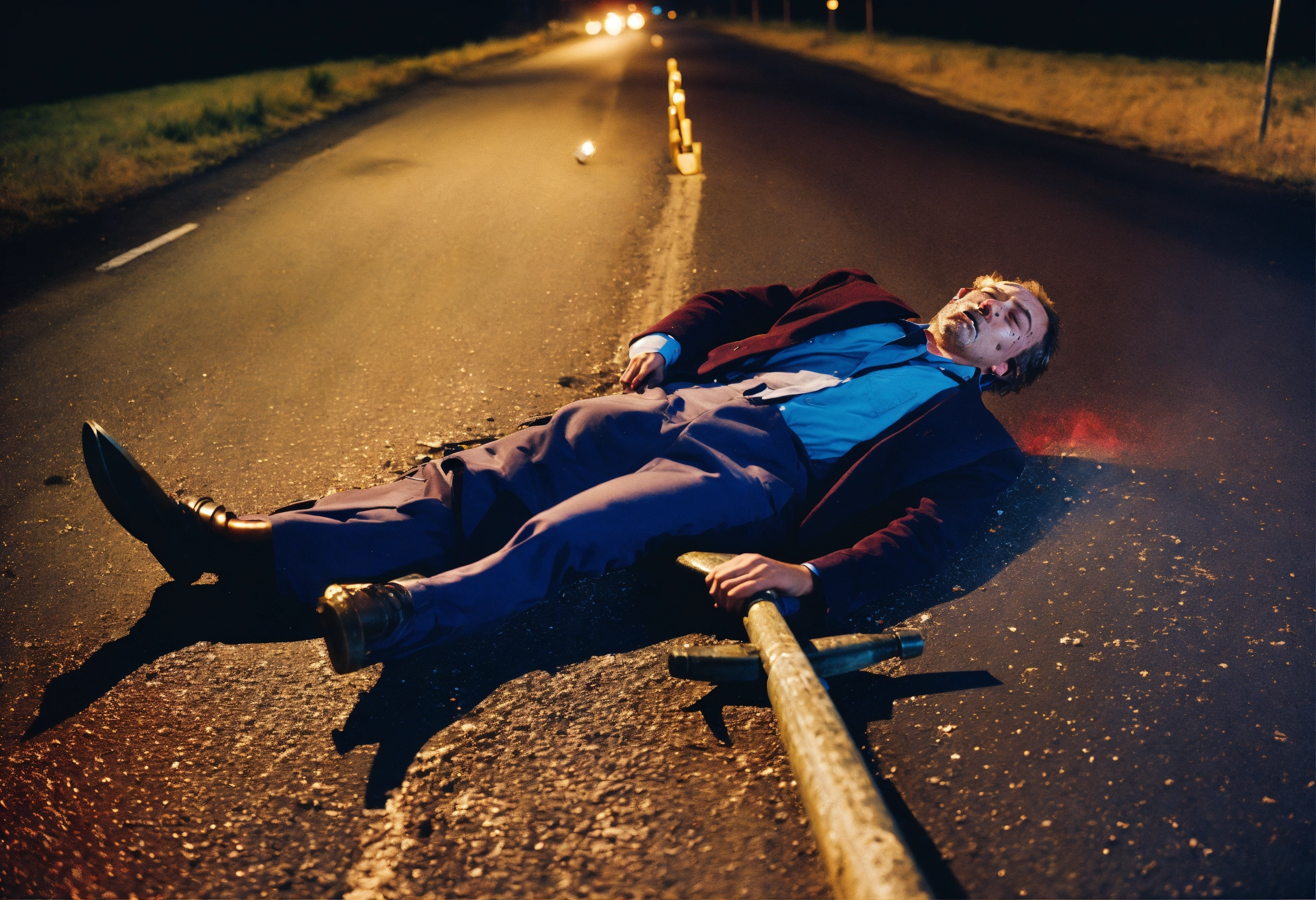 High angle viewpoint, scottish man, lying on a road with a hammer striking his face, night, artificial lighting, bold colours by william eggleston