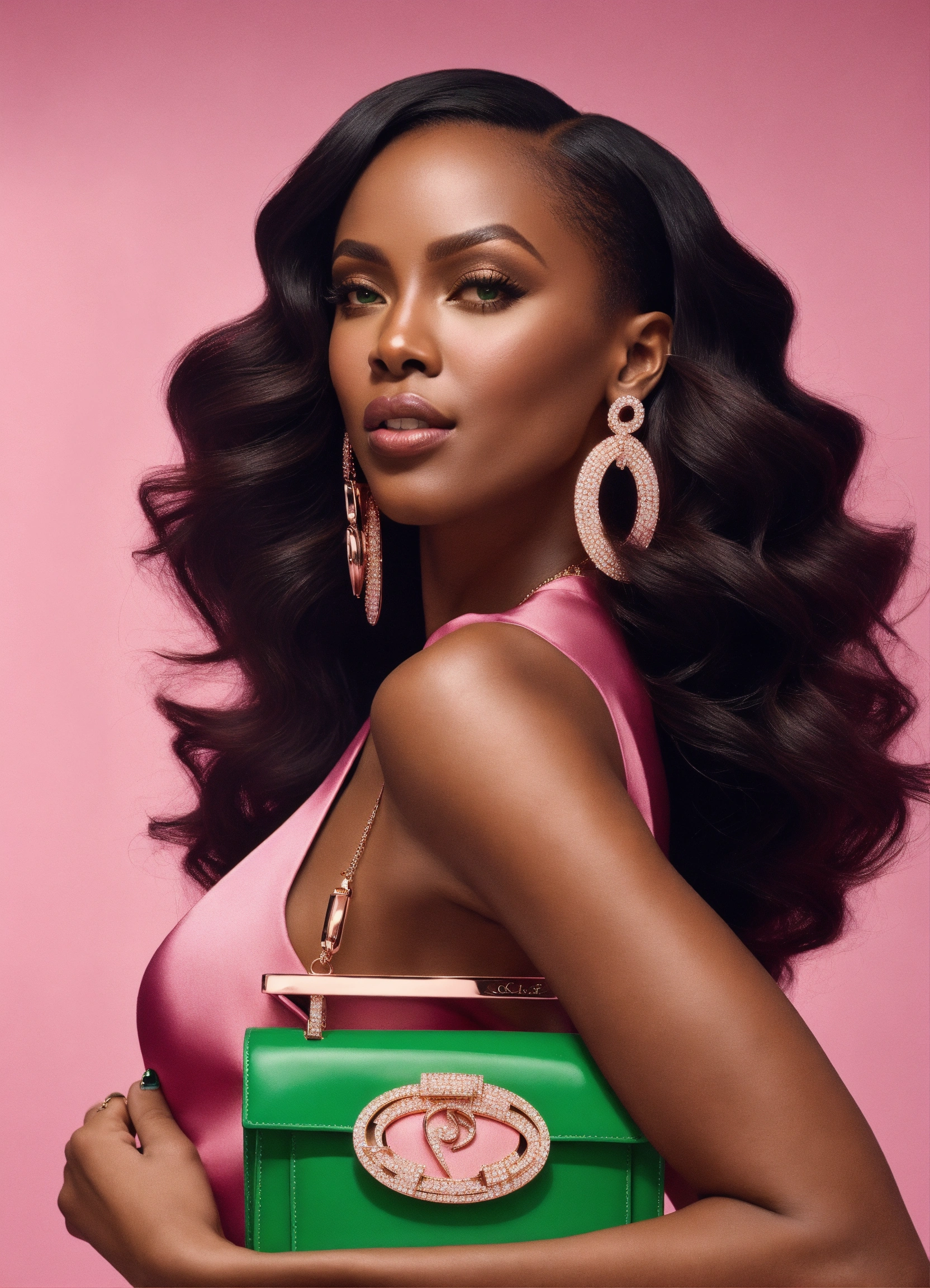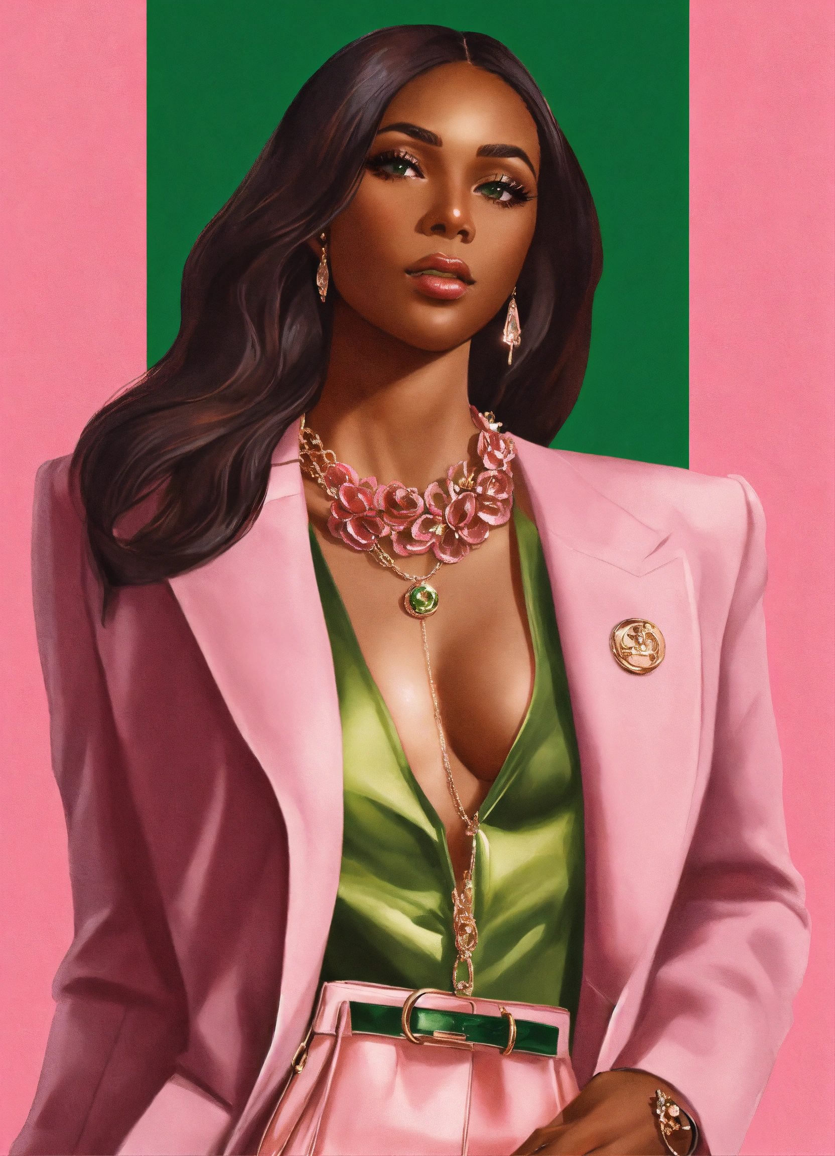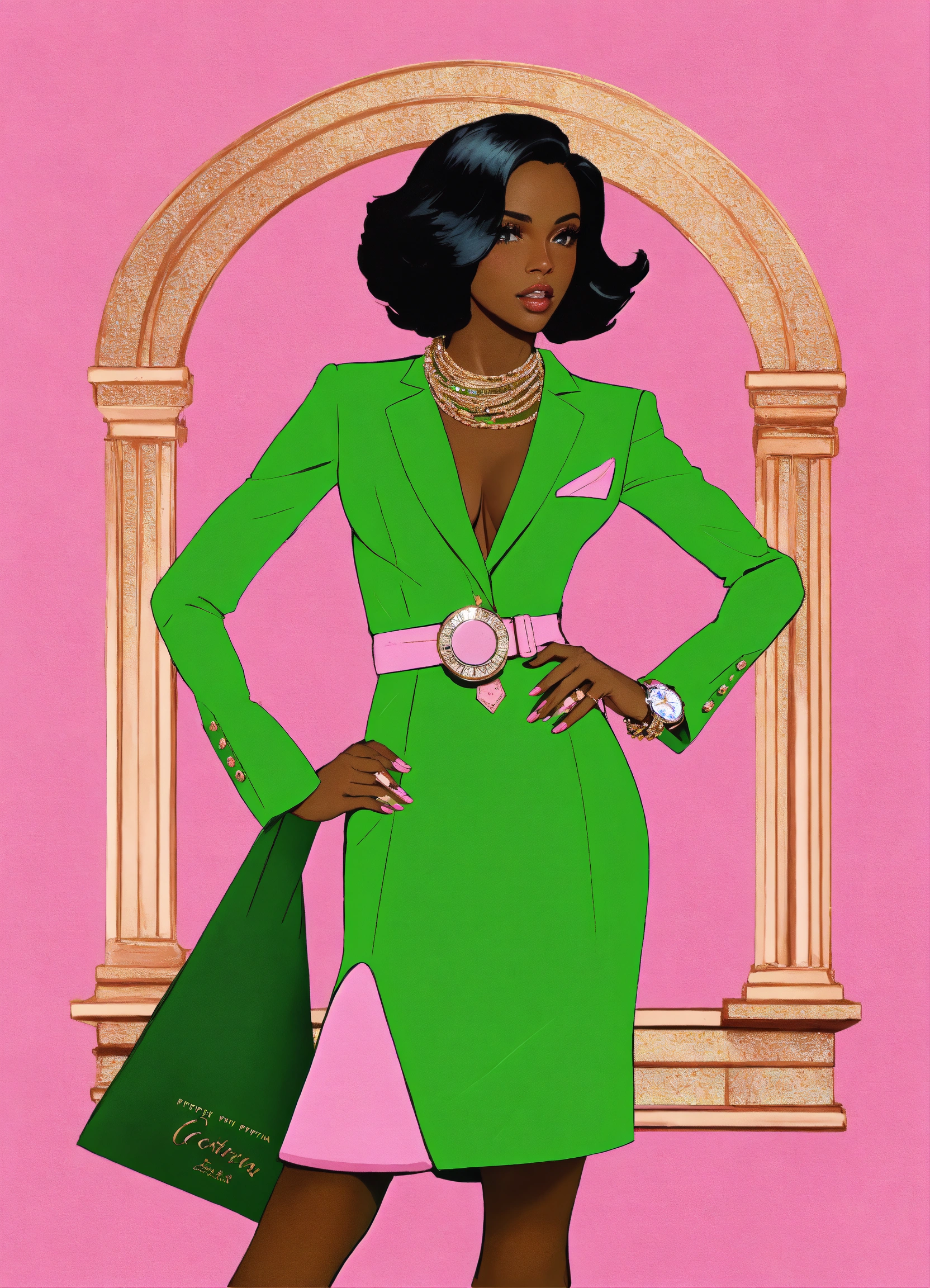 Craft a horizontal greeting card featuring a striking image of a powerful black businesswoman embodying the essence of alpha kappa alpha. she radiates confidence and strength, with a style reminiscent of naomi campbell, kelly rowland, ciara, and beyoncé. she's dressed in a chic haute couture business attire in the classic pink and green colors of alpha kappa alpha. accessorize her with an exquisite cartier love bracelet, a cartier nail bracelet, and a bvlgari serpenti tubogas 18k rose gold watch. she carries a pristine white birkin bag and walks gracefully in silver glitter stiletto heels. the design should emphasize fine details, with no background, allowing the viewer to appreciate the elegance of the subject. this card celebrates the sisterhood and excellence of alpha kappa alpha. - greg rutkowski