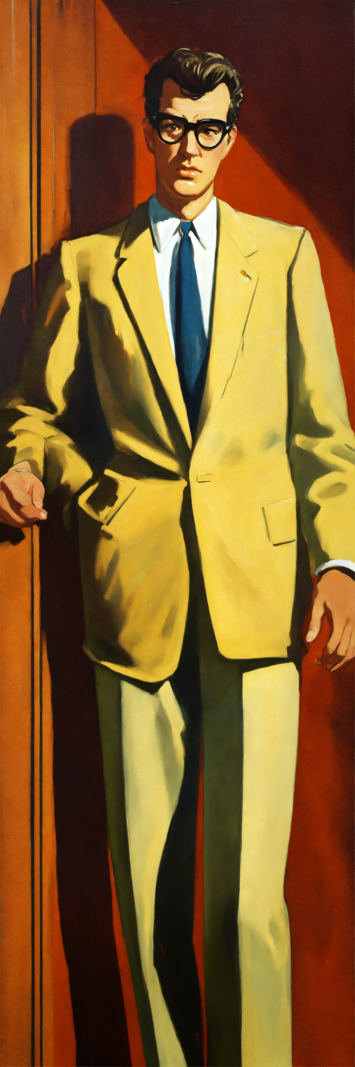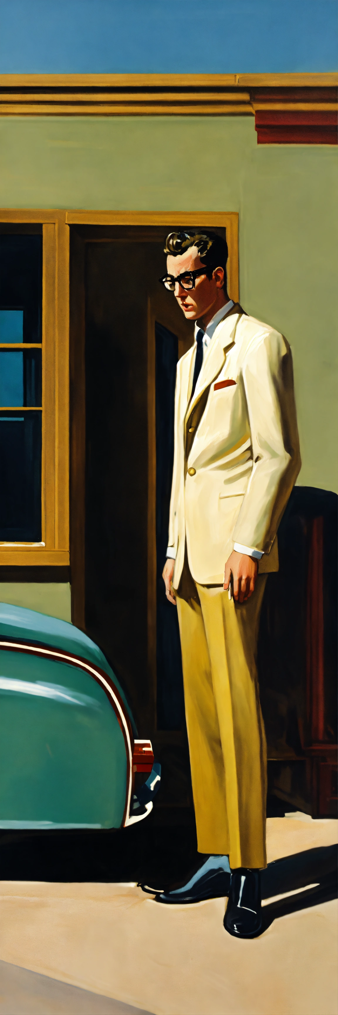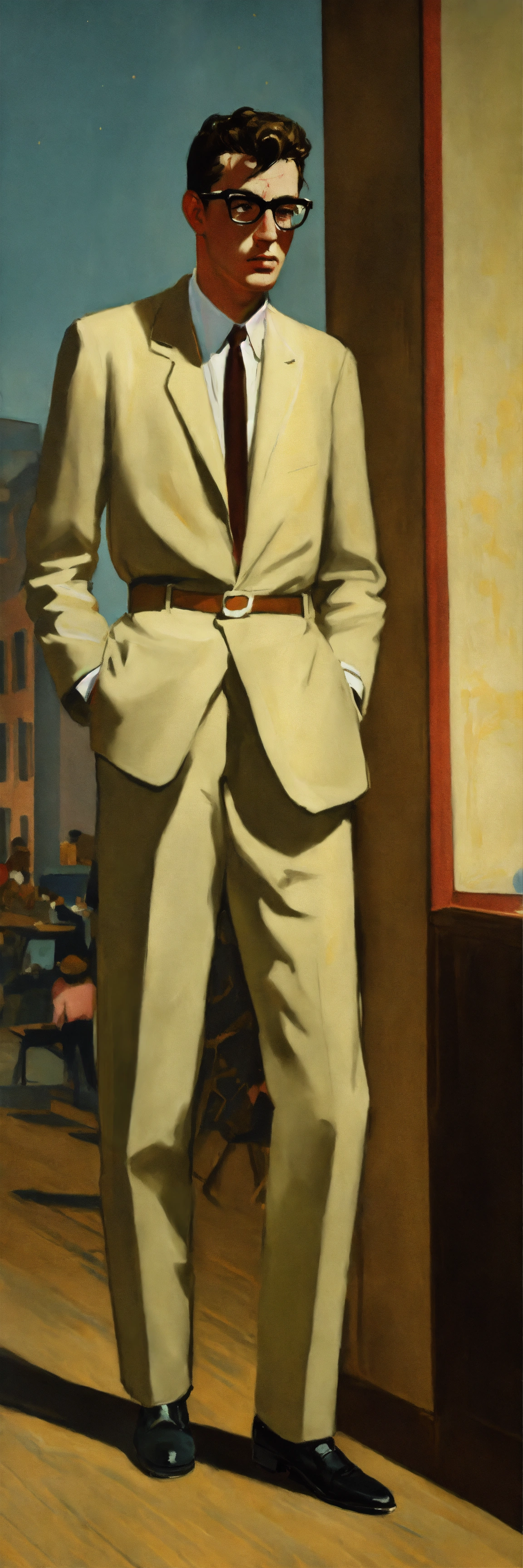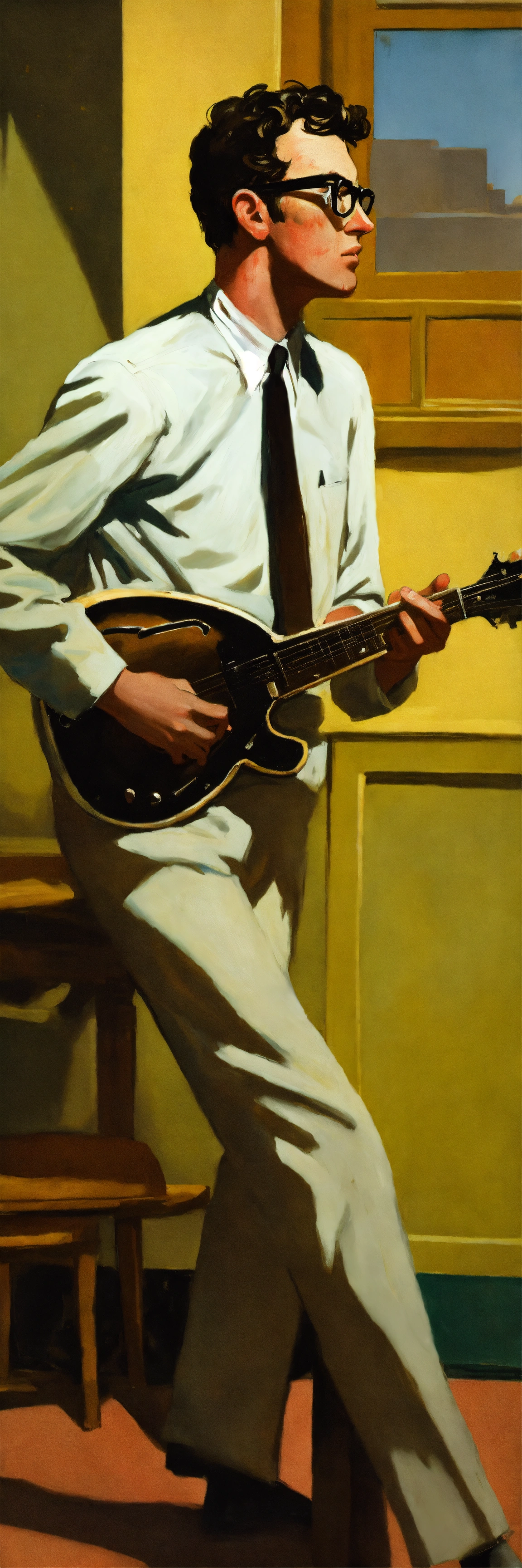 Buddy holly beaten up and bruised, by edward hopper, de chirico, flat paint, art deco style, 1 9 4 0, highly detailed, minimalist, sharp focus, 4k uhd image