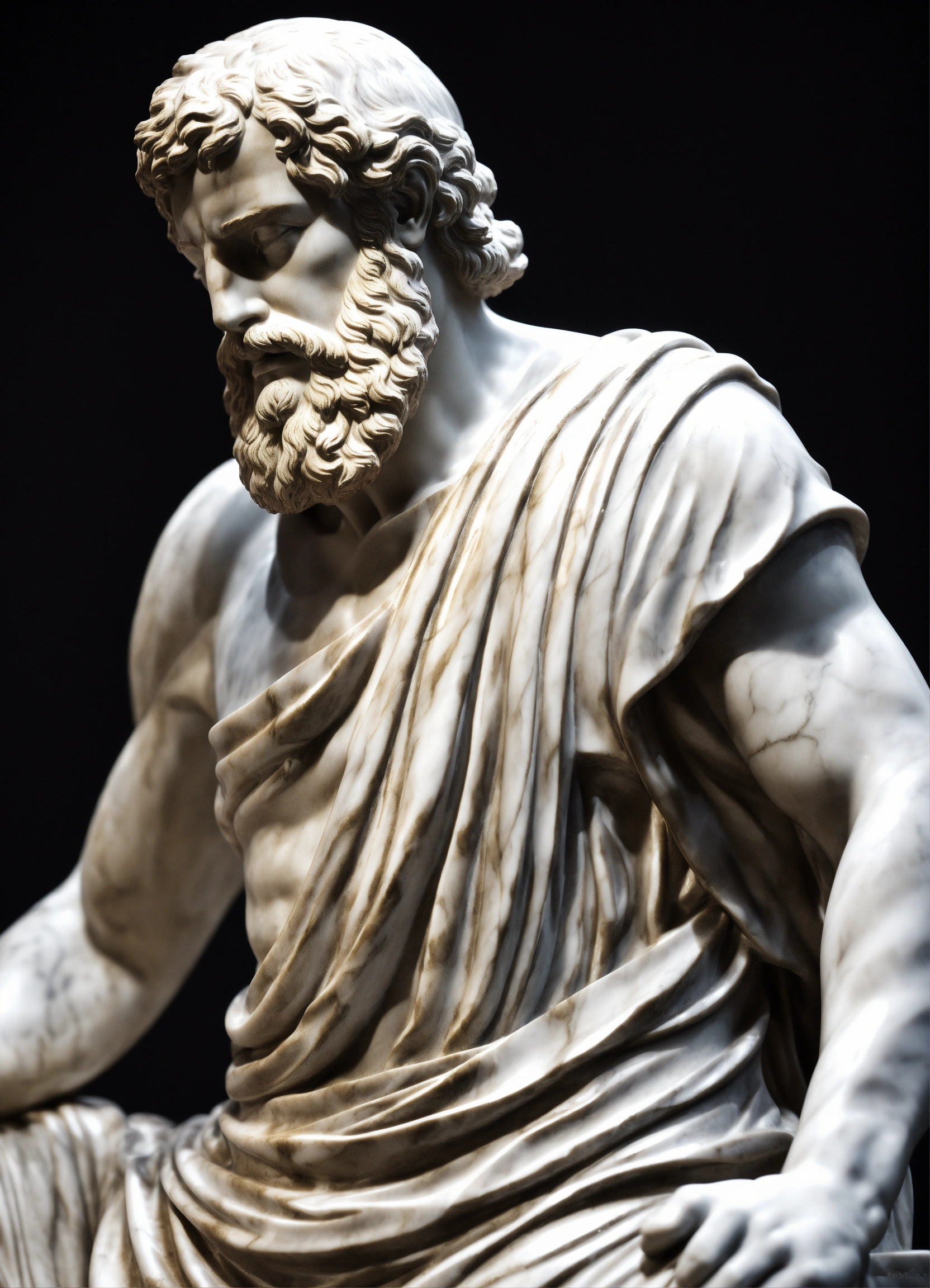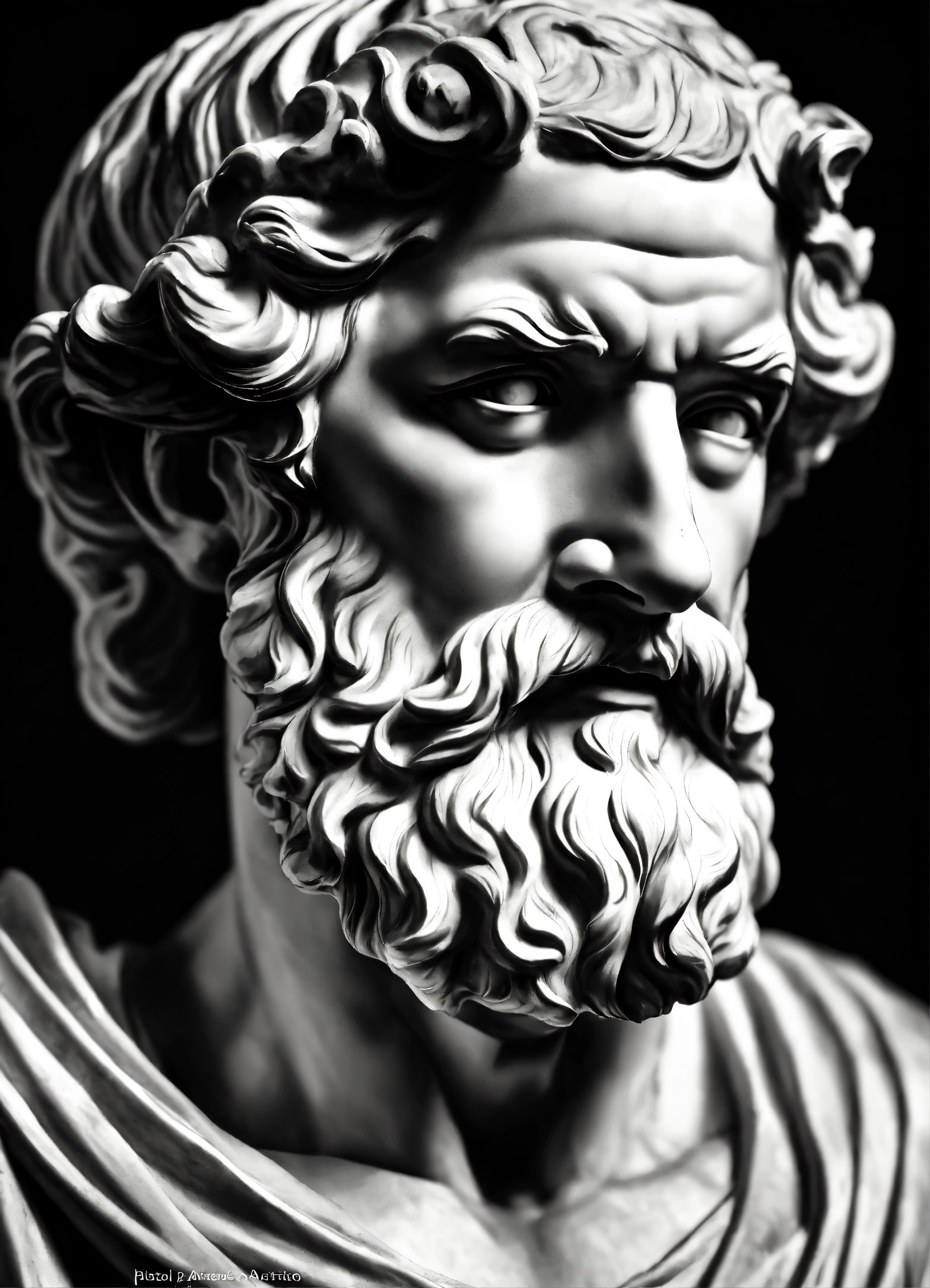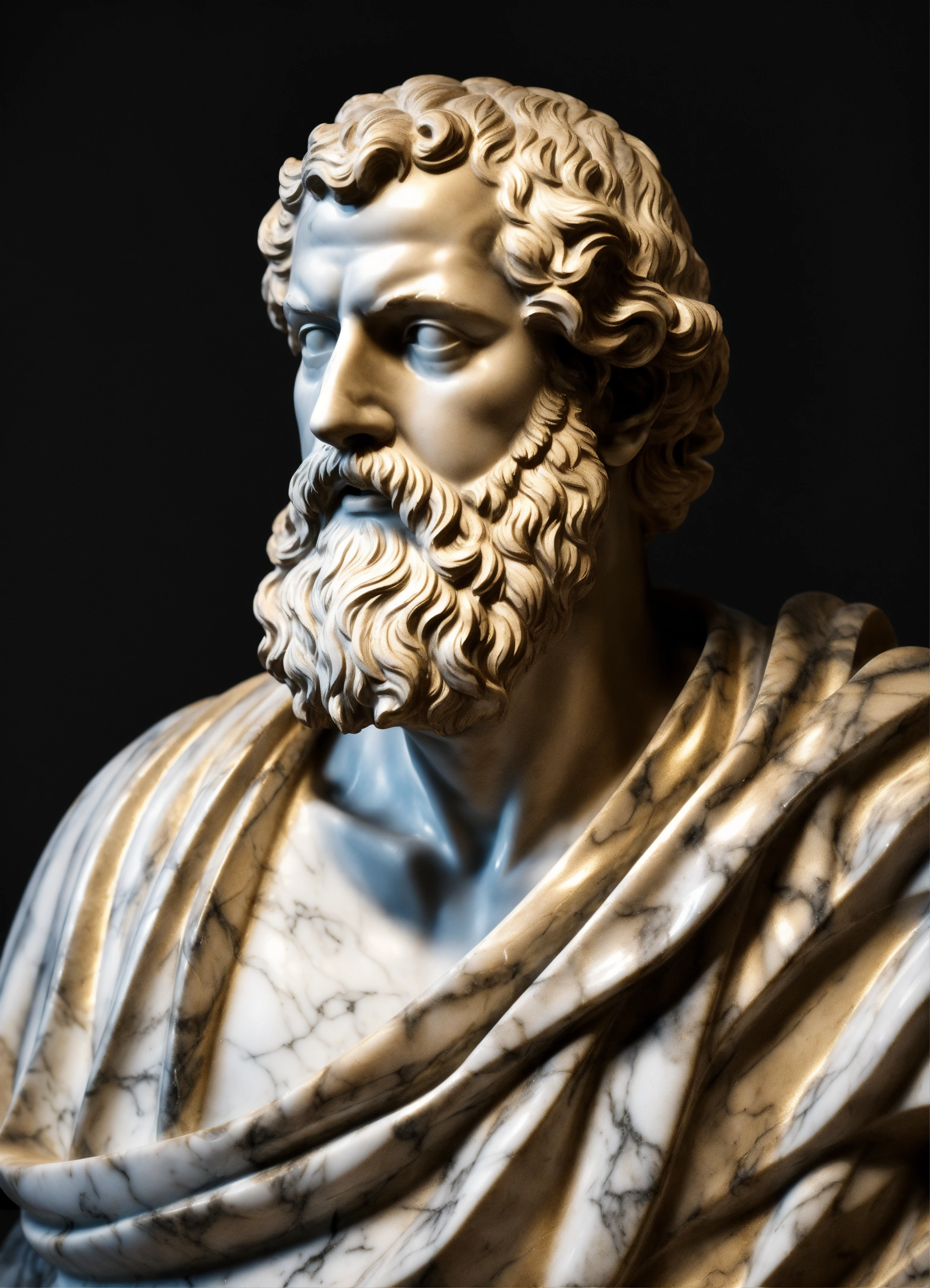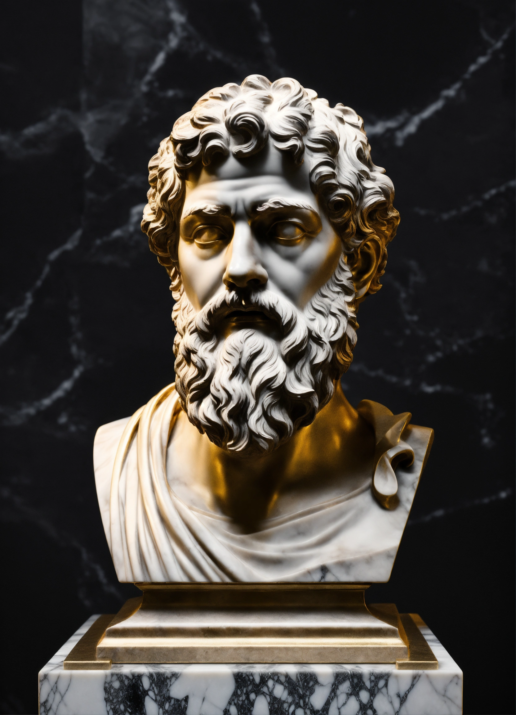 Closup roman statue of aristoteles black and white made of marble, artstation award winning, photorealistic, detailed, hyper vivid, fantasy, black background, gold datails