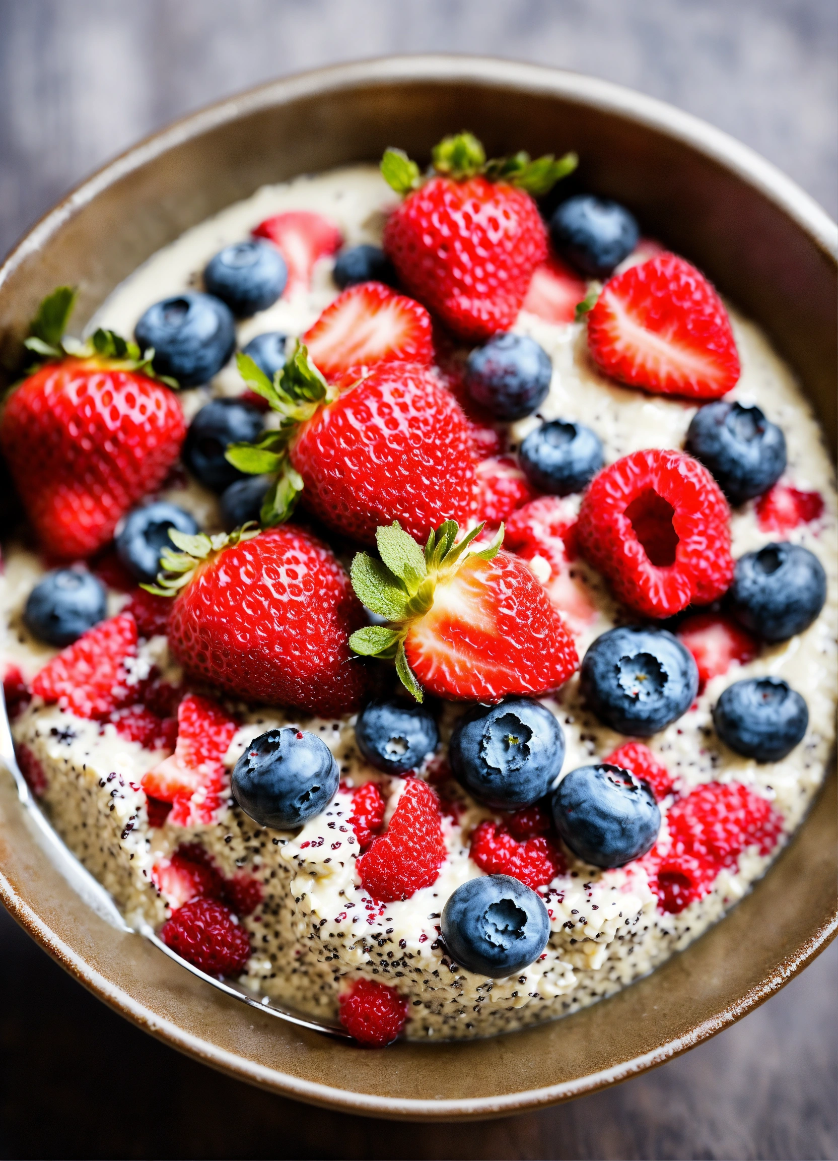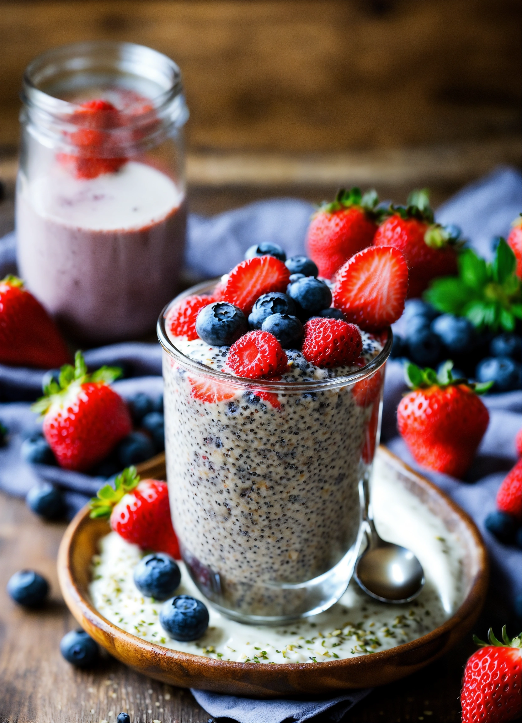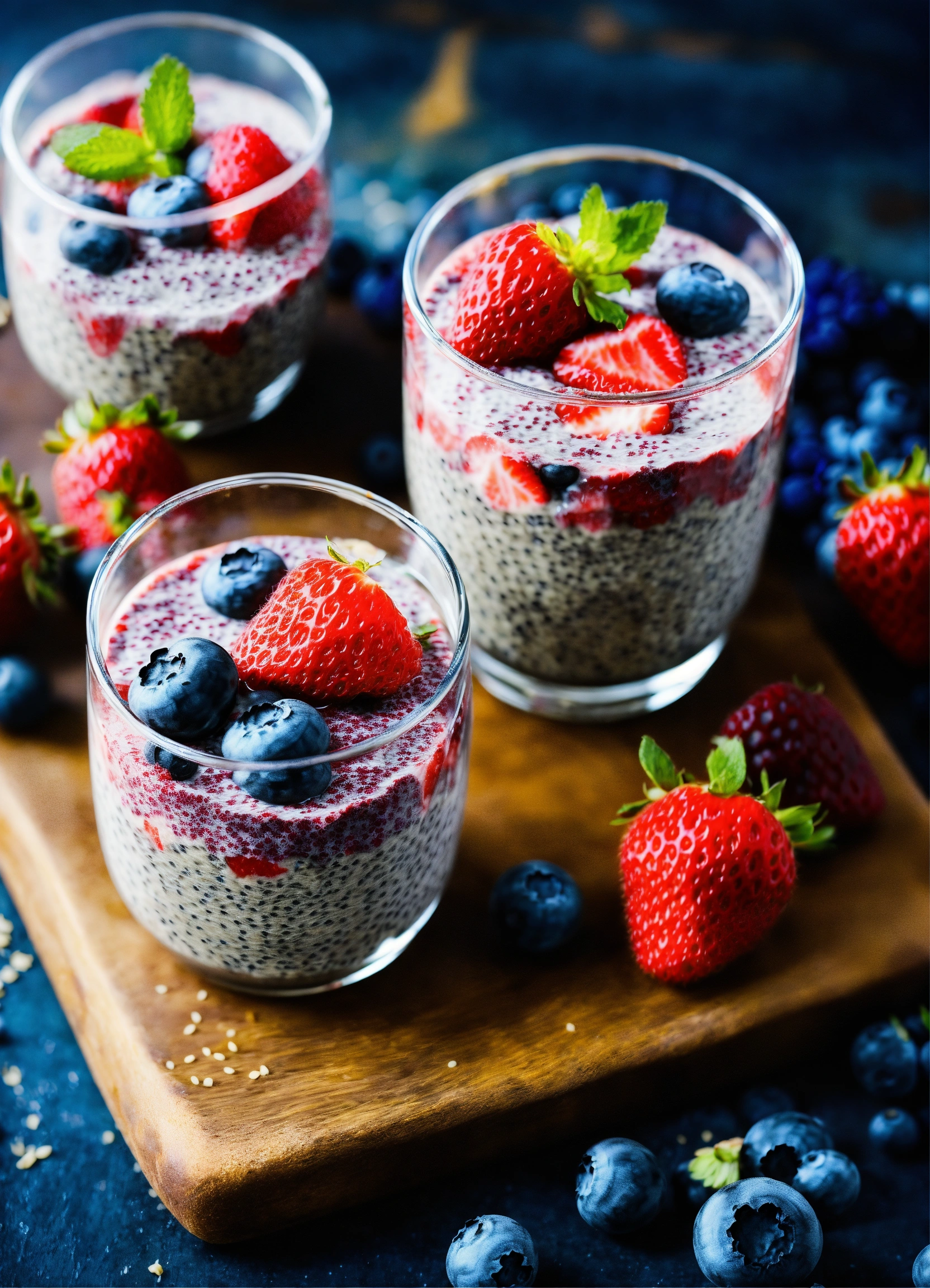 Create a realistc and perfect picture of the displayed dissert dish, berry chia seed pudding ingredients 1/2 teaspoon pure vanilla extract 1 cup unsweetened almond milk 1/4 cup chia seeds 1/2 cup mixed berries (strawberries, blueberries, raspberries) 2-3 tablespoons powdered erythritol or stevia (to taste) instructions garnish with mixed berries for a delectable keto-friendly chia seed pudding.