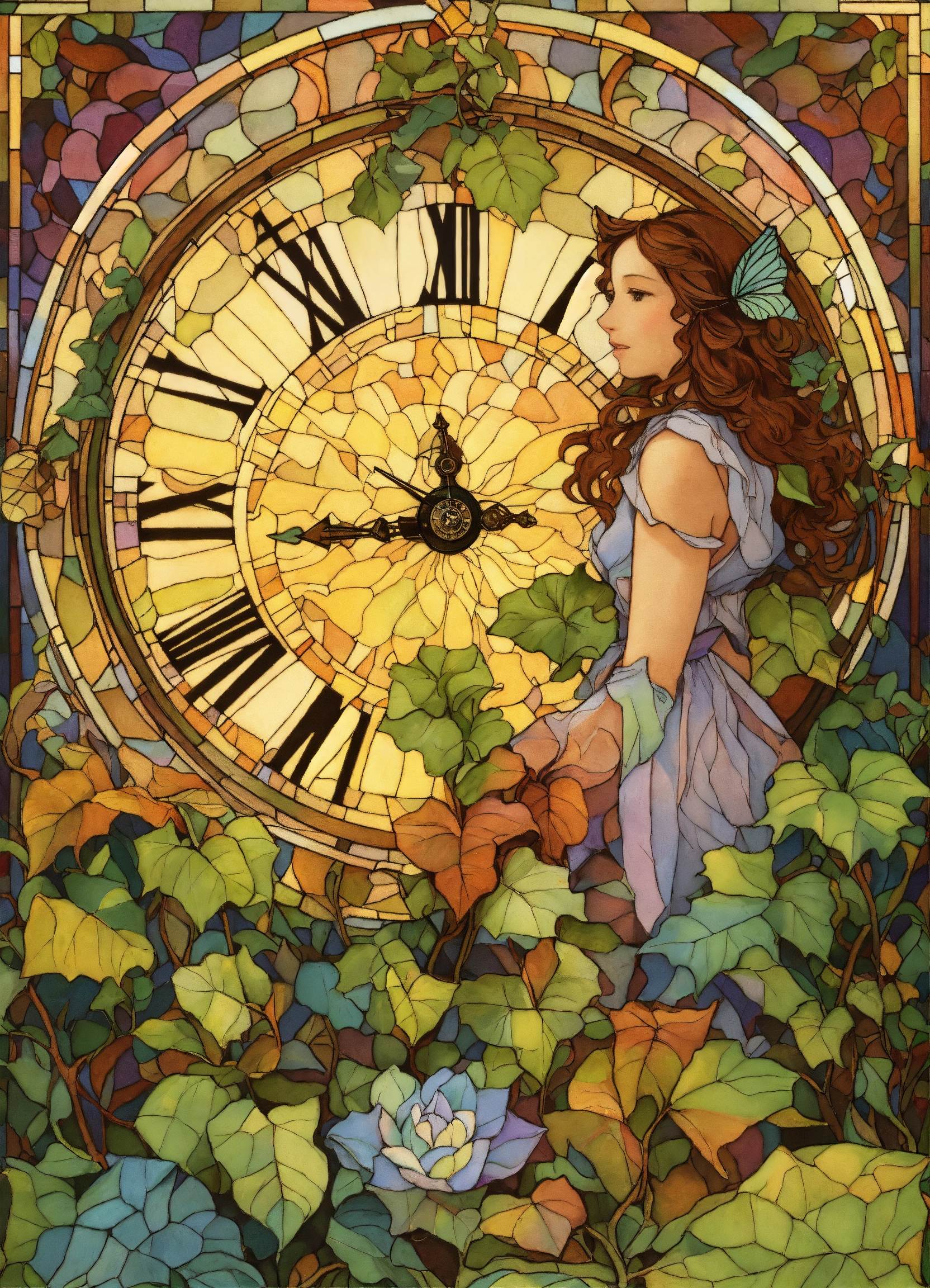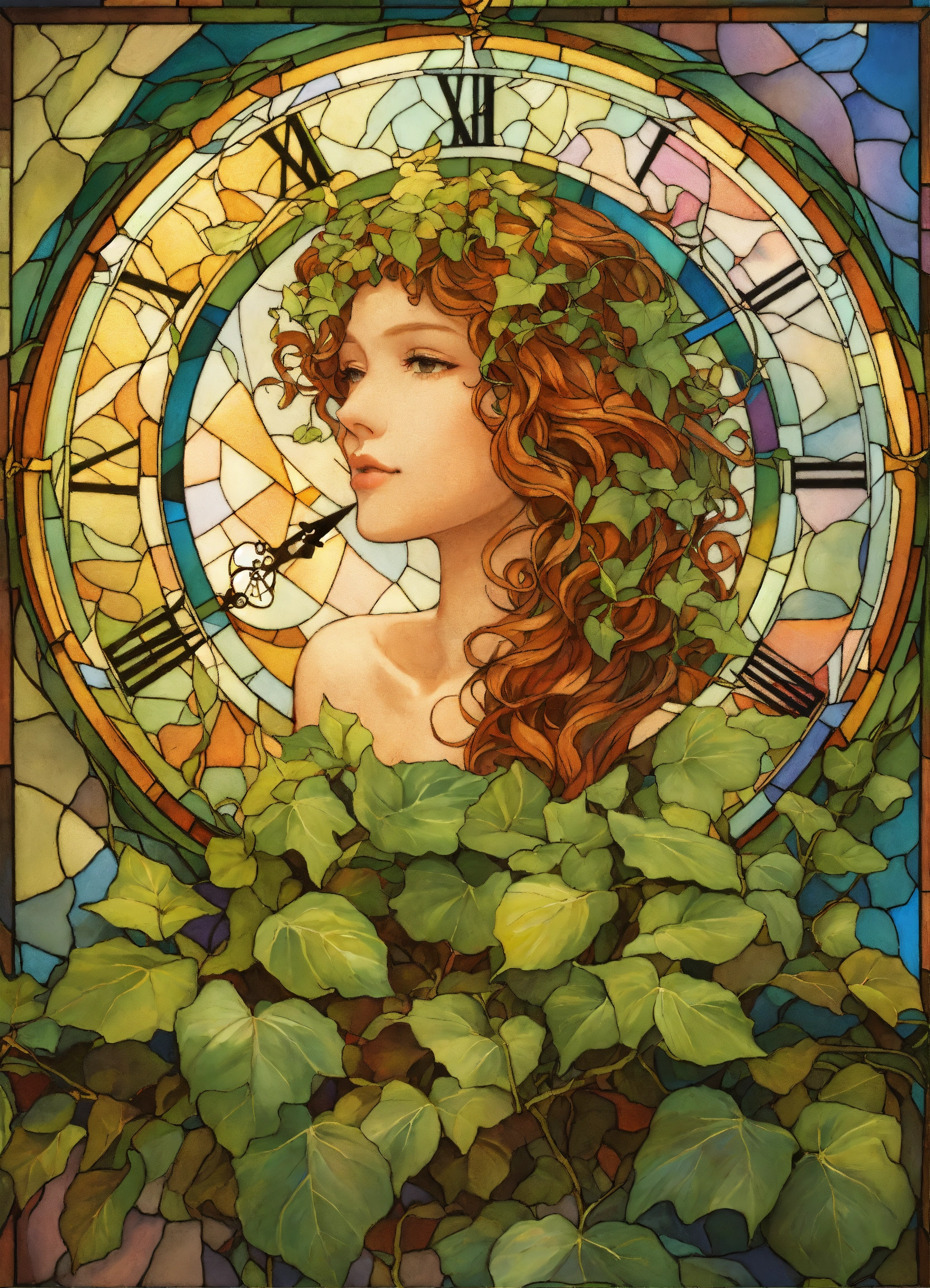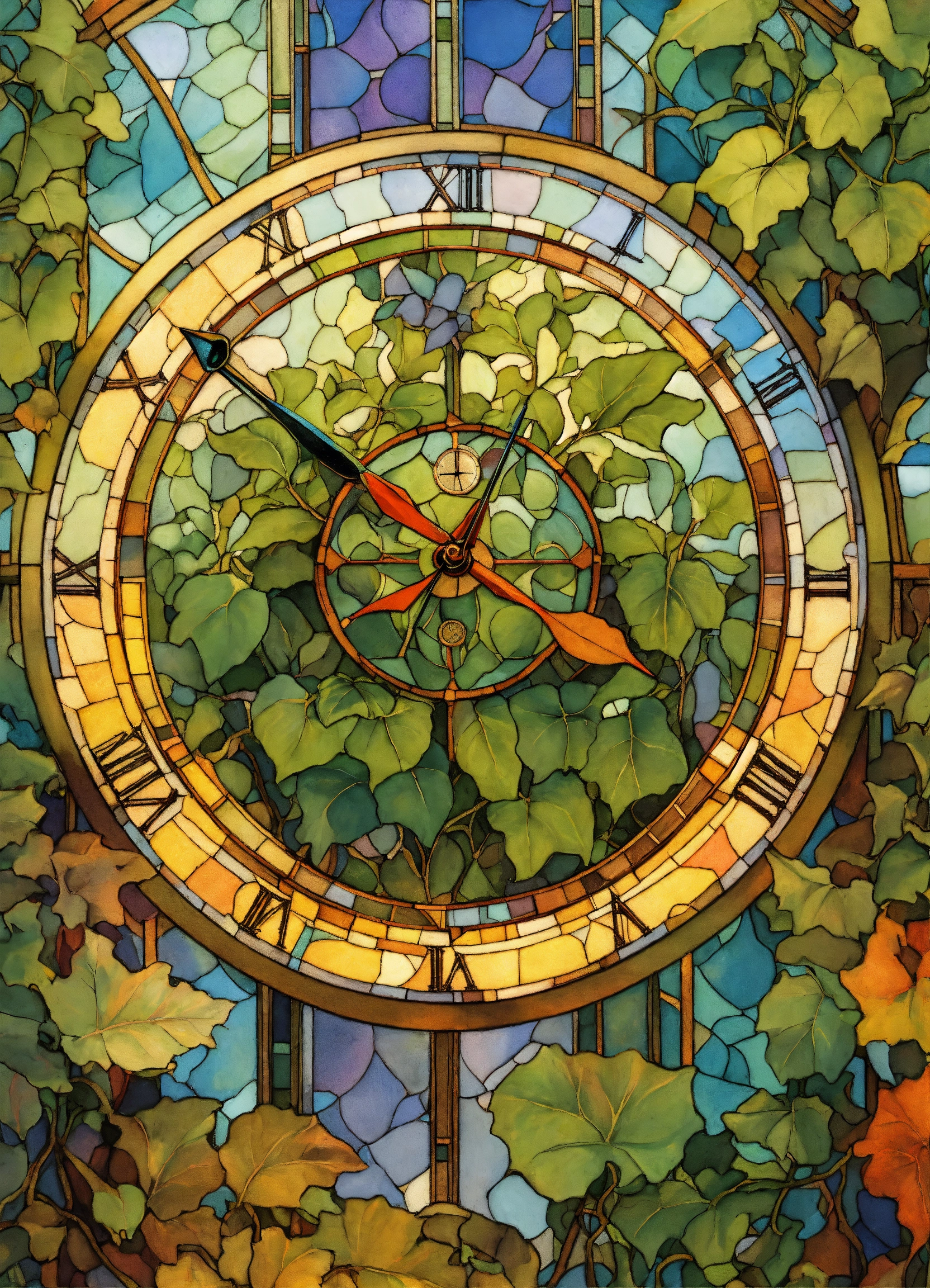 A clock in a rainbow pattern tessellation. fibonacci sequence. geometric. tessellation in ivy. rainbow illuminates with light. above ivy. rainbow swirls, stained glass, rebecca guay, rembrandt, picture book.