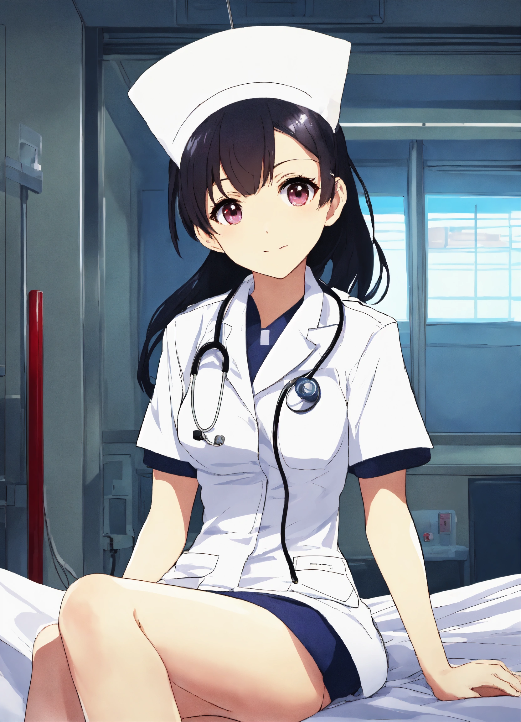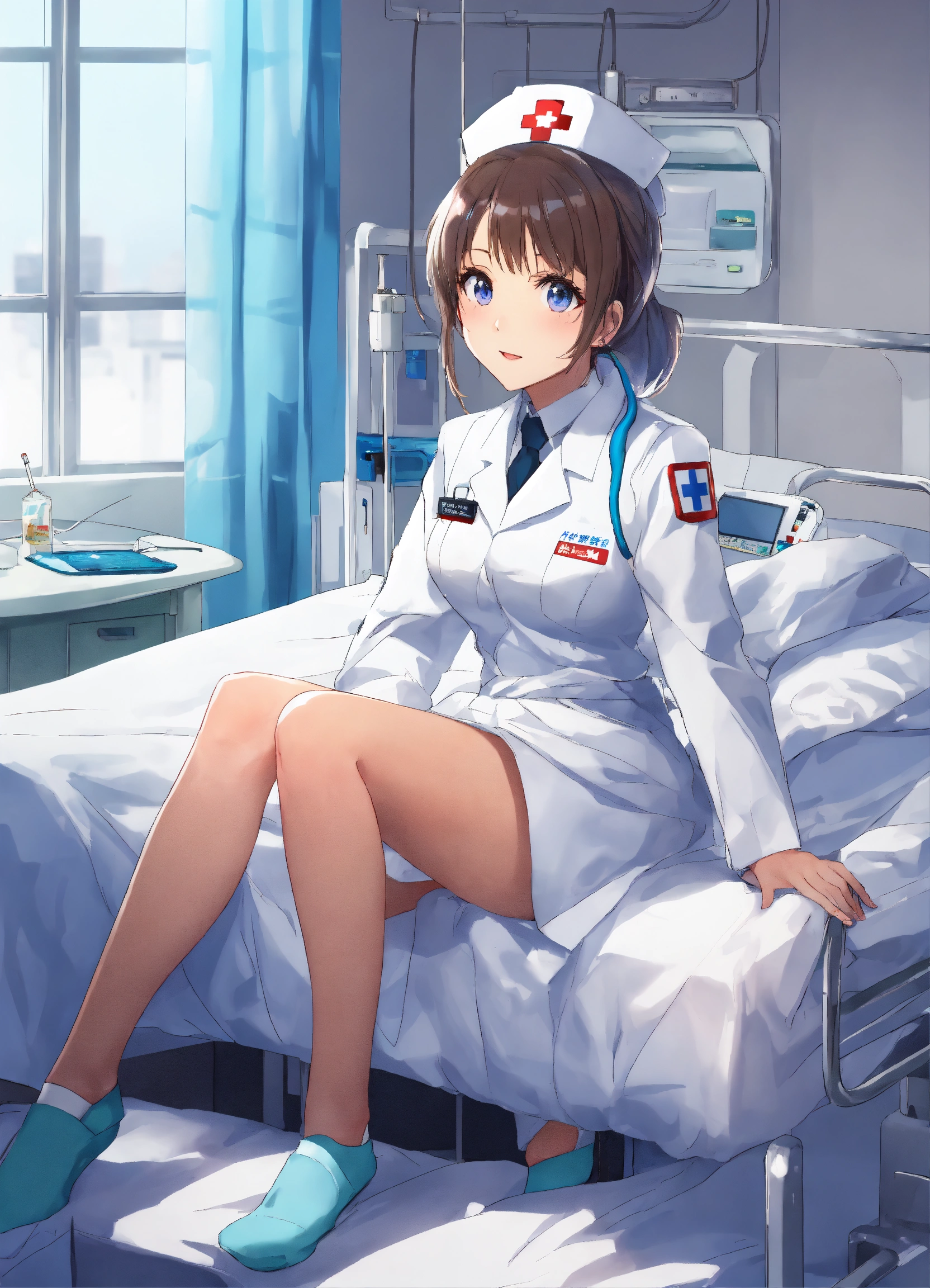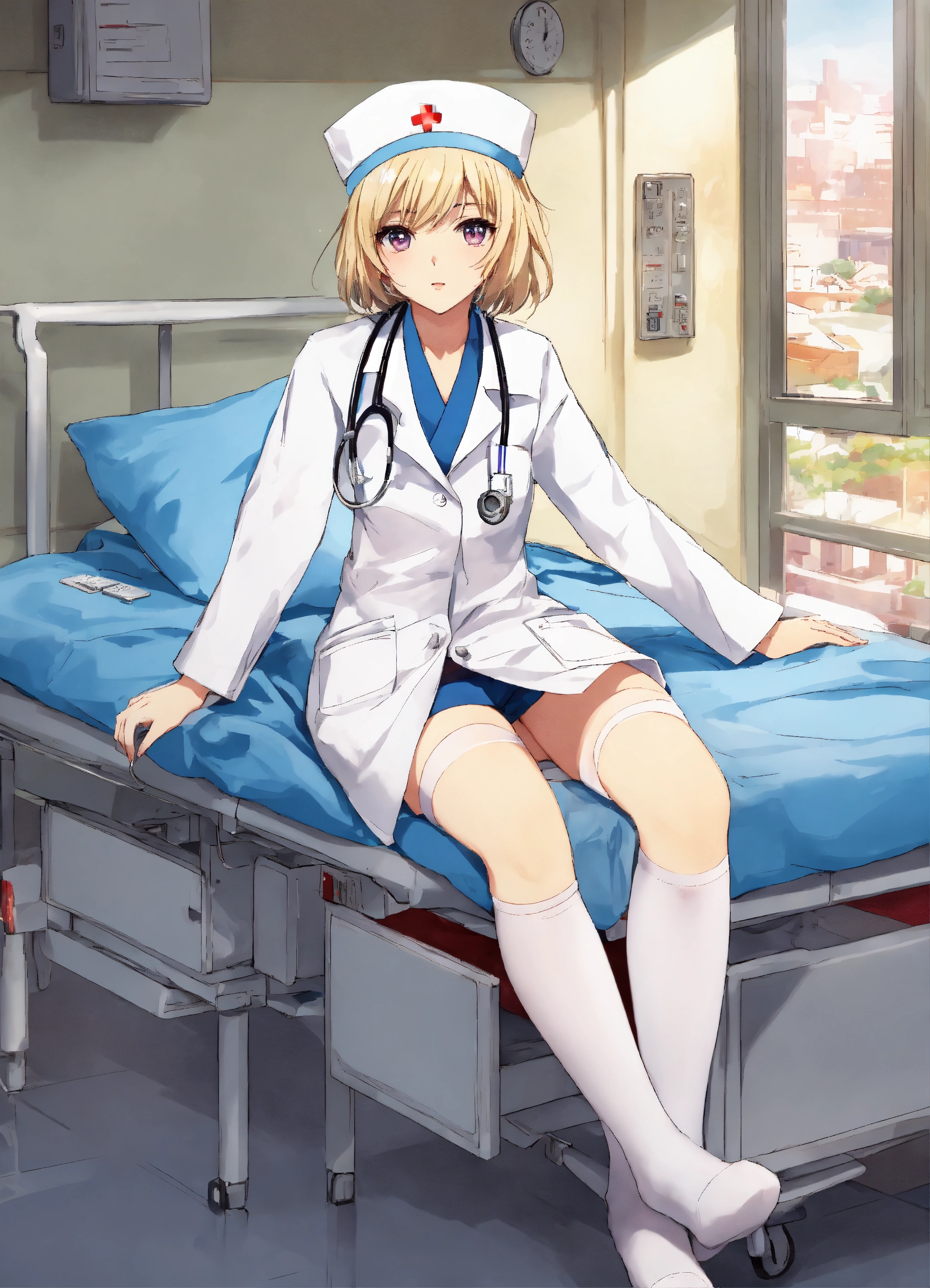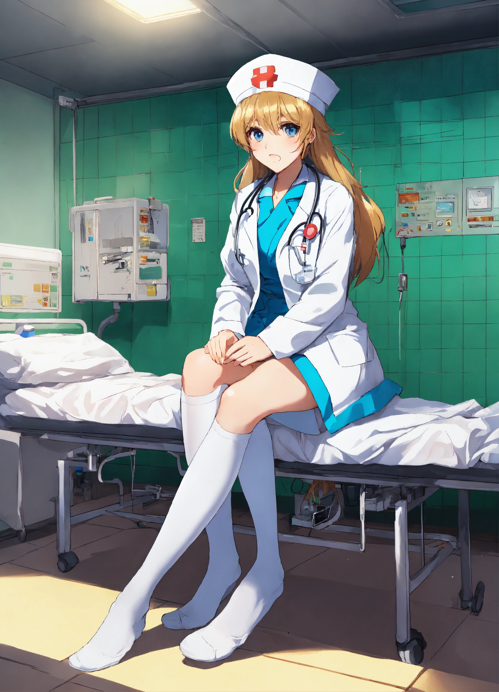 1 nurse in a white cap in a white coat, anime face, white high stockings on her feet, sitting on a hospital bed
