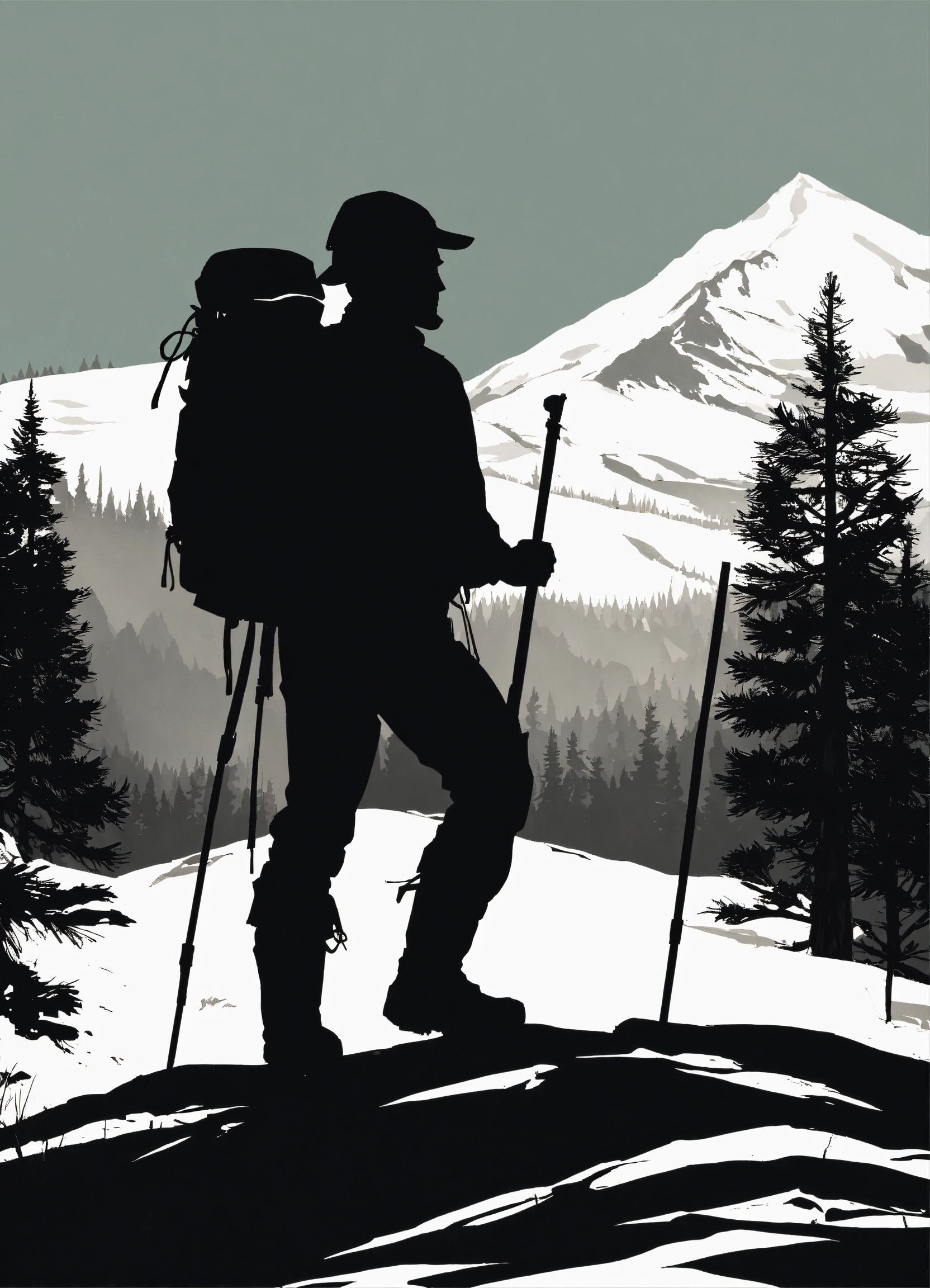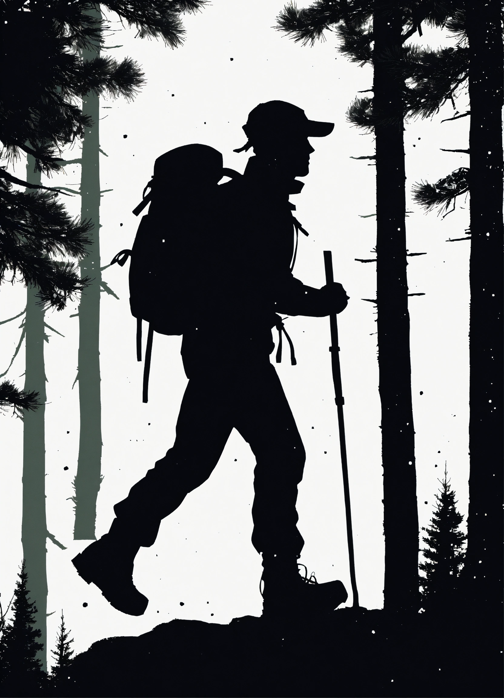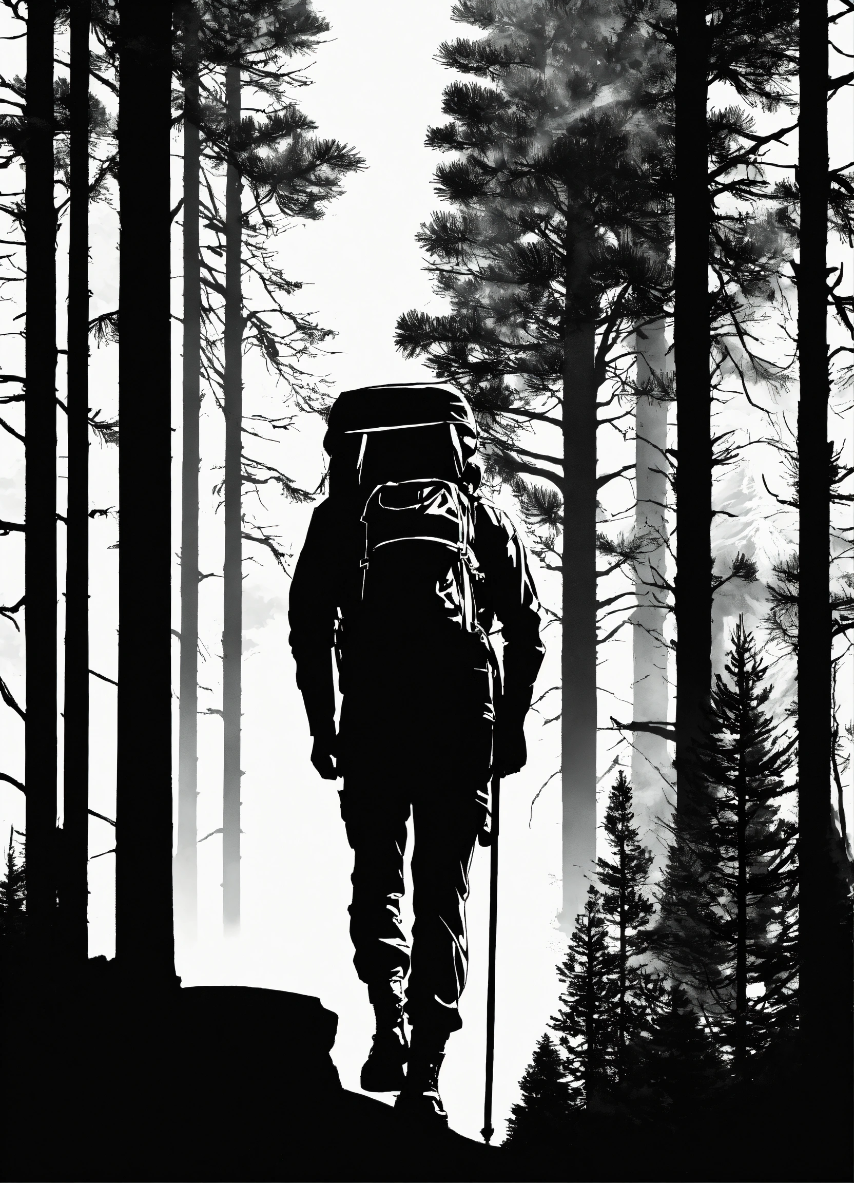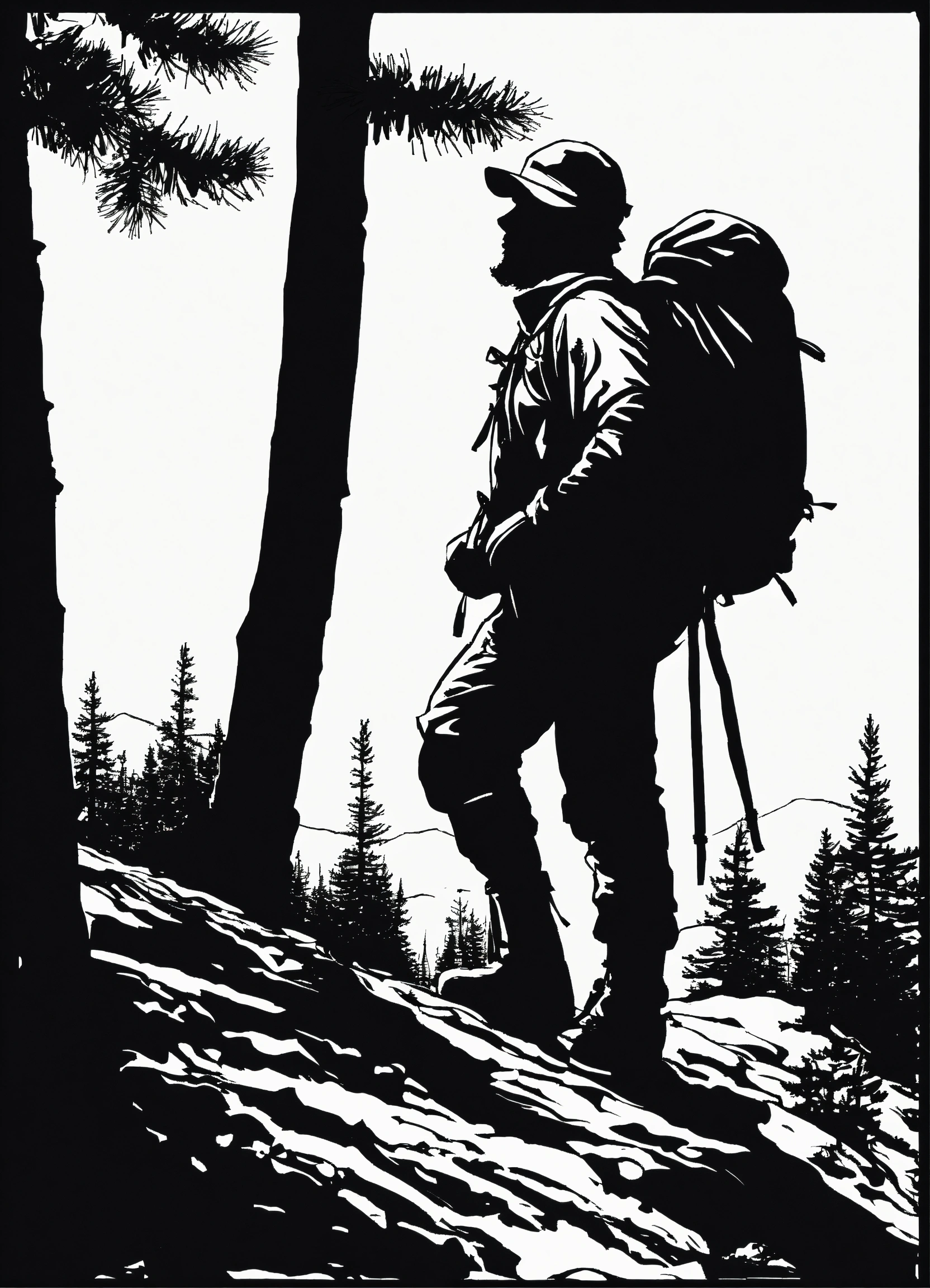 Black ink, mountain hiker with pine trees silhouette clip art, white clean background m miincdesign black ink prompt details black ink, mountain hiker with pine trees silhouette clip art, white clean background