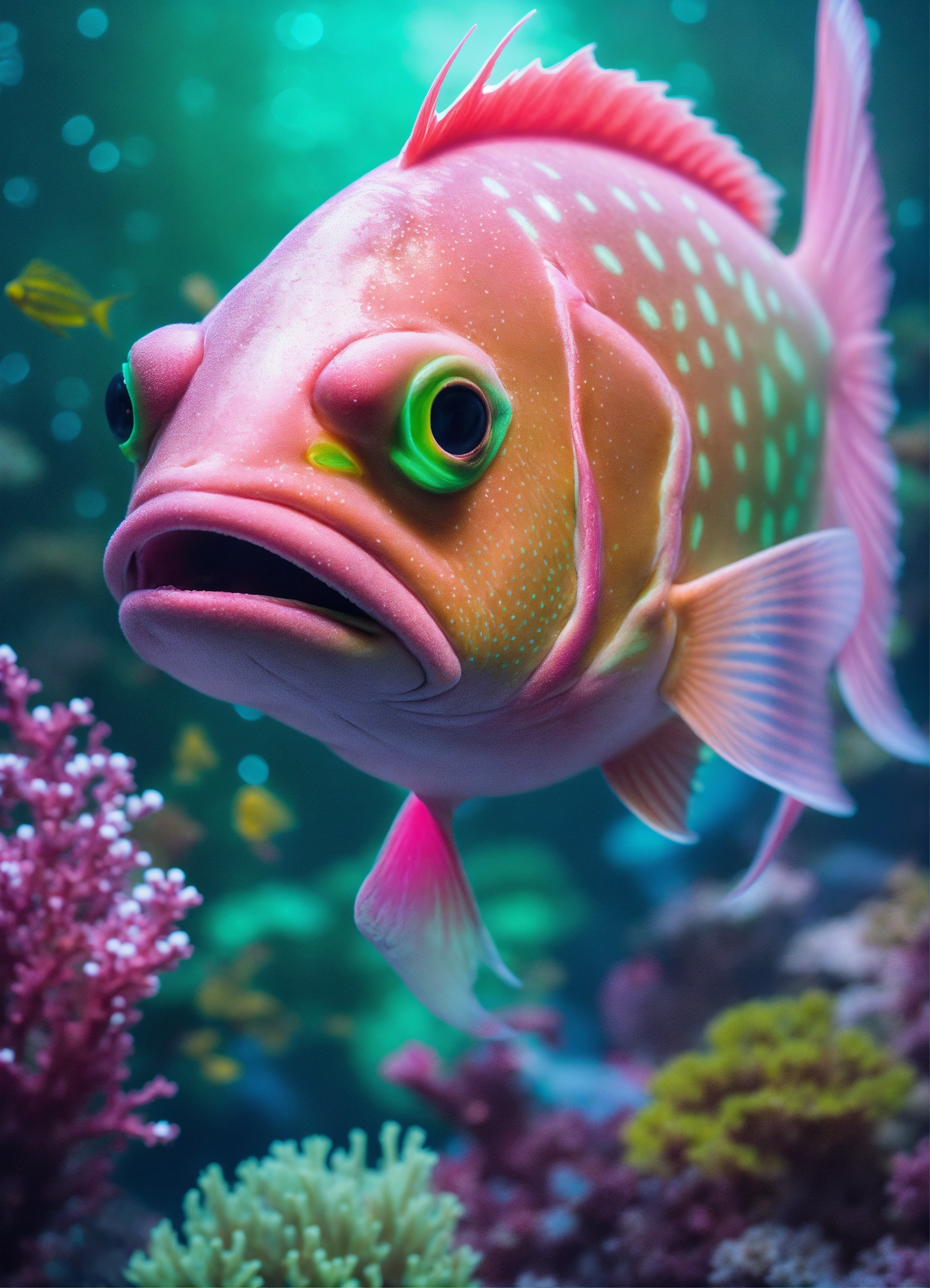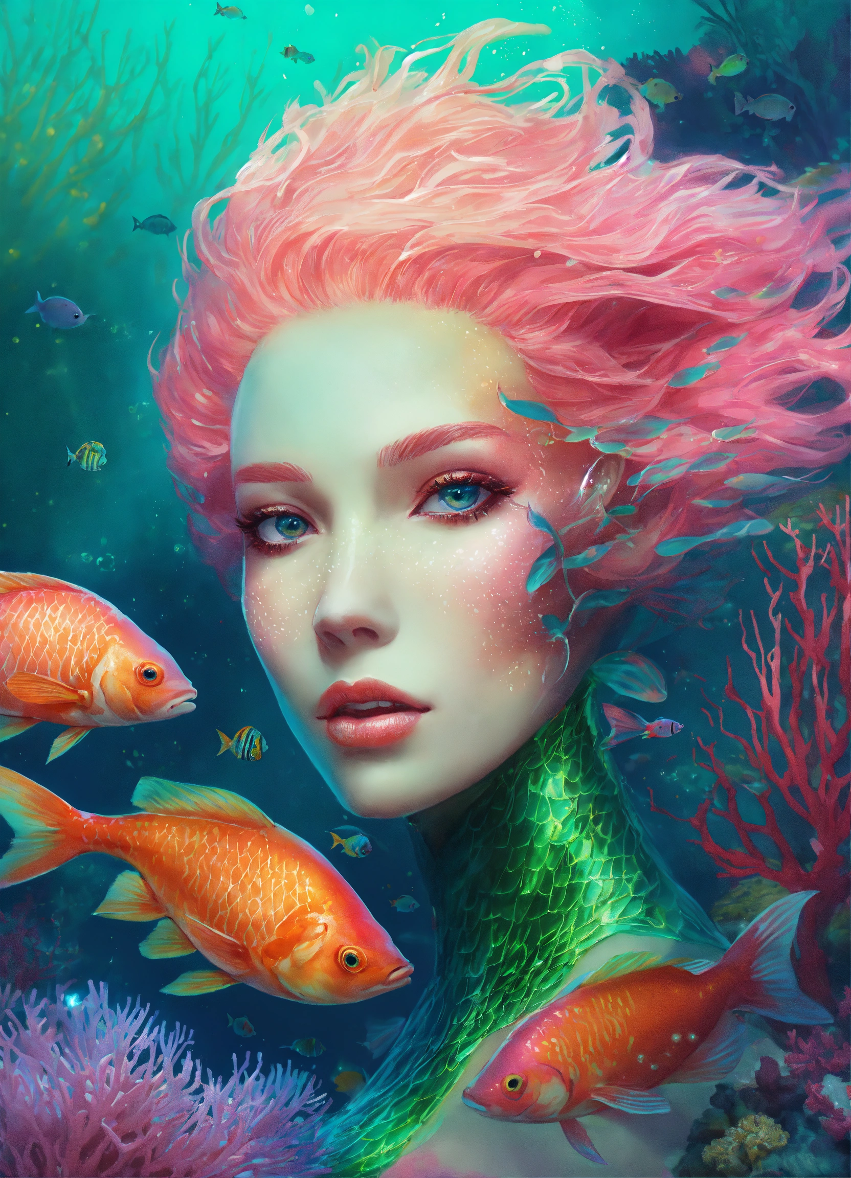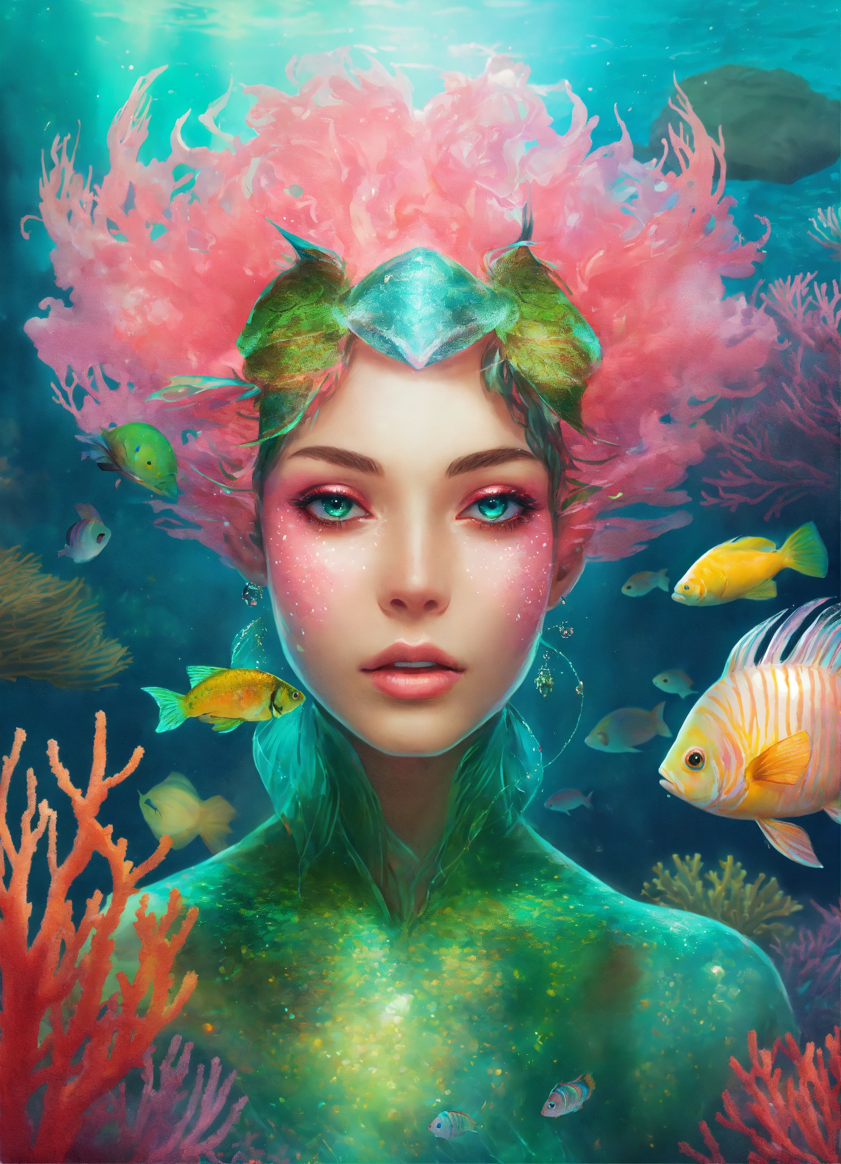 Fantasy portrait of an anthropomorphic fish, humanoid face, shimmery skin, bioluminescent fins, pink and green magic, coral reef background