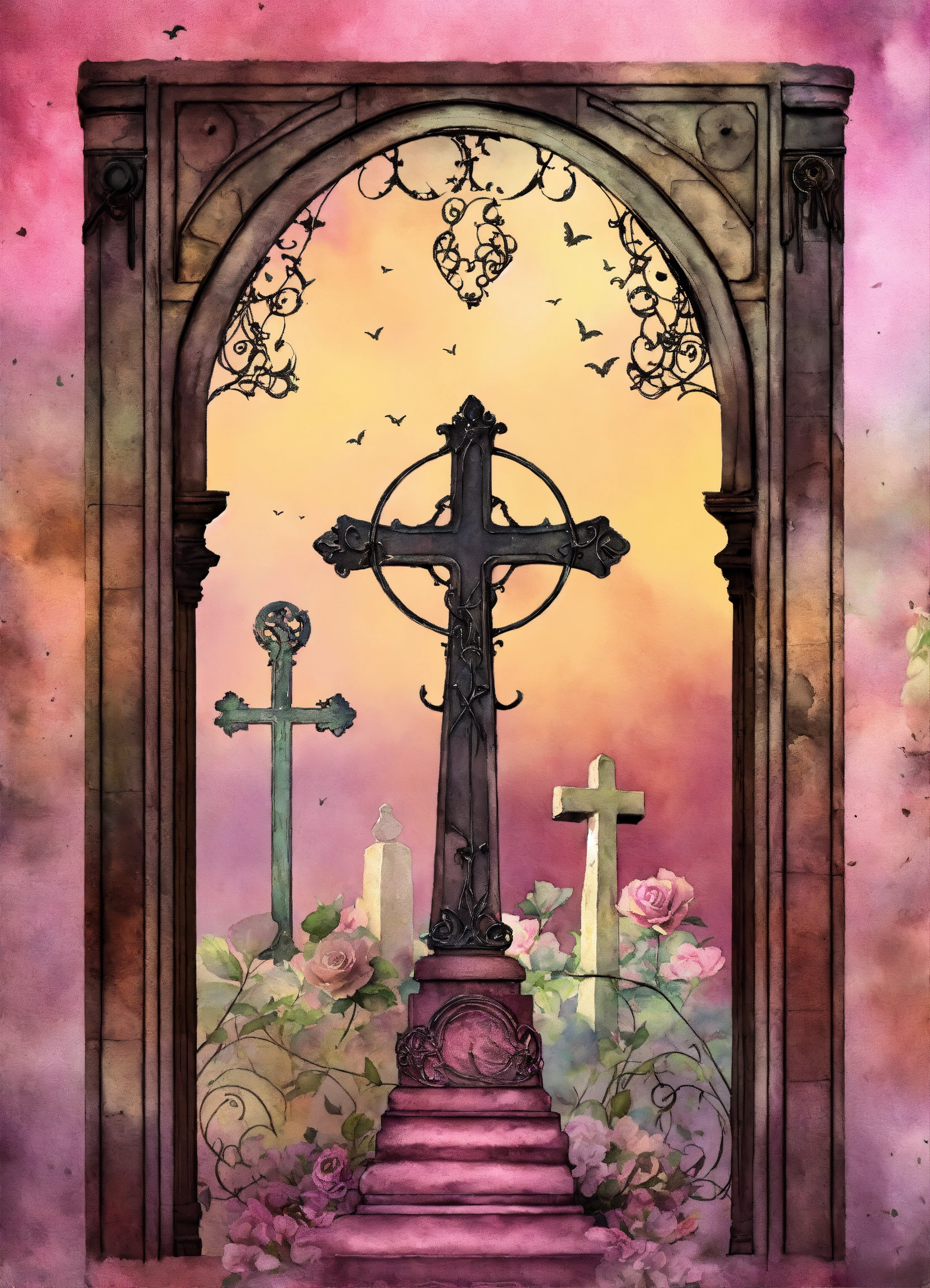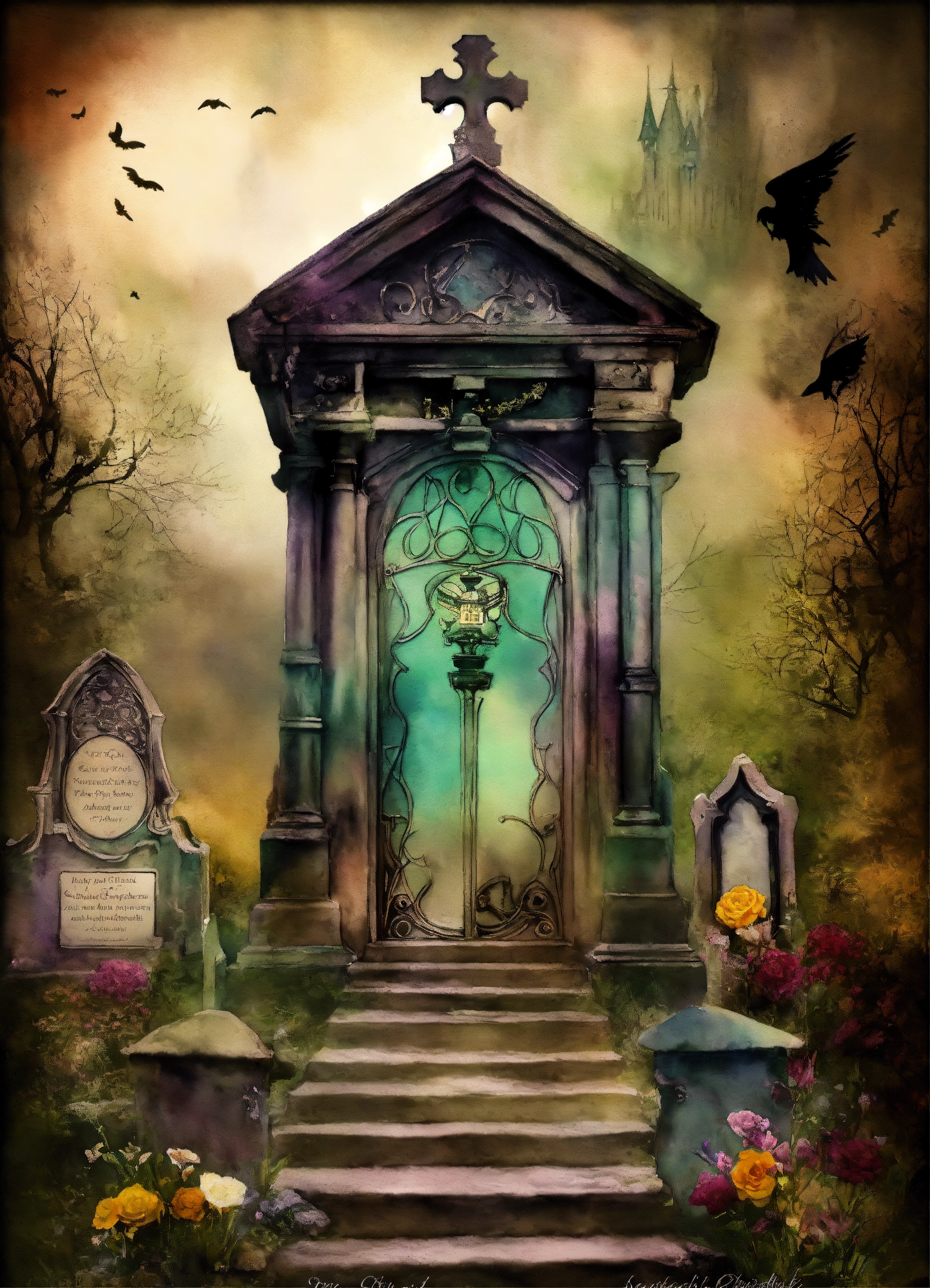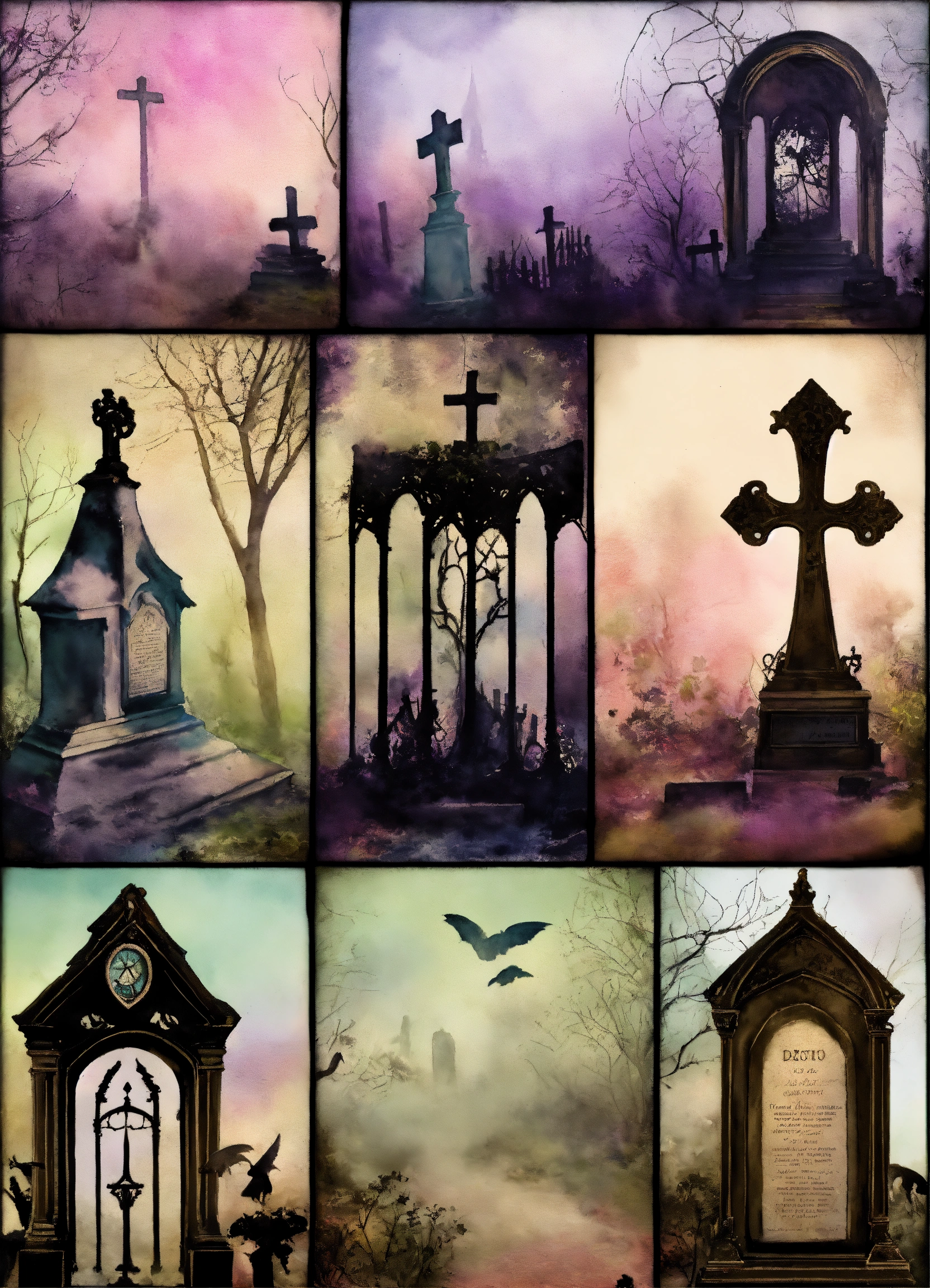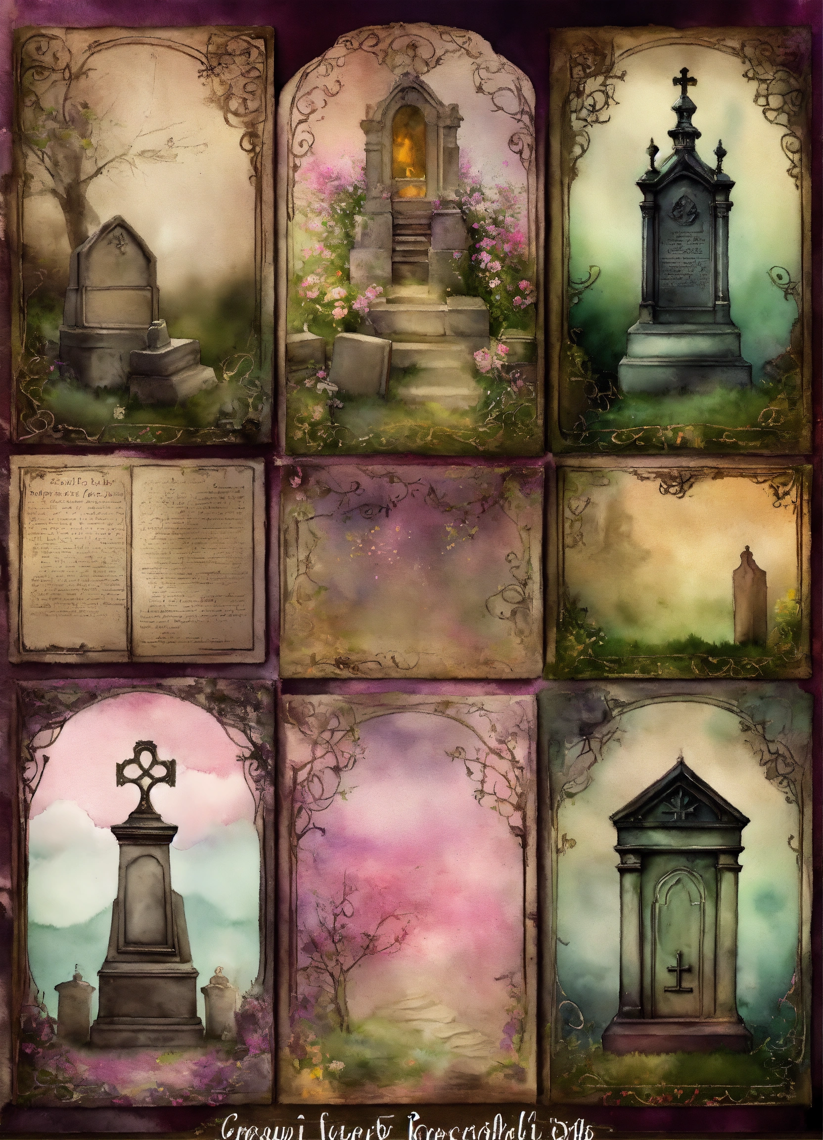Shabby chic dreamy mist pastel junk journals create detailed watercolor illustrations of goth steampunk cemetery graveyards and tombstones hold a particular fascination for many goths., each as separate png images suitable for cutting out and using in various paper crafts such as card making, scrapbooking, junk journaling, and more. the digital clipart should capture the essence of gothic fantasy and steampunk aesthetics, offering a versatile resource for creative projects. each cemetery graveyards and tombstones hold a particular fascination for many goths. should be uniquely designed and easily adaptable to a range of crafting styles. swirling magical fairytale abstract art style