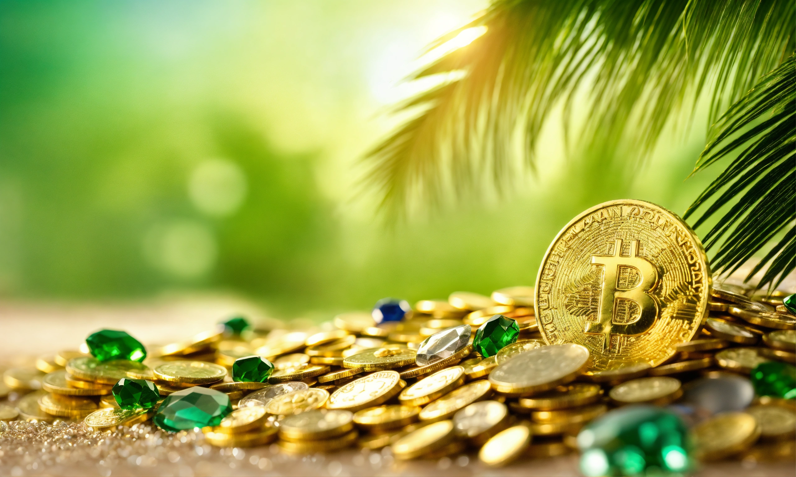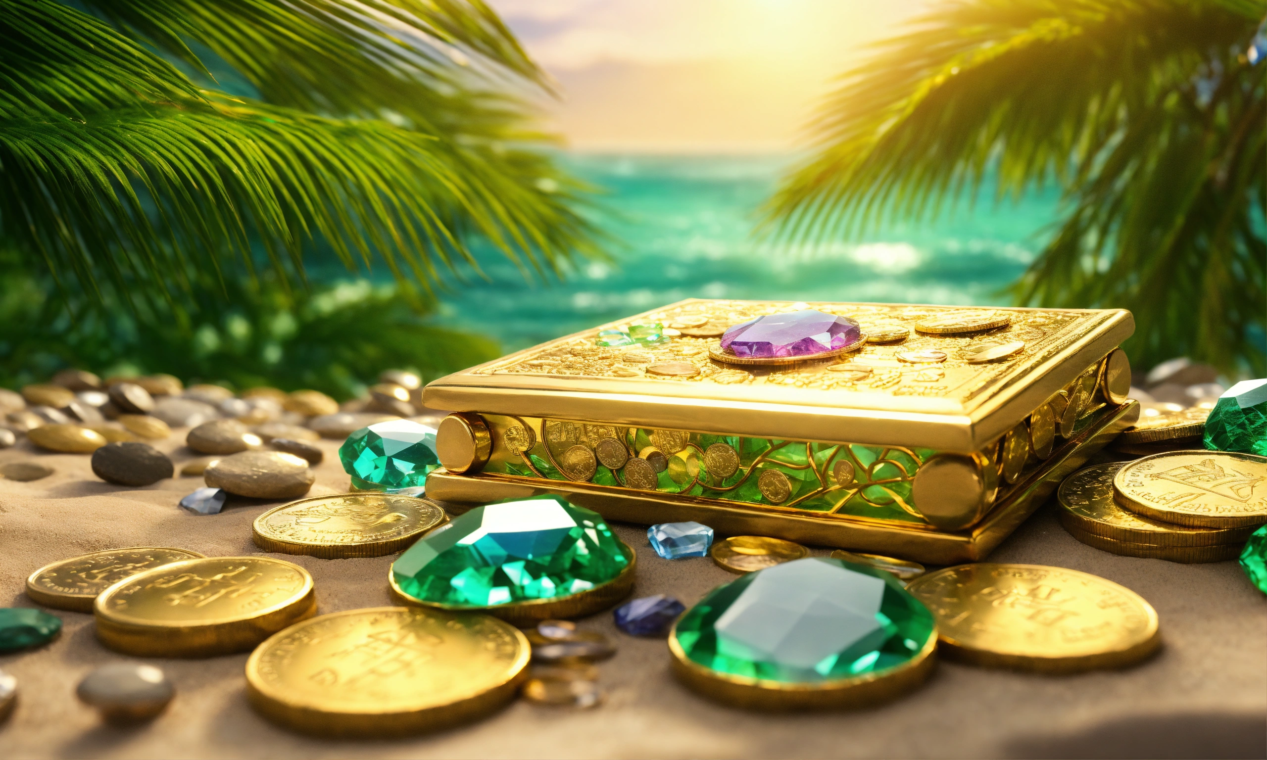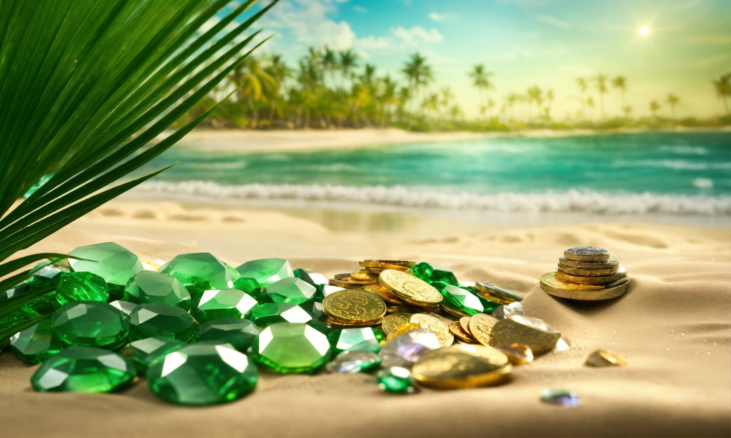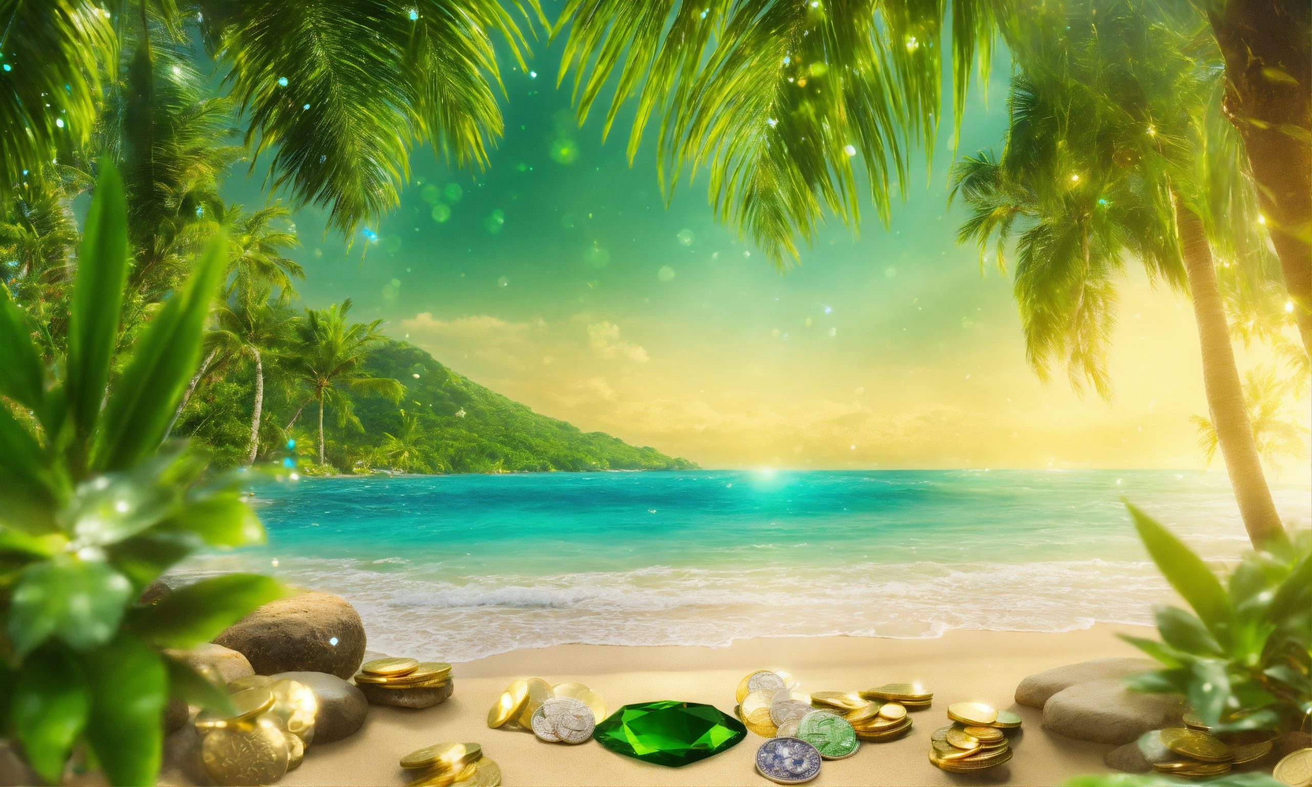 Tropic beach, waves, green palms with crystals, background, gemstones, gold, coins, jews, 4k, full hd, realistic