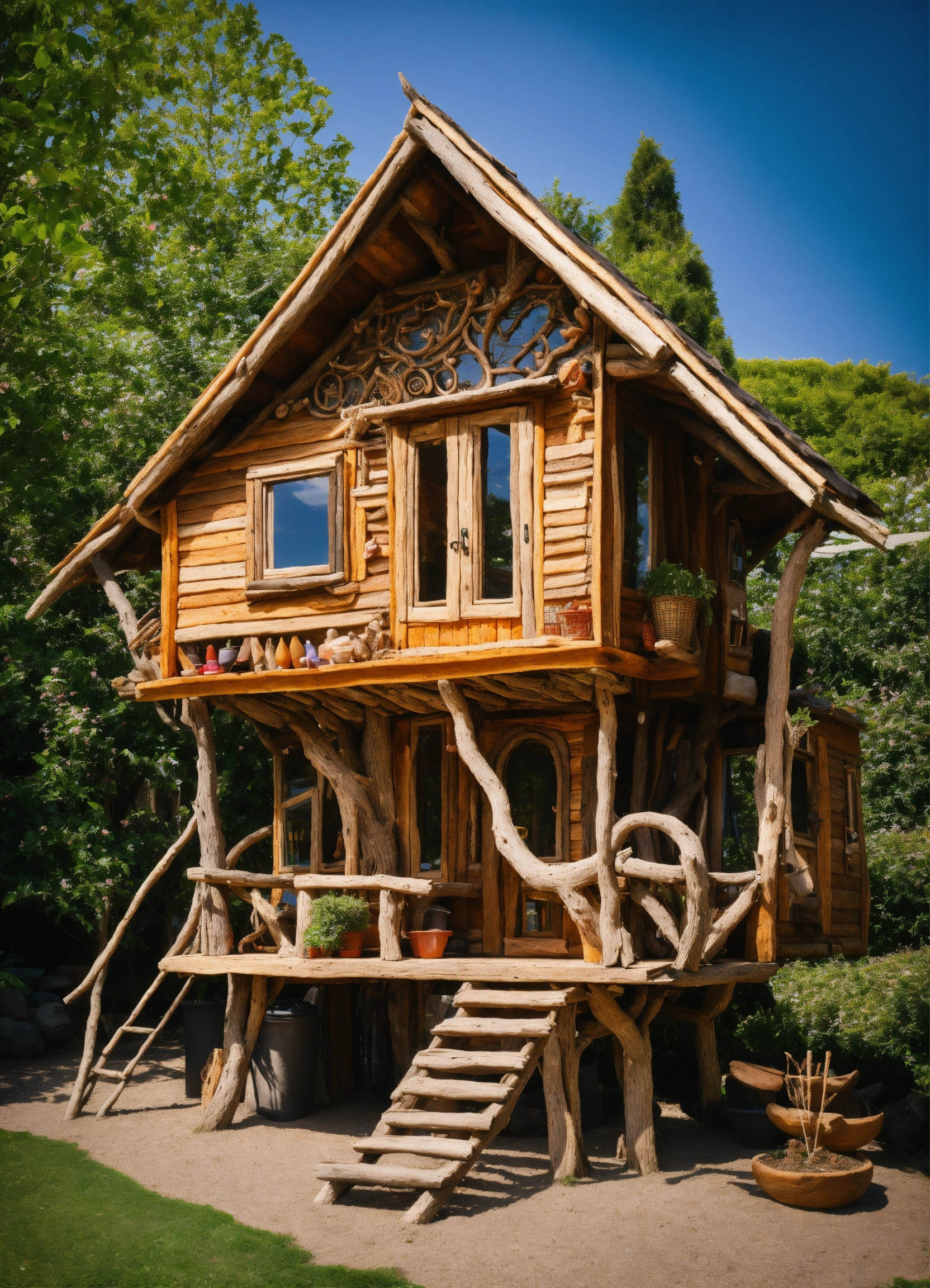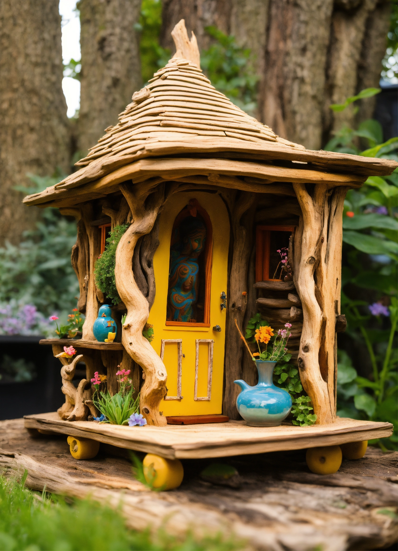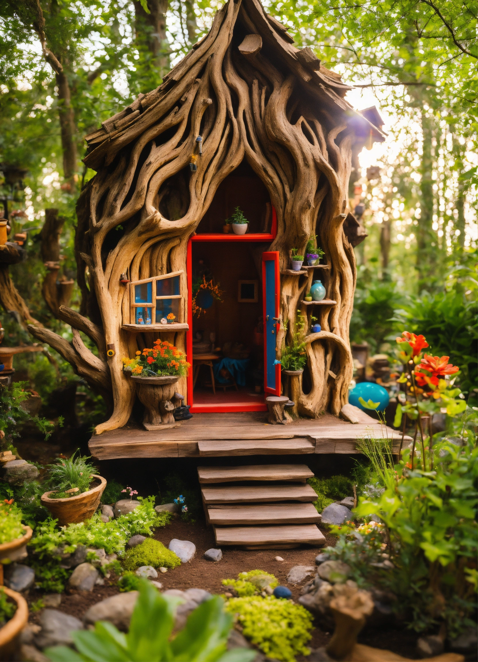 An ancient driftwood hand made meditative garden sculptured tiny house in the style of alex grey, lsd, dmt, air bnb