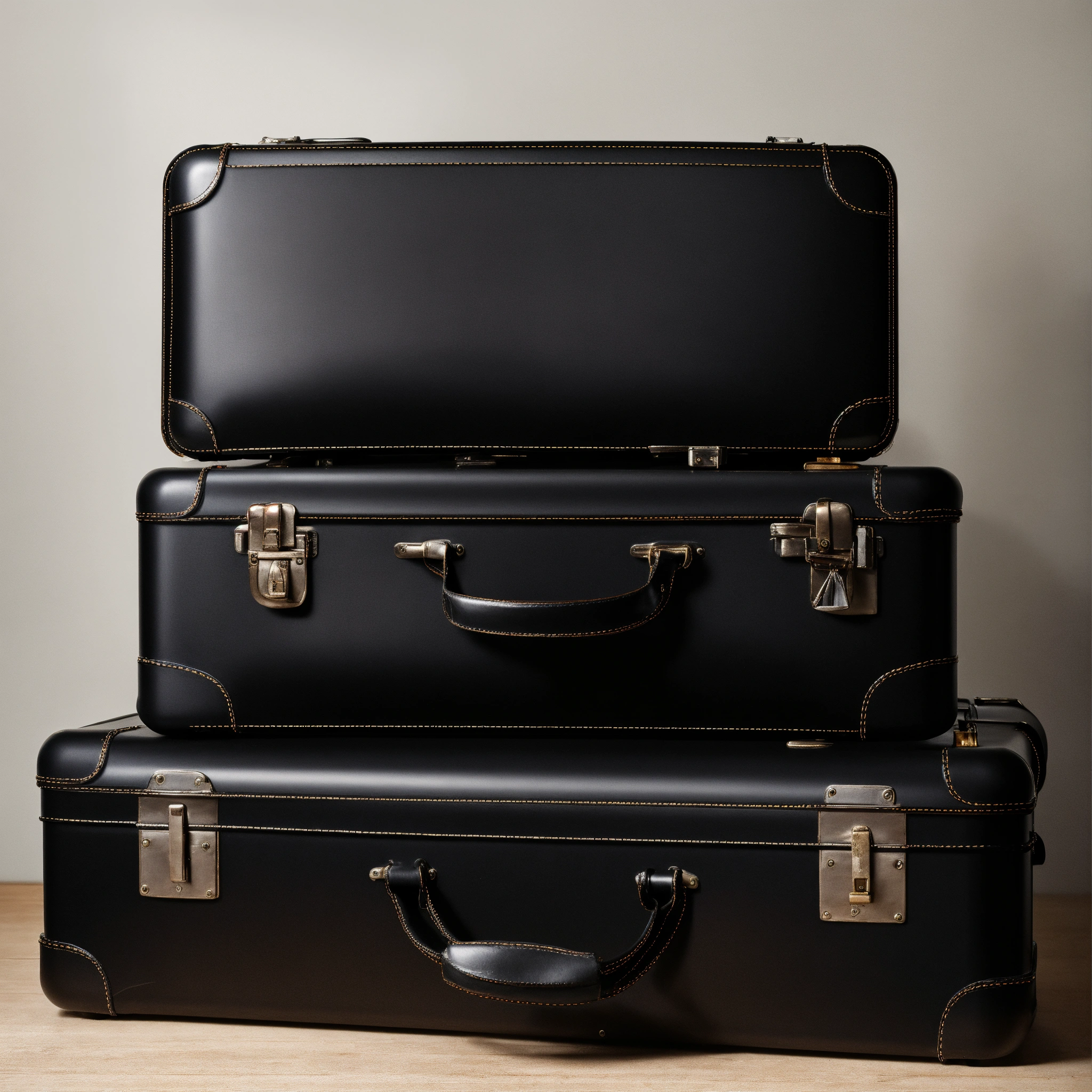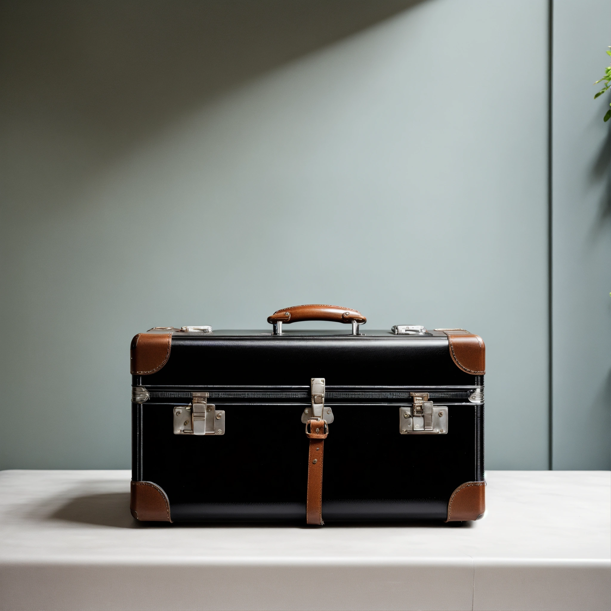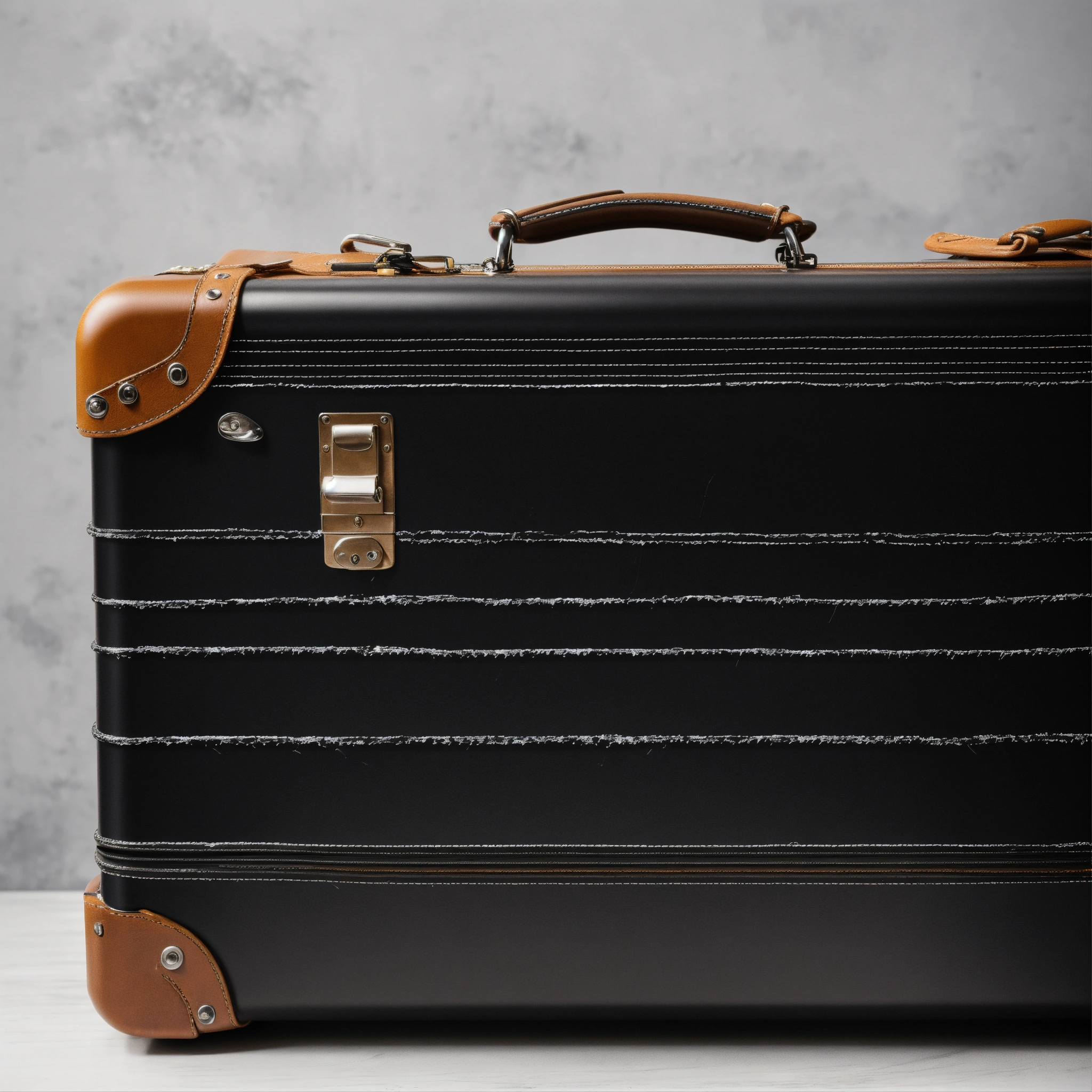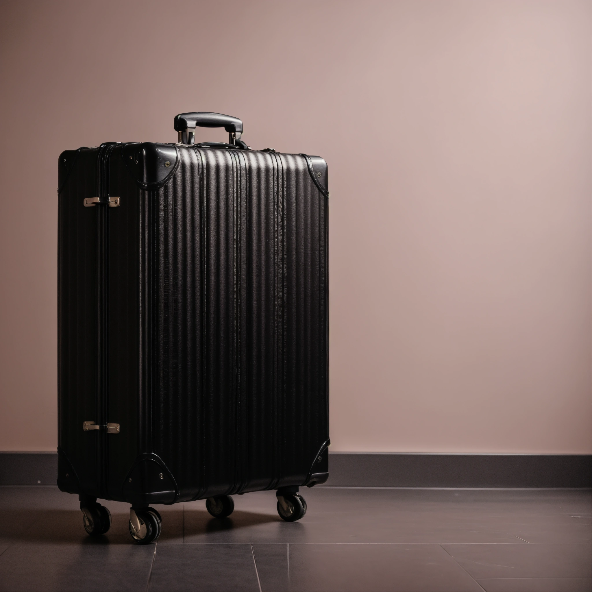 A photo of a black suitcase. the suitcase is new, polished with stitches. the background is a plain white wall.