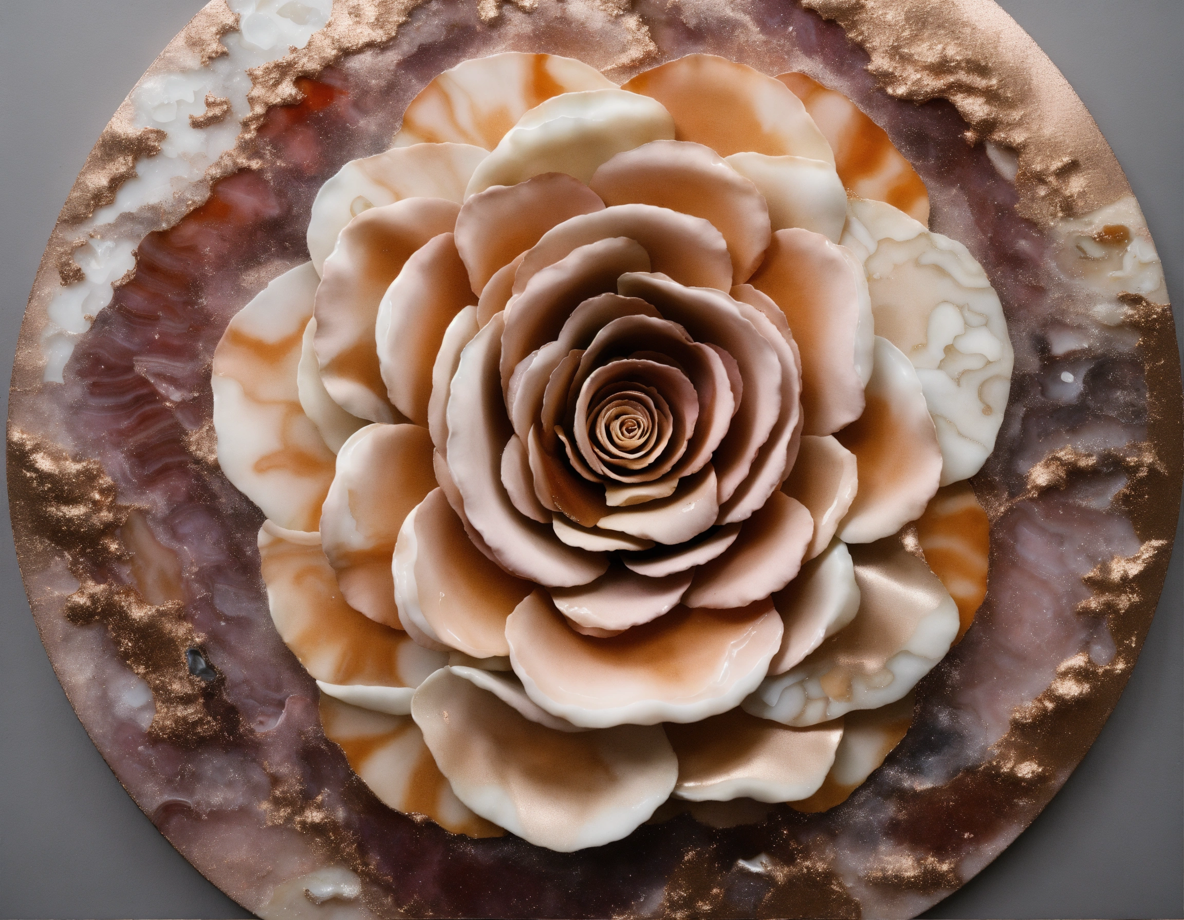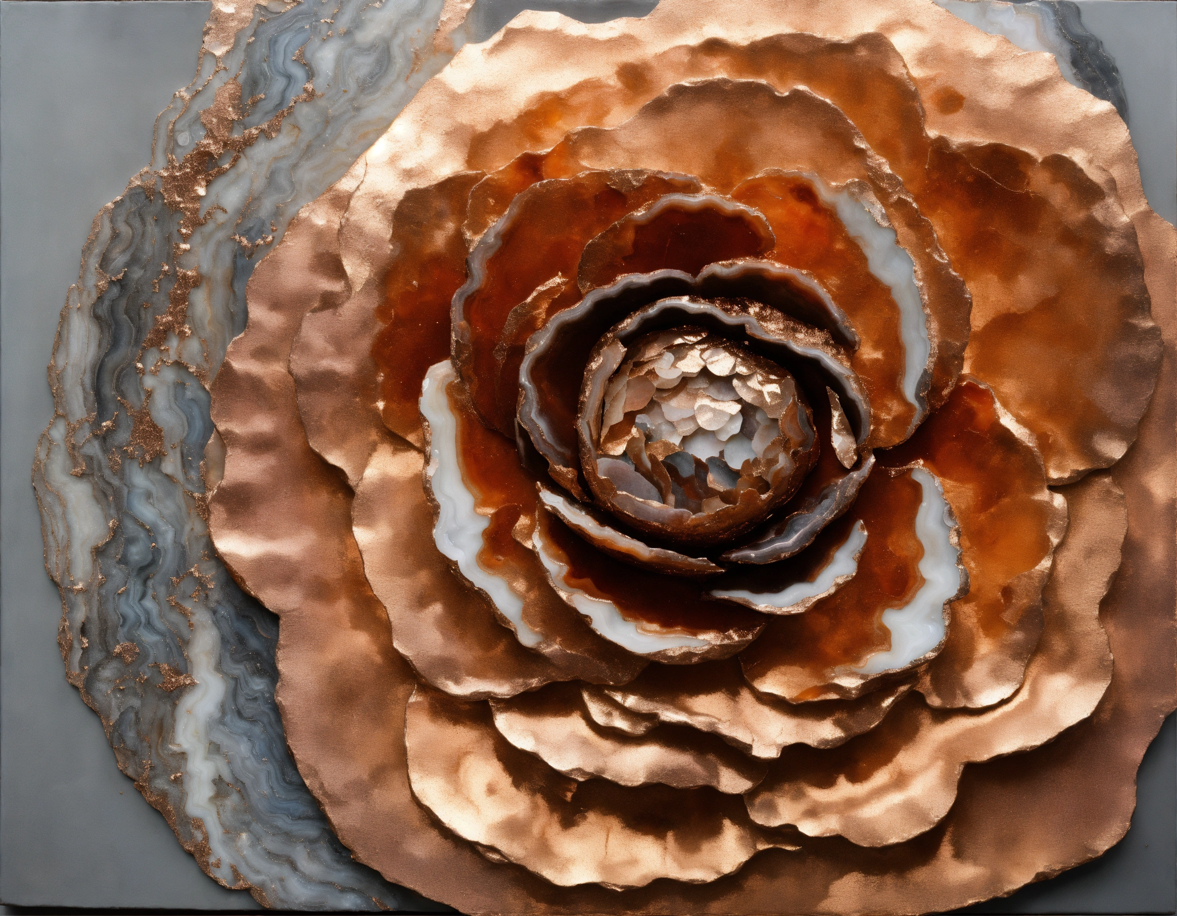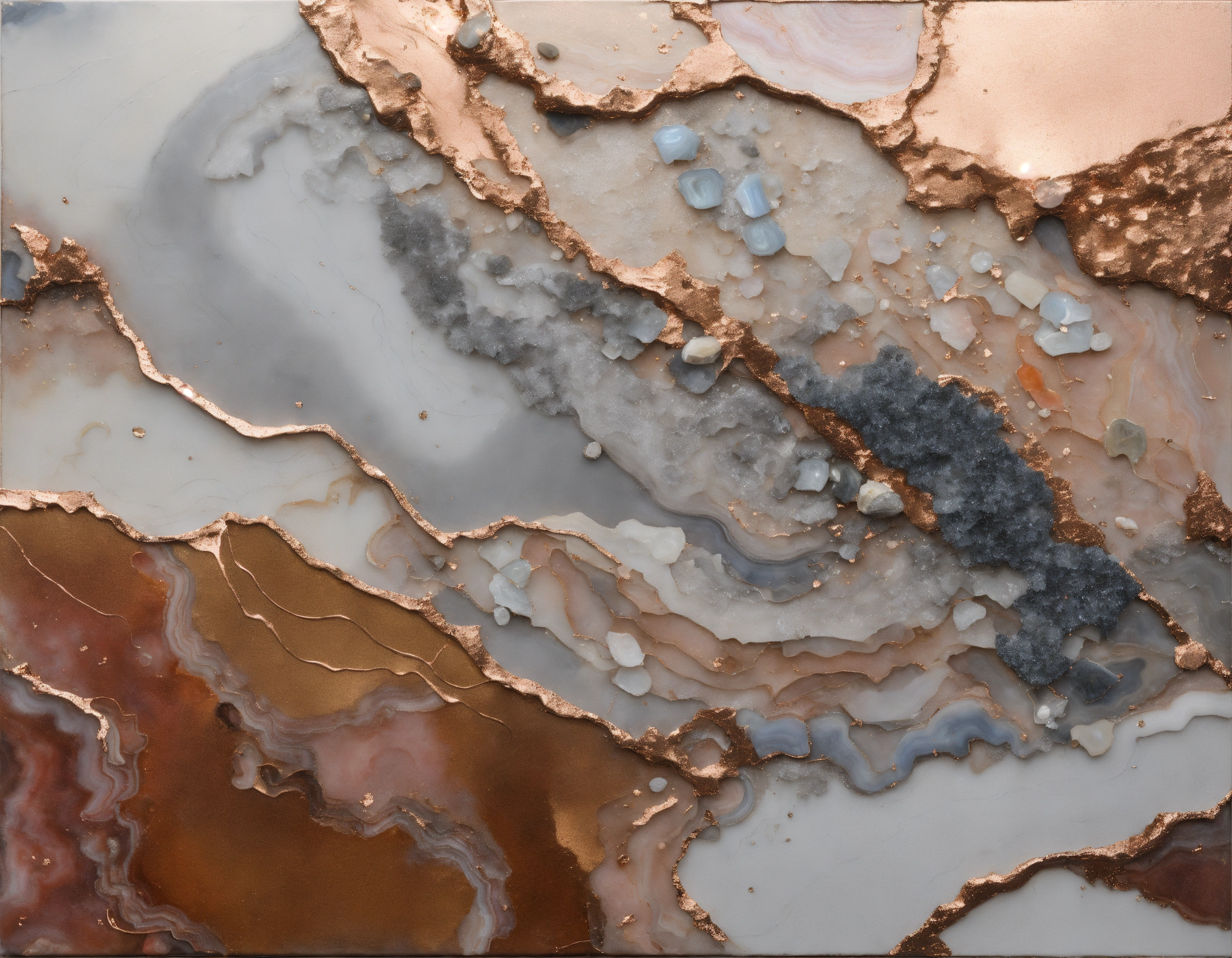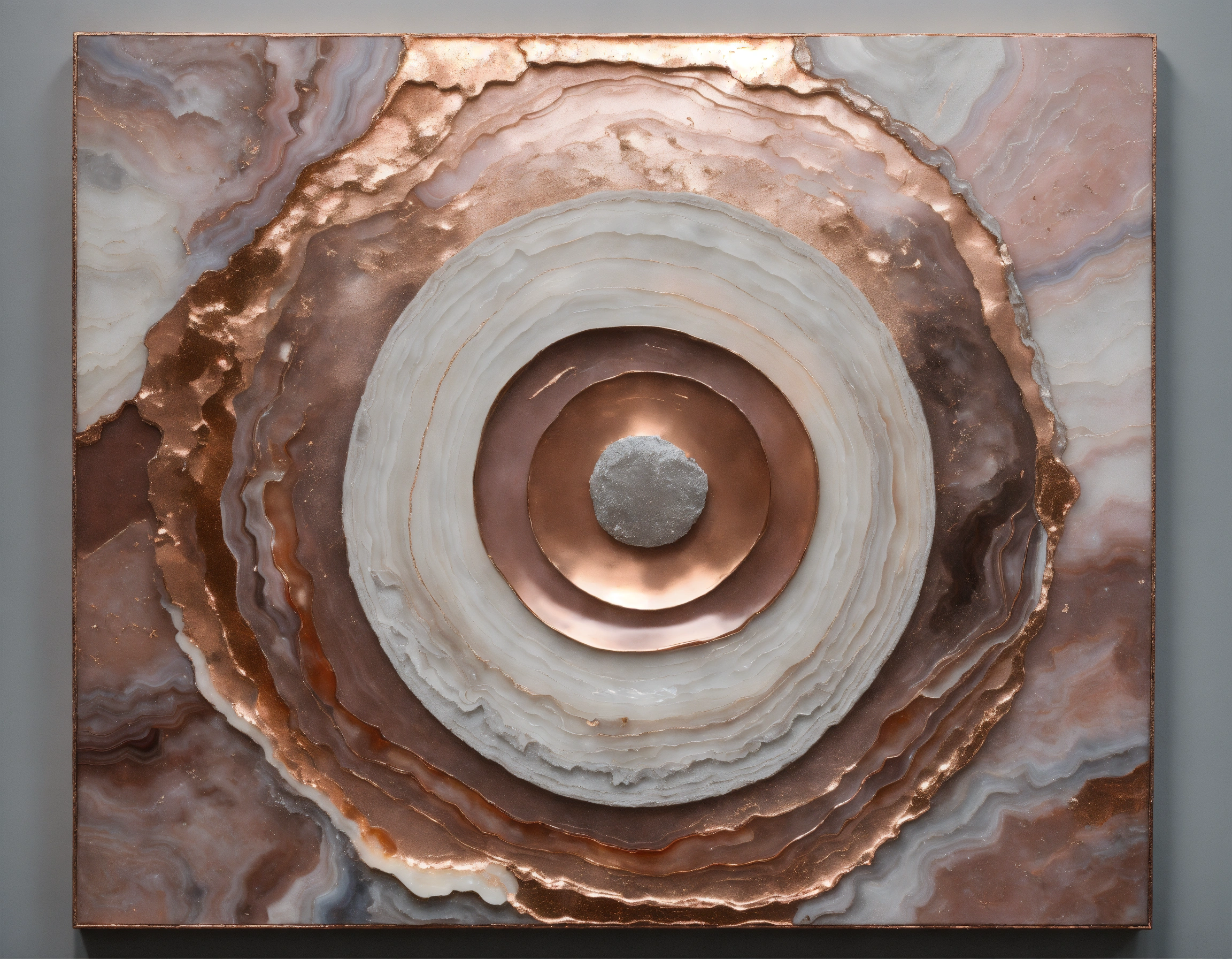 Russell mills, relief painting, abstract, mixed media, rose gold, white and natural tones, grays, reliefs, agate crystal with its layers and sparkles
