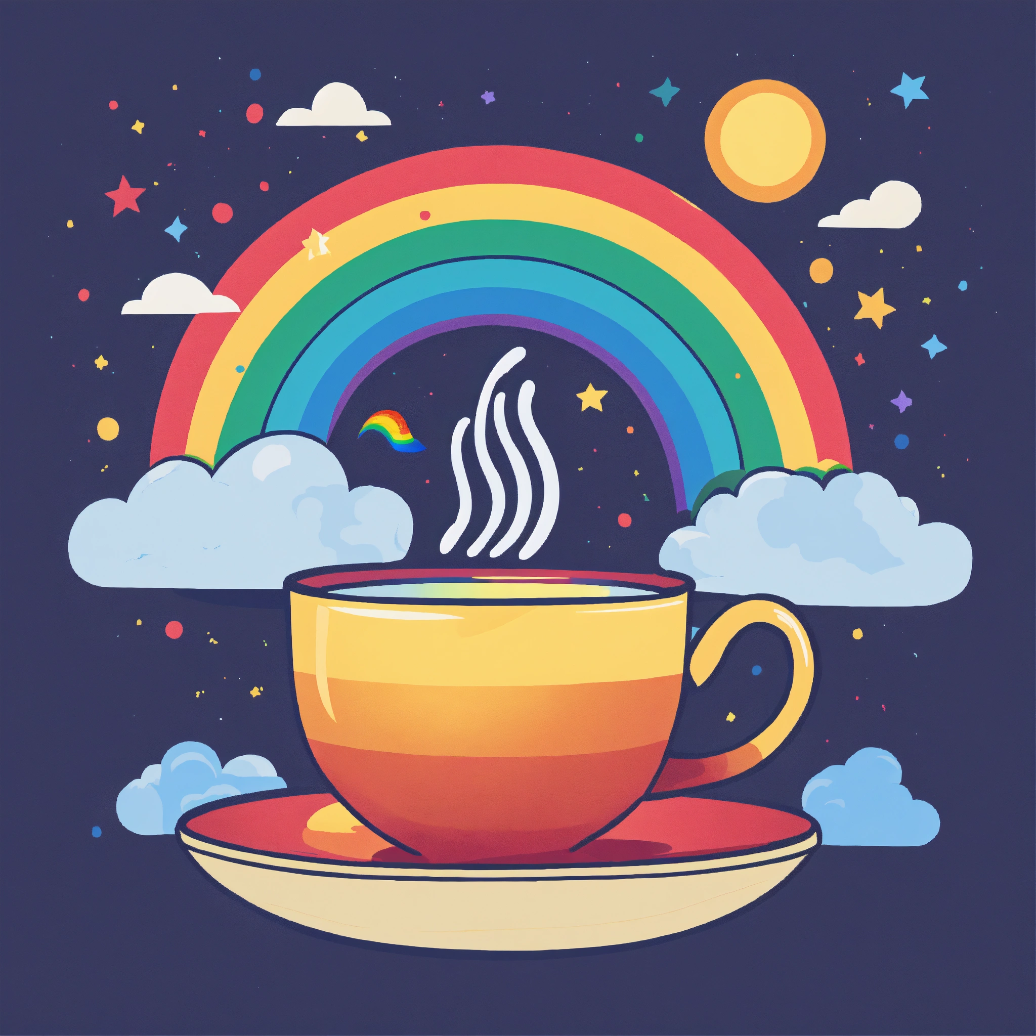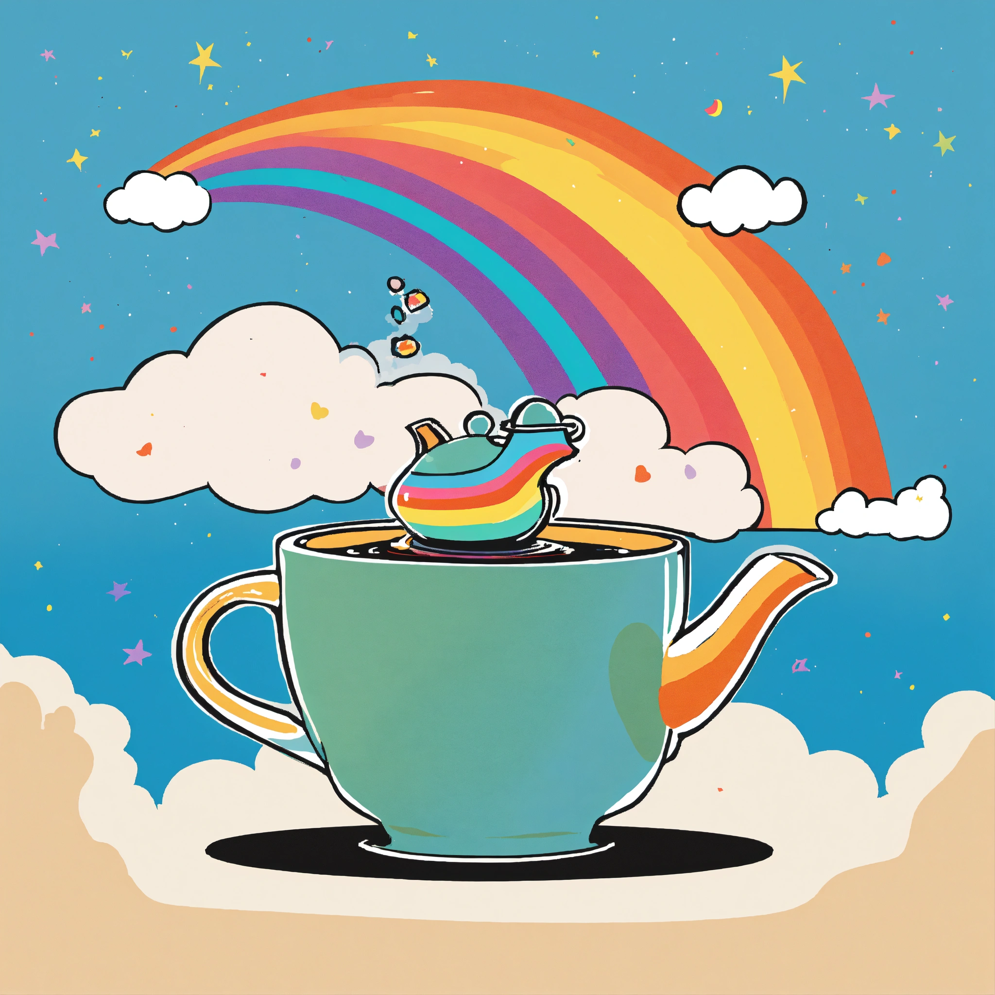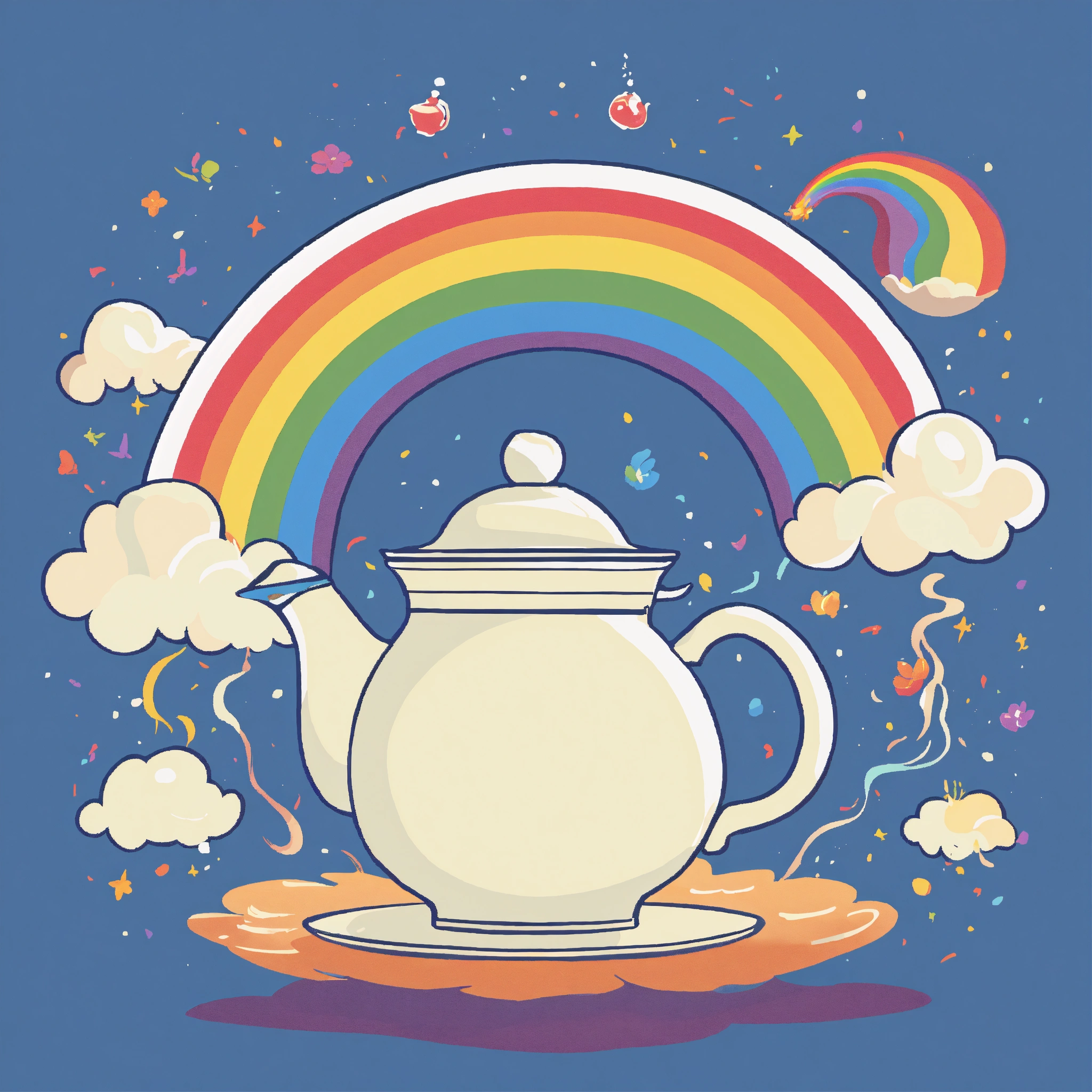 T-shirt vector illustration, centered design of a quirky teapot, pouring a rainbow into a tea cup, against a cloud-filled sky. celebrating magical tea moments. simplistic, centered vector illustration, solid background color.