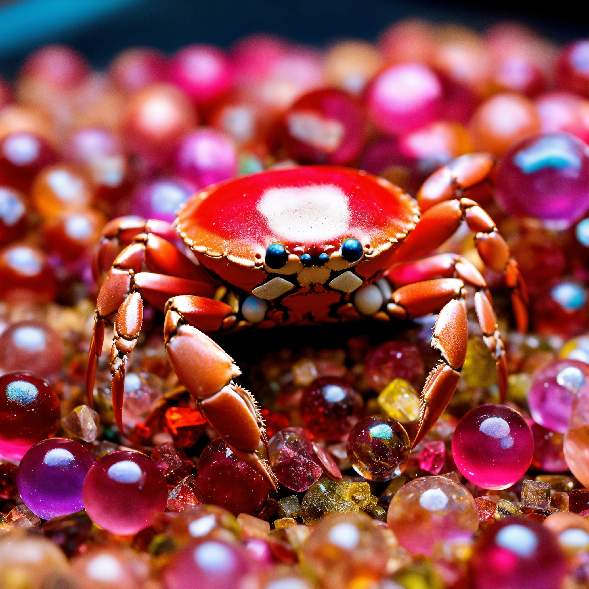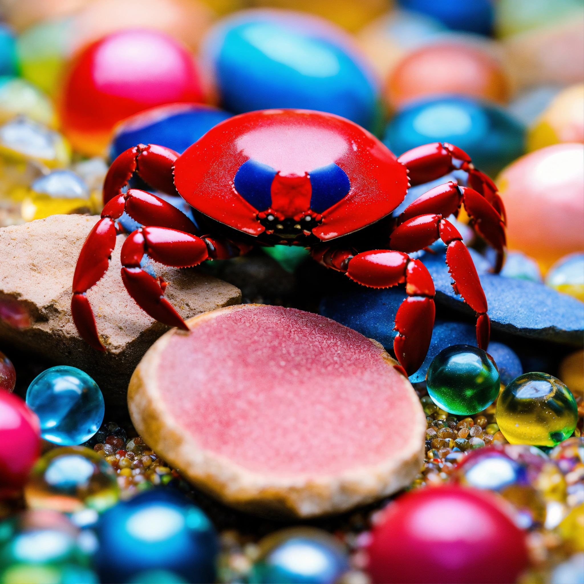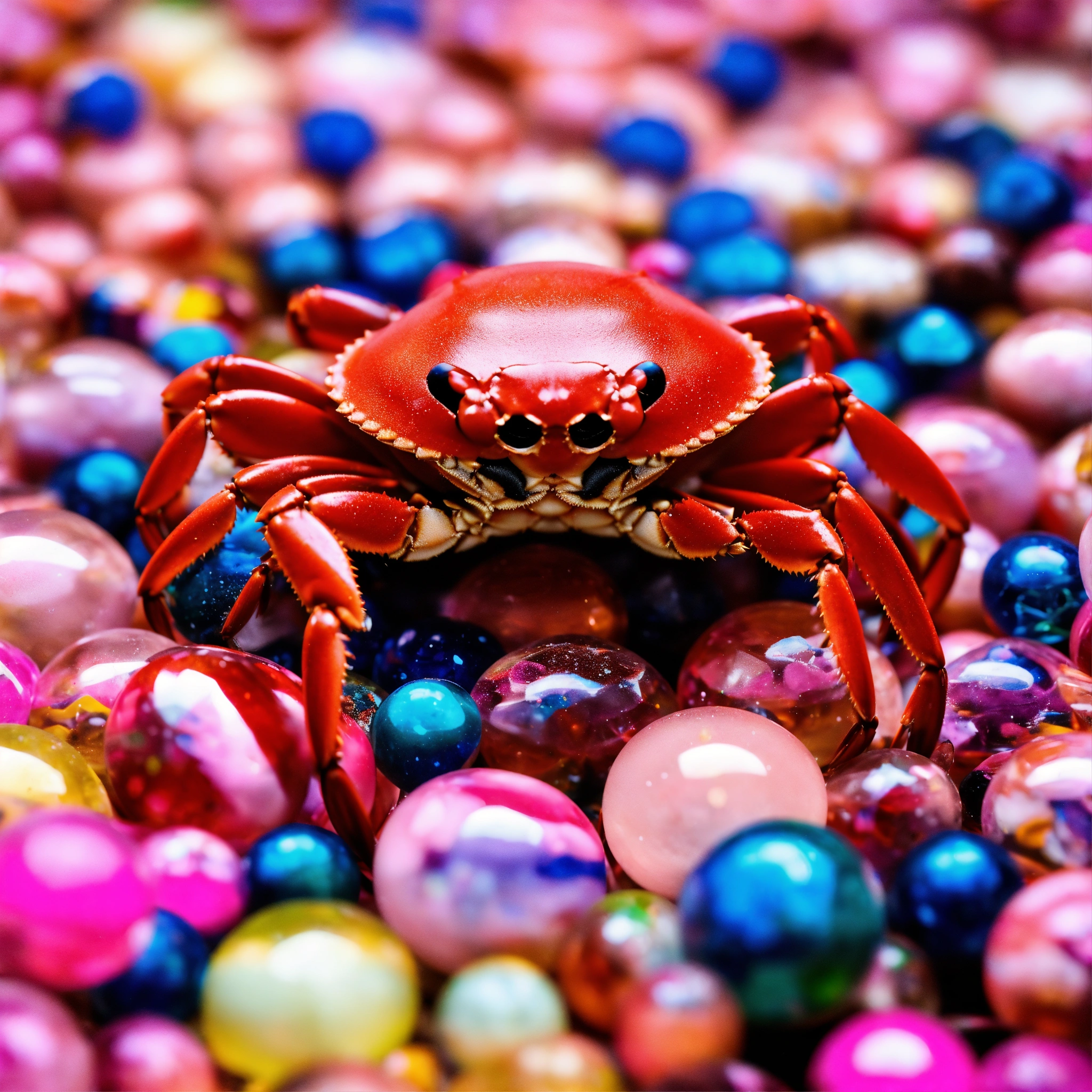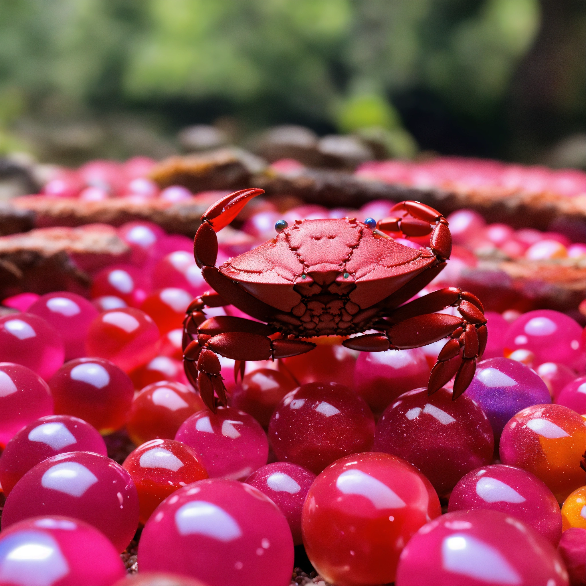The crab (pink-ish red) standing on top of a pile of prism marbles, the ground is wet and filled with marbles, a small tiny log is visible too