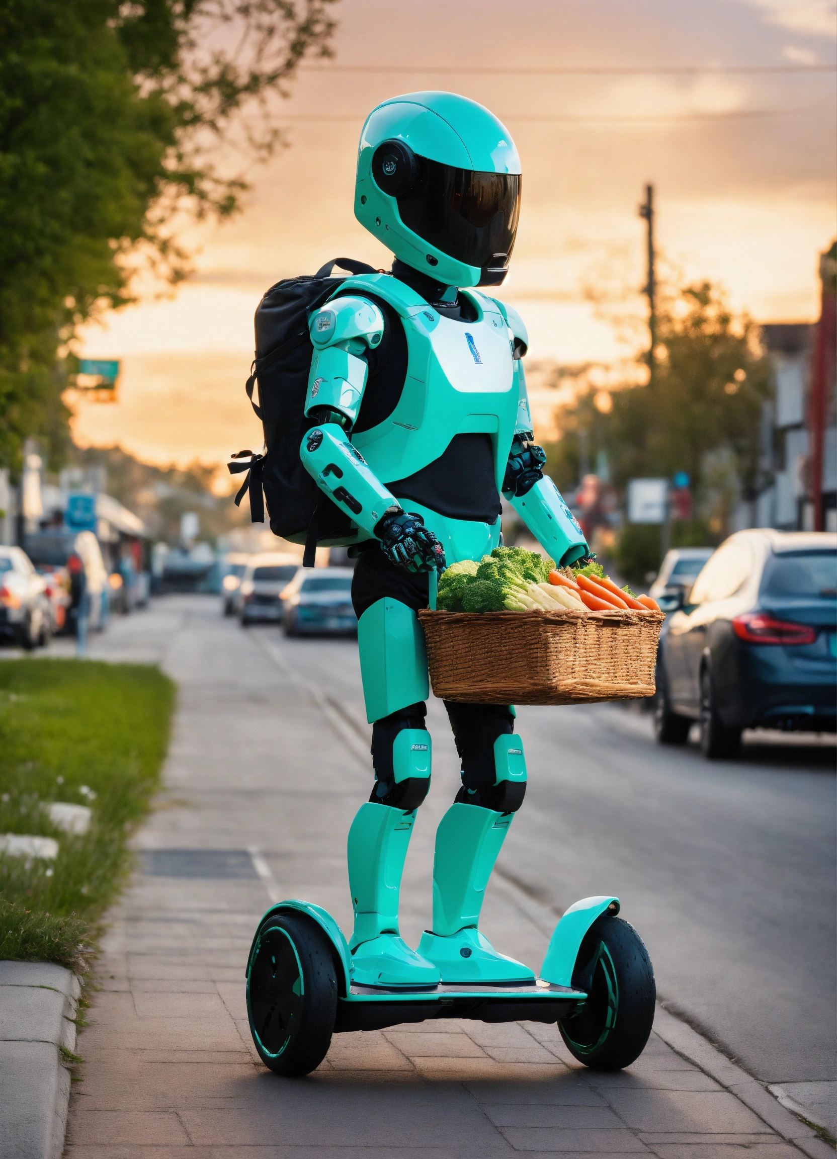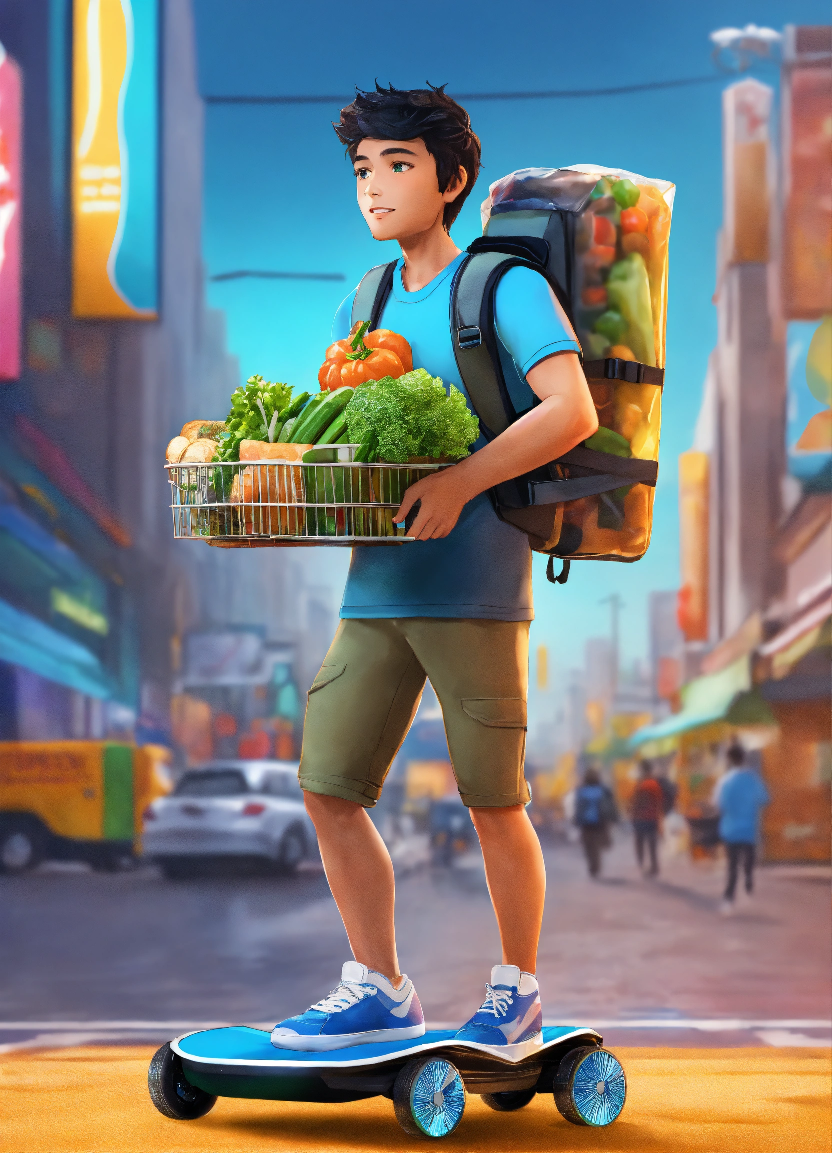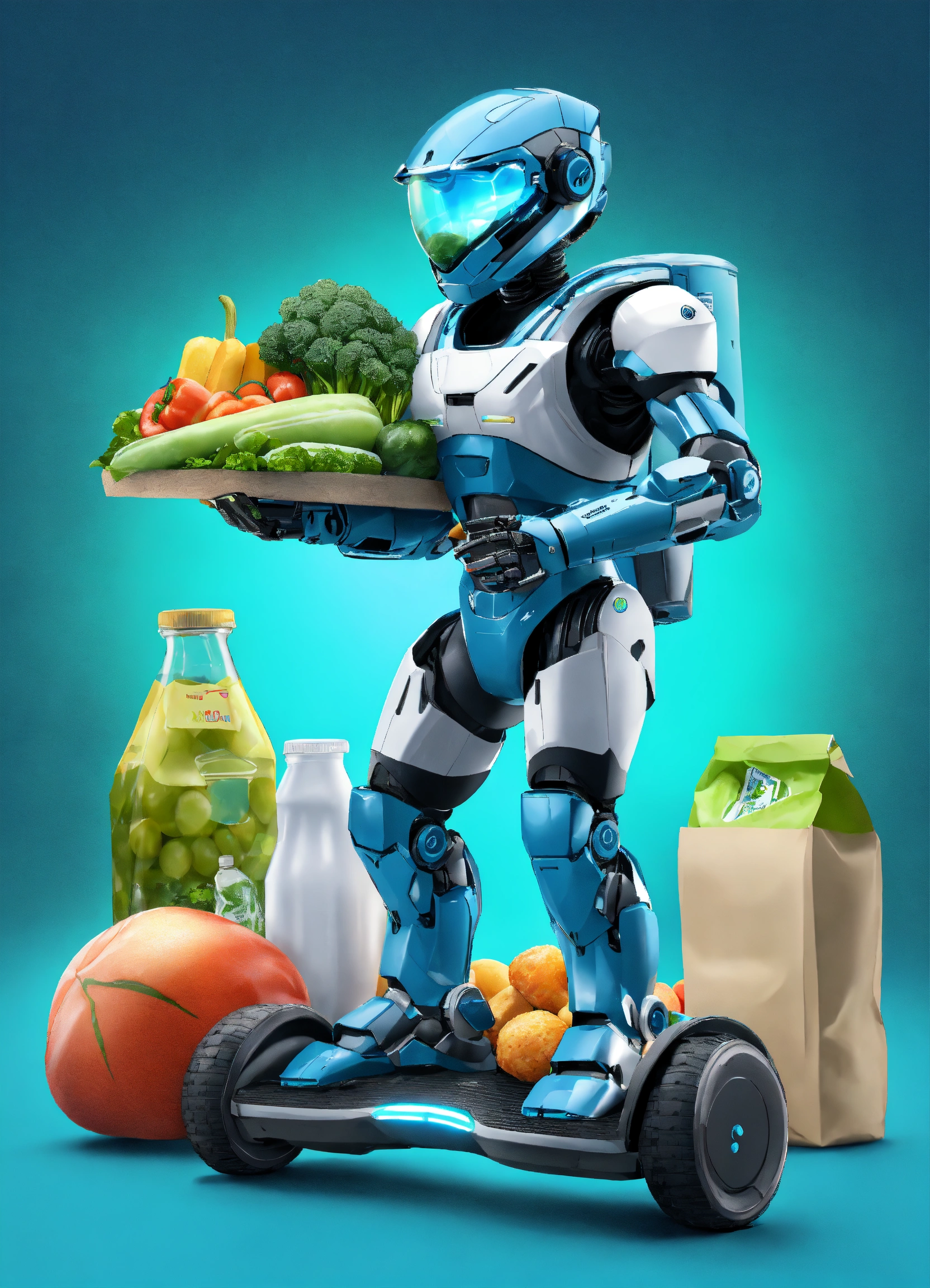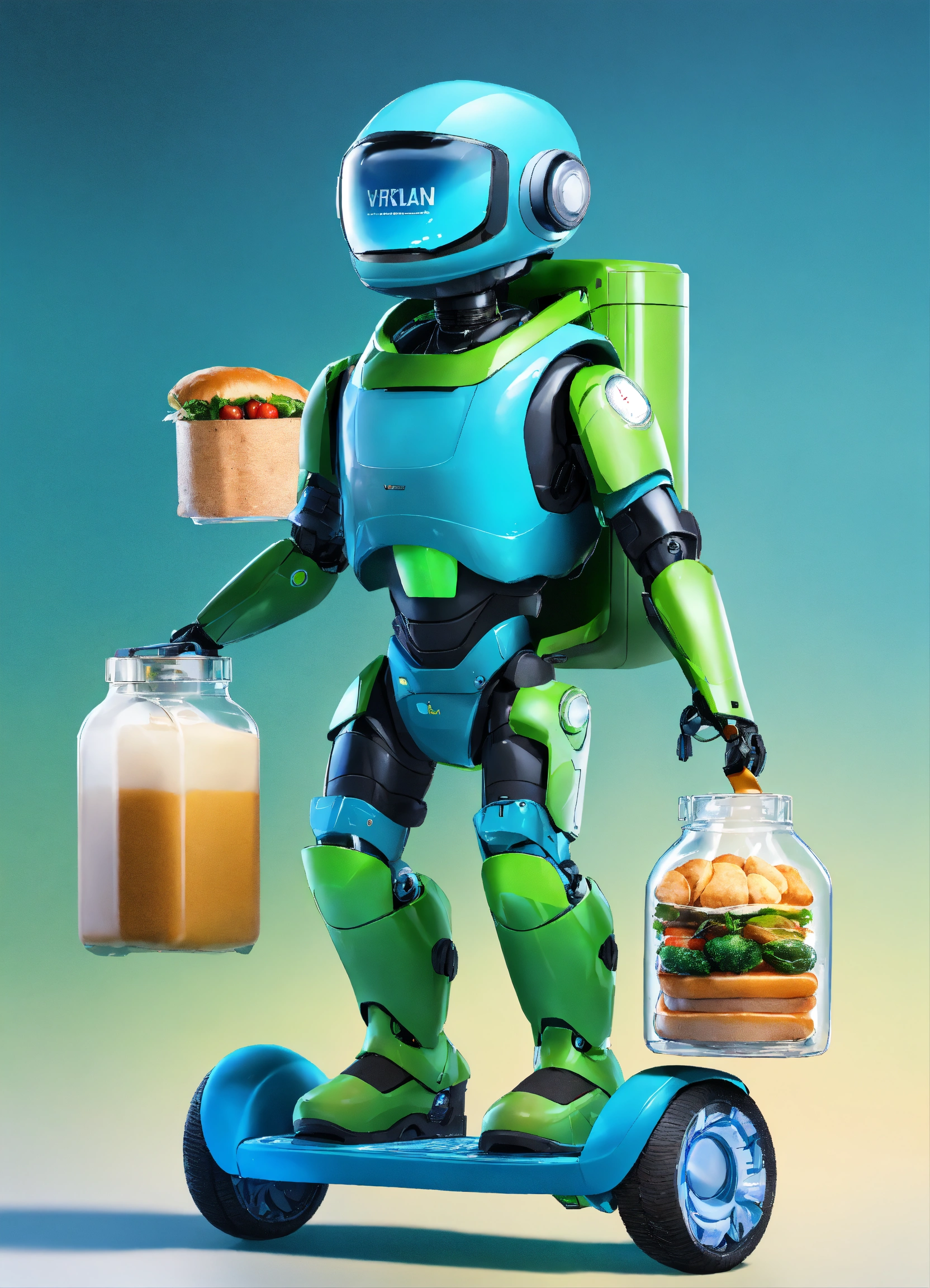 A passionate male robot on hoverboard, realistic man face, clear eyes, black hair, full appearance, delivering groceries, assorted milk bottle, bread pack, soft drink, and some assorted vegetables basket on hands. sports backpack. transparent background, the predominant design colors are gradients of blue and green. no background images, background should be gradients of blue and green