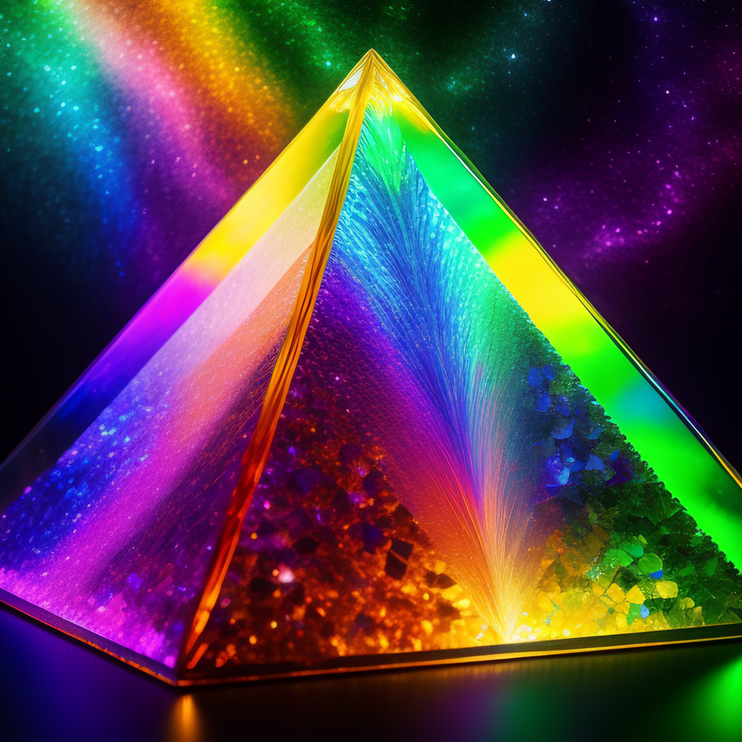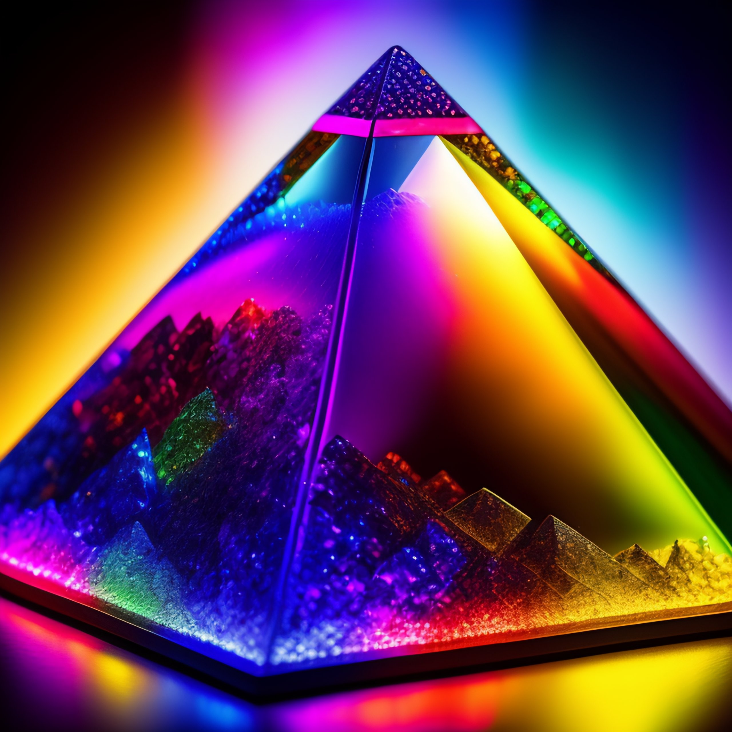 Pyramid made of rainbow crystals, glass materials, fractal lights, incredible reflections, highly detailed, intricate details, emotional, dramatic, impressive, amazing colors, various angles floating points