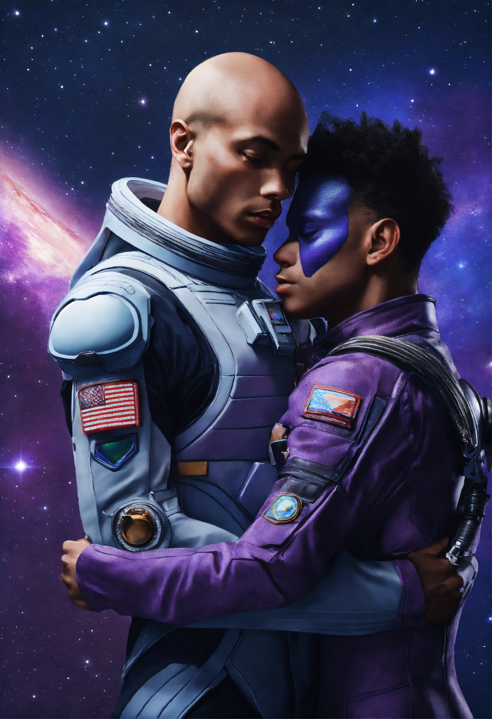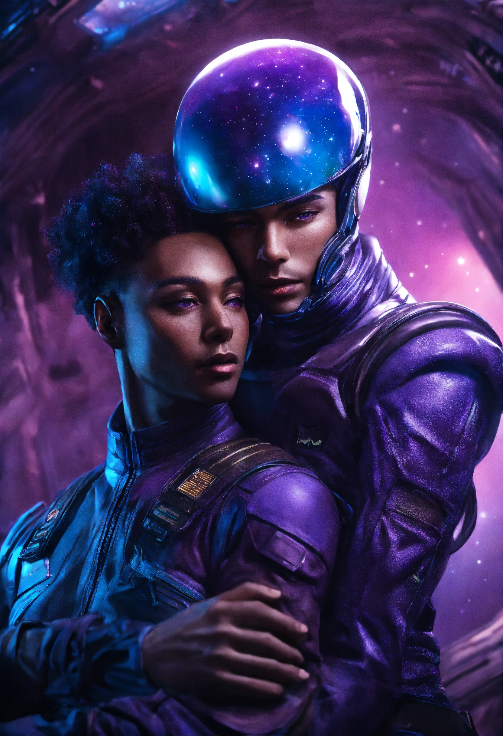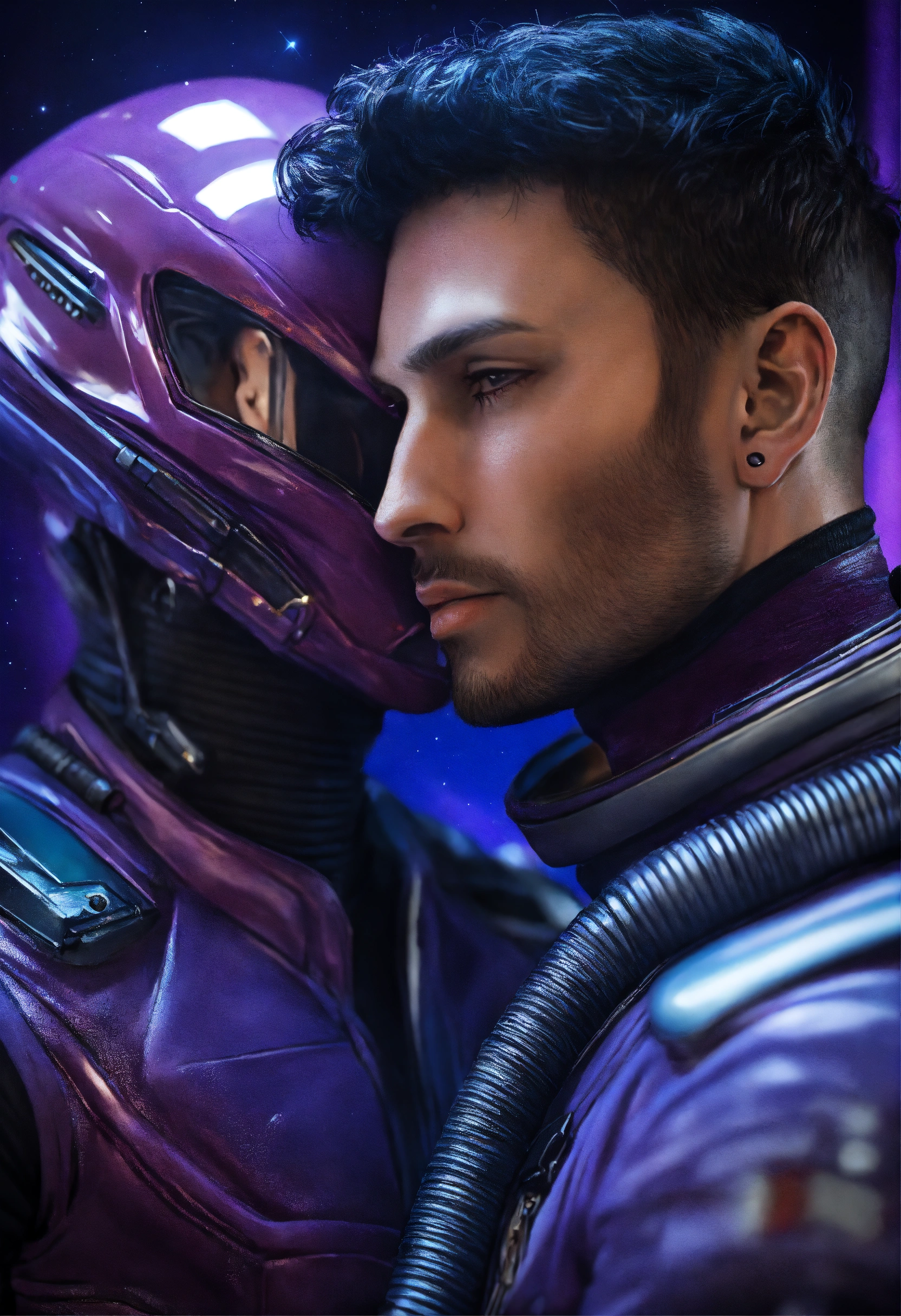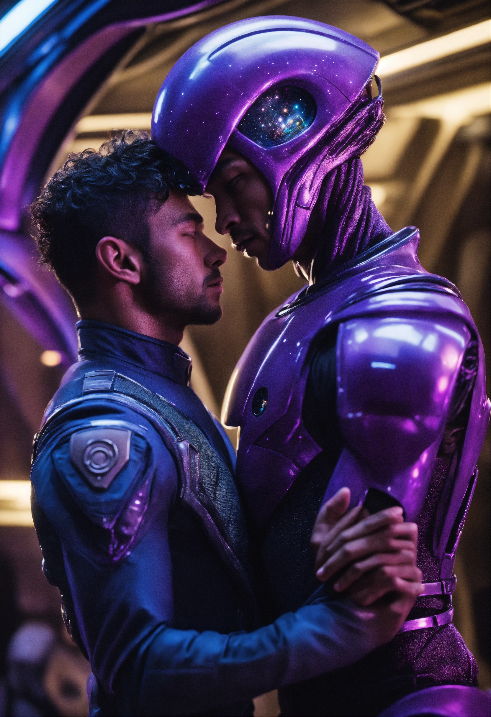 Alien male masculine with purple skin and a masculine human male in a space uniform embracing, photorealism