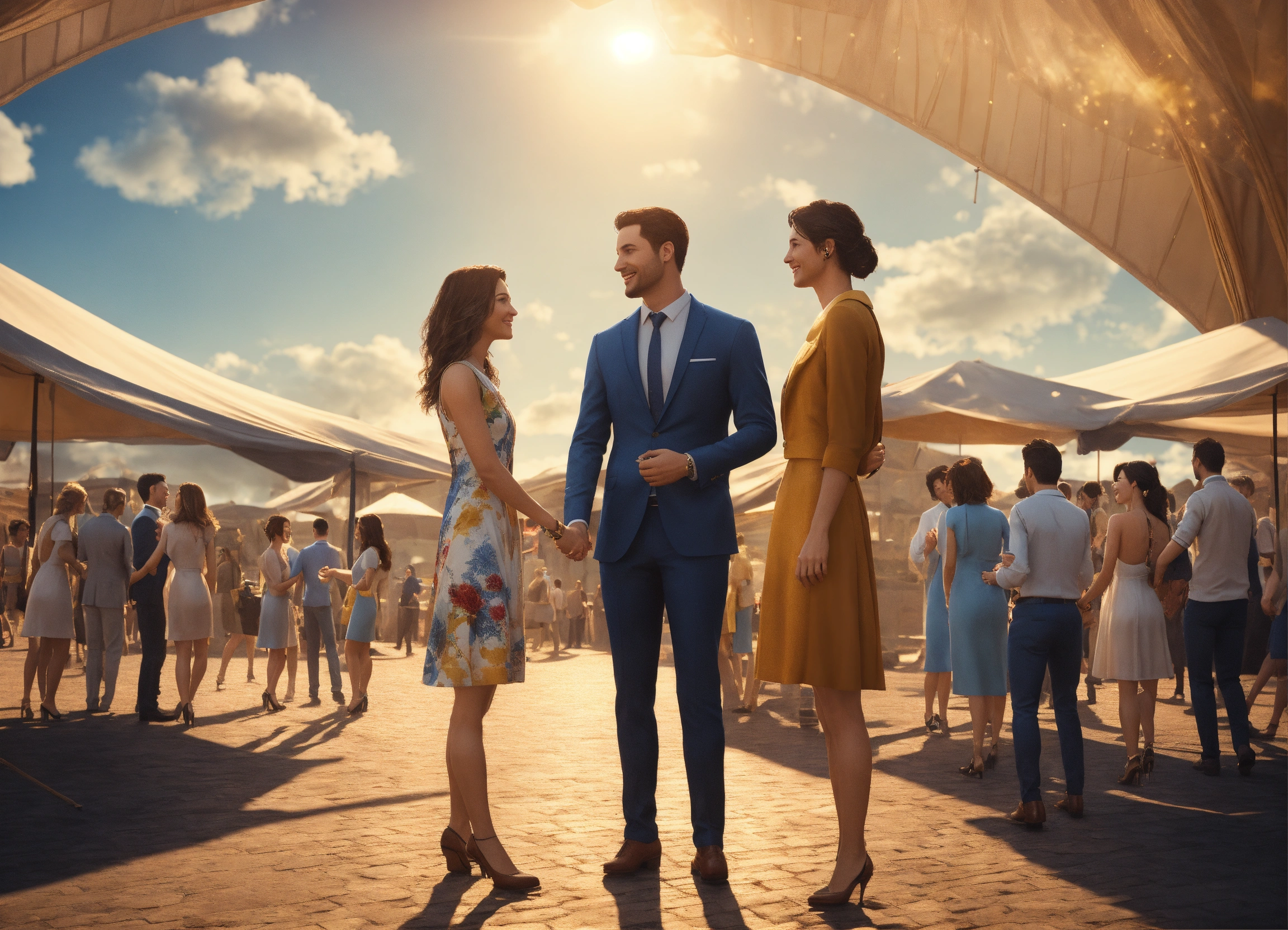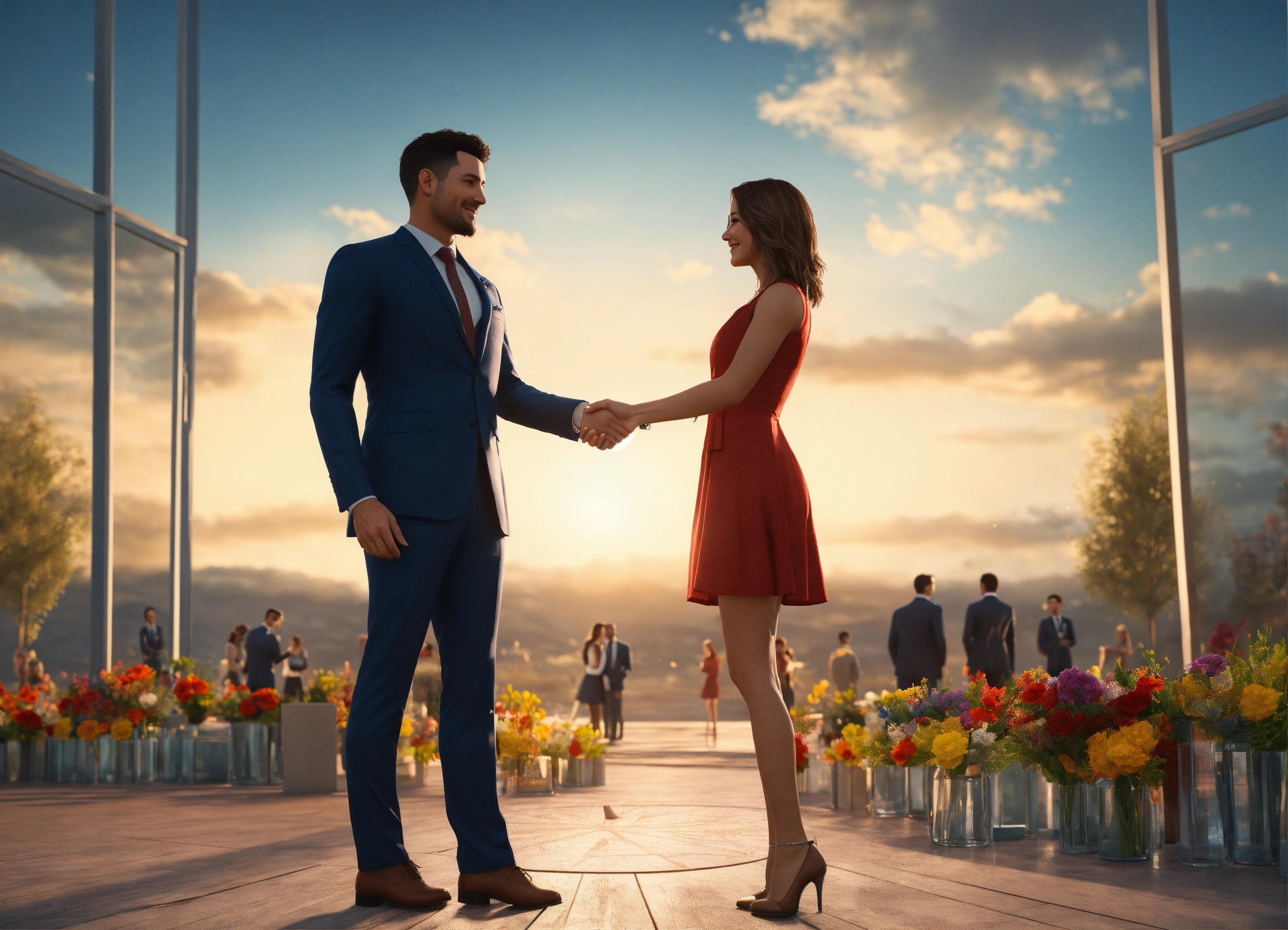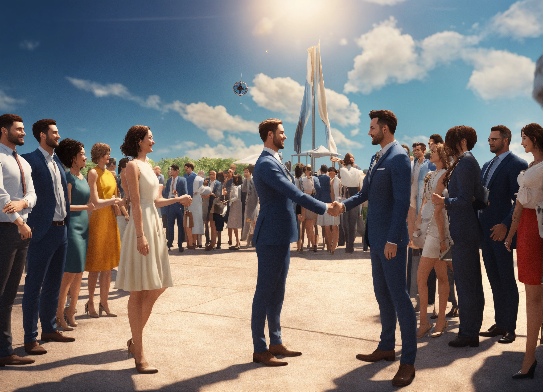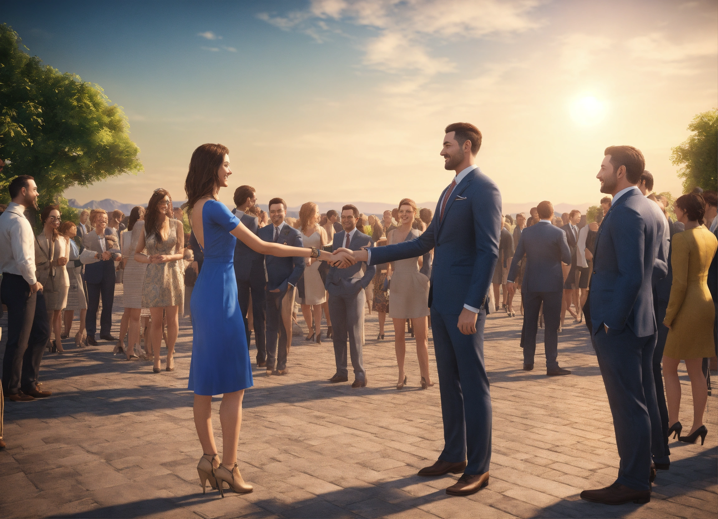 Two happy photorealistic beautiful people in full height, a woman in a dress, a man in a suit, they are getting acquainted and shaking hands. in the background there are many people who want to get acquainted, in the background is a picture of a compass and the sky, photorealistic, detailed, 4k, unreal engine, hdr