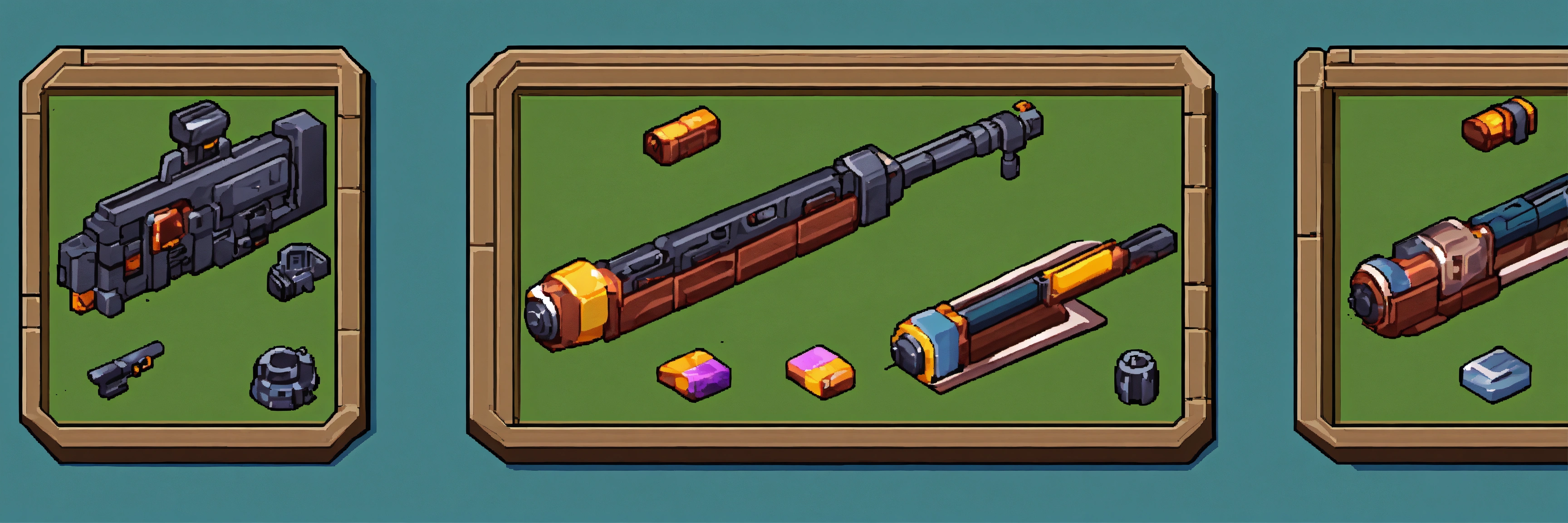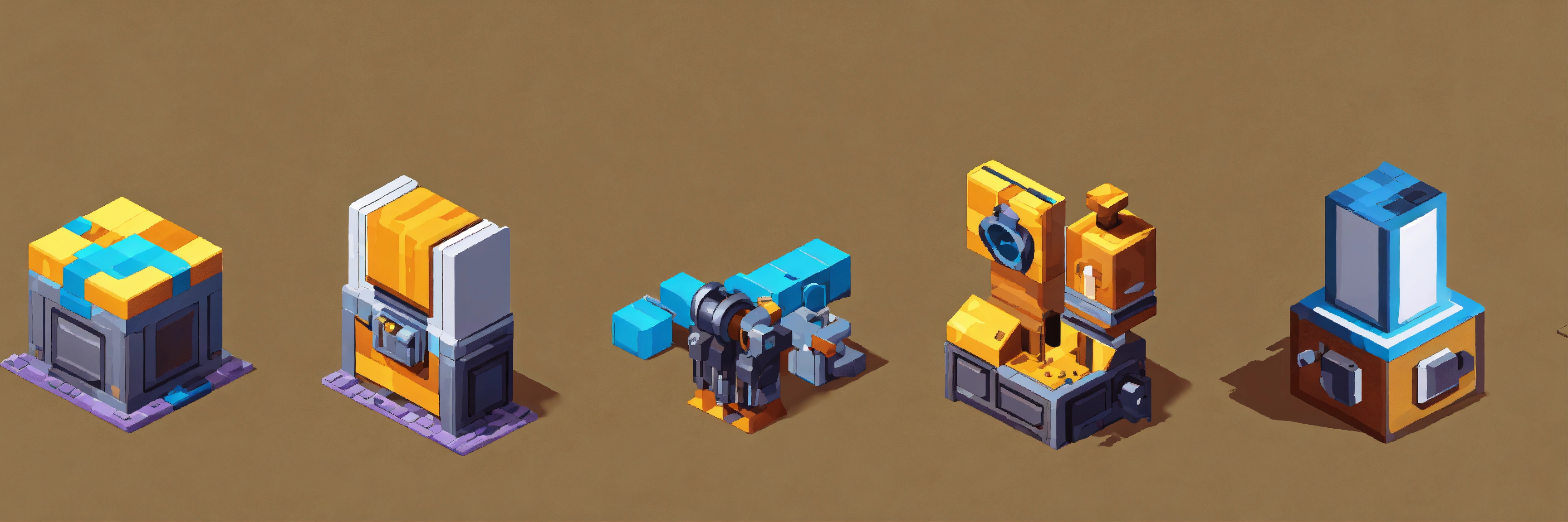 Isometric, low-tech weapon progression upgrade graphic, top down isometric mobile game extremely simplistic pixel art, low res blocky