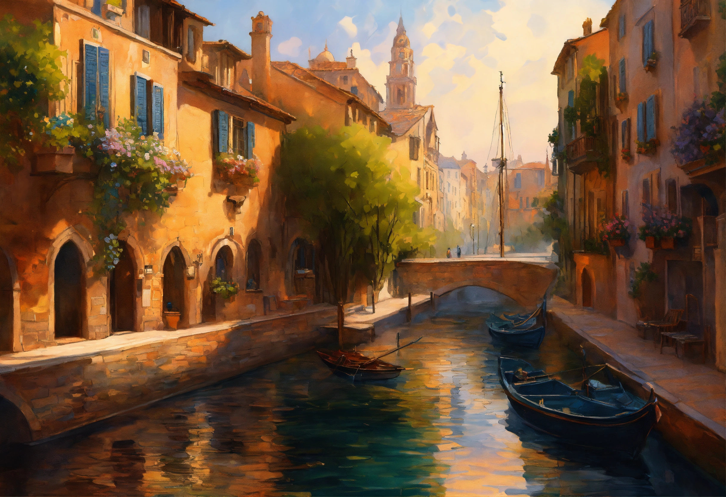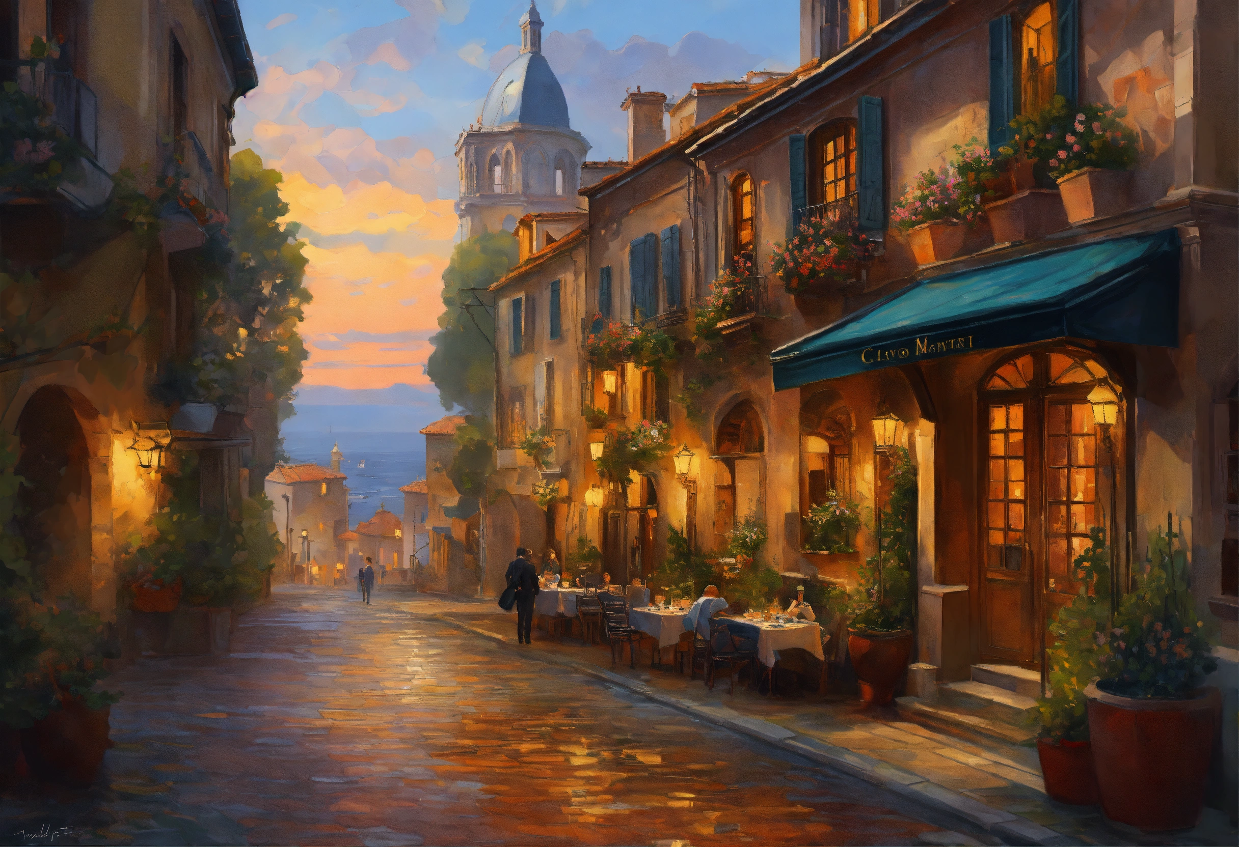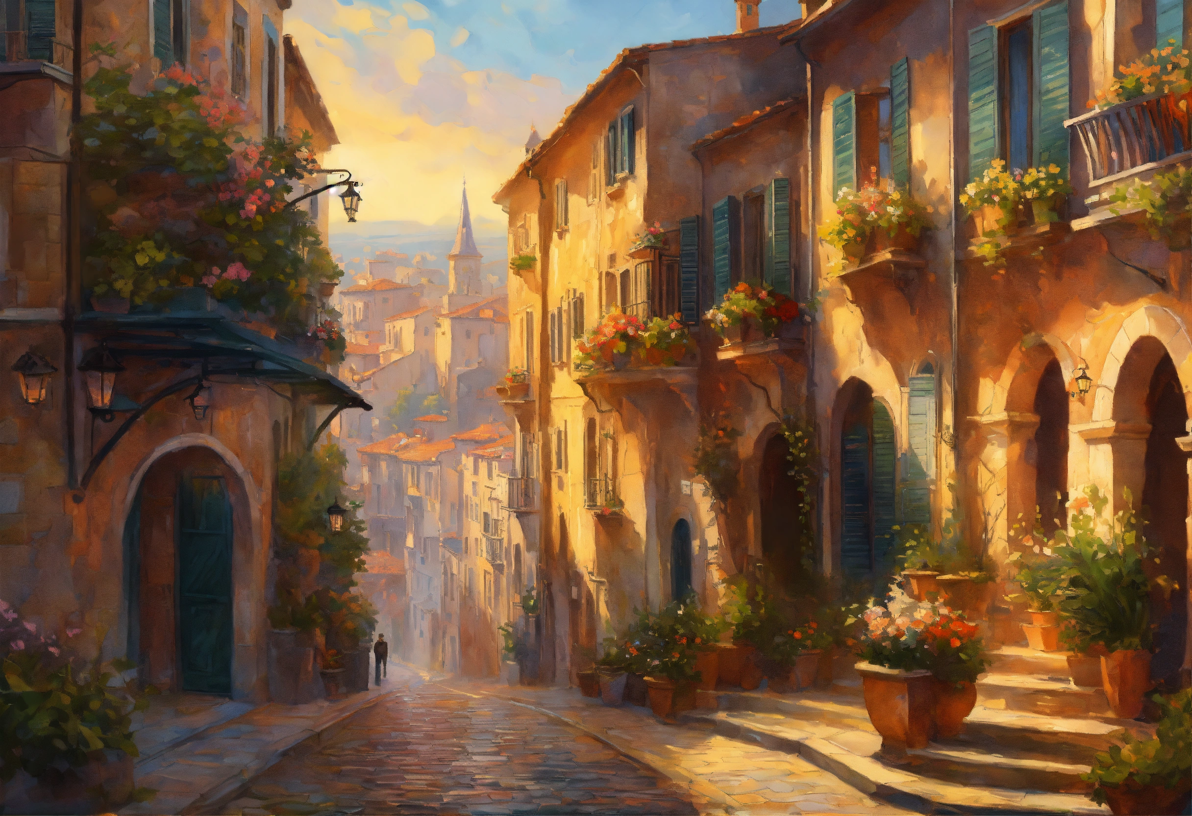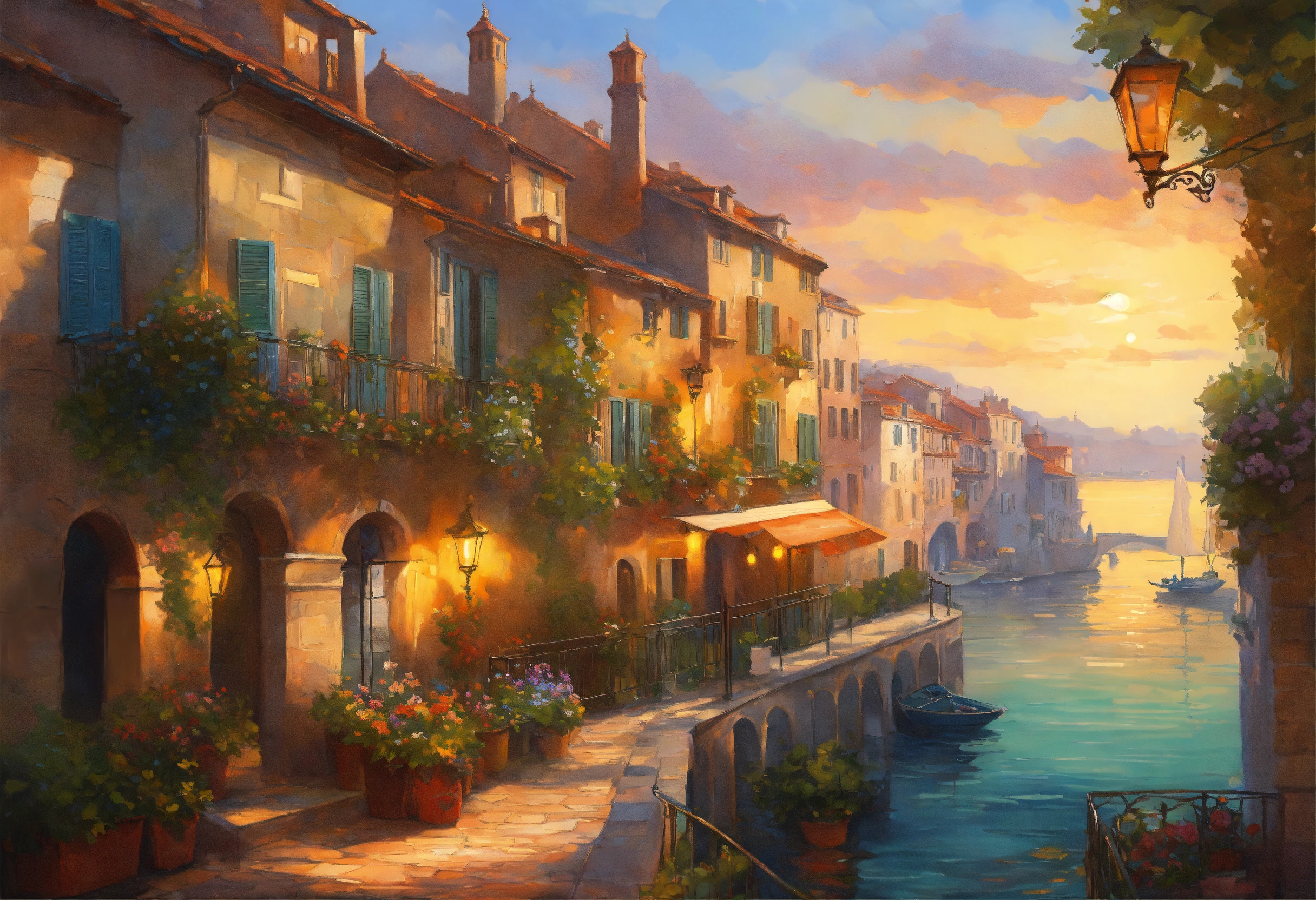 A line art illustration of medivel, mediteran city, by evgeny lushpin and daniel f gerhartz and claude monet and leonid afremov, high details, impressionism