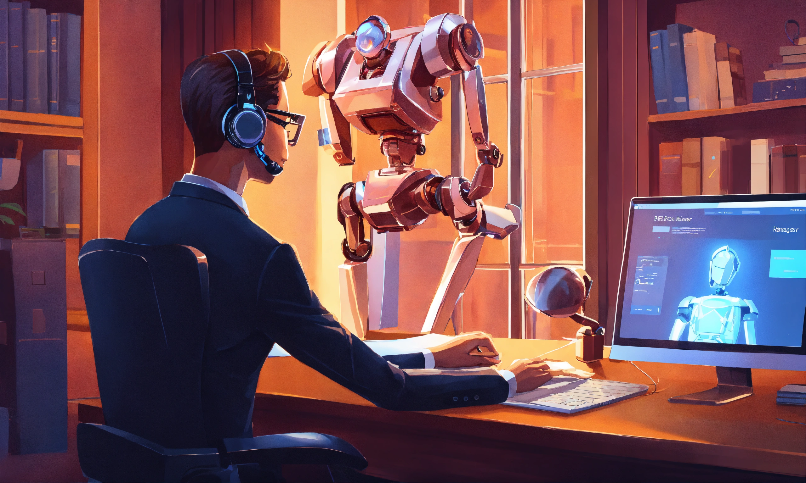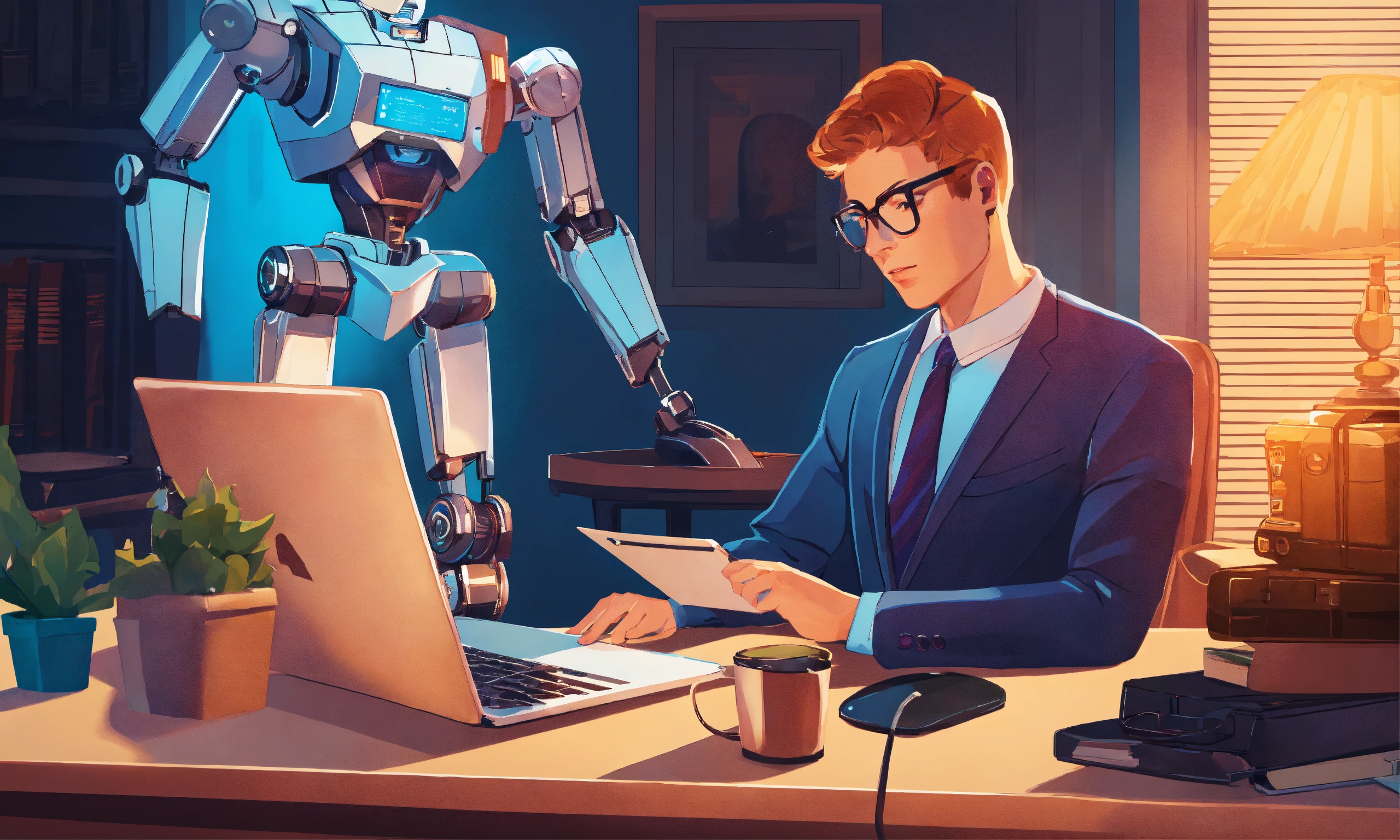 A perfectly rendered vector illustration of a lawyer in the law firm, the blogger is typing on a laptop and the screen shows a virtual robot assistant helping the blogger write a blog post