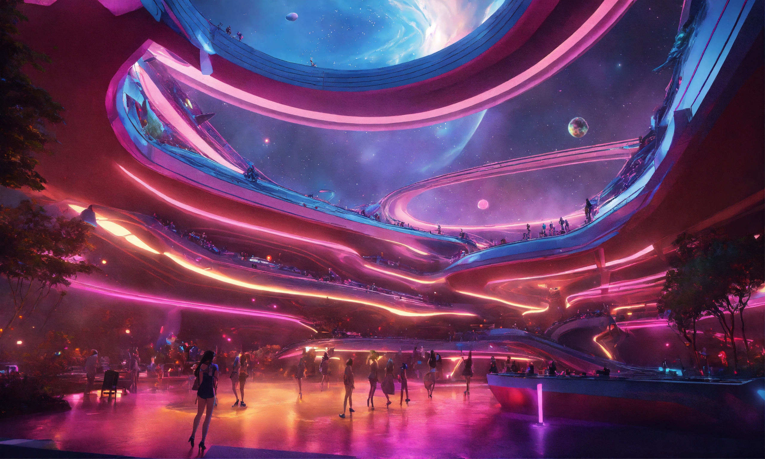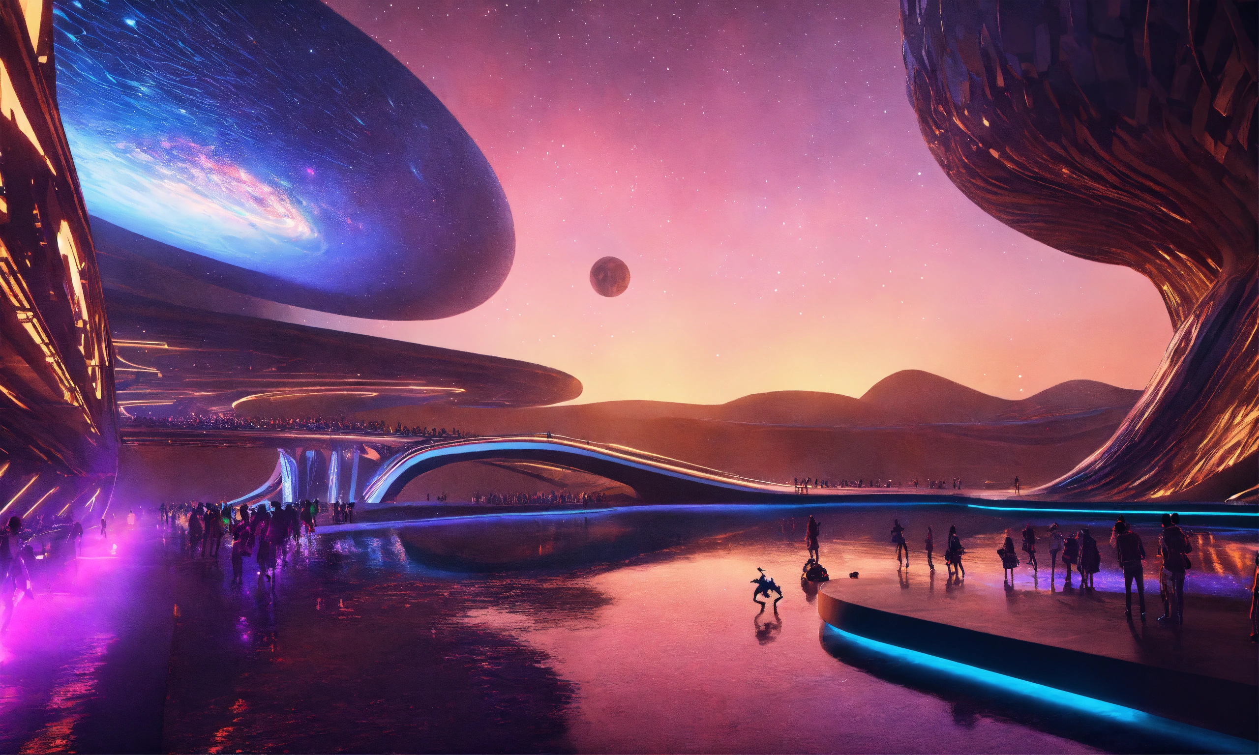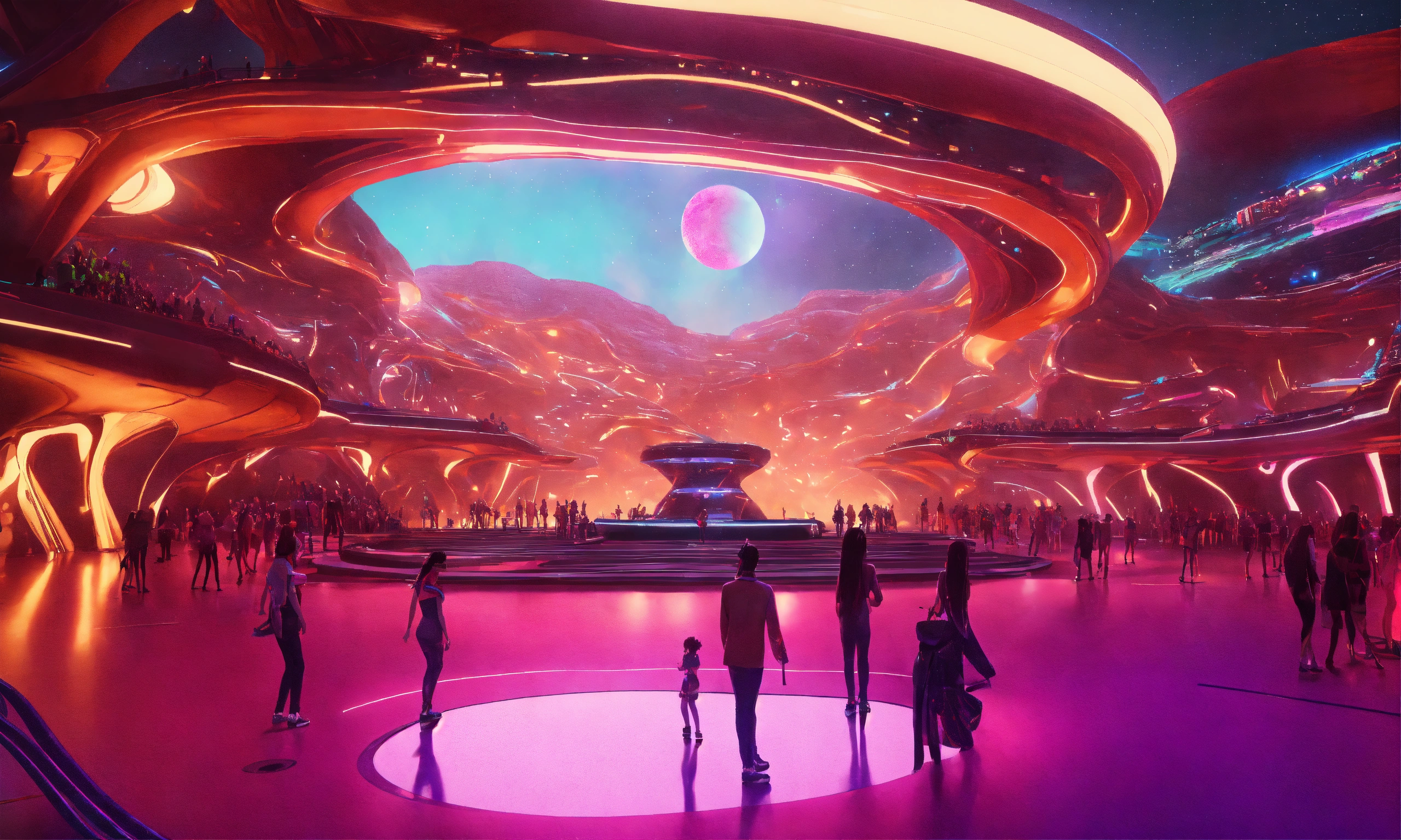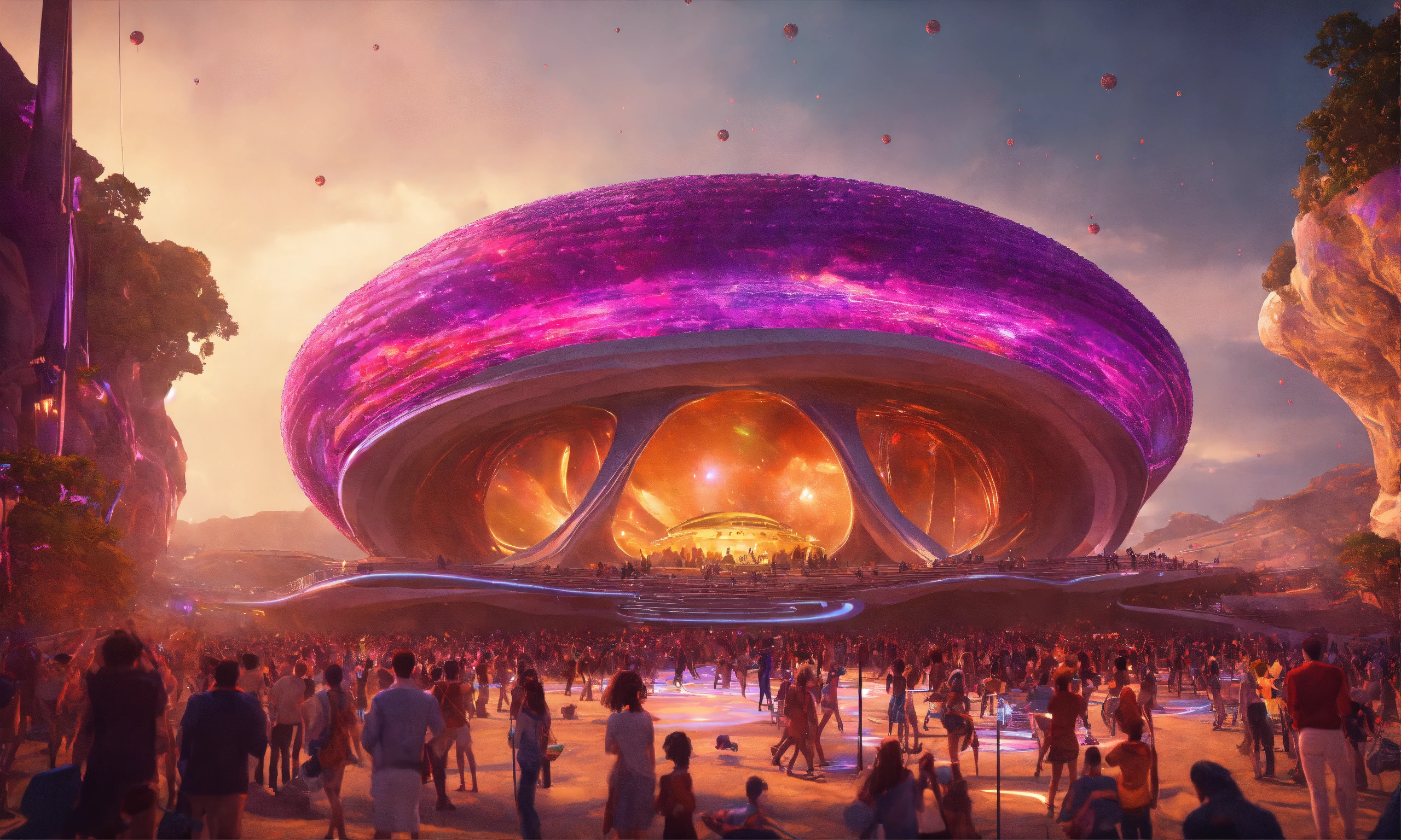 Music festival on venus, dreamy, crowded, alien creatures dancing, nebula, cosmic, psychedelic, bands playing, zaha hadid style arena, modern architecture, 8k, realistic, unreal engine
