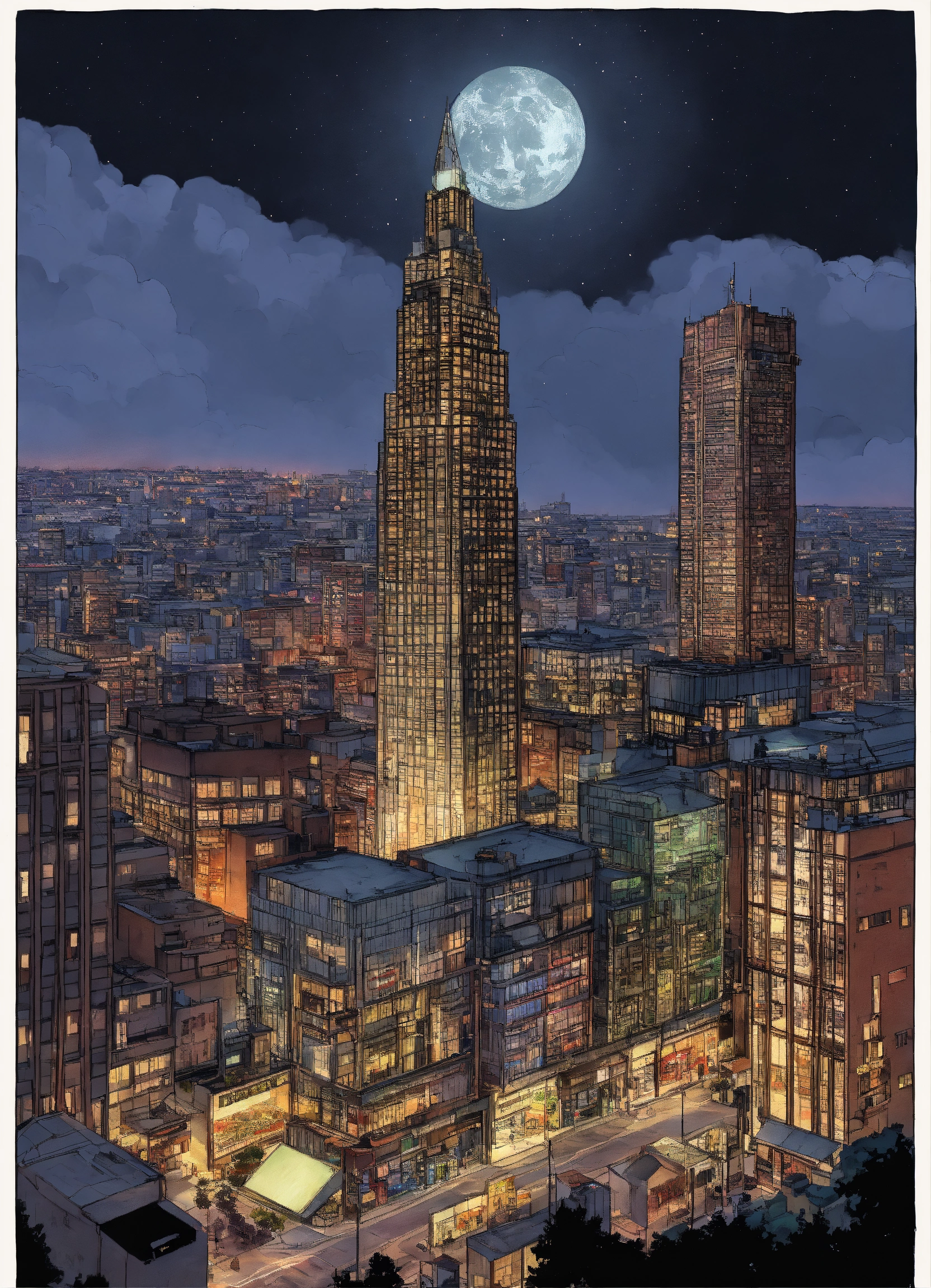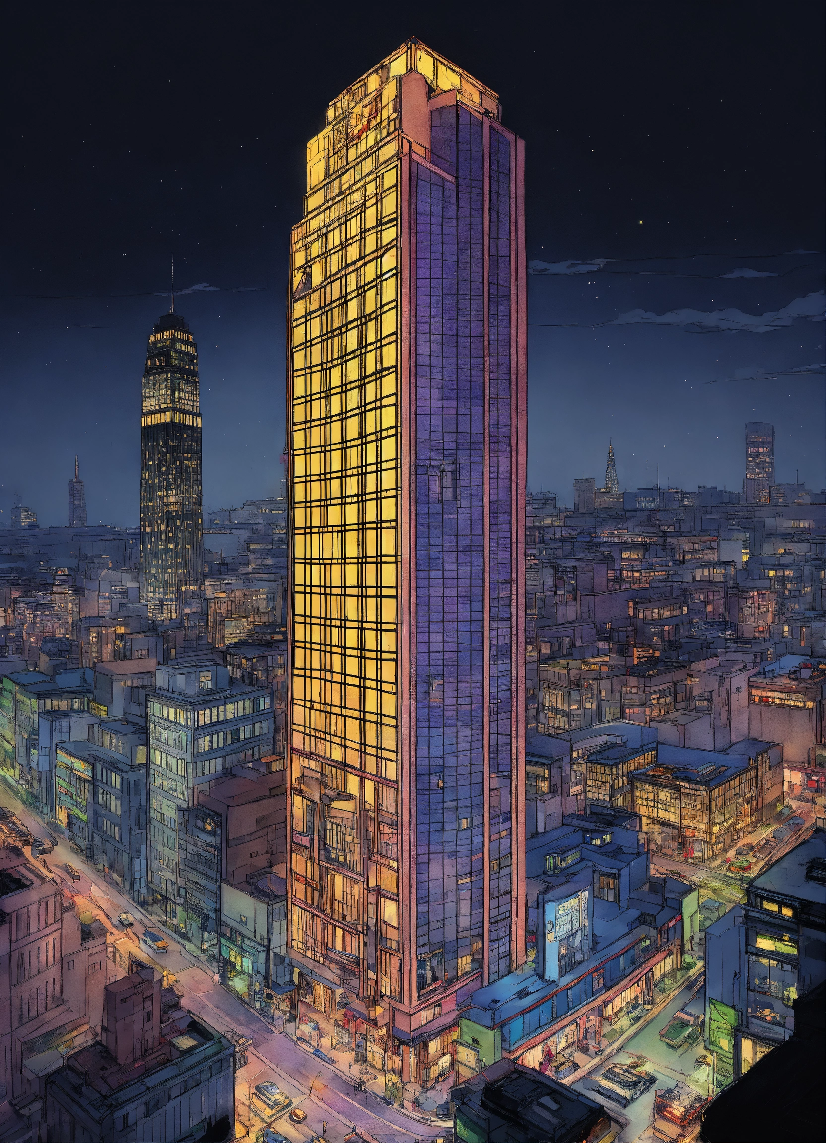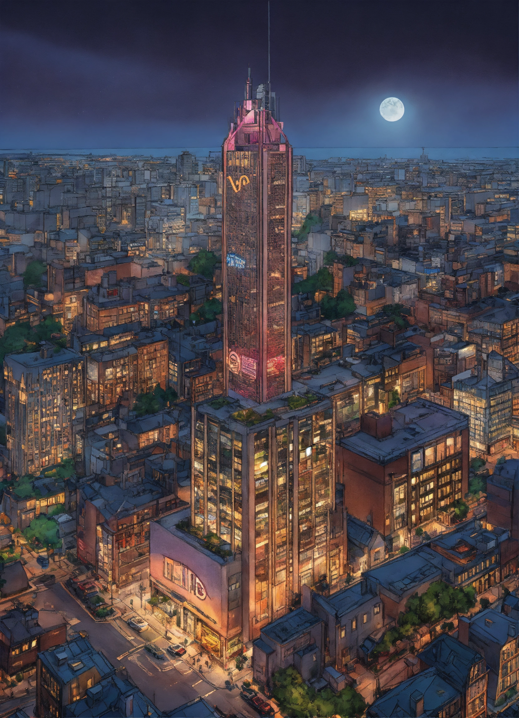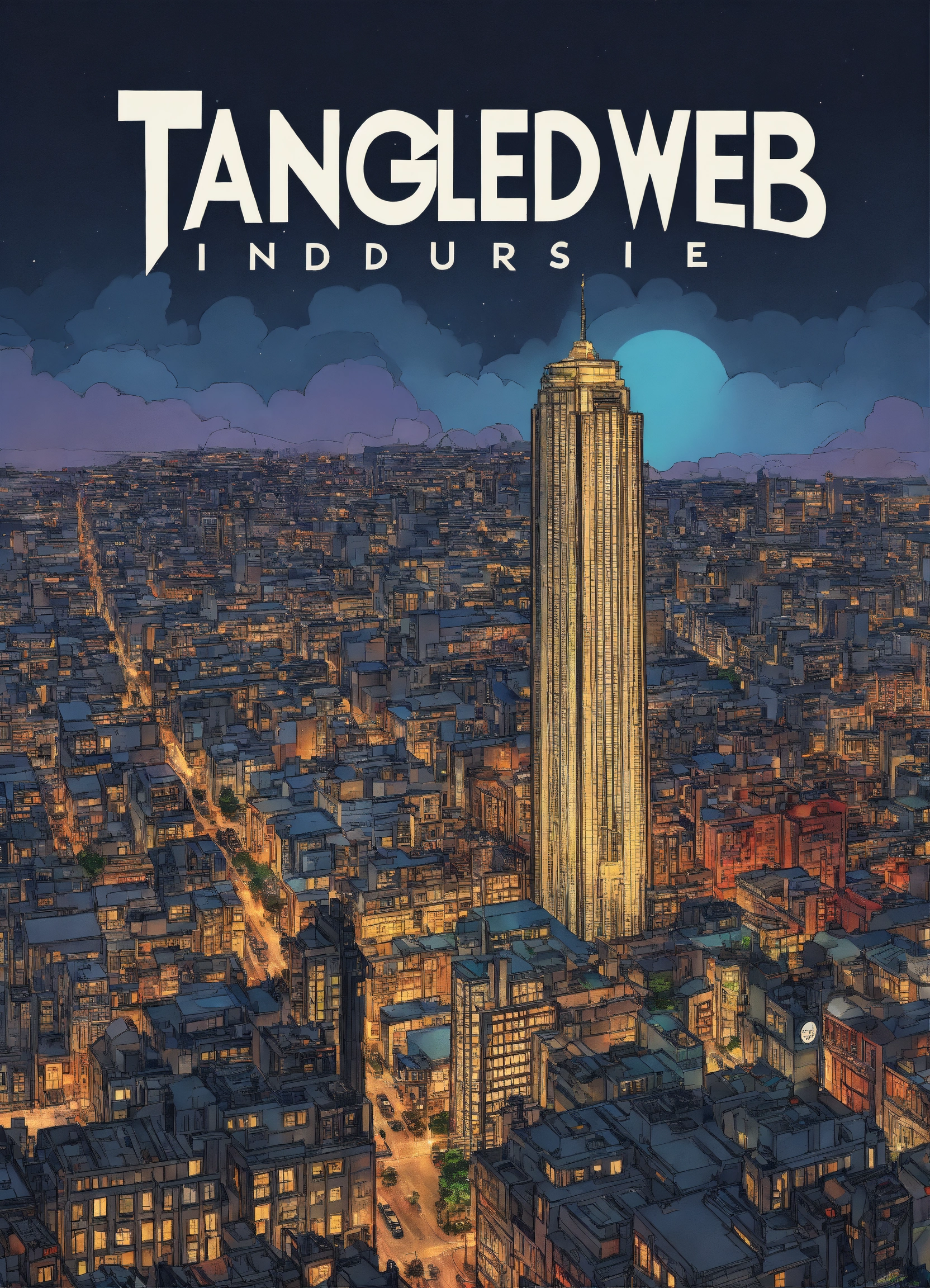 A large skyscraper with a sign that says "tangled web industries" in the middle of an overview of an modern city at night drawn in the style of classic dc comics