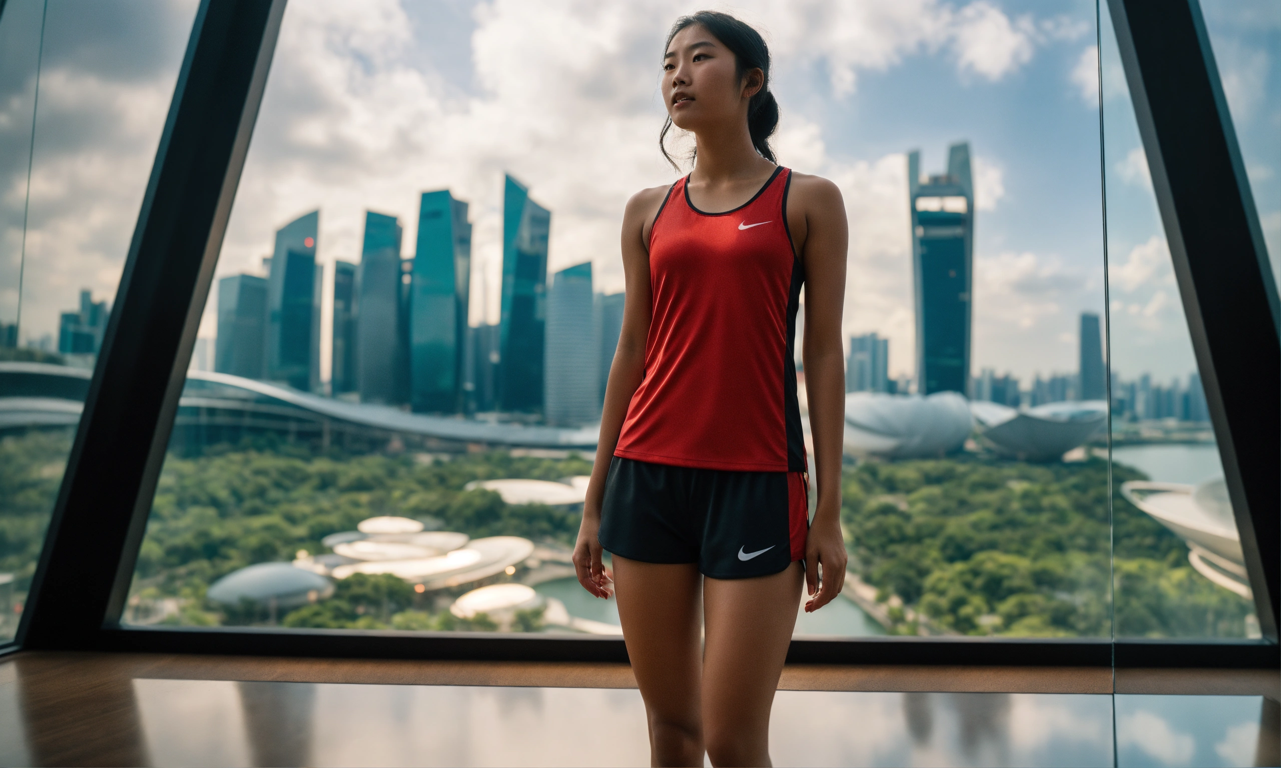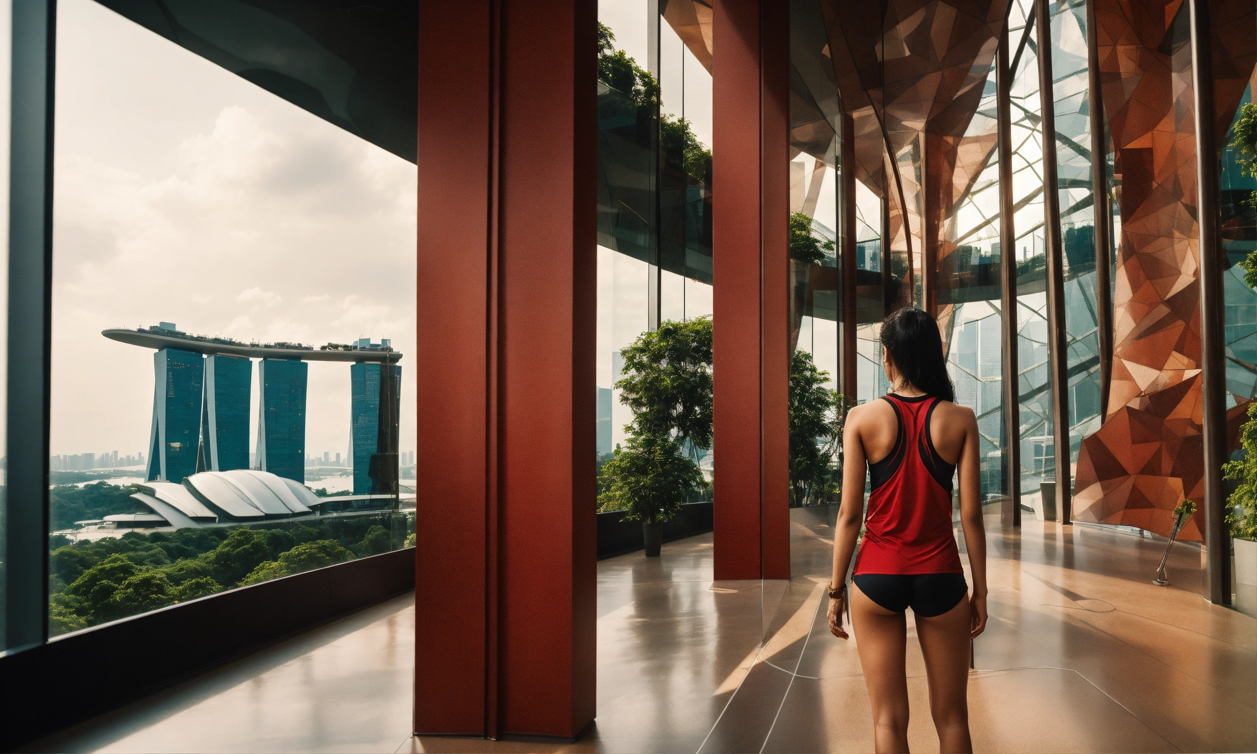 Ultra-realistic back medium shot of a tanned 18-year old asian female athlete, surprise expression, plain red singlet, black shorts, confident stance, in a next-gen museum in singapore, looking out of a large pane window atsingapore's cityscape or central business district with super trees and marina bay sands, confident posture, sci-fi, modern nostalgia, breathtaking, highly detailed, cinematic, 70mm camera, portra 800 film, film grain, reflections on glossy museum floor