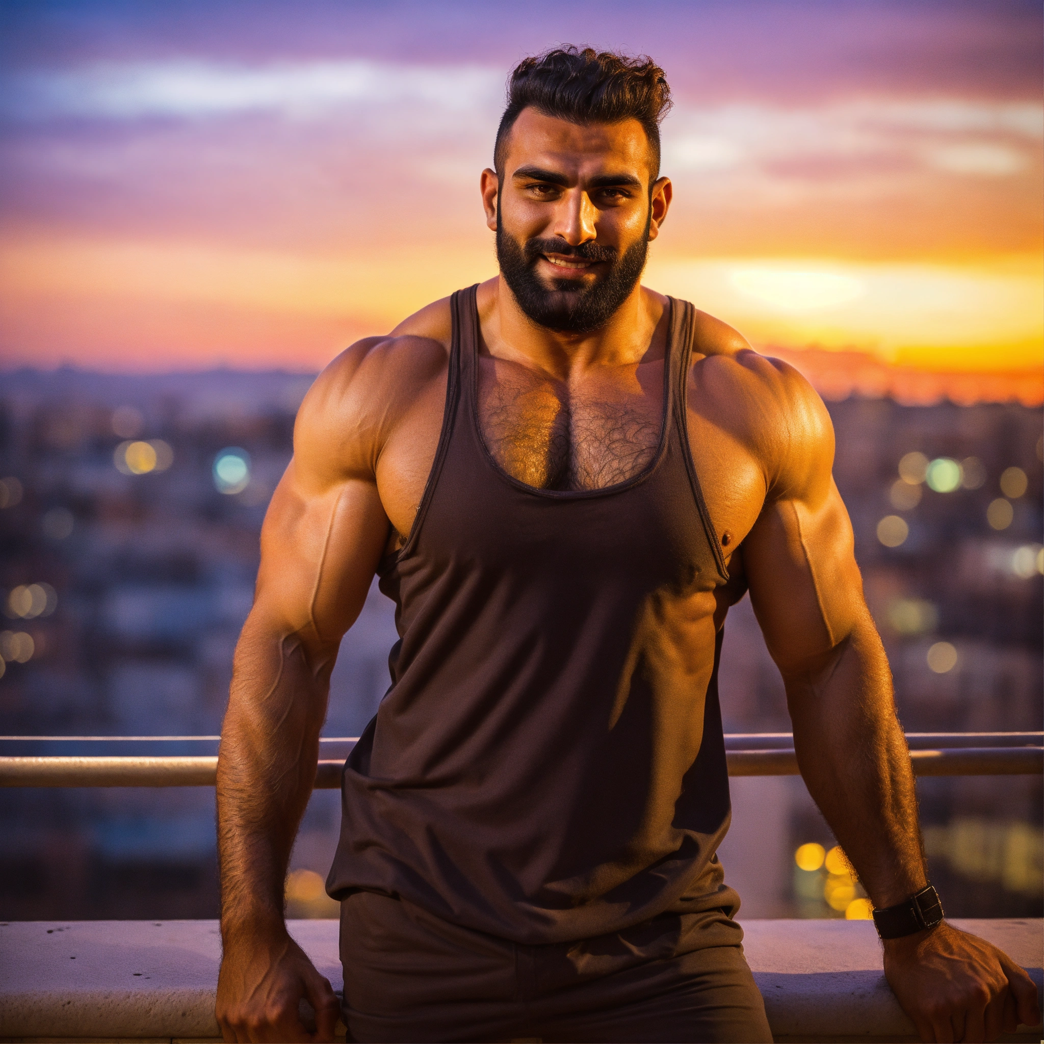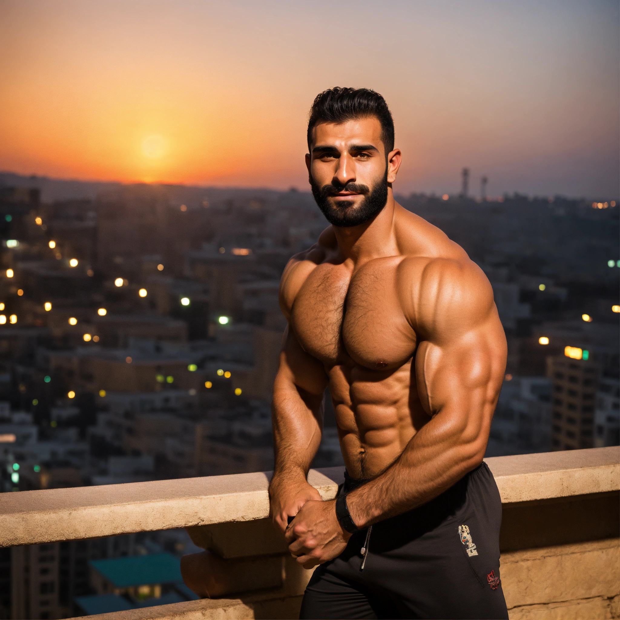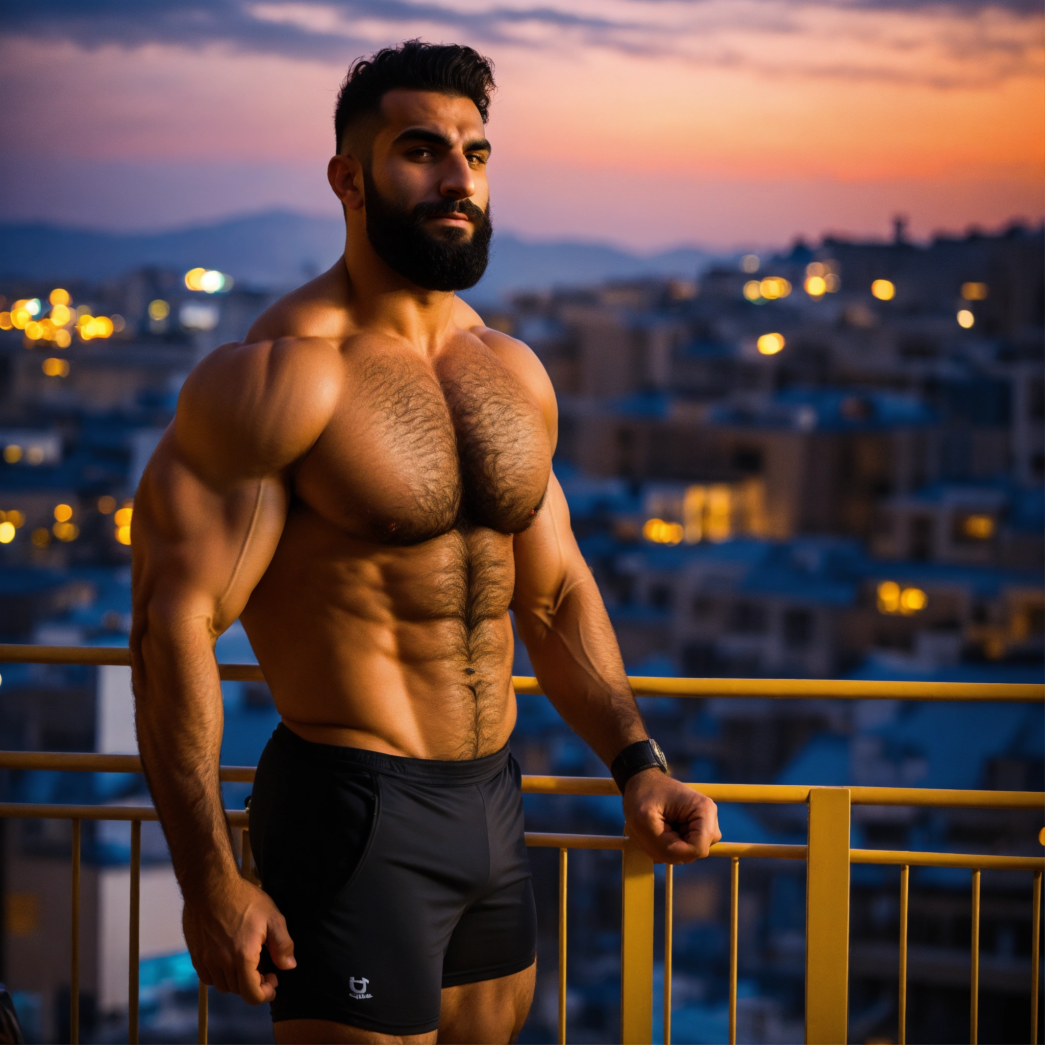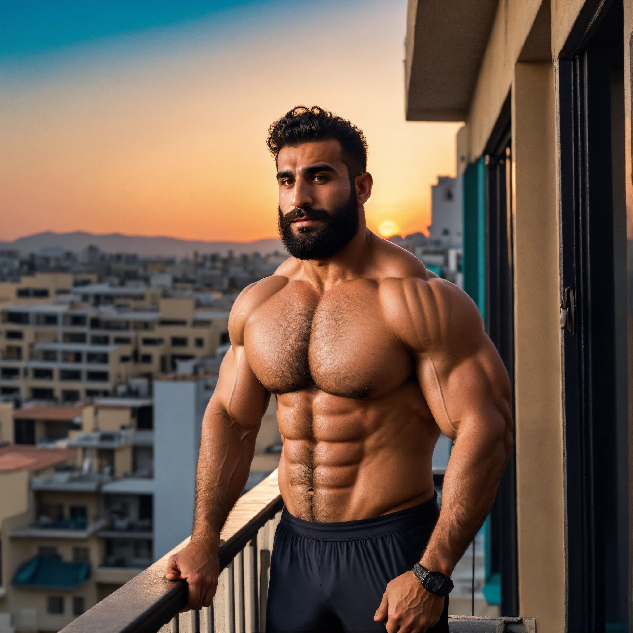 30-year-old hairy lebanese man with big muscles, big bodybuilder, body like a wrestler, on a balcony at sunset