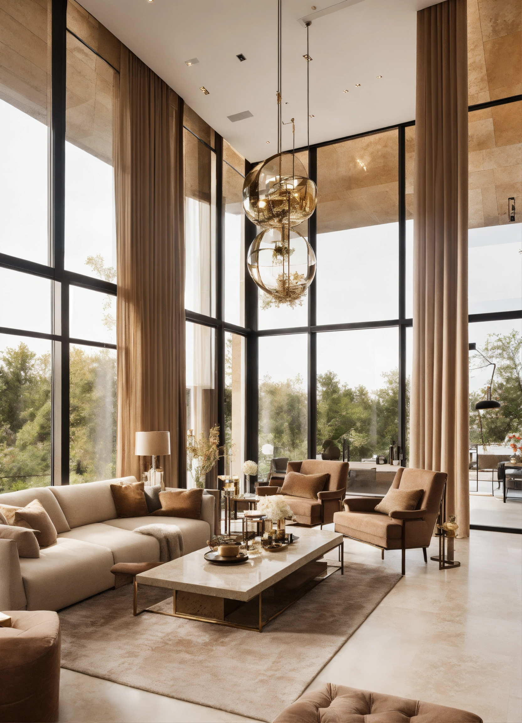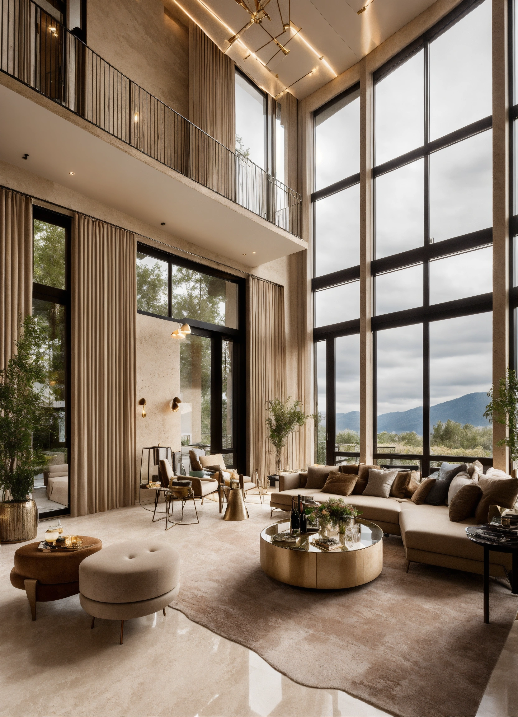 An open concept living space interior design with high ceiling lots of windows. most of the space covered in travertine. this space is a warm, modern style used some champagne and bronze colour accessories.