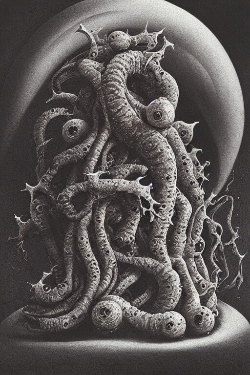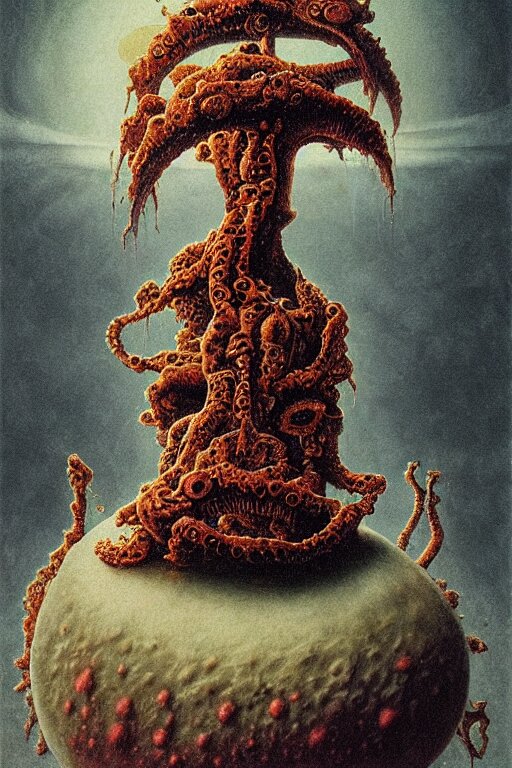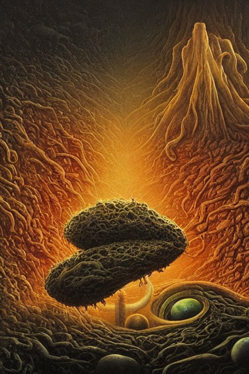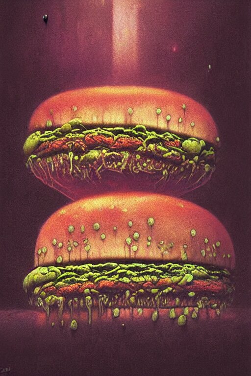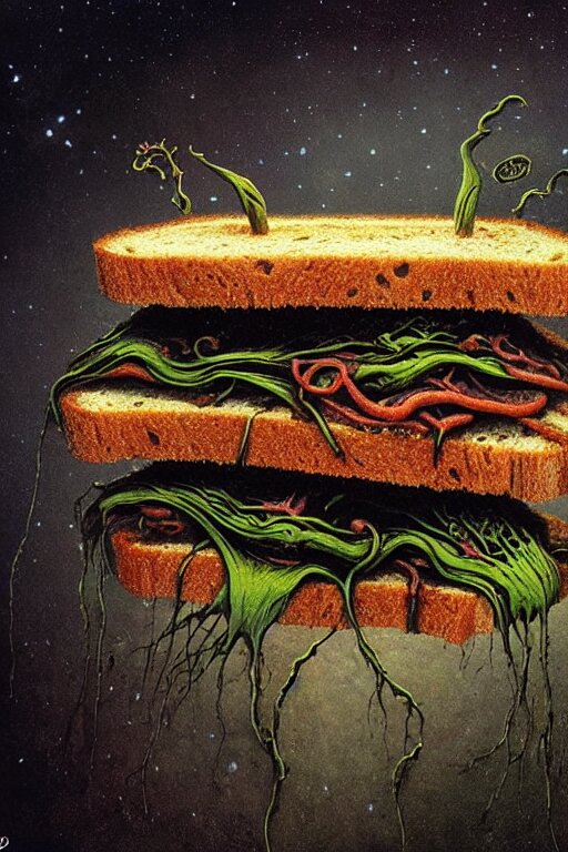 Cosmic horrors on my sandwich, close up of sandwich, by zdzislaw beksinski, by dariusz zawadzki, by john jude palencar, gothic, surrealism, cosmic horror, lovecraftian, cold hue's, warm tone gradient background, concept art, first person view, scene in dining room, beautiful composition