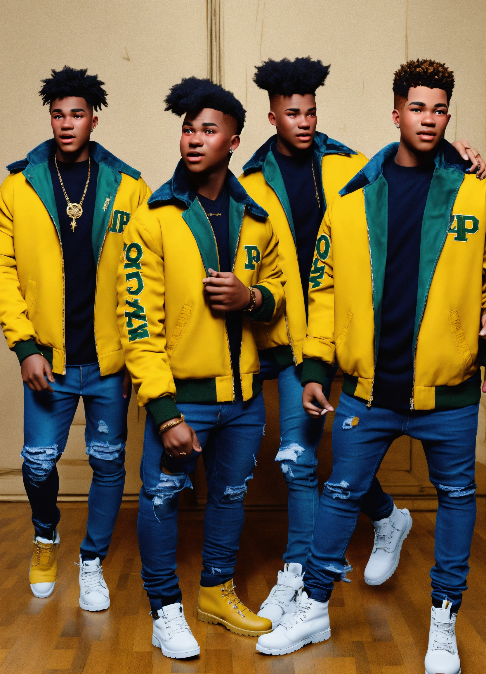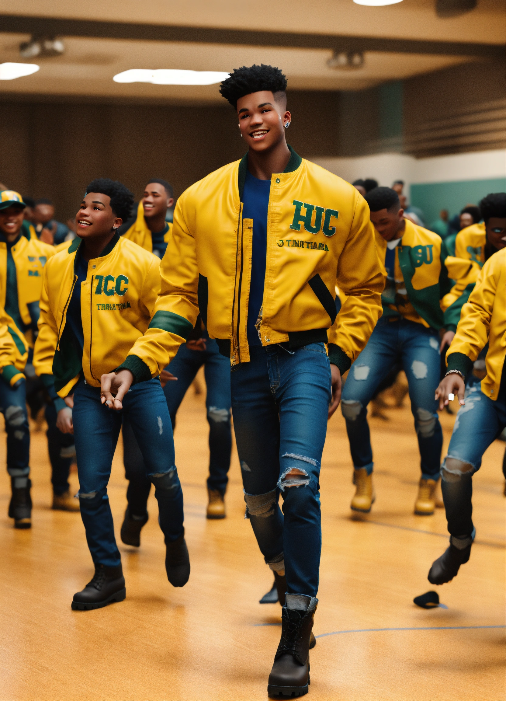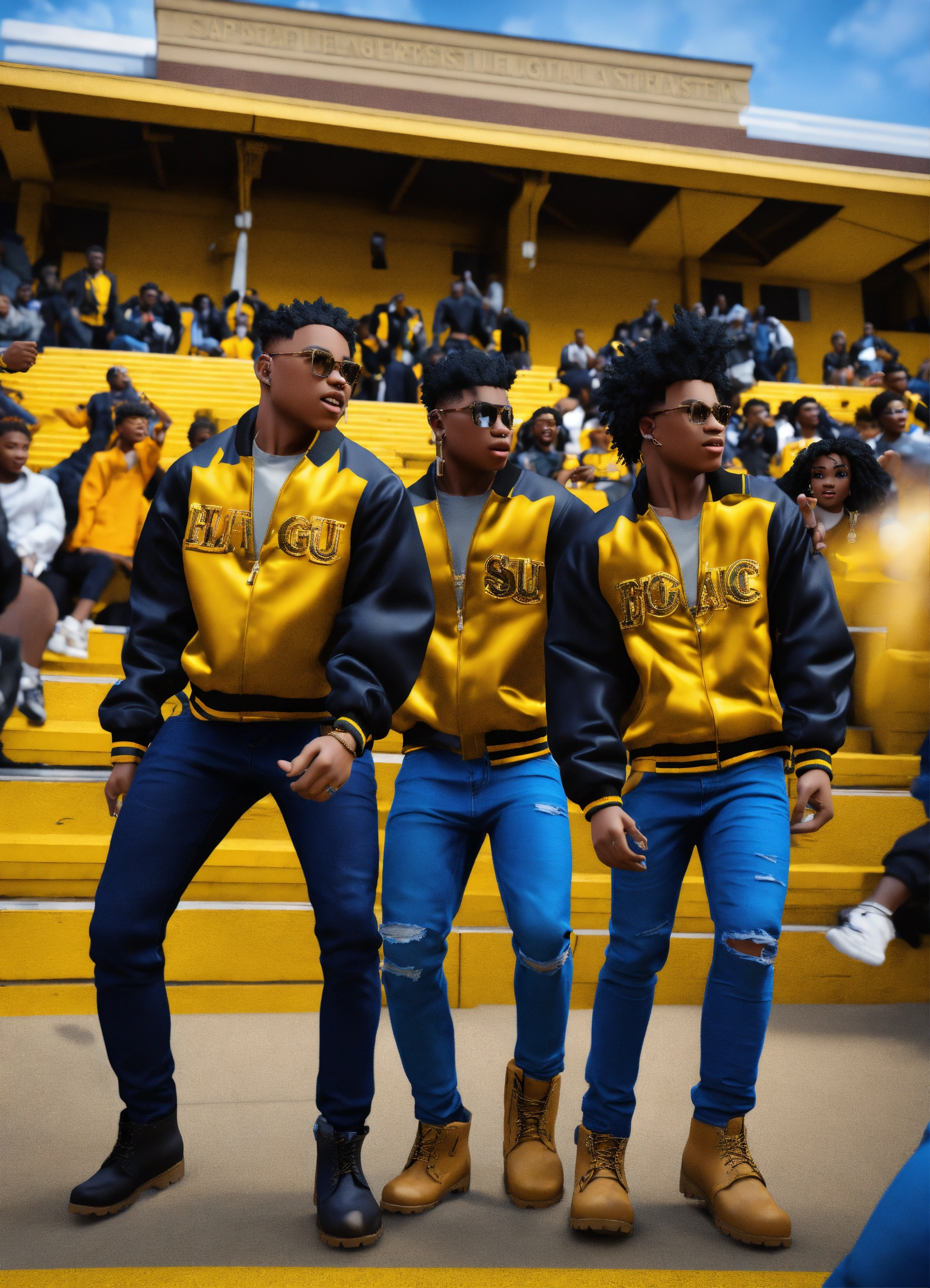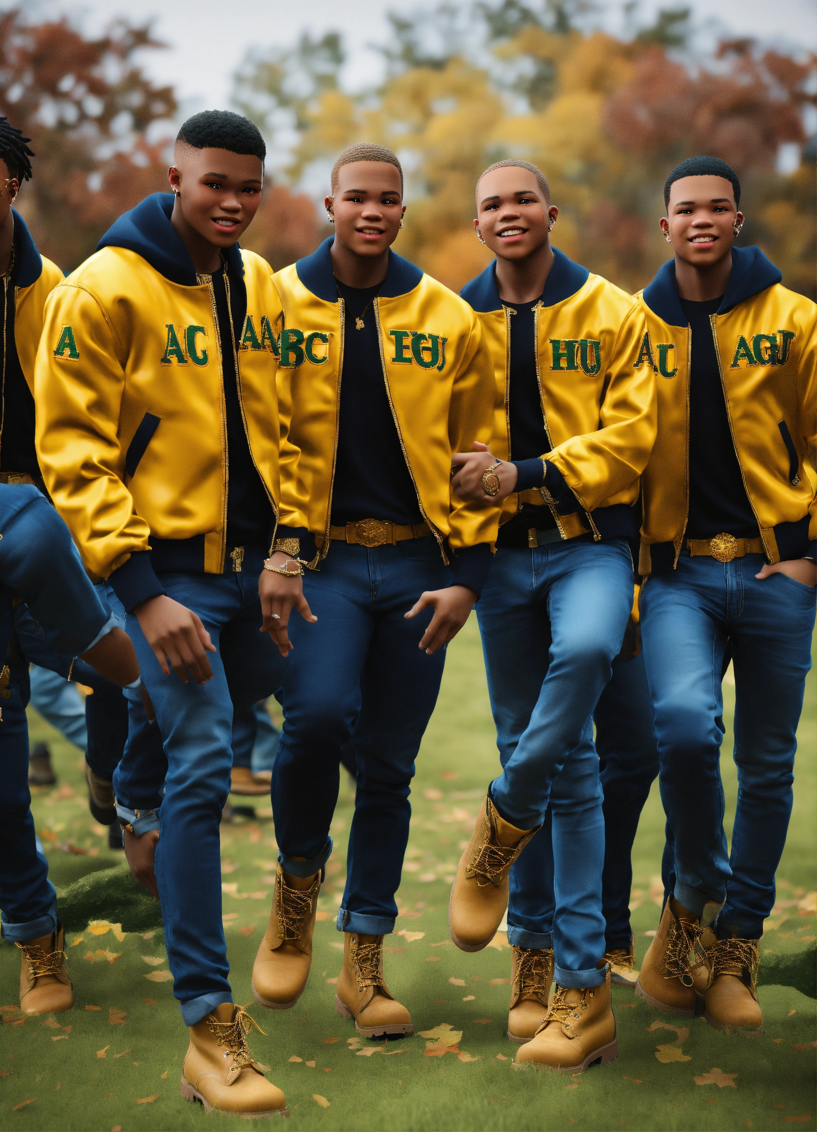 Hbcu at norfolk state in the fall, a diverse group of handsome african american young boys with tapered short haircuts, step dancing at a step show with their black alpha phi alpha jackets, gold shirts, black timberlands, loose blue jeans, 3d animation, 3d render (((no deformation))), (((no extra fingers))), (((no ugly people)))