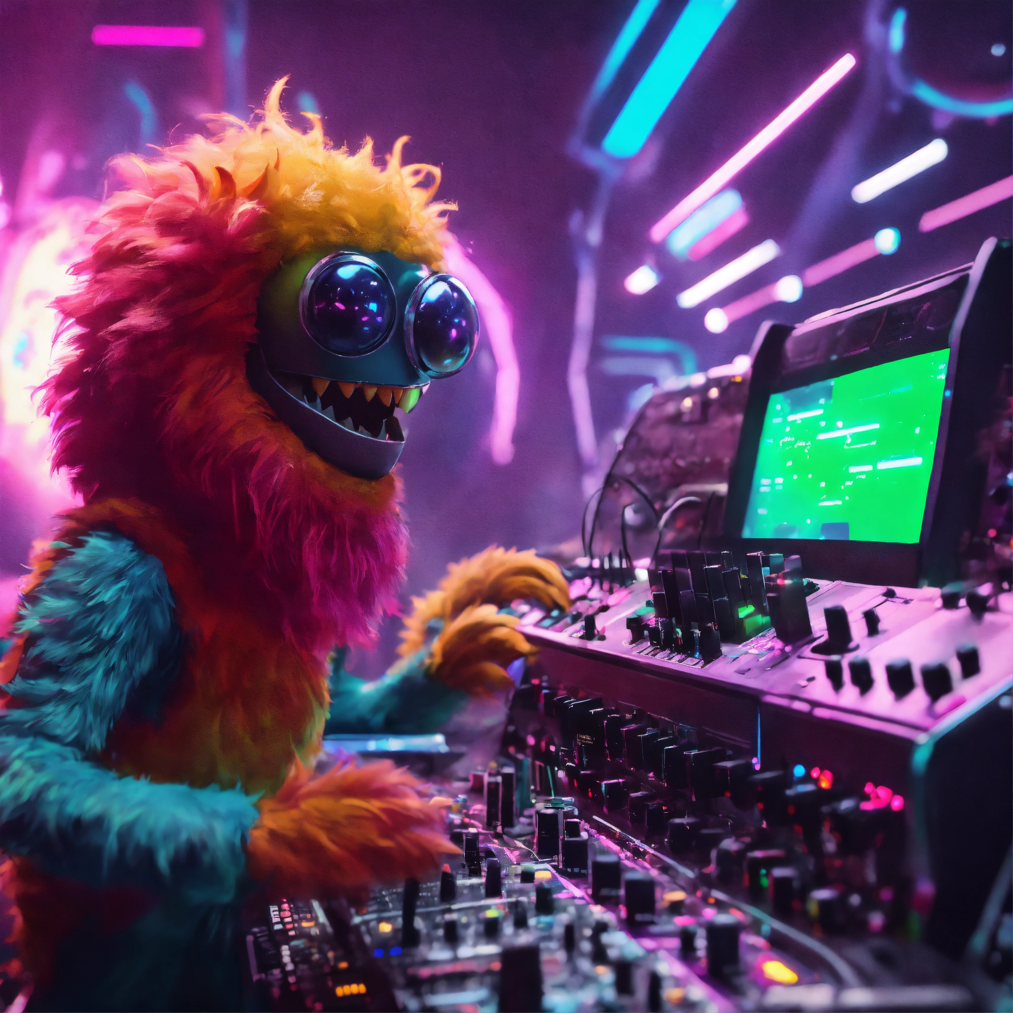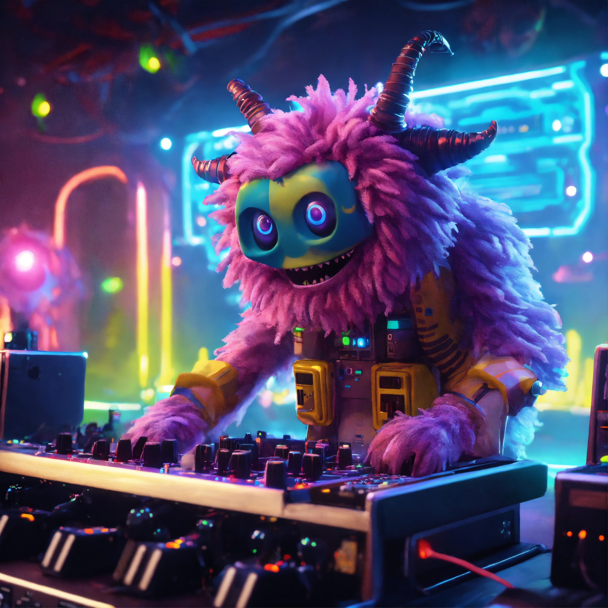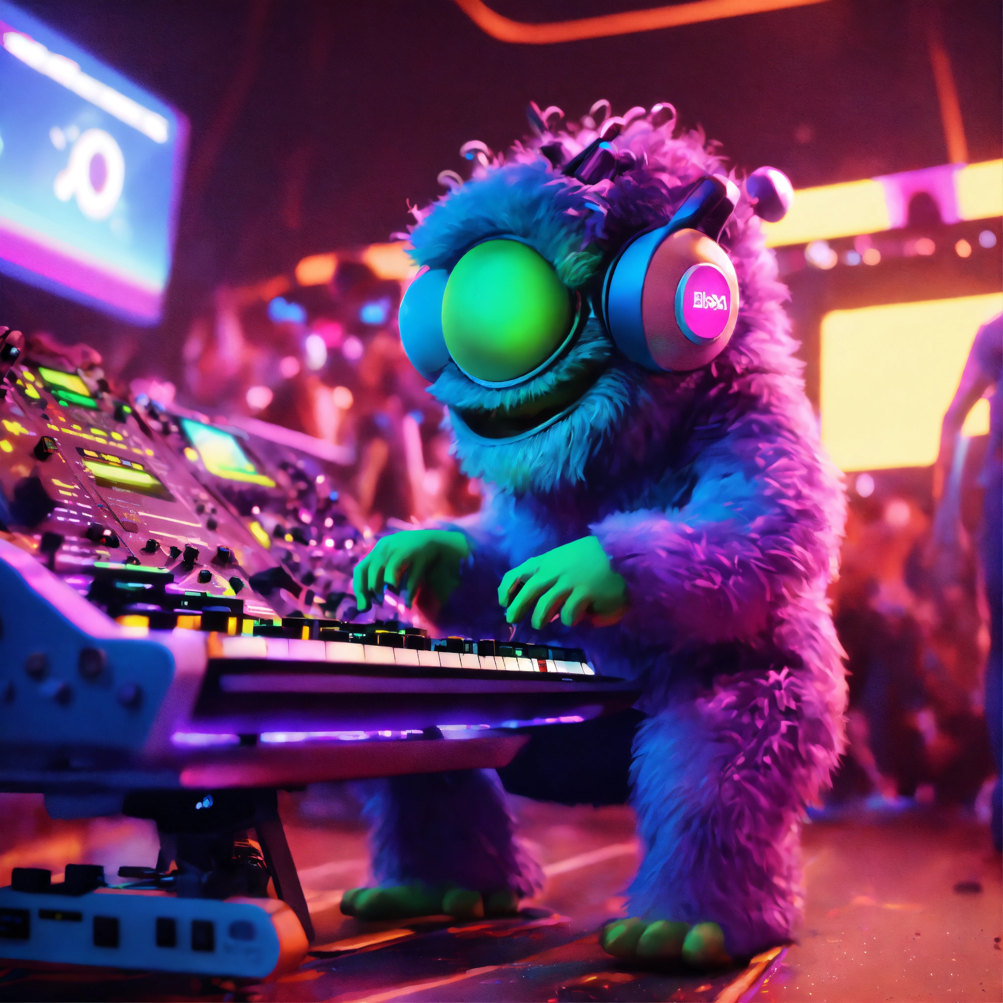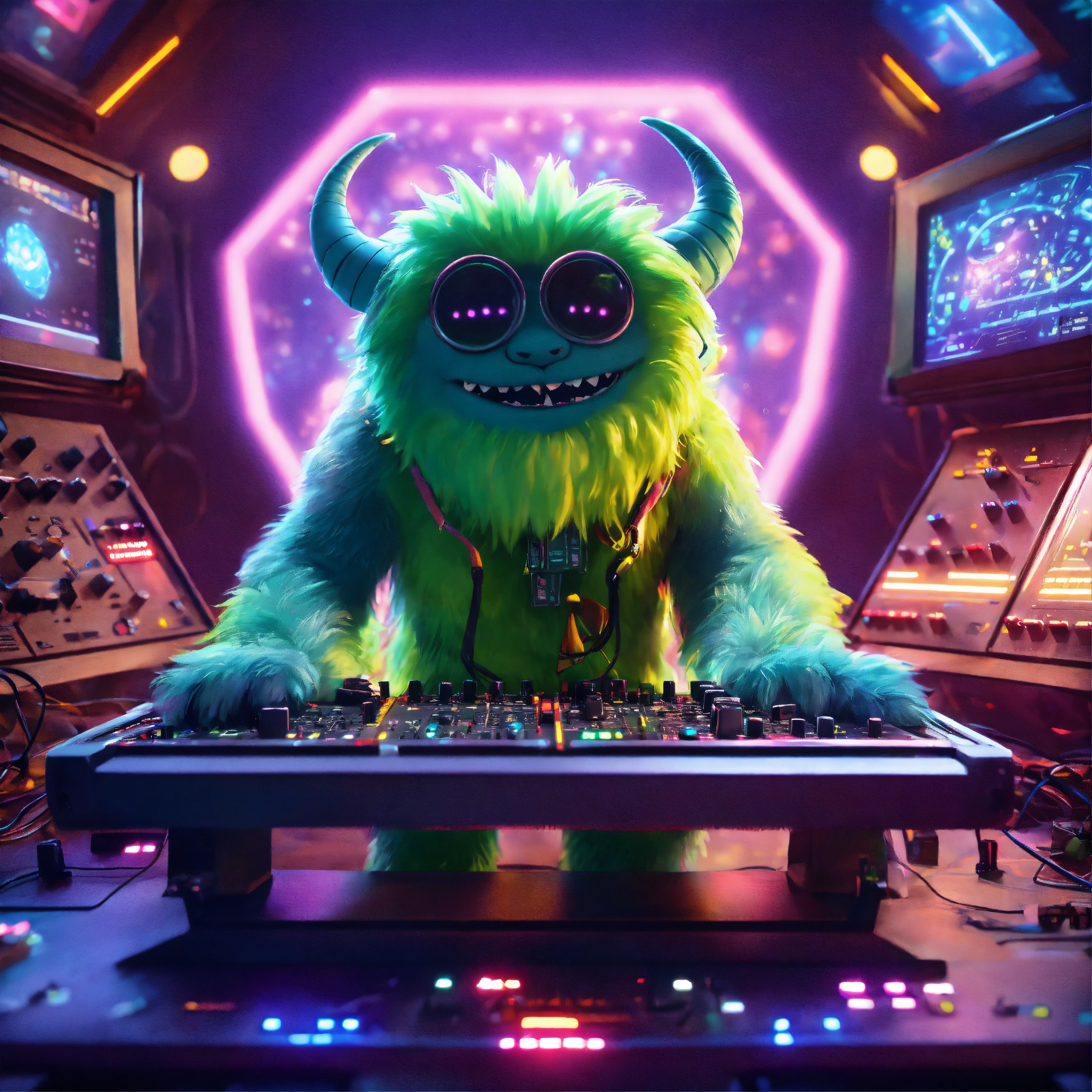 Zoom out fun loving cute hairy monster cartoon character playing a alien modular analog synthesizer at a rave on a spaceship, people from different galaxies dancing and enjoying the music, pixar, unreal engine, 8k.