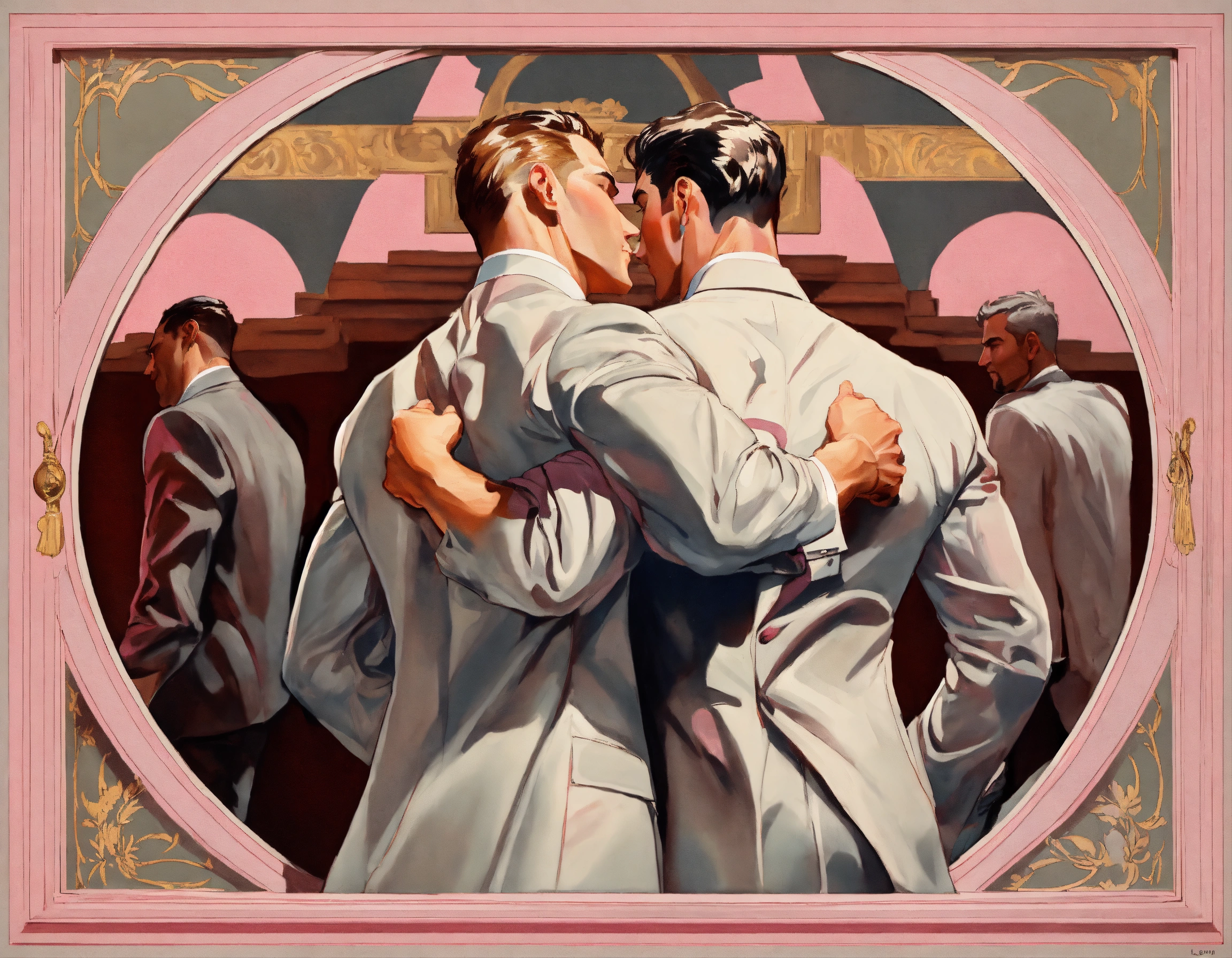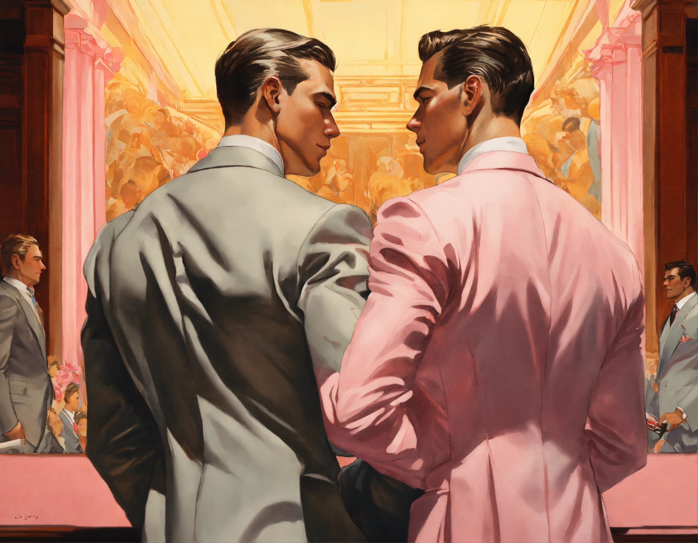 Two muscular sportsmen in light grey suit, pink tie, embracing in a tribune, from behind, leyendecker style