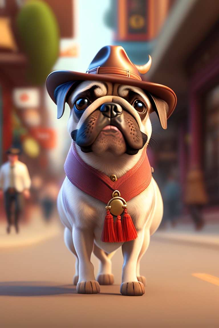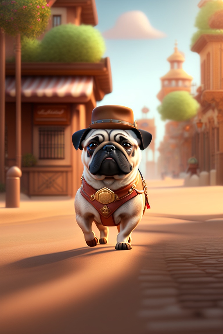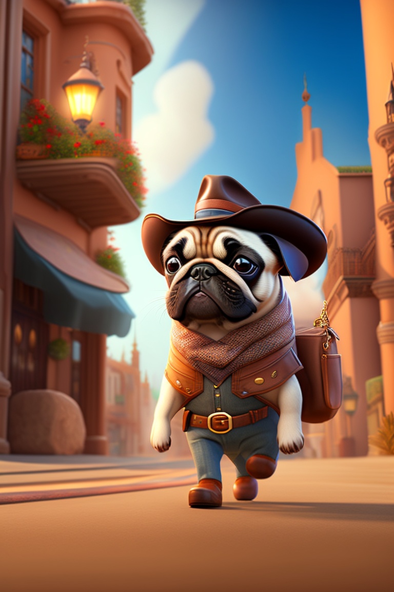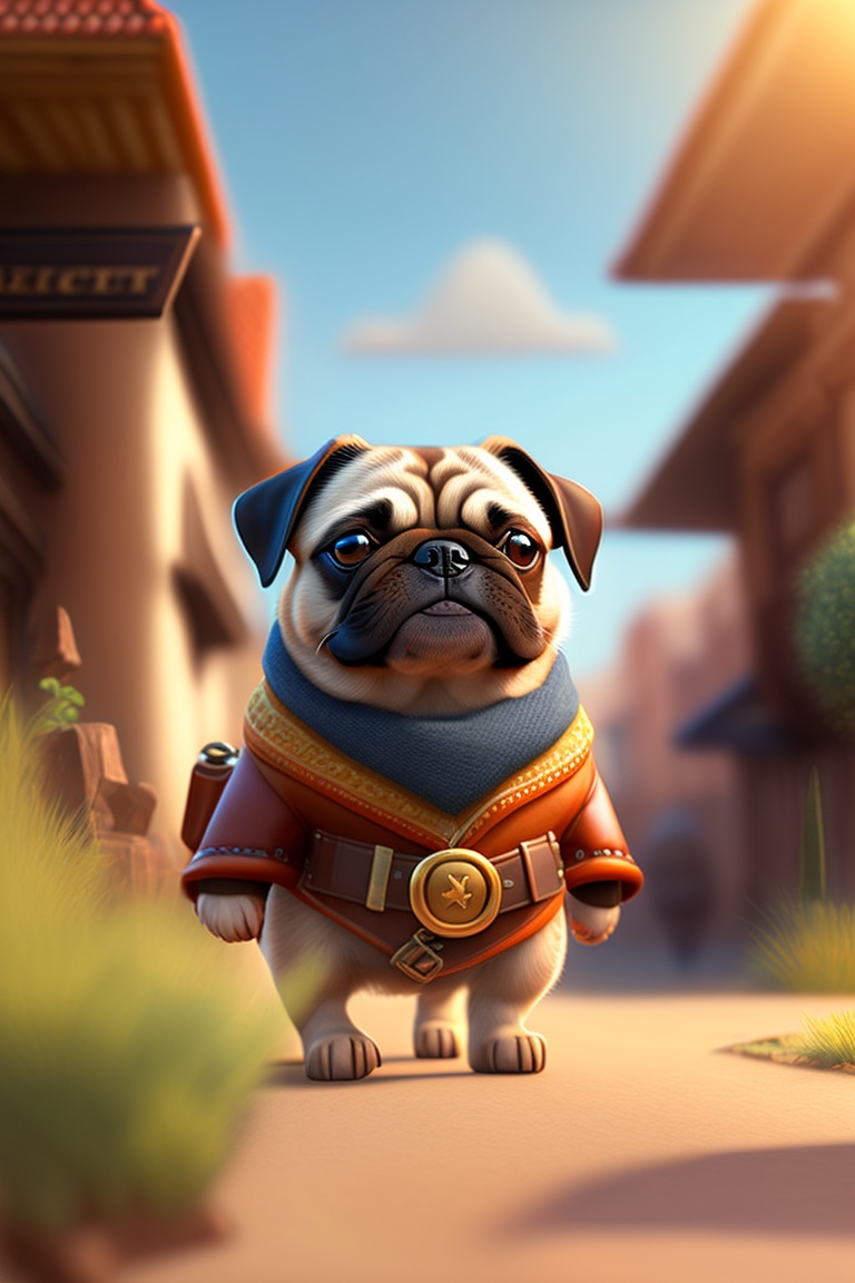 A 3d cartoon pug in the far west, wearing cowboy clothes, walking in a small city, wide angle, pixar and disney animation
