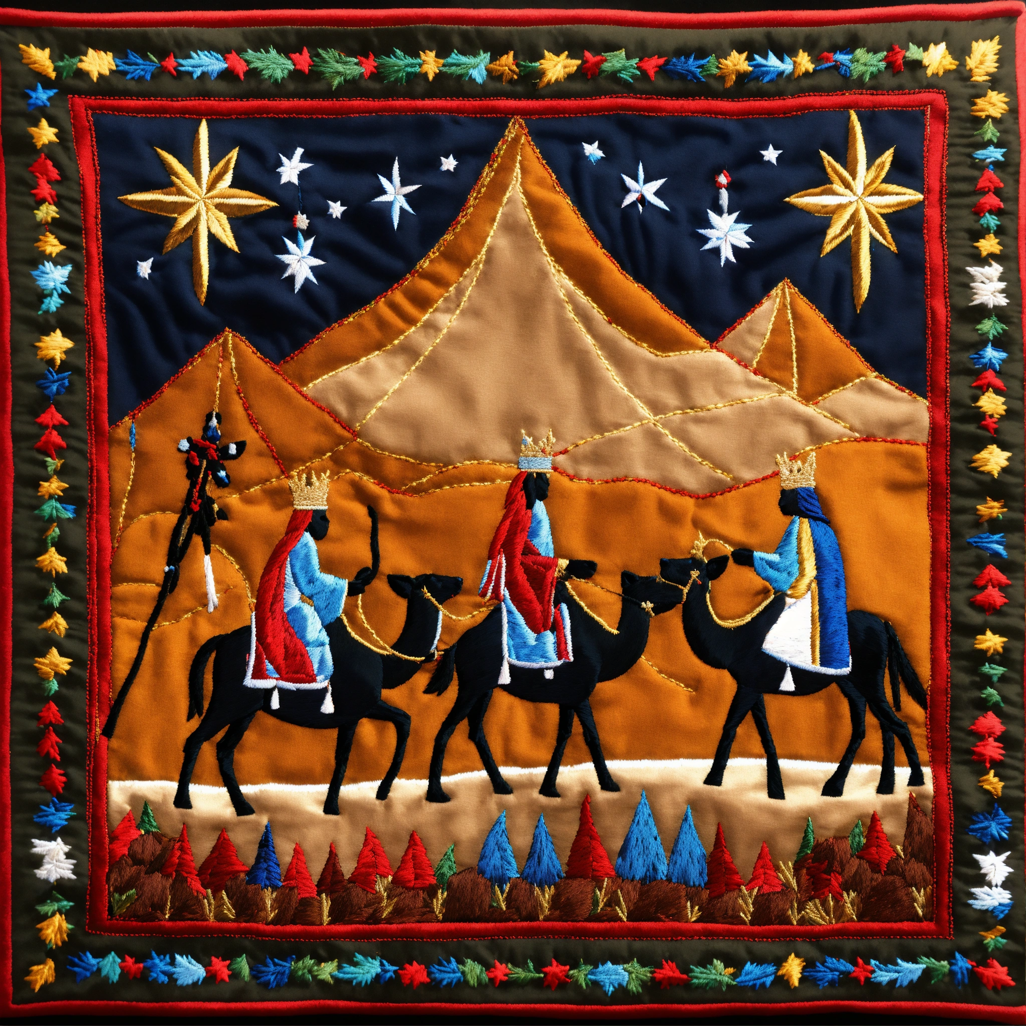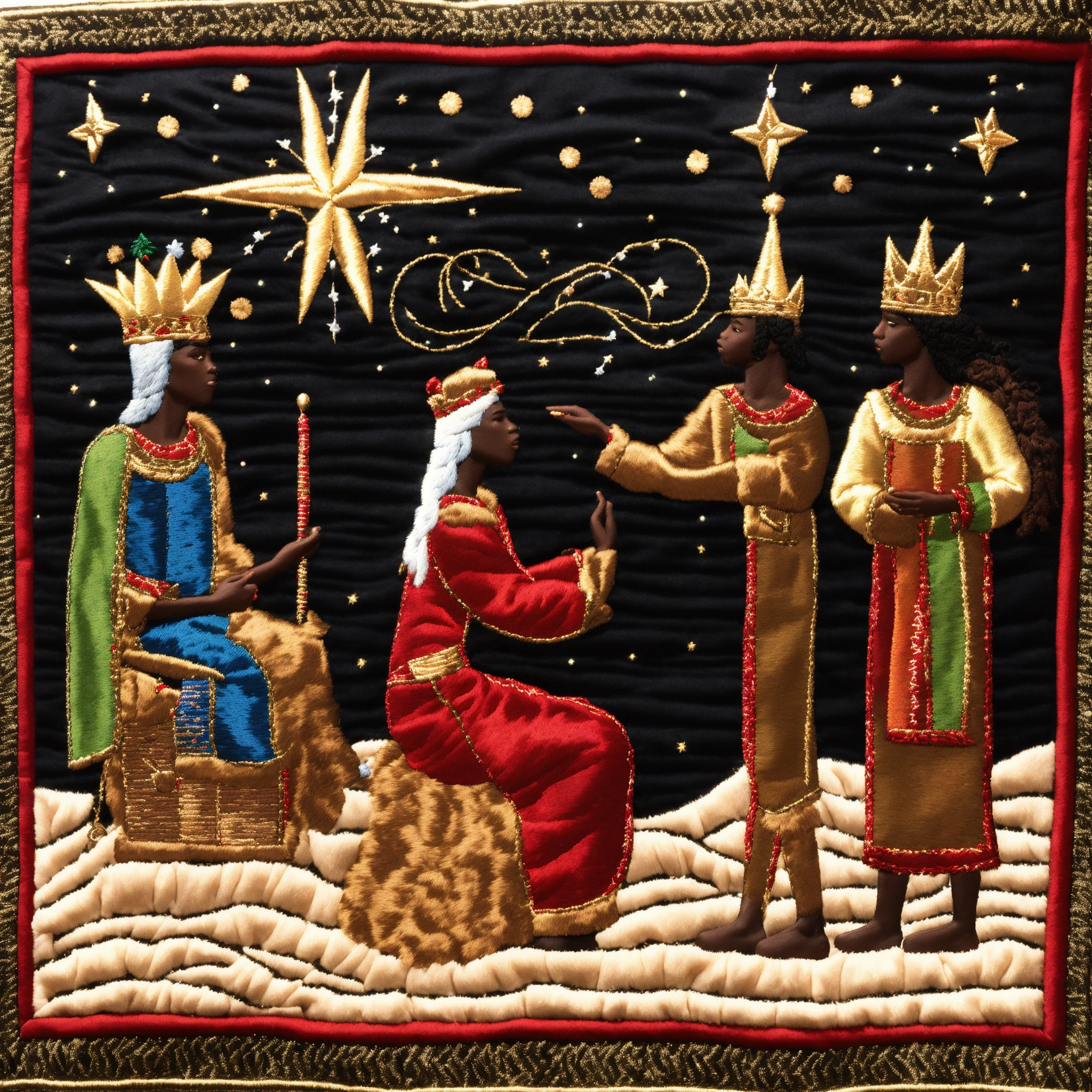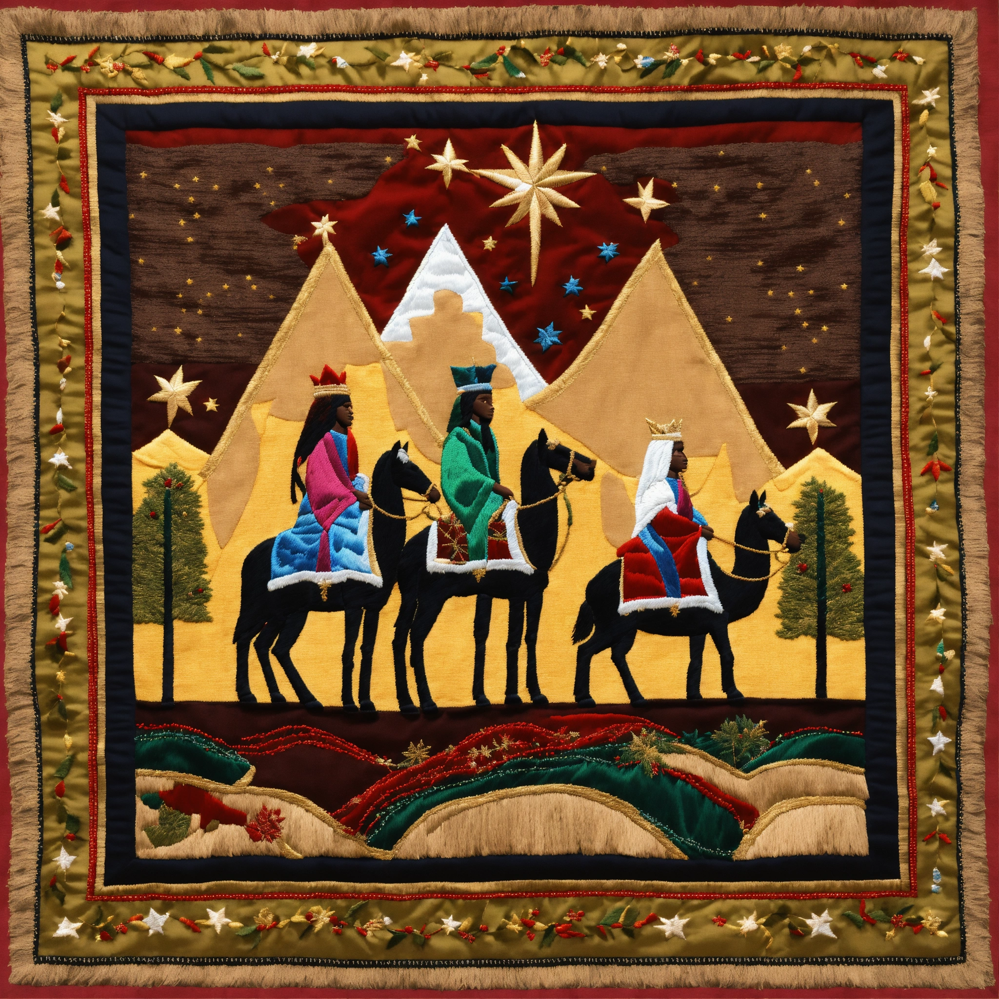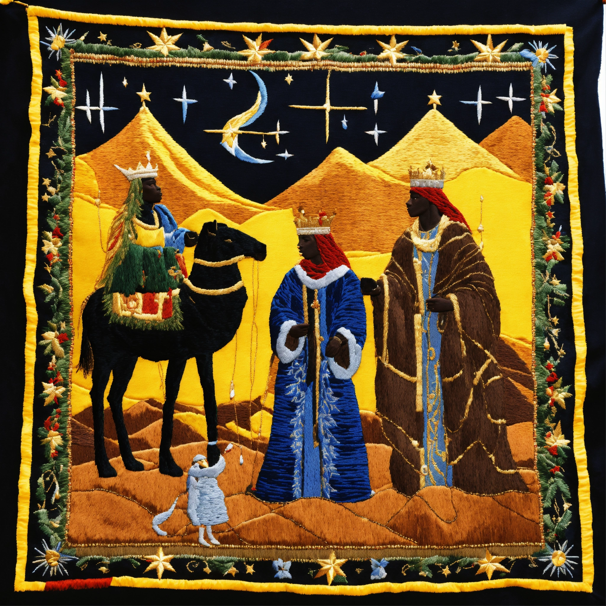 We three kings themed christmas scene, the north star, three african american, desert, distinct embroidery stitched details, dark complexion black american, embroidered tapestry