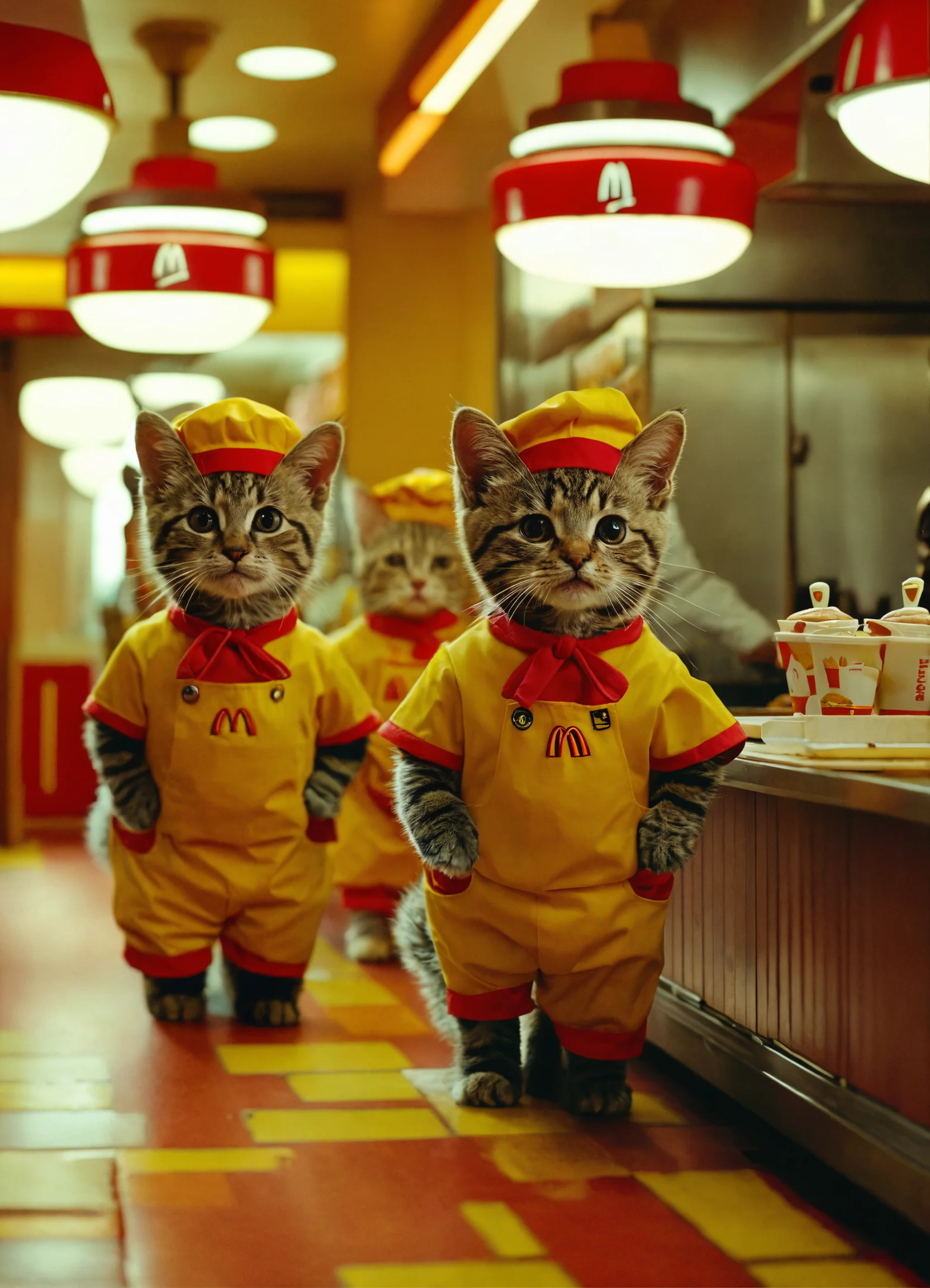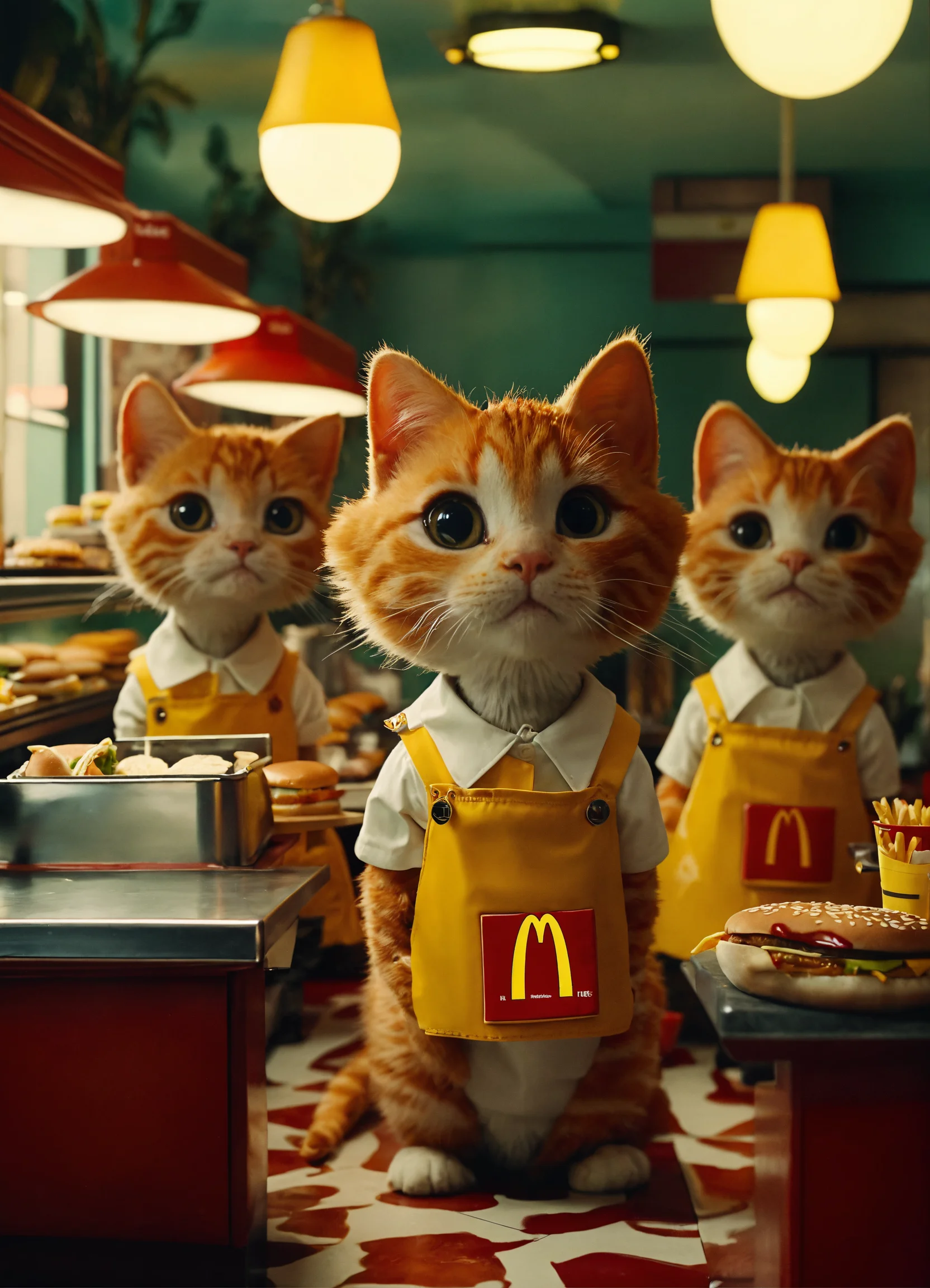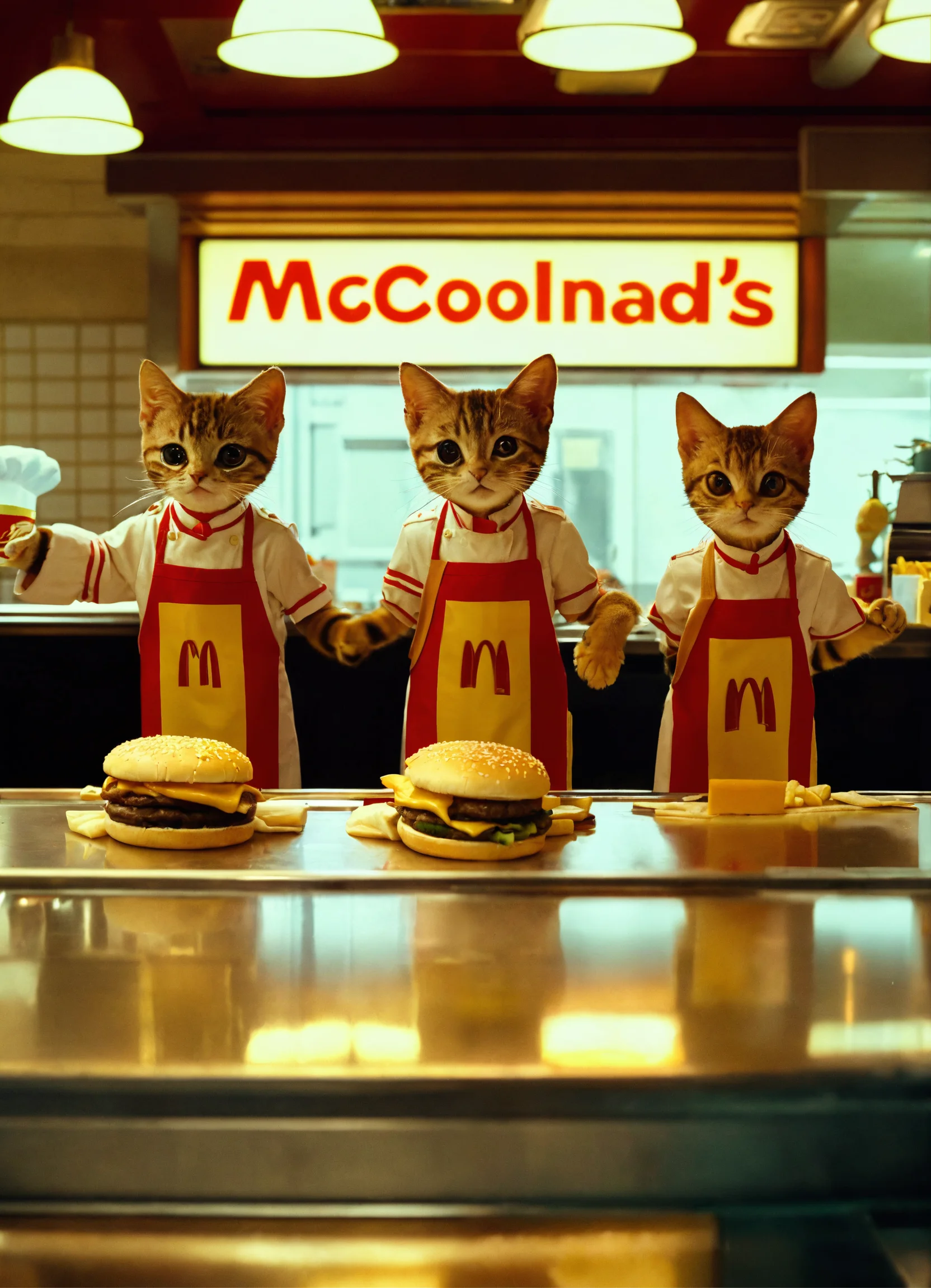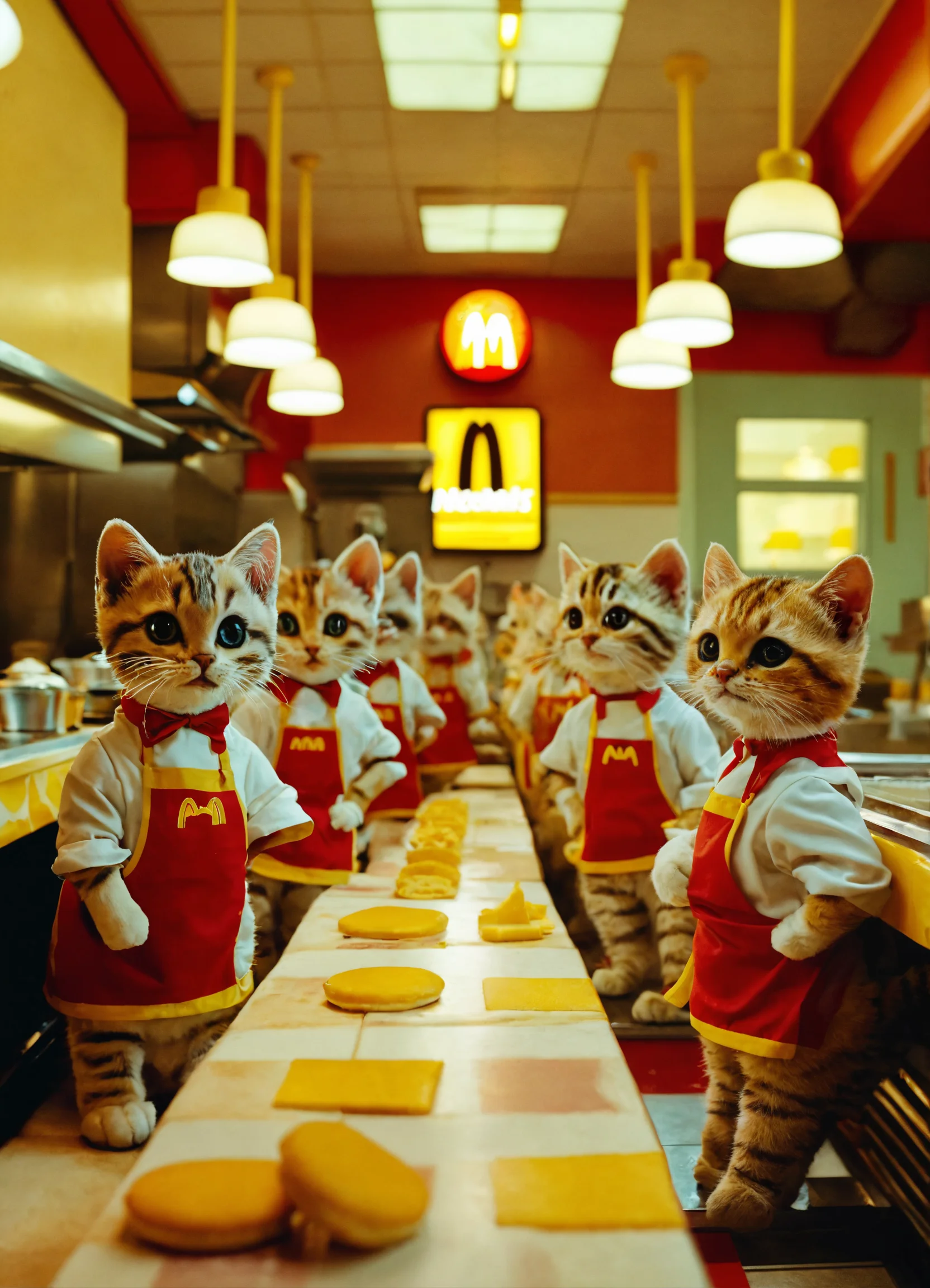 A mcdonald's restaurant interior shot run by anthropomorphic cute little cats wearing mcdonald's chef themed kitchen clothes, making cheeseburgers all in wes anderson cinematography.