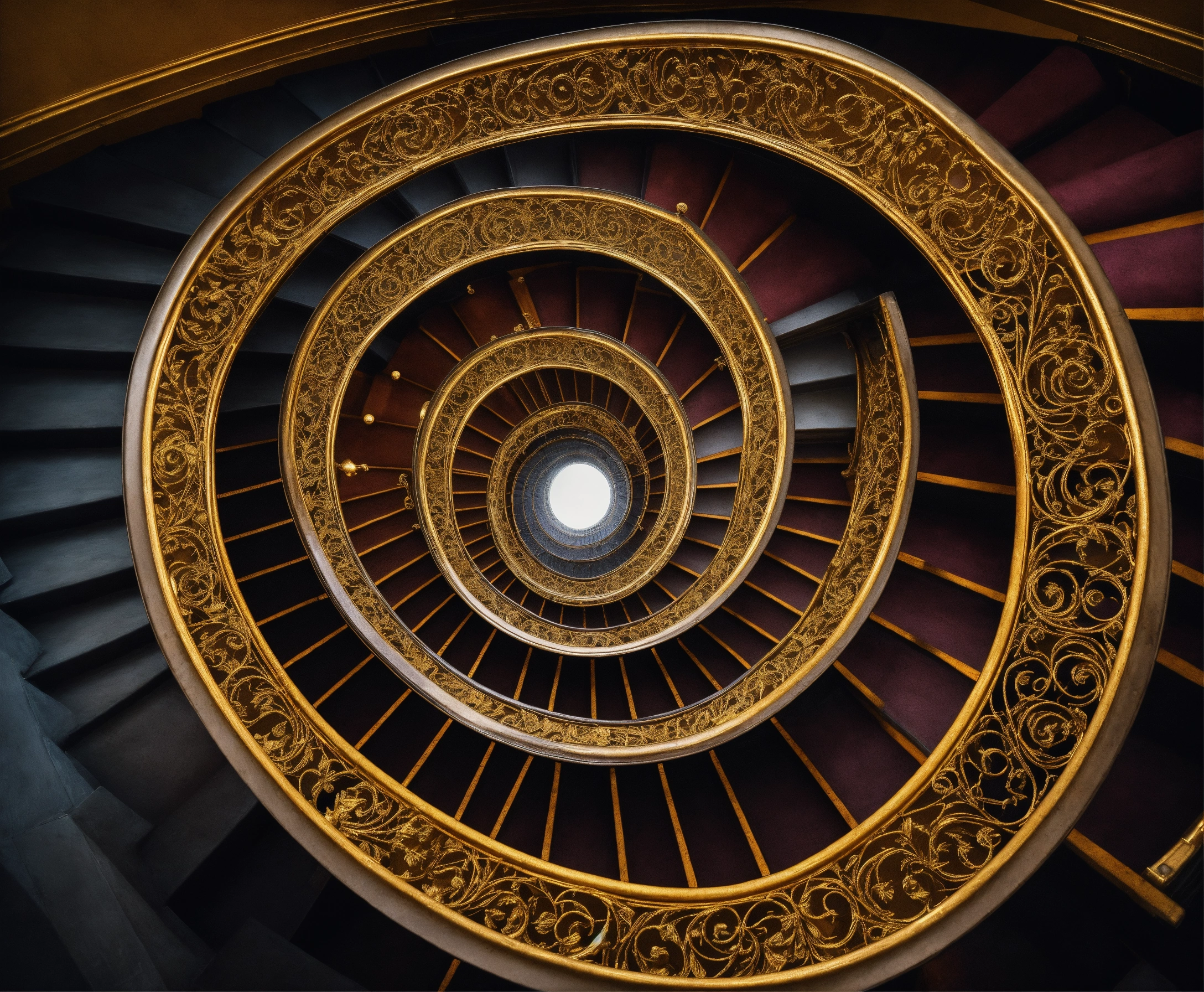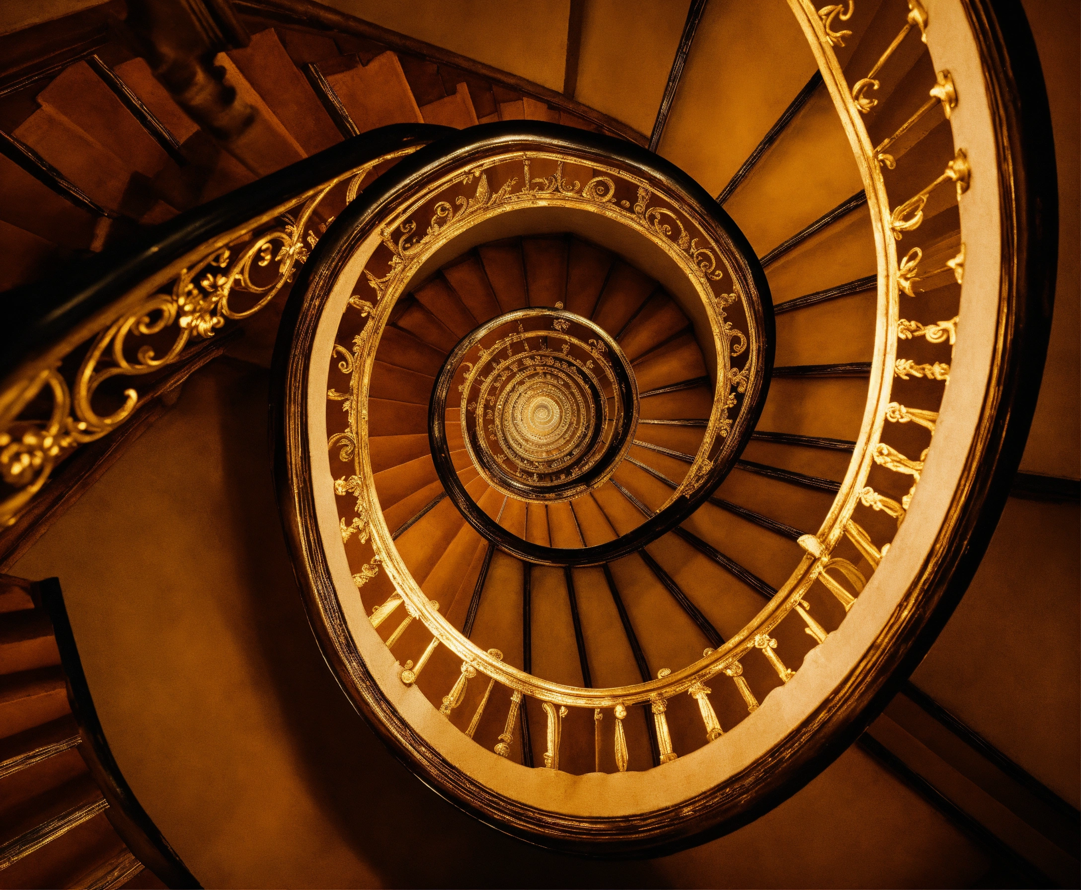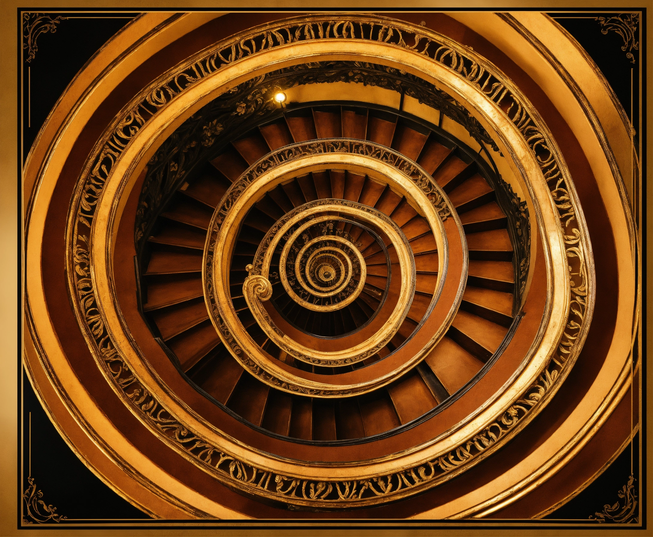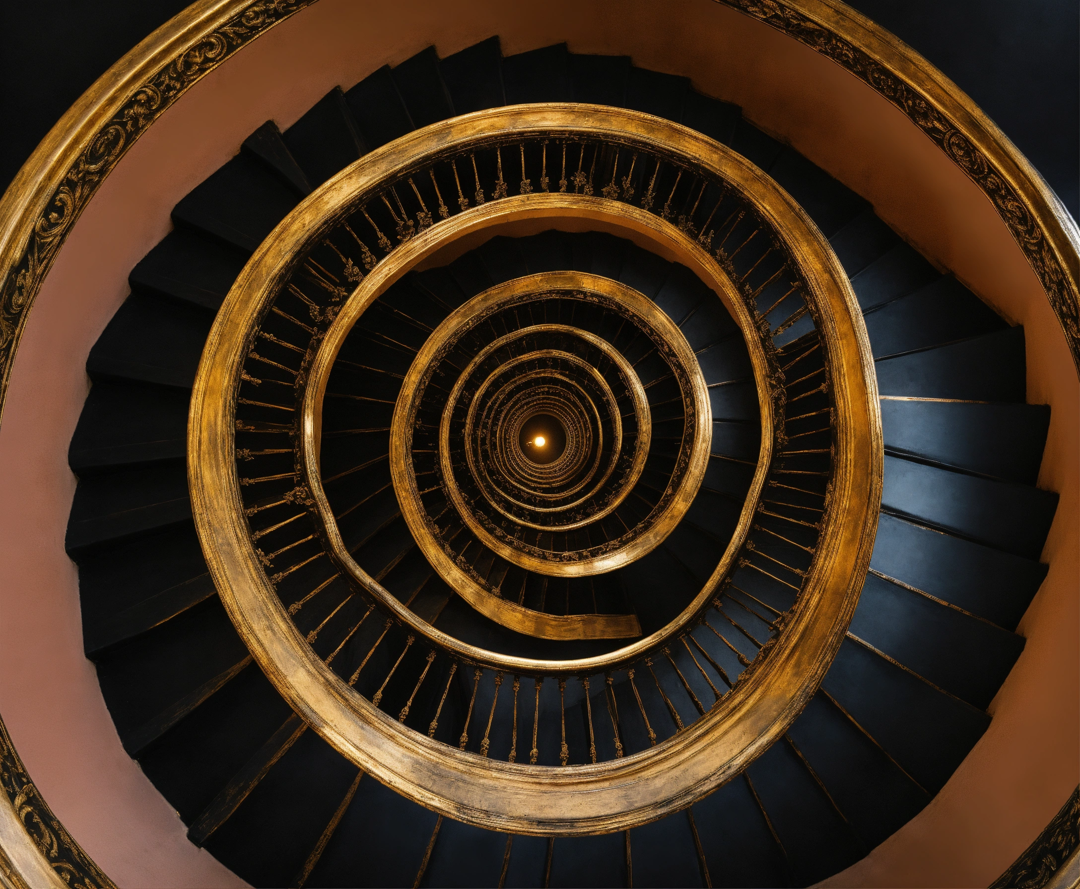 Create a captivating book cover design that conveys the theme of moody, ethereal, mystical. ideally i would like a black background with a golden spiral staircase and/or a golden haze over the staircase. i favor simple, clean lines rather than a highly detailed picture of any of the items. spiral staircase top view, inspired by the book cover design of "down the staircase" by pamela castrucci, spiral stairs top view