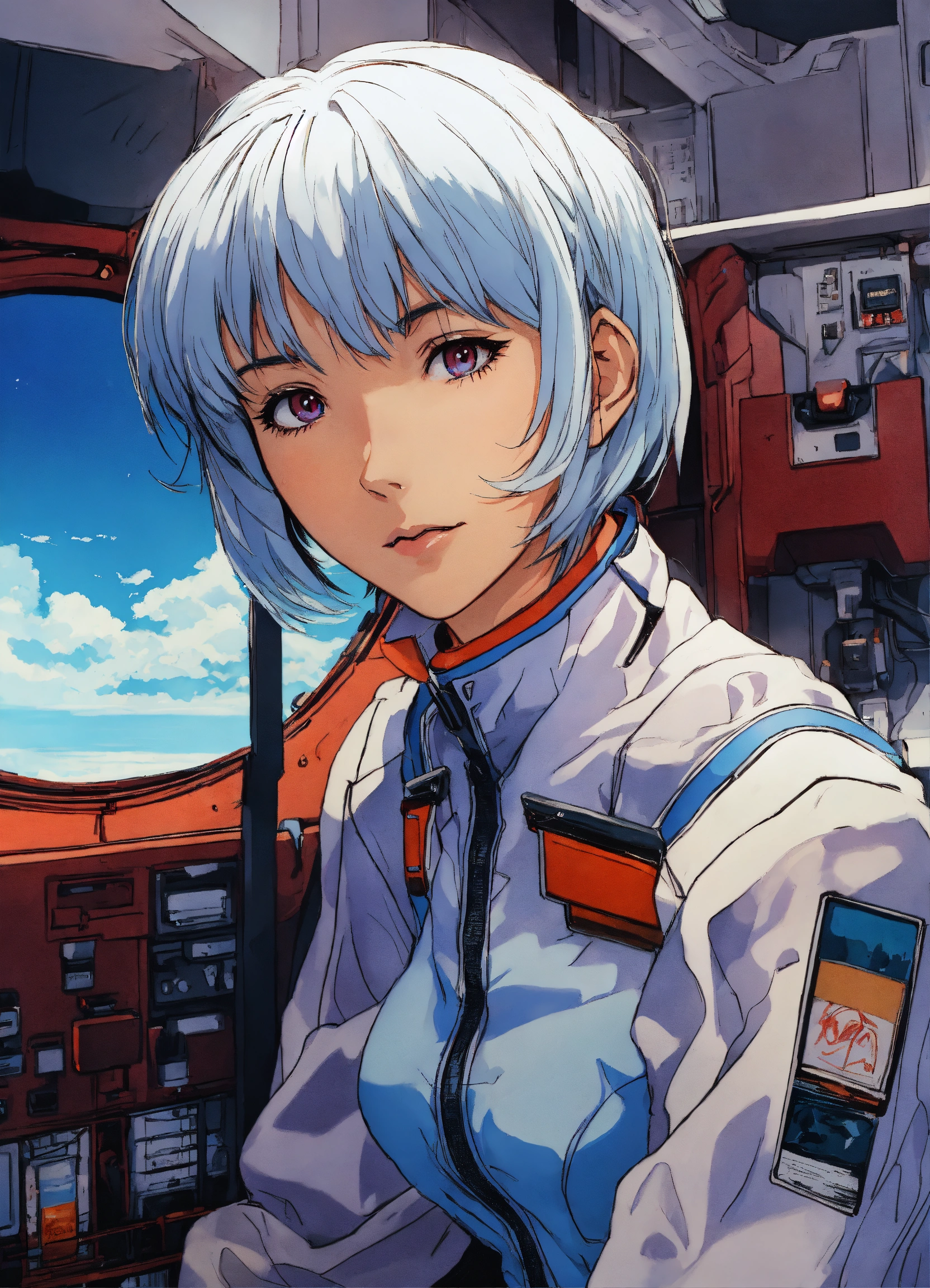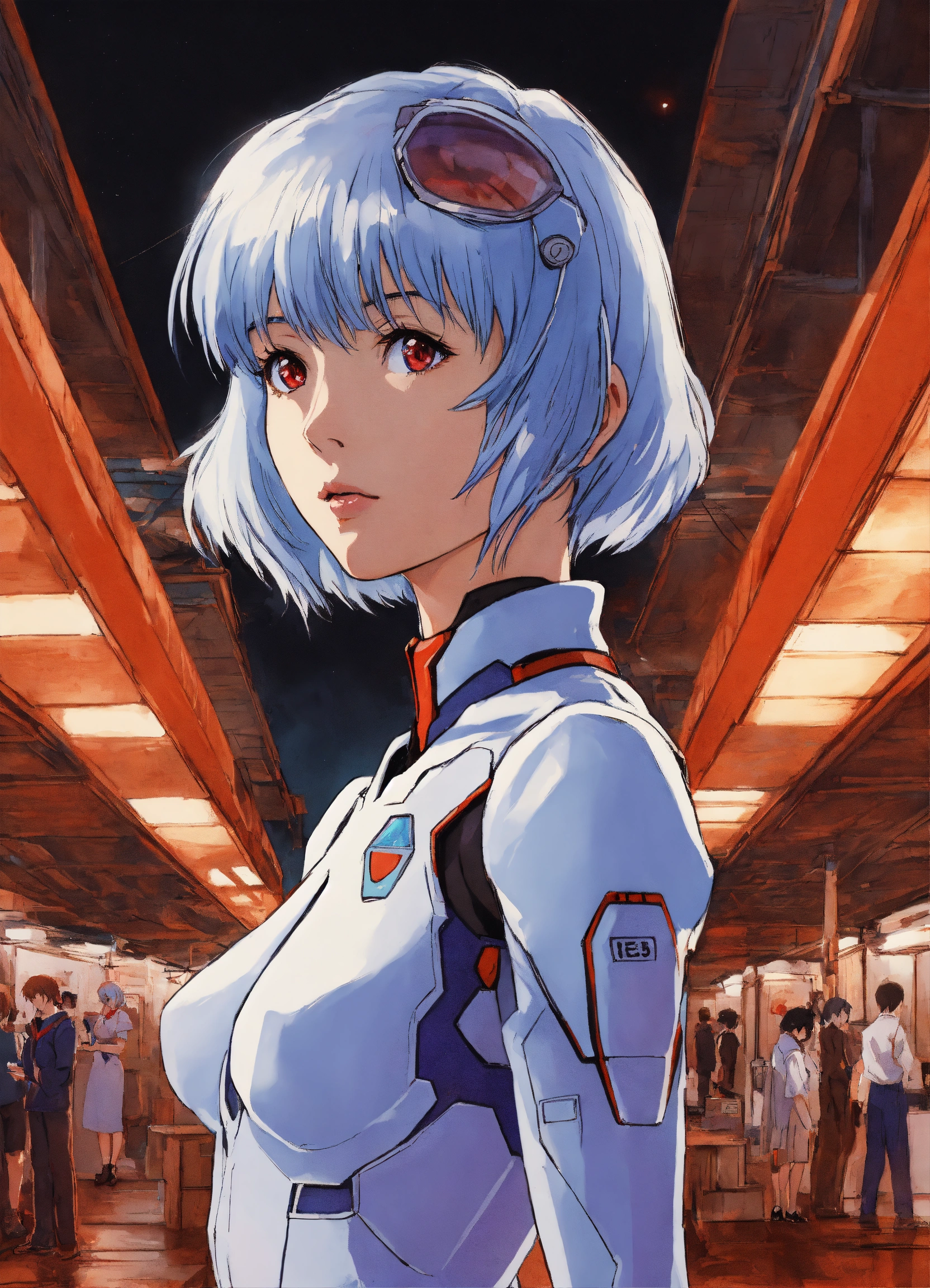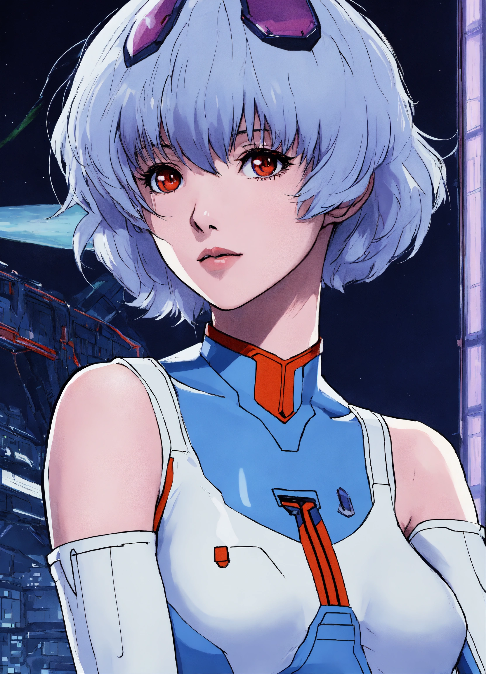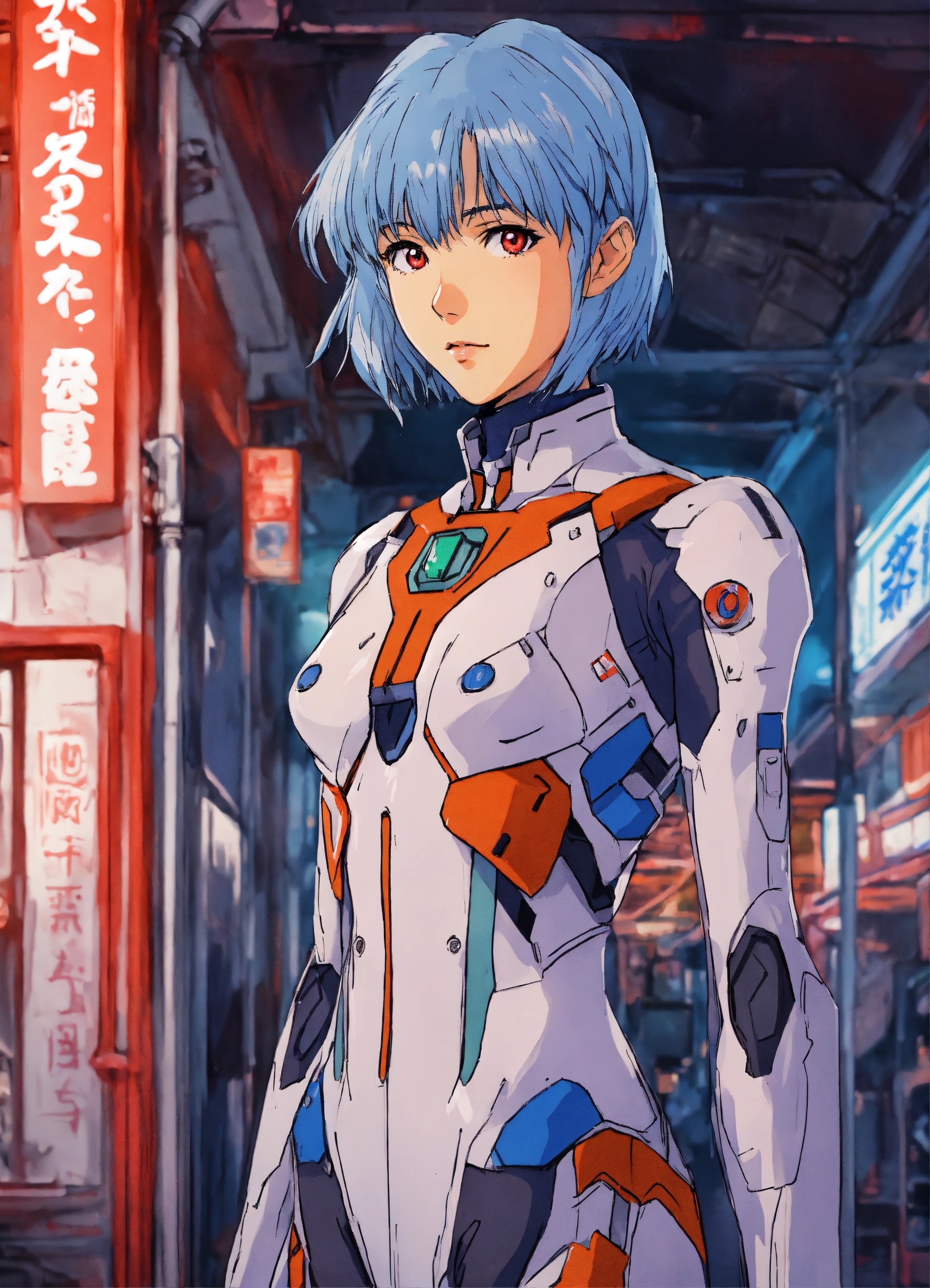 Beautiful anime art of rei ayanami from neon genesis evangelion, detailed scene, stunning details, trending on artstation, ray-traced environment, vintage 90's anime artwork, pen and ink illustration, behance trending