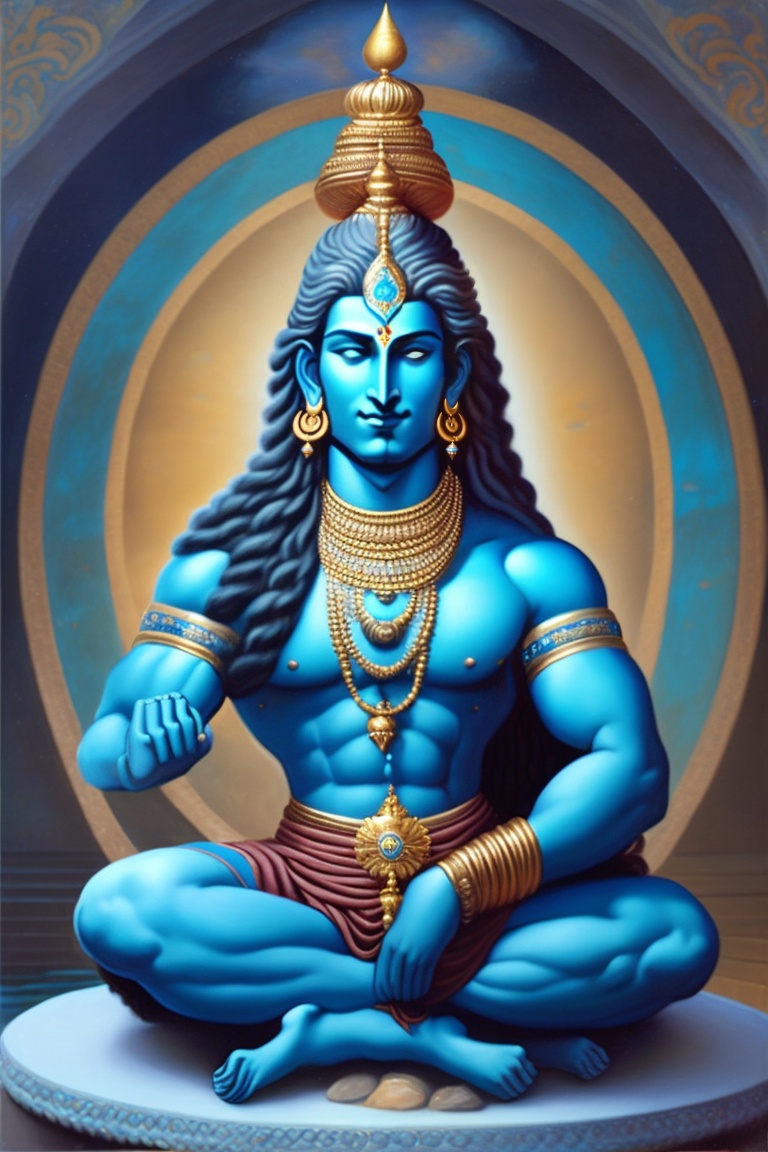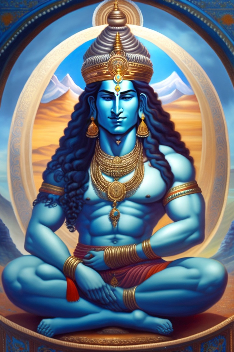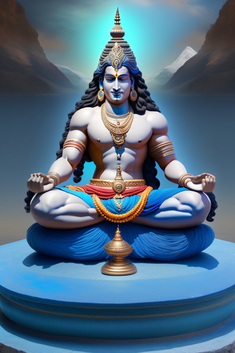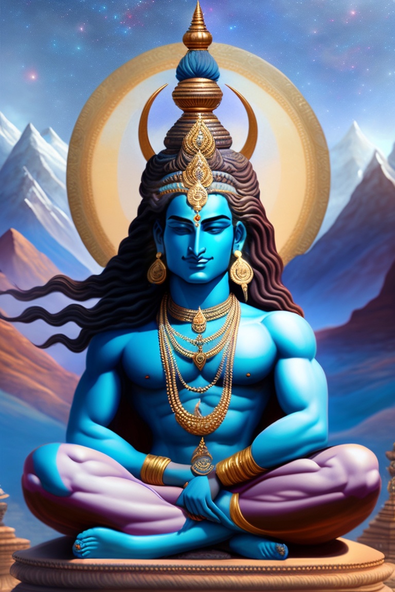 Lord shiva, the tranquil deity, meditates with his eyes half-closed, symbolizing the cosmic balance between creation and destruction. his azure complexion is wreathed by the ganges, cascading from his matted hair, while a crescent moon rests gently on his forehead. around his neck, a serpent coiled, symbolizing power and fearlessness, as he sits in lotus pose against a backdrop of the mighty himalayas