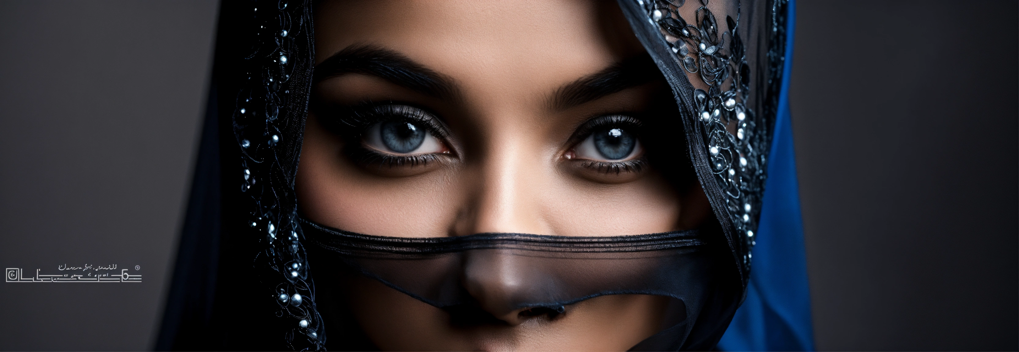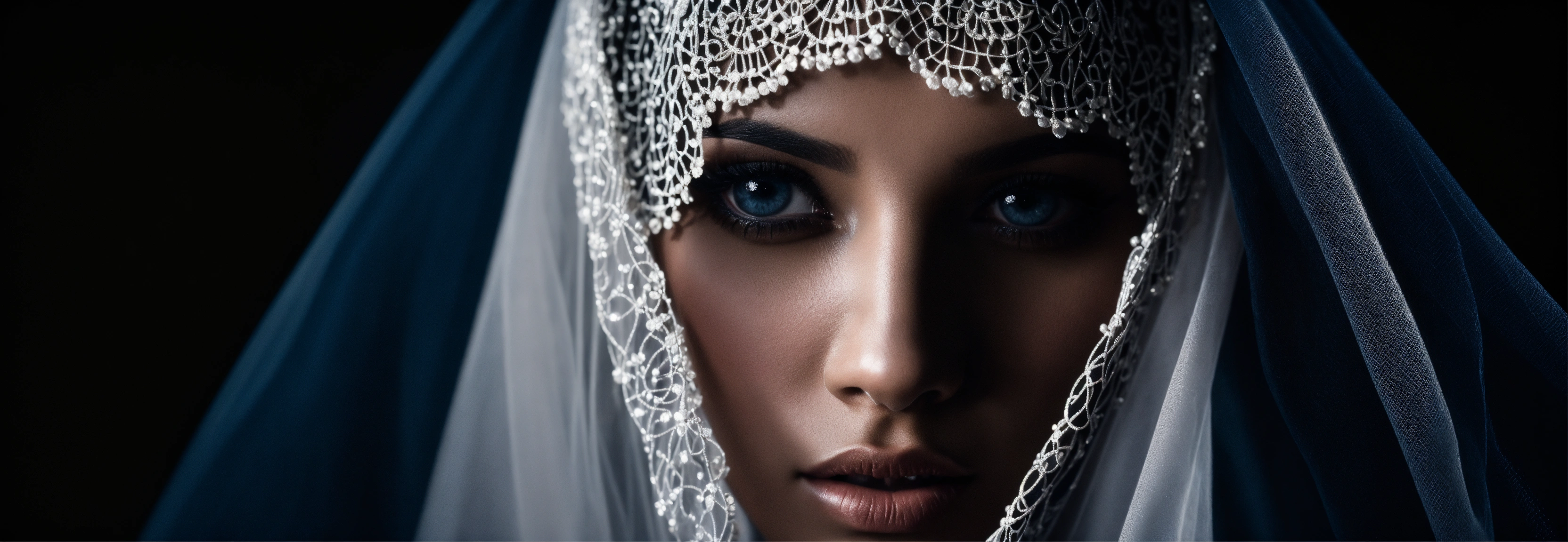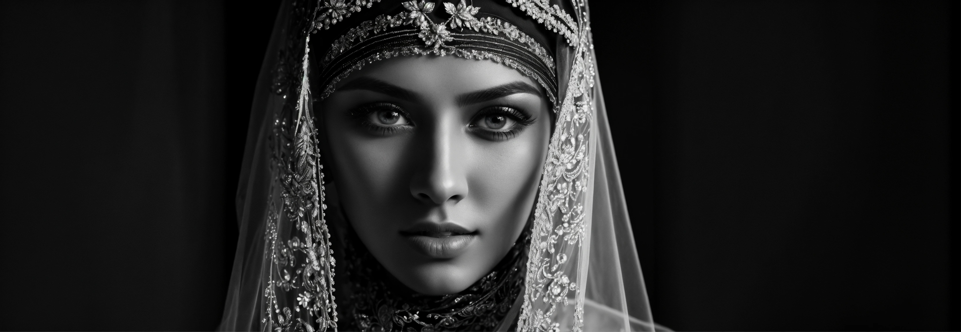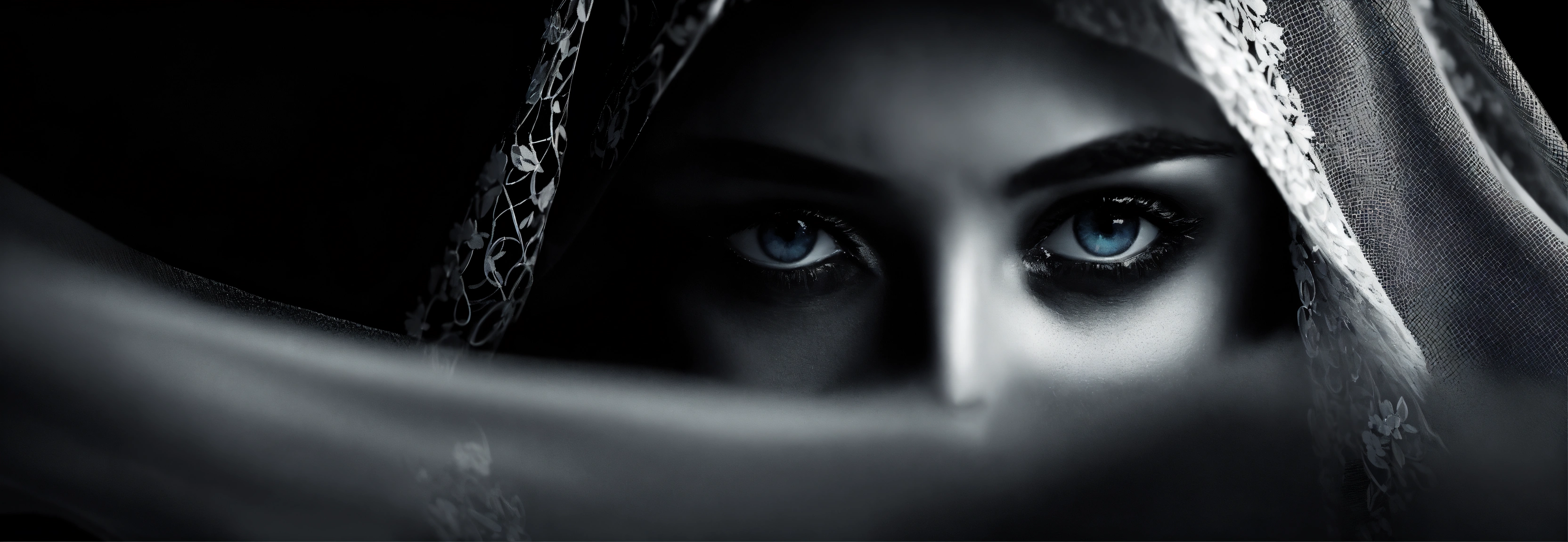 Close-up portrait, black and white photo, 16 k portrait, muslim woman veiled in transparent silk with veil, cinematic, completely black background without light, veiled, black veil, blue eyes very beautiful woman, light directed only on the eyes, studio photo, high definition image, professional photography, black background