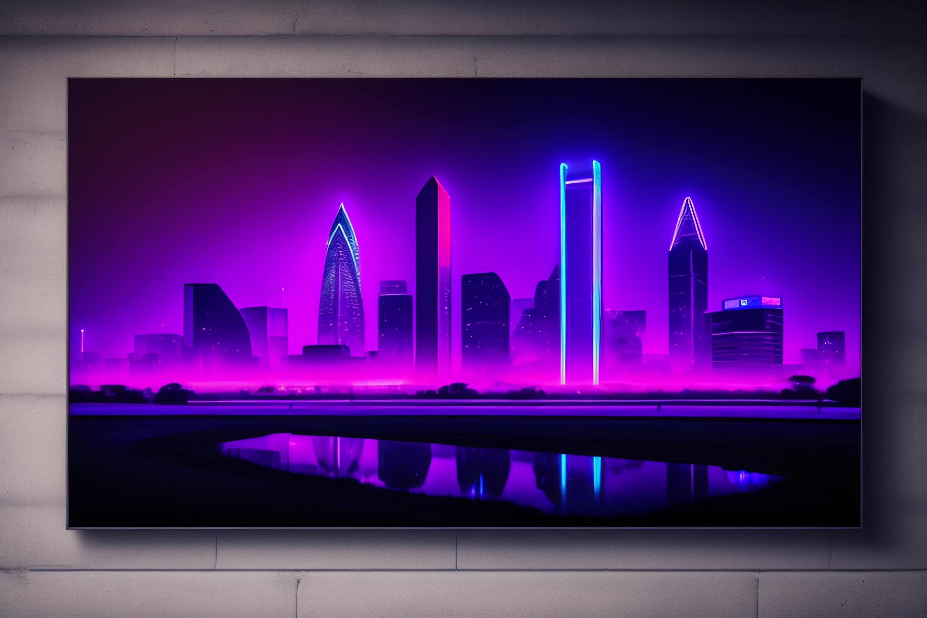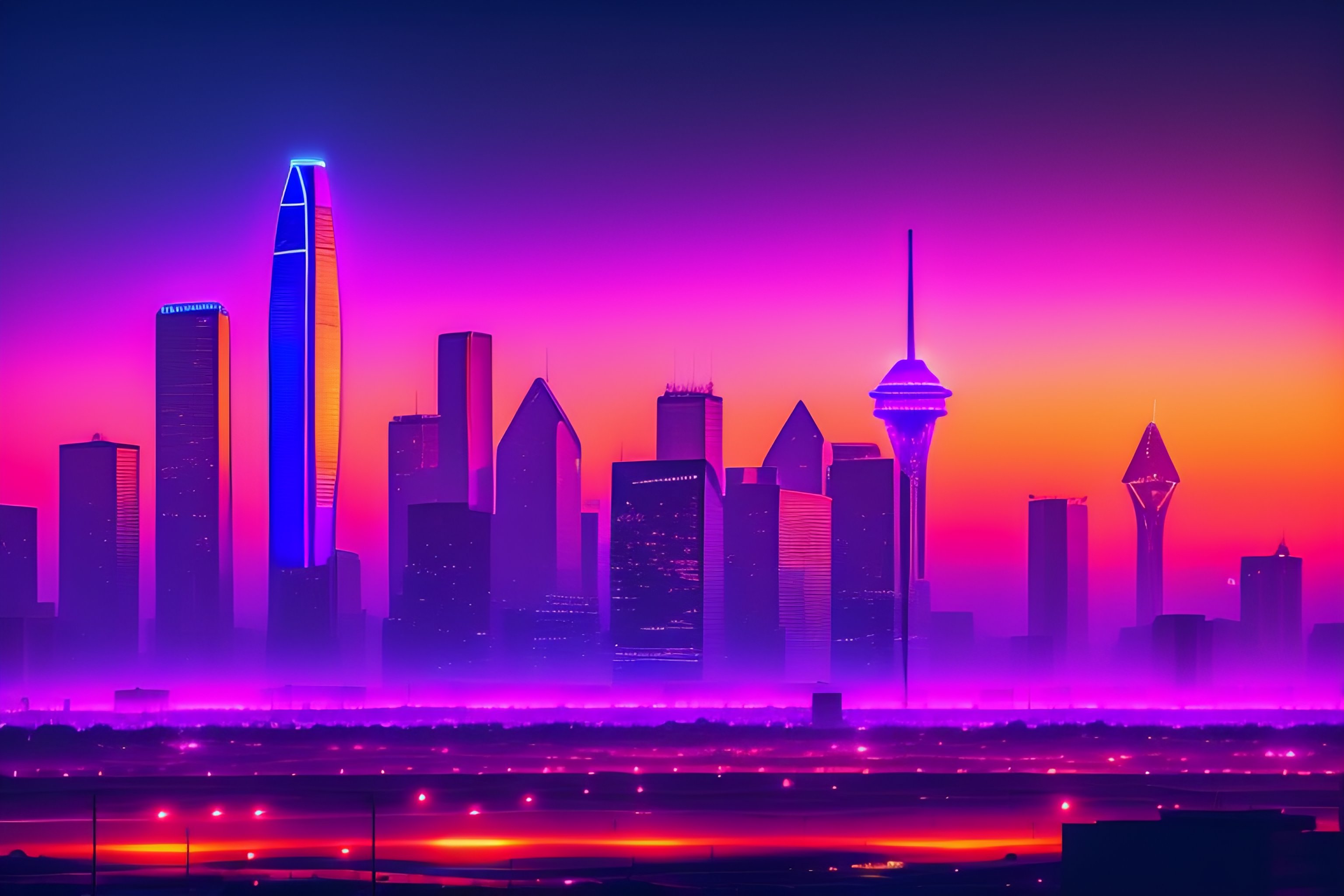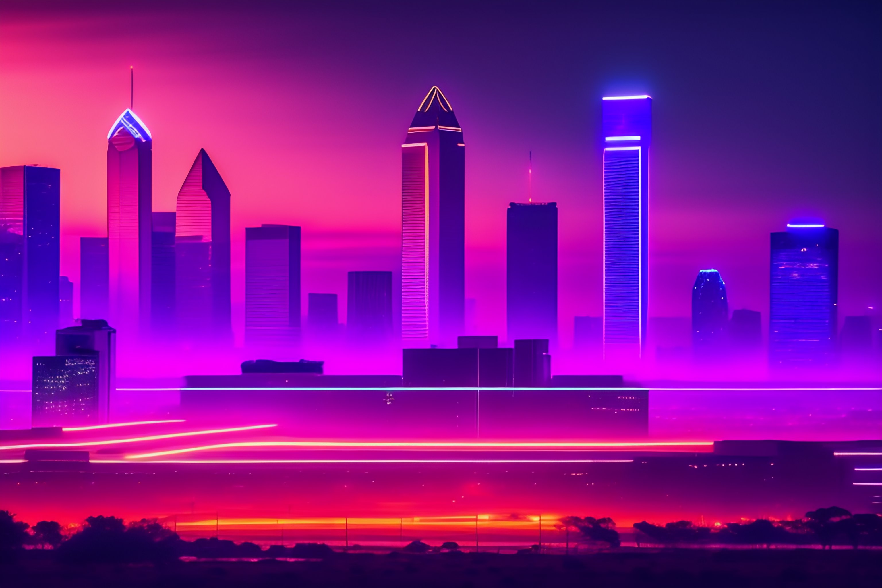 Dystopian and bleak dallas skyline, bladerunner 2049 cyberpunk style, highly detailed photograph, neon, cinematic, purple